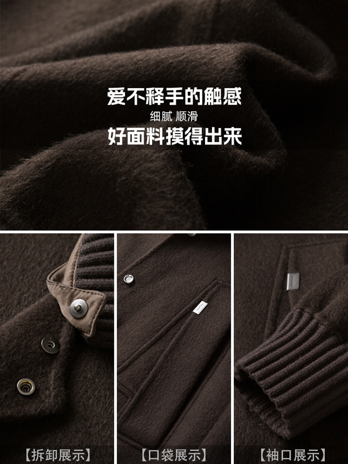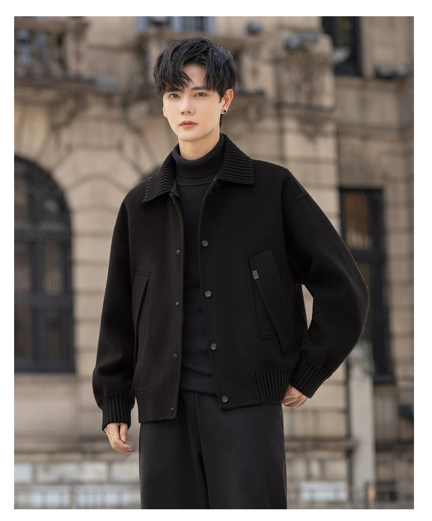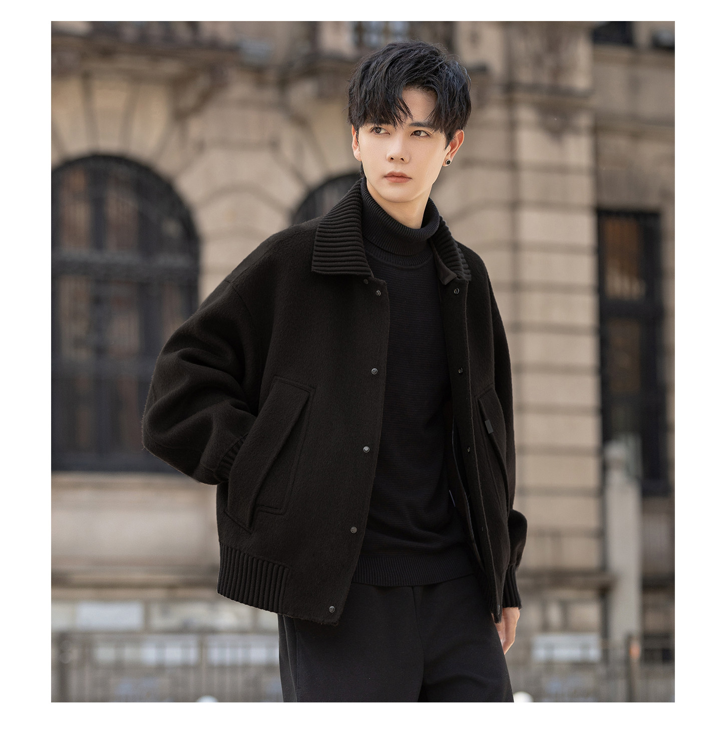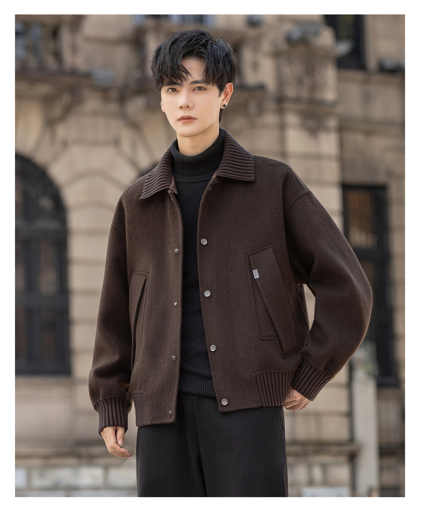 Men's Double-Sided Fleece Short Coat with Detachable Lapel, Ribbed Pure Wool Woolen Jacket, Thickened for Winter