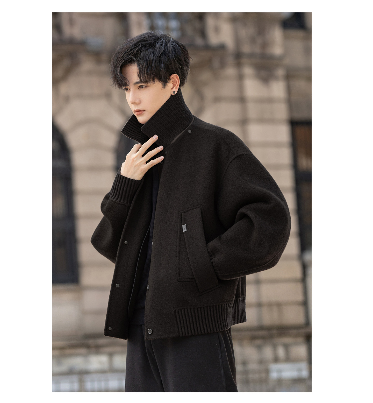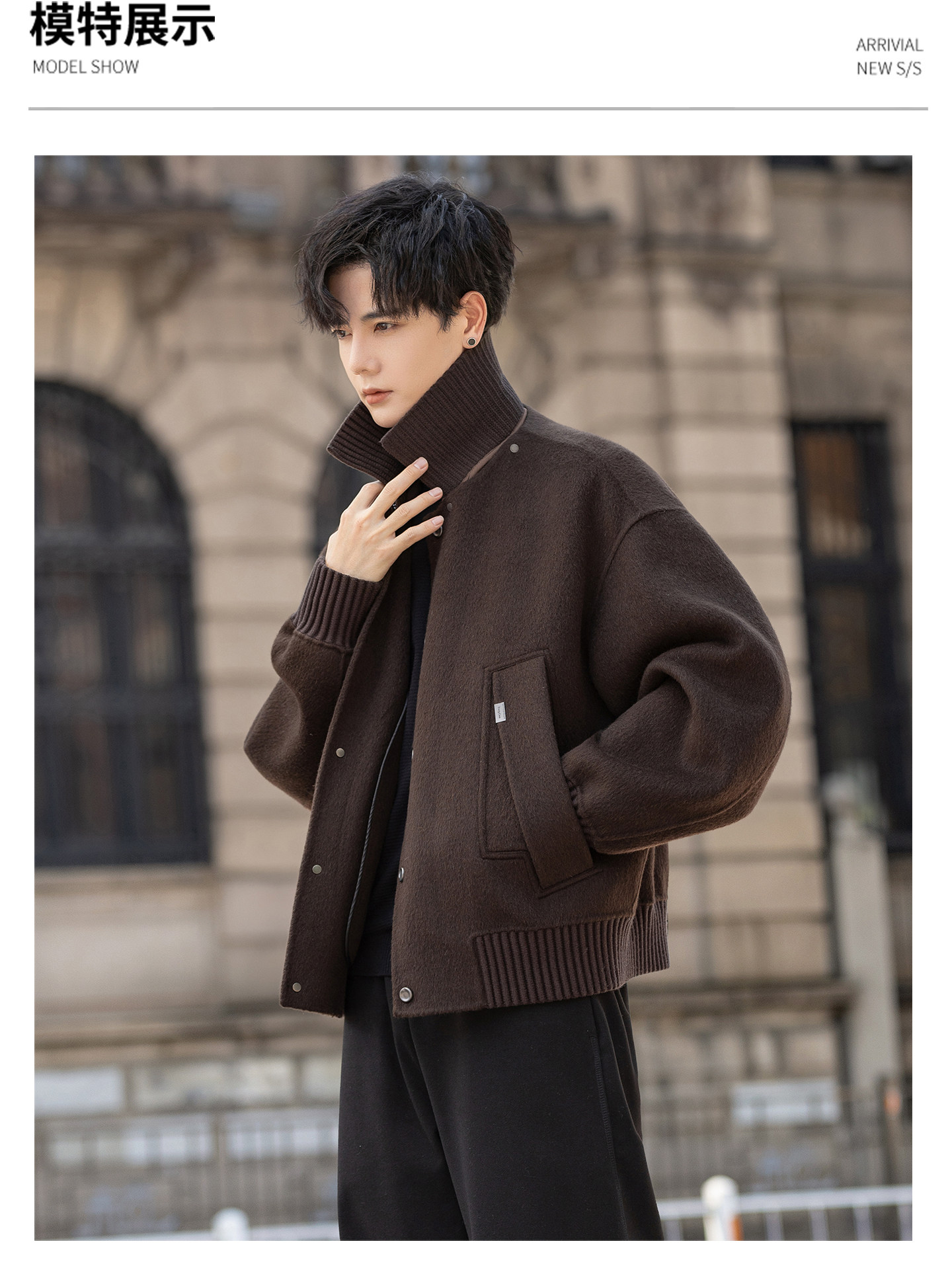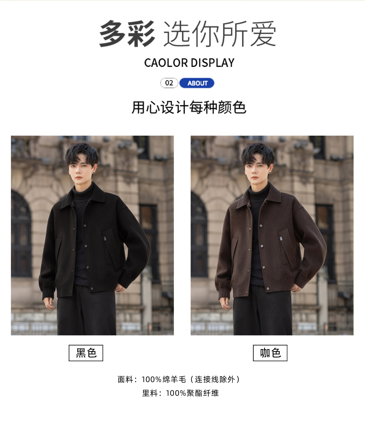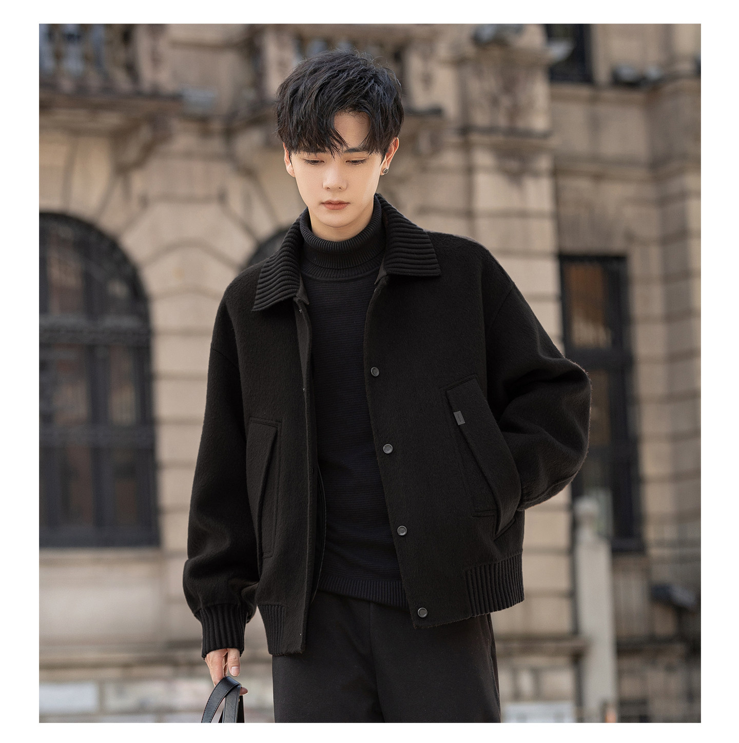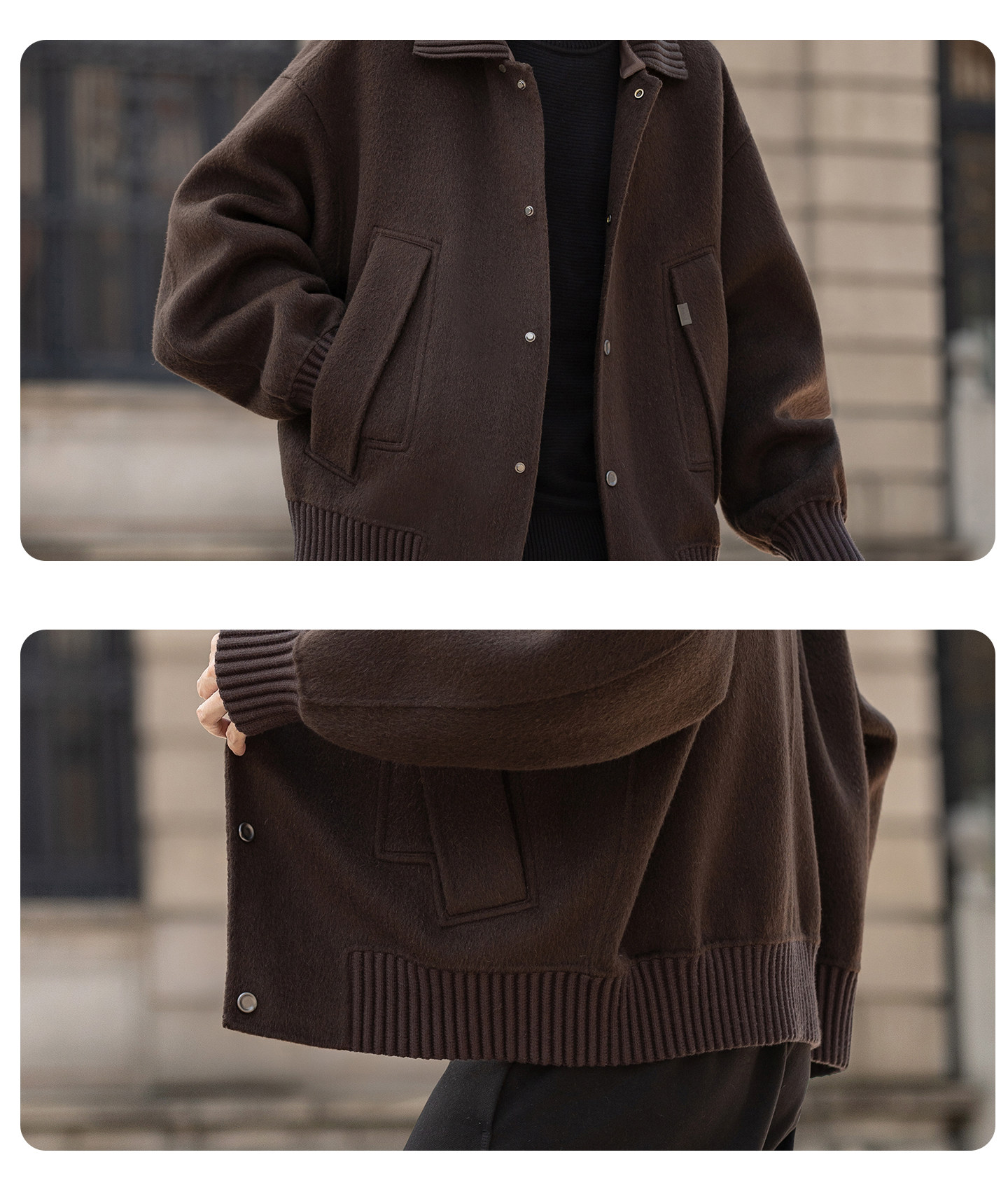 Men's Double-Sided Fleece Short Coat with Detachable Lapel, Ribbed Pure Wool Woolen Jacket, Thickened for Winter