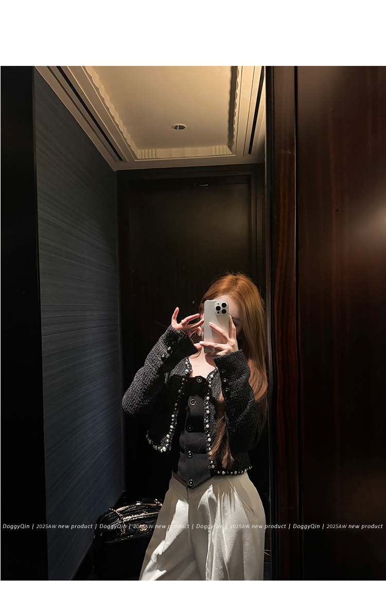优雅黑做高腰短款的设计 对扣设计简约耐看 对身材有着出色的修饰作用
