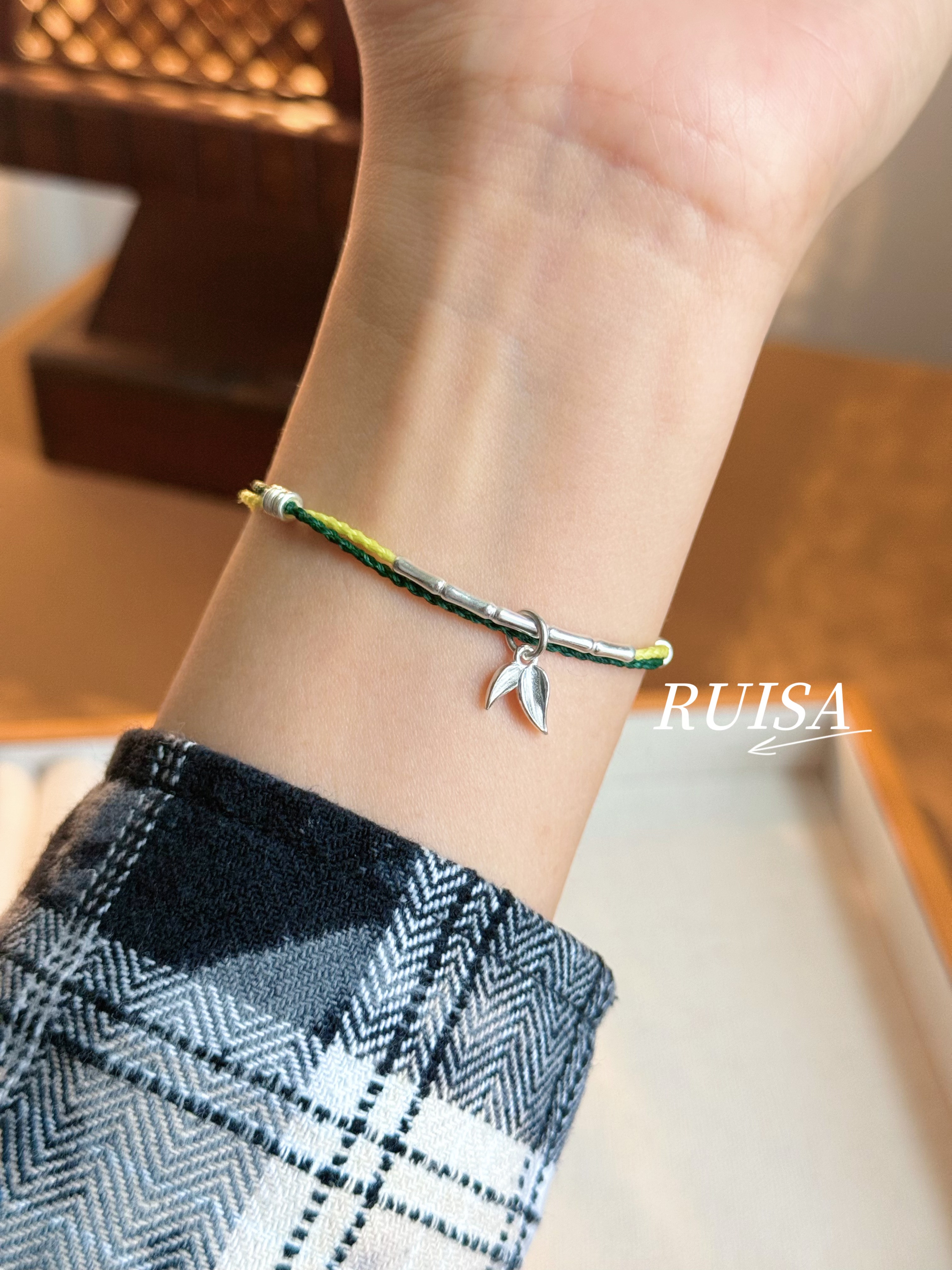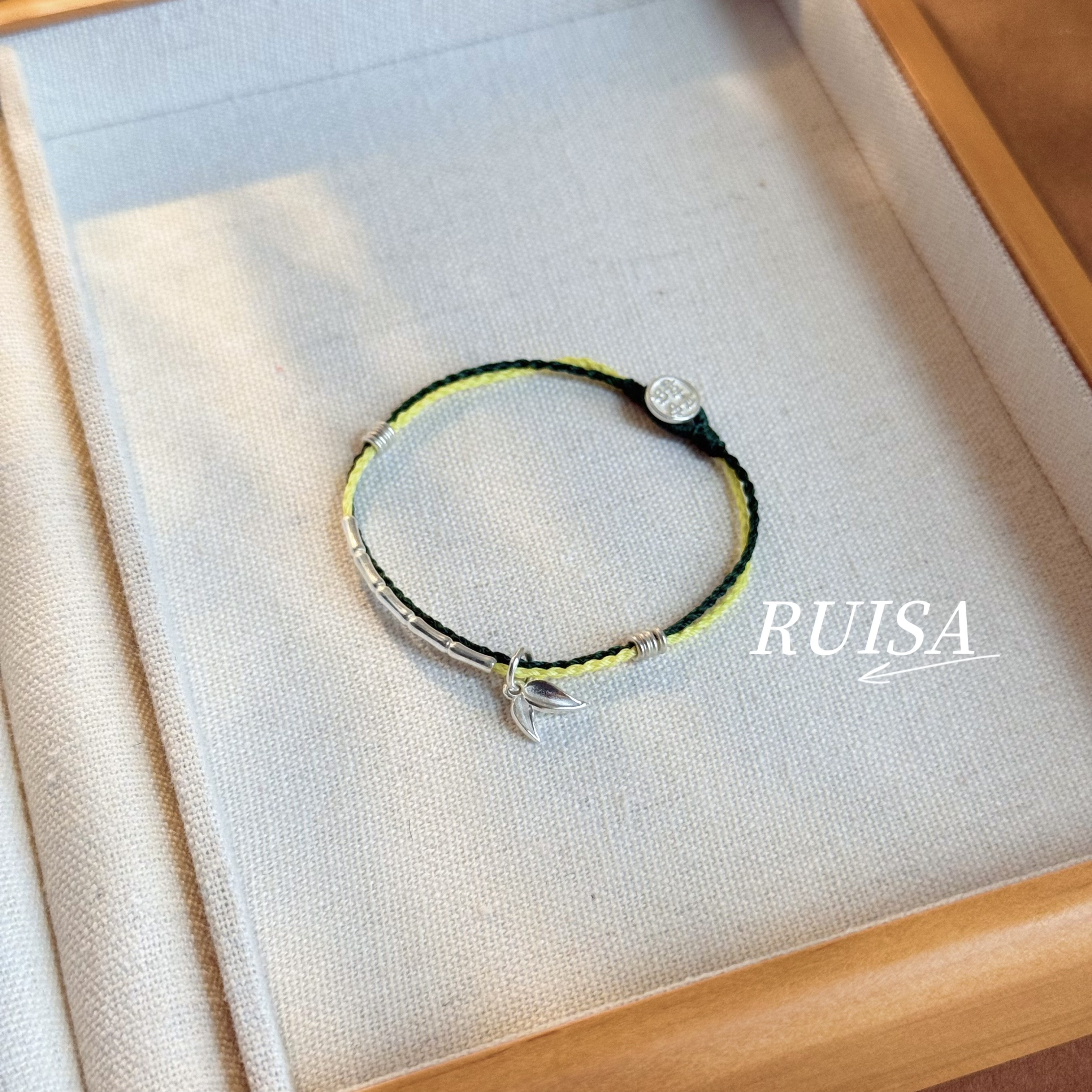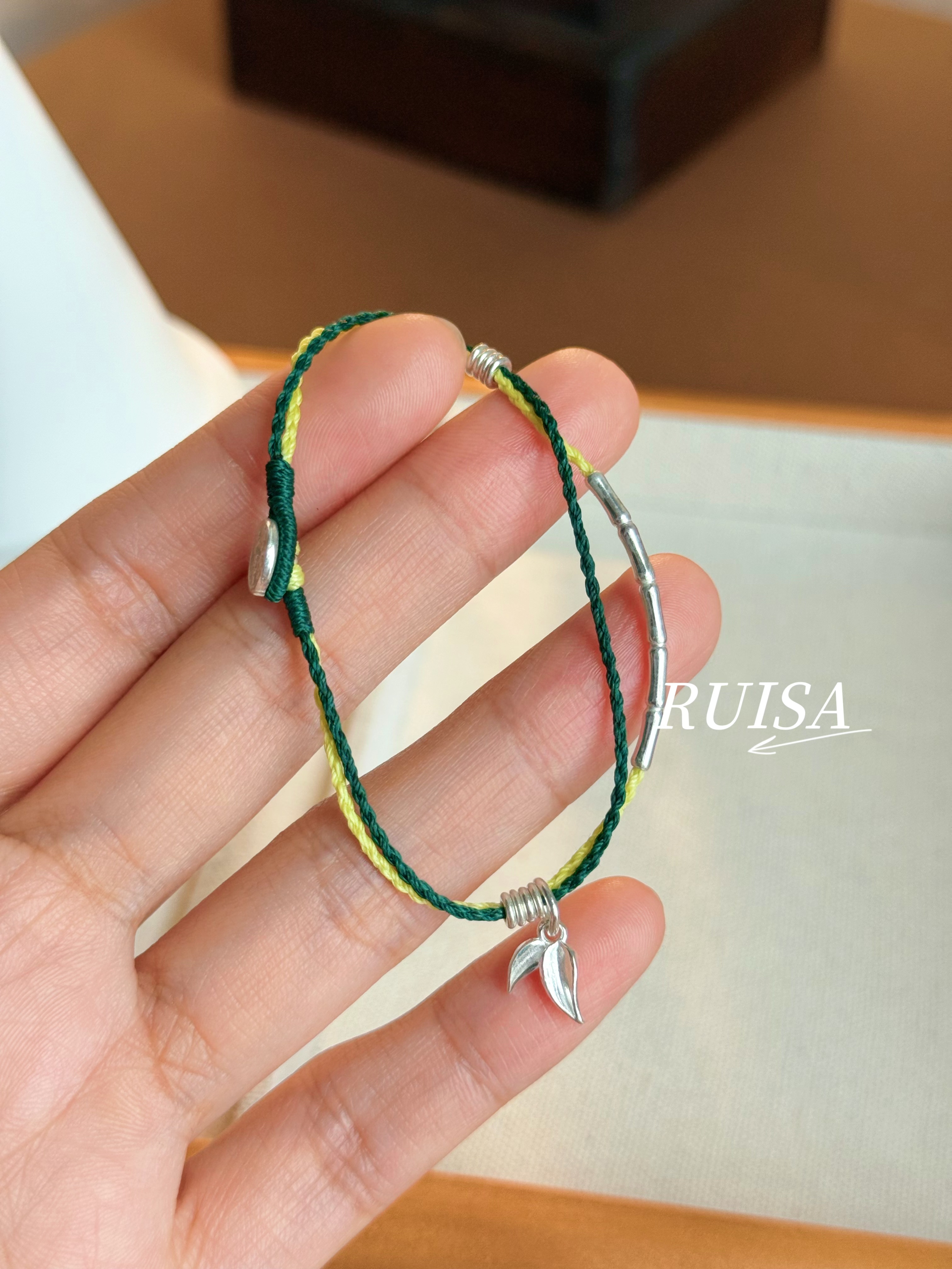 Ruisa'Green Bamboo' Sterling Silver Bracelet, Niche Design, Versatile Bracelet, Ultra-Fine Wax Cord, S999 Bamboo Leaf Pendant
