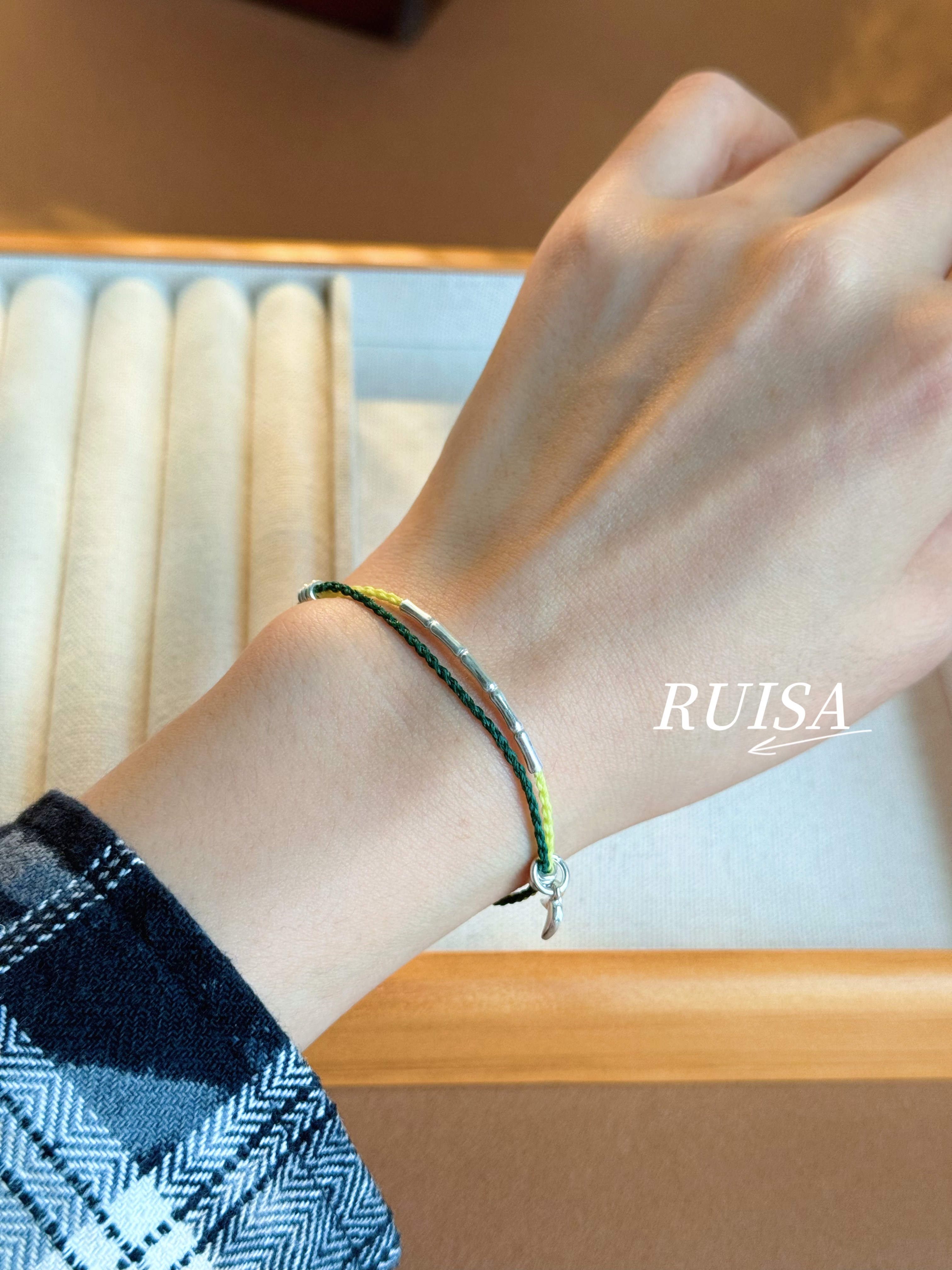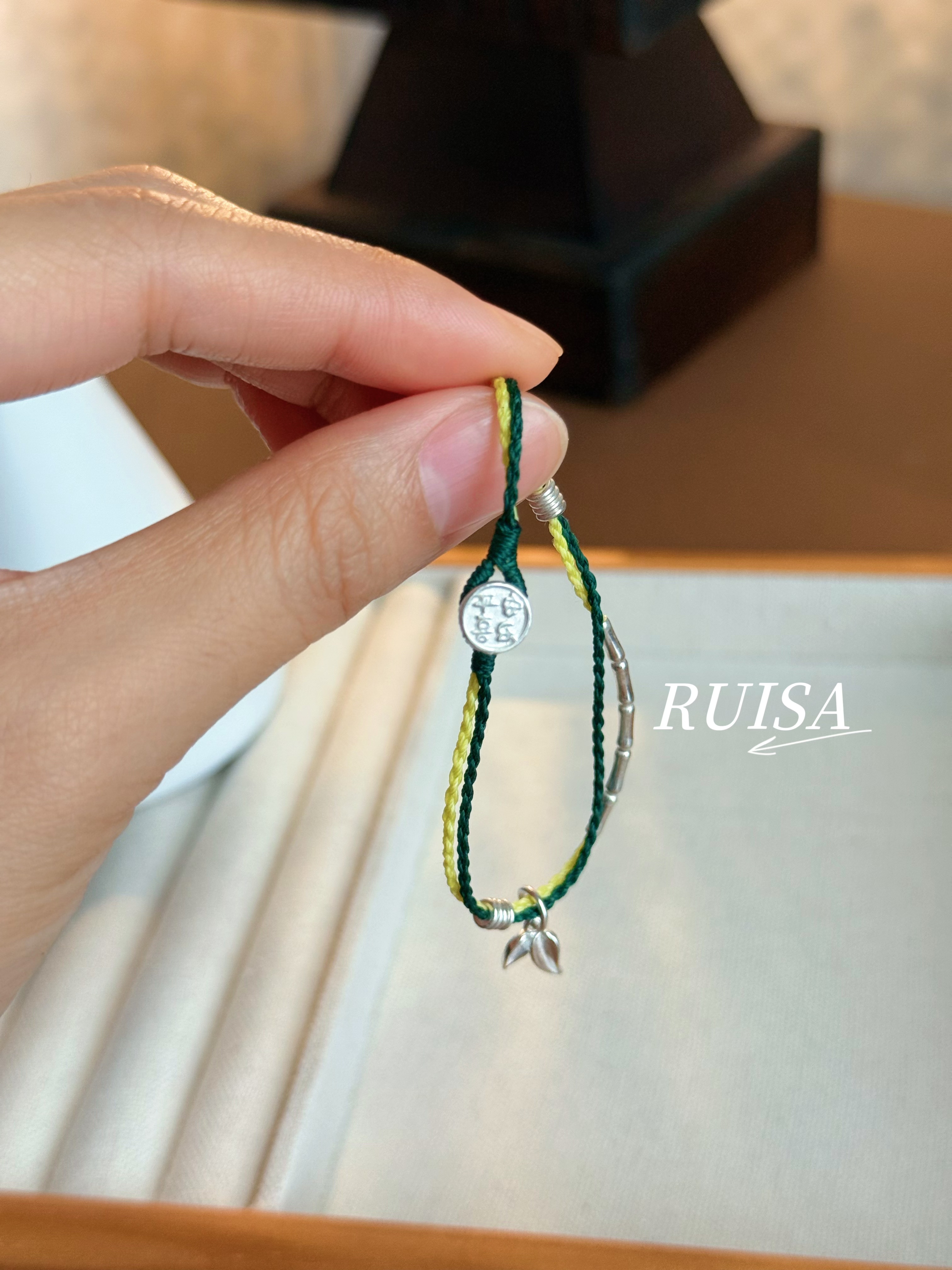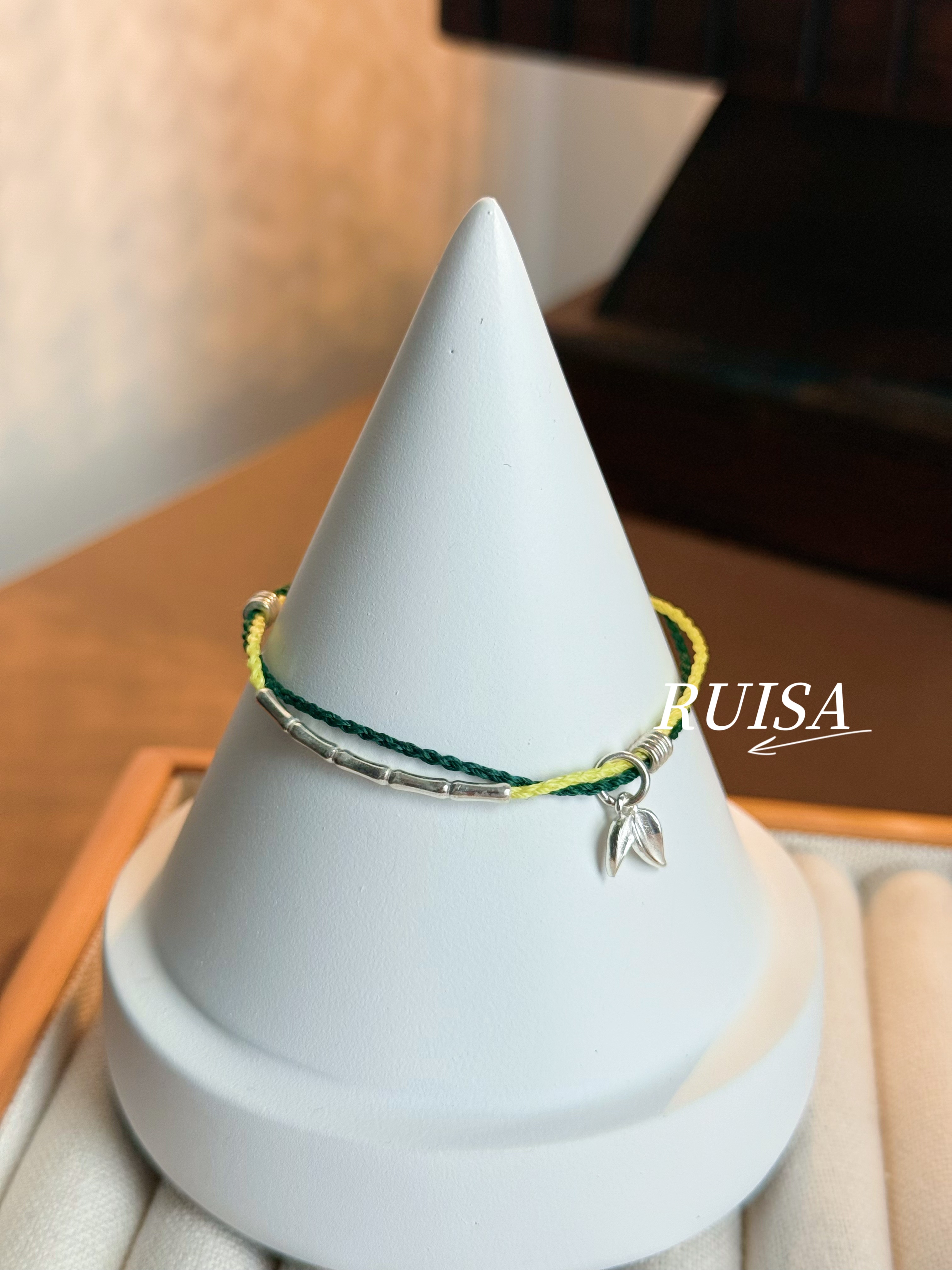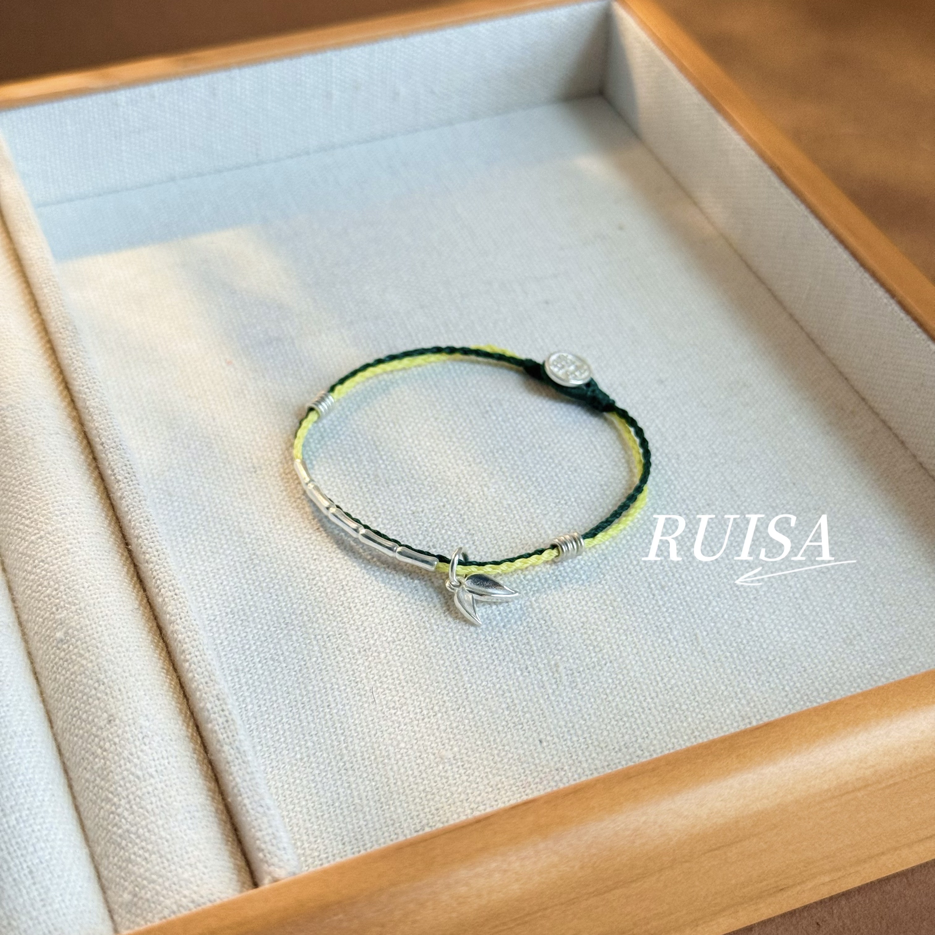 Ruisa'Green Bamboo' Sterling Silver Bracelet, Niche Design, Versatile Bracelet, Ultra-Fine Wax Cord, S999 Bamboo Leaf Pendant