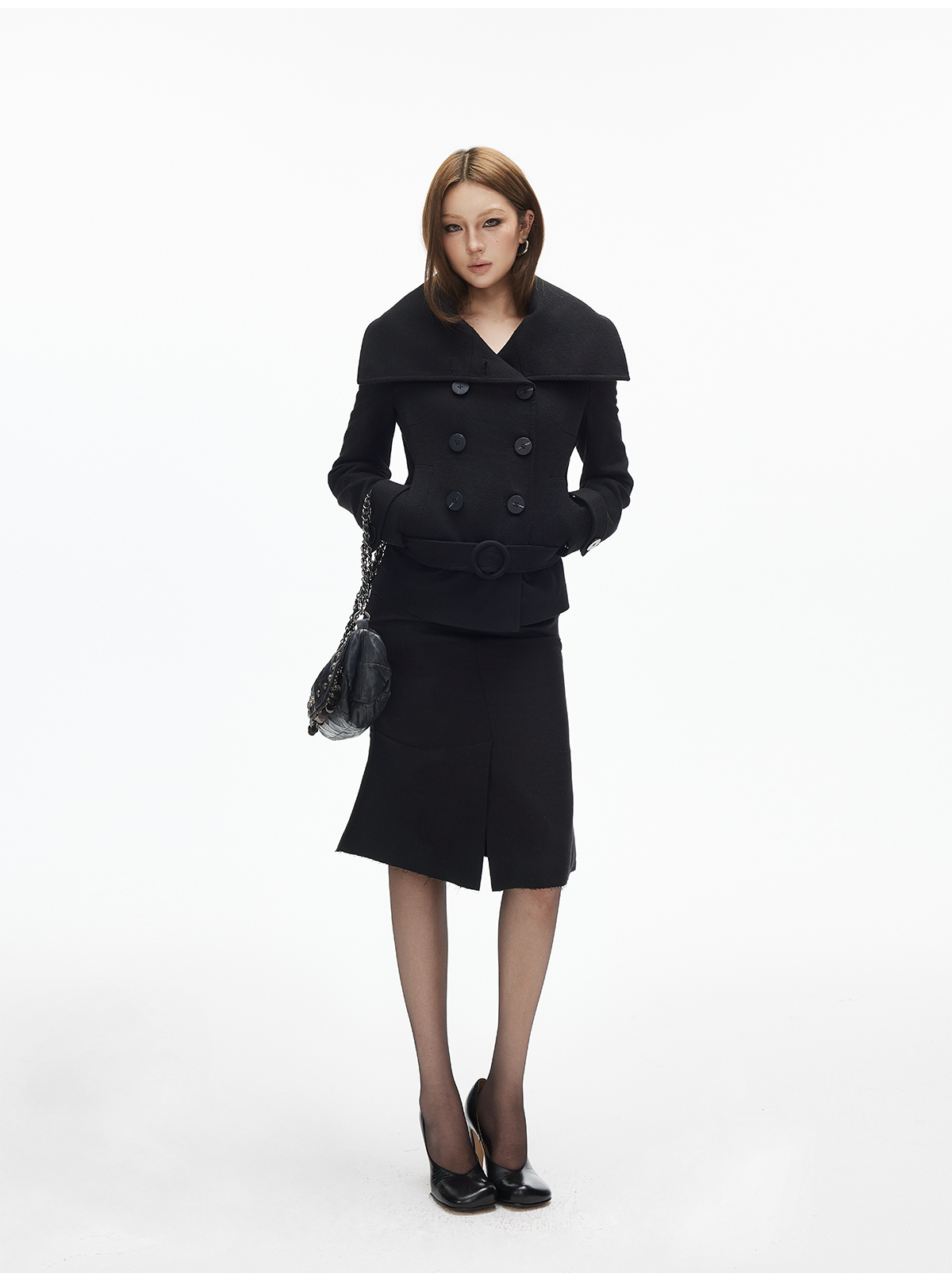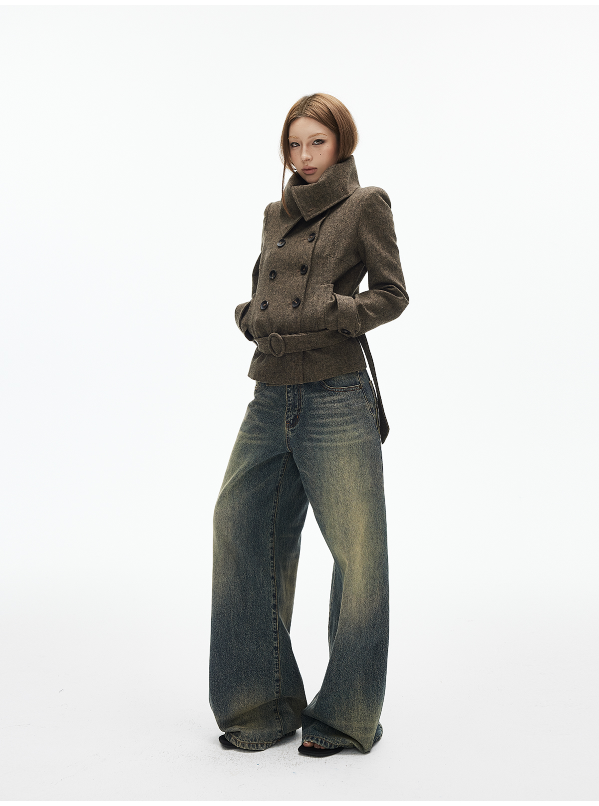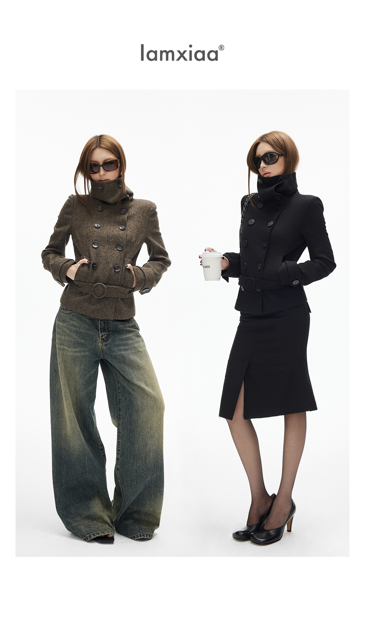 Iamxiaa* Soft and Cozy Wool Large Lapel Multi-Wear Double-Breasted Same-Material Belt Short Slightly Loose Woolen Coat
