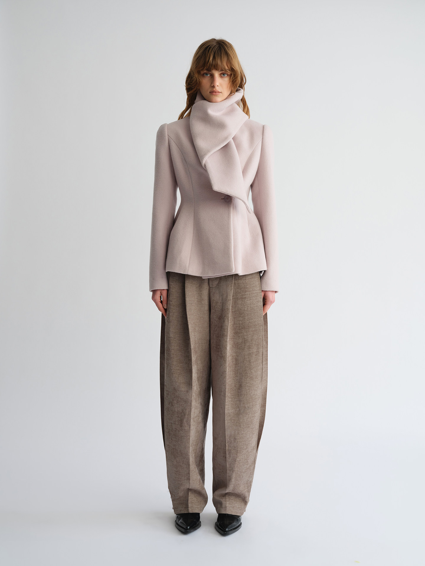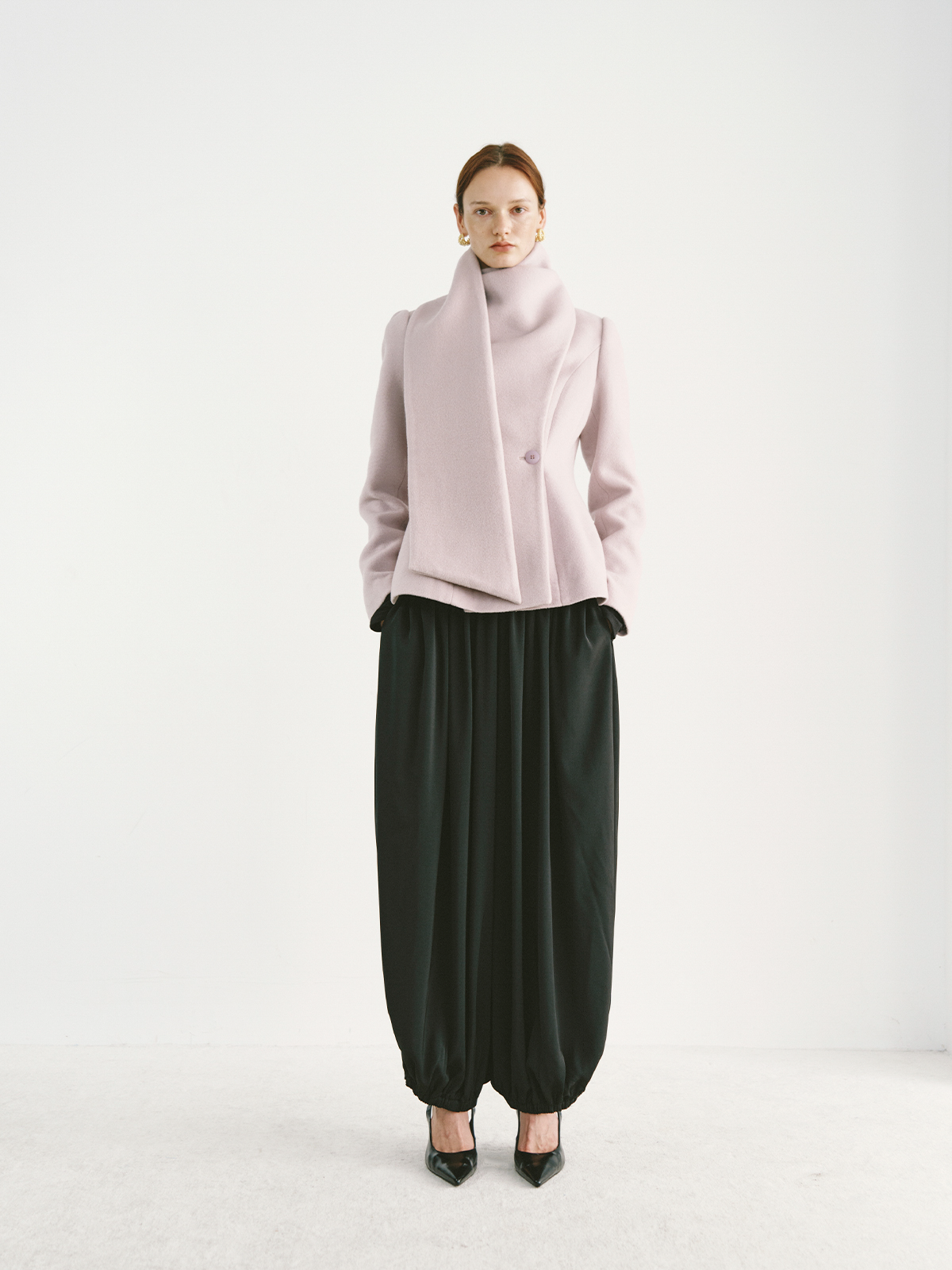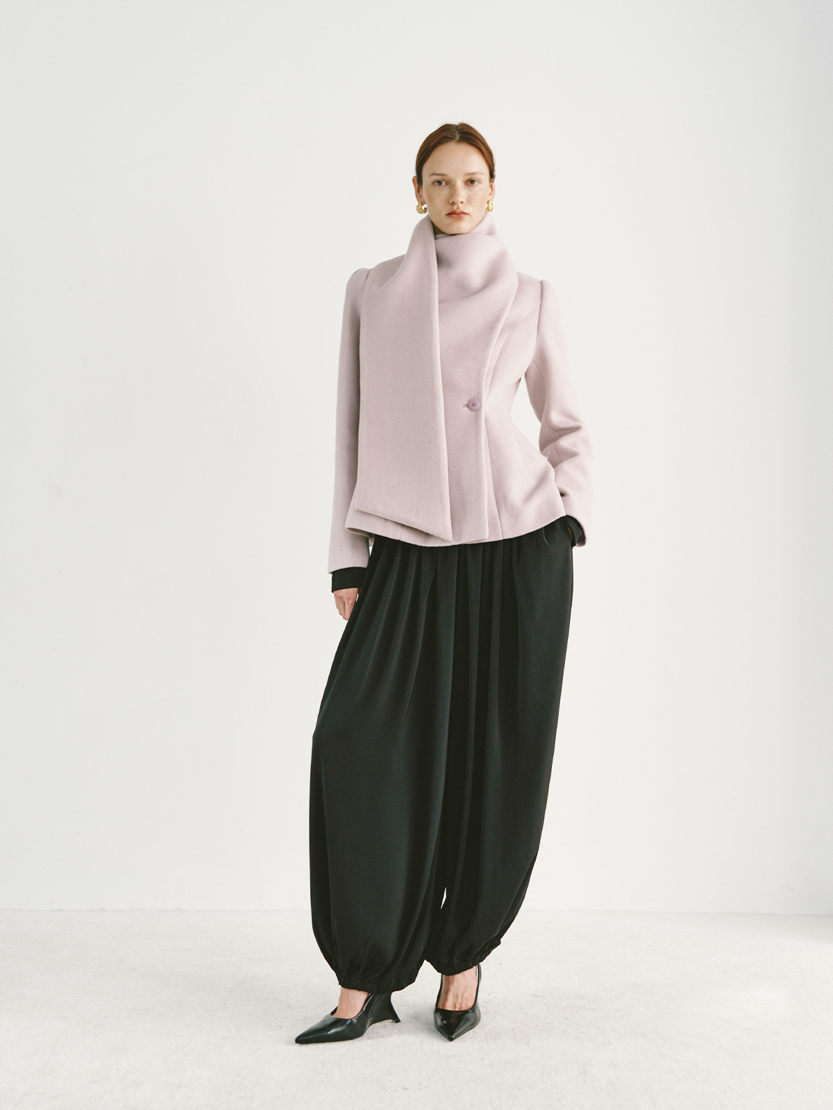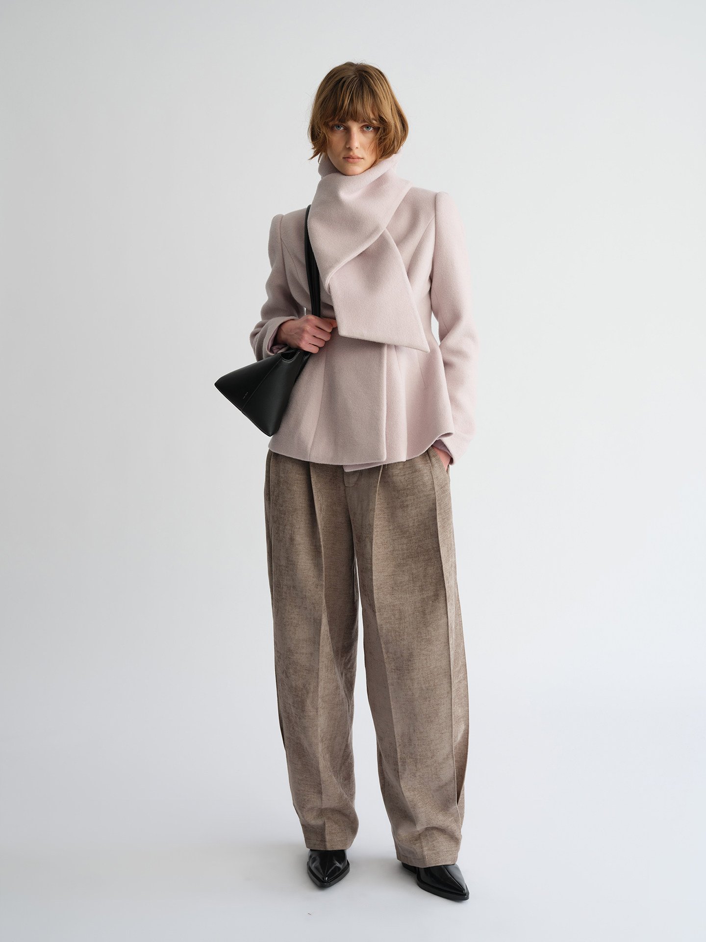 Preekend 100% Wool Pink-Purple/Black Scarf Collar Straight Shoulder Waist-Cinching Short Wool Coat