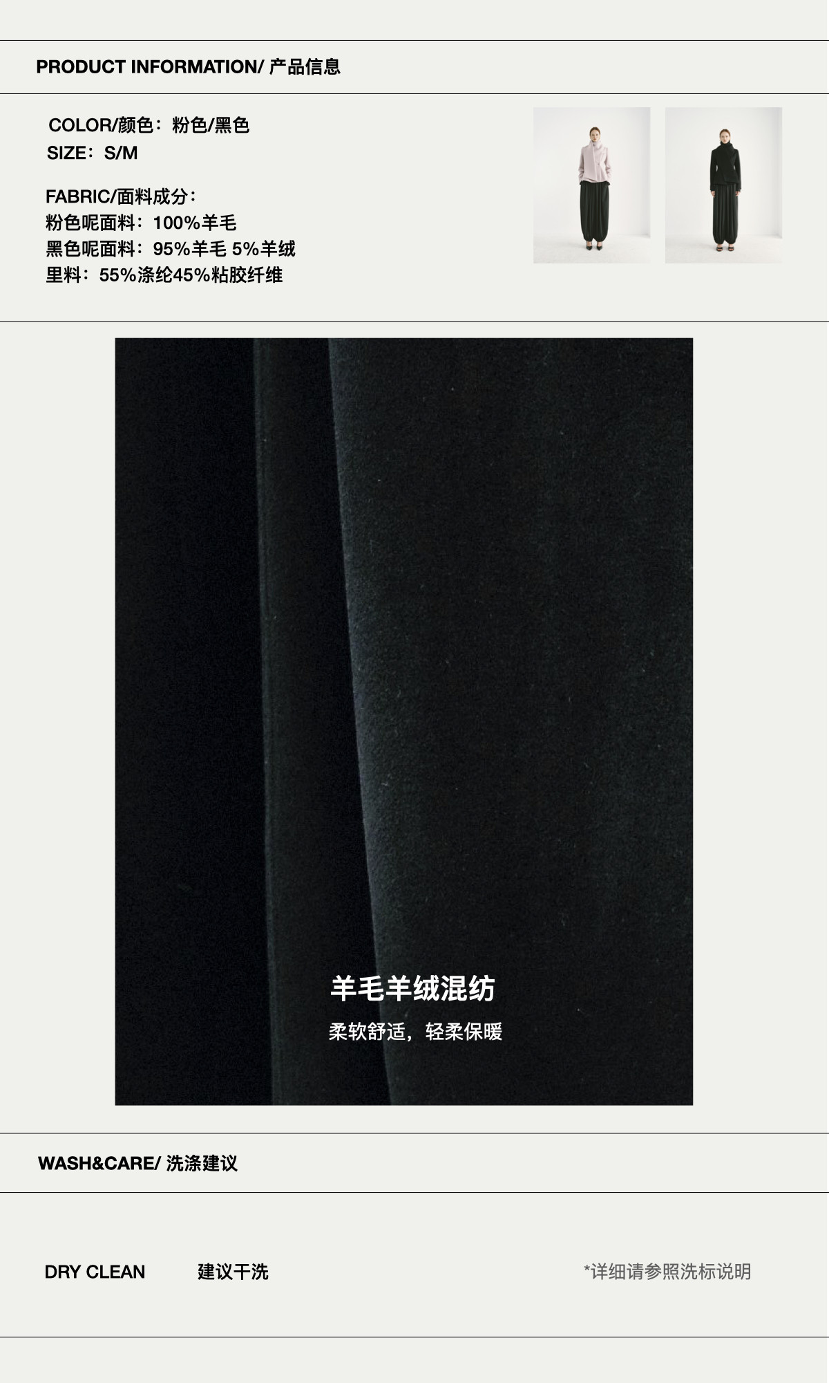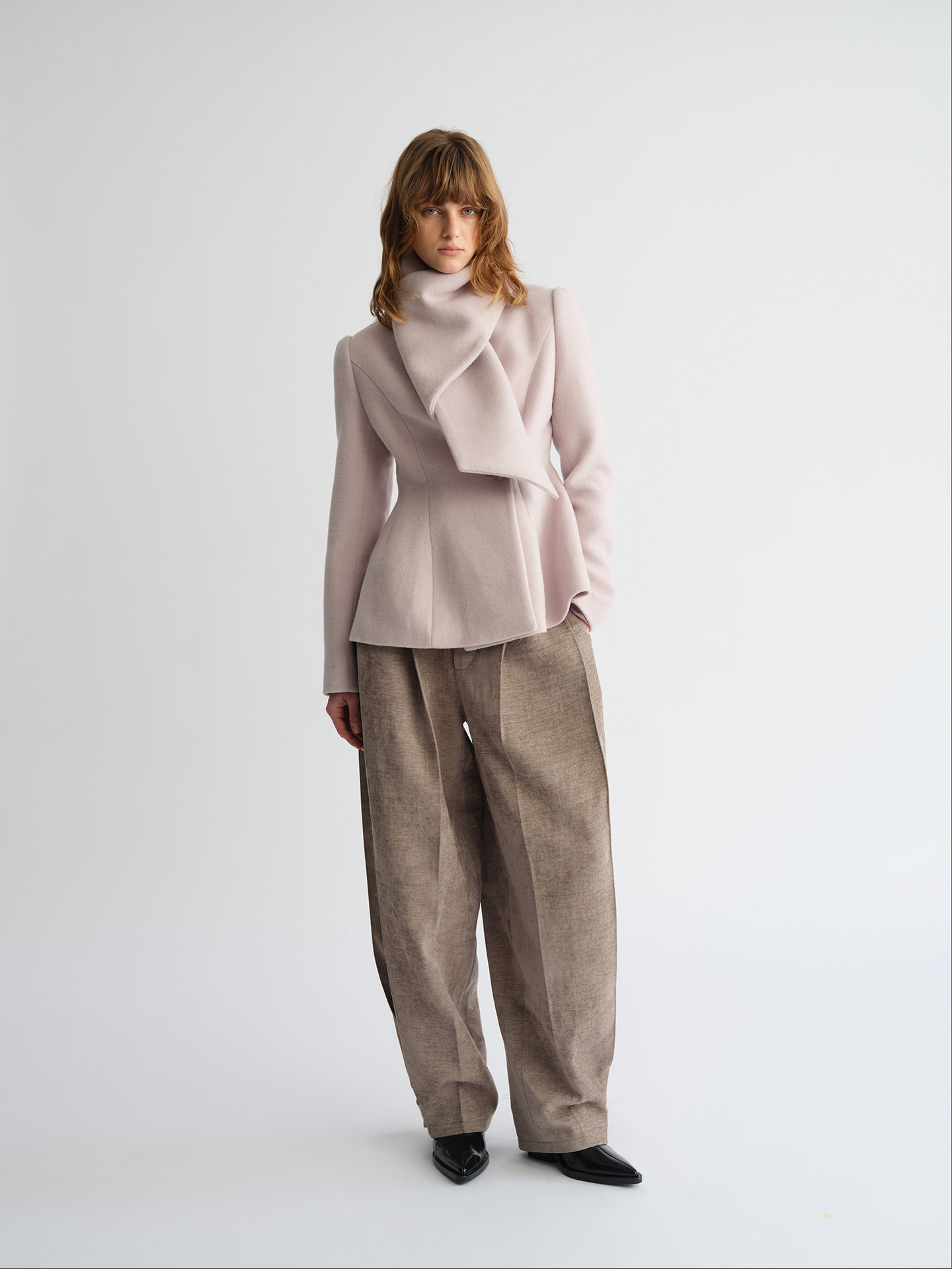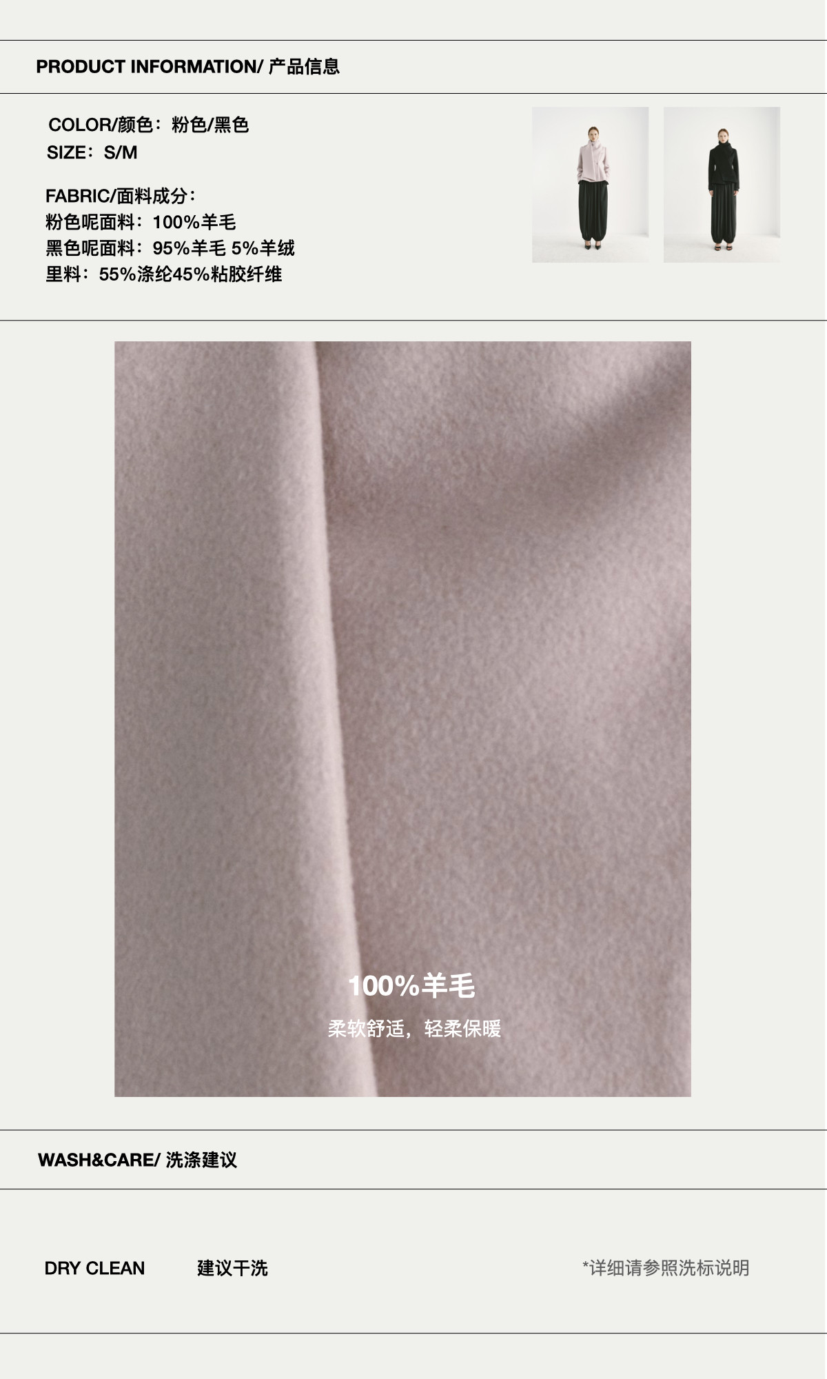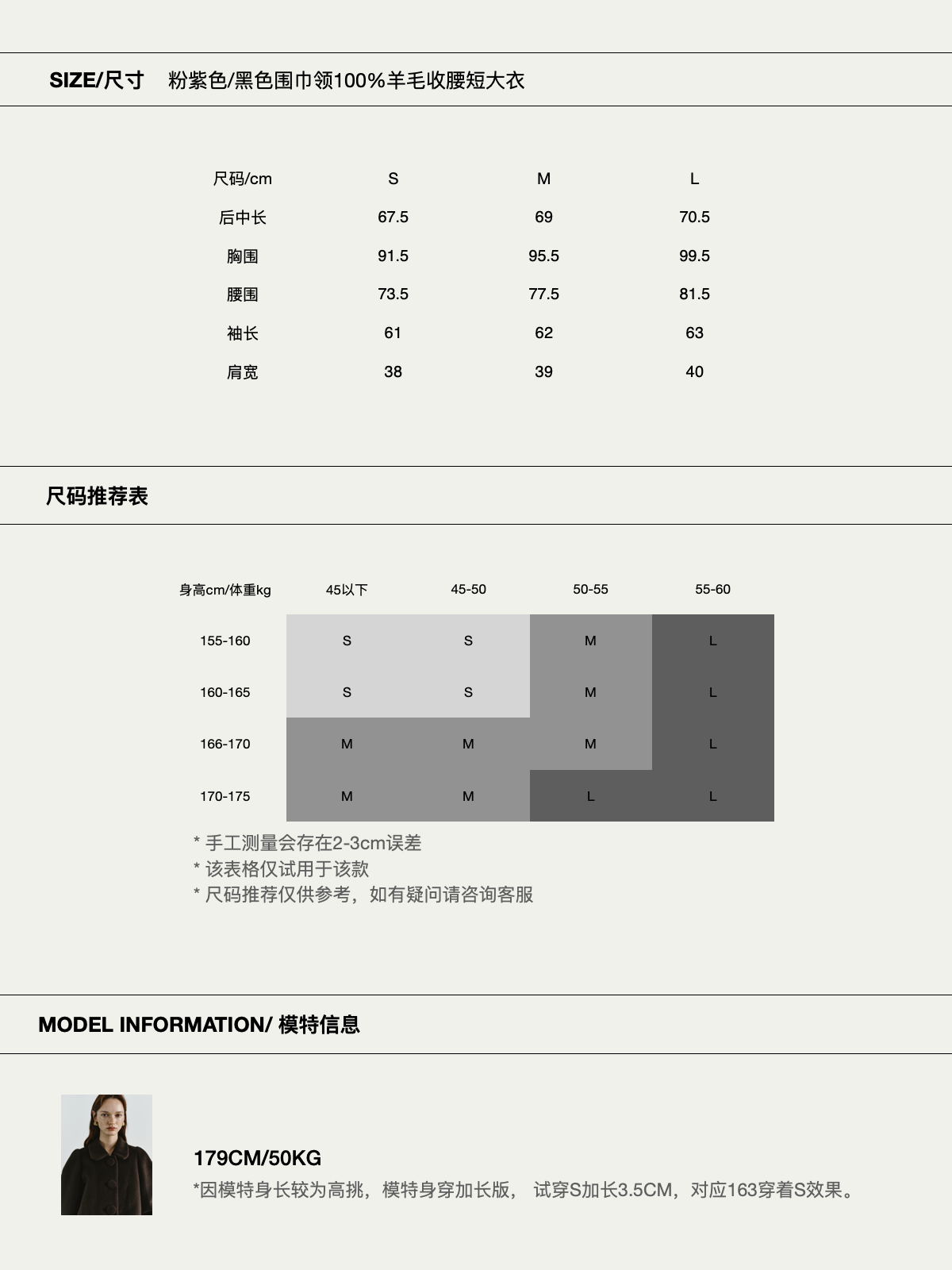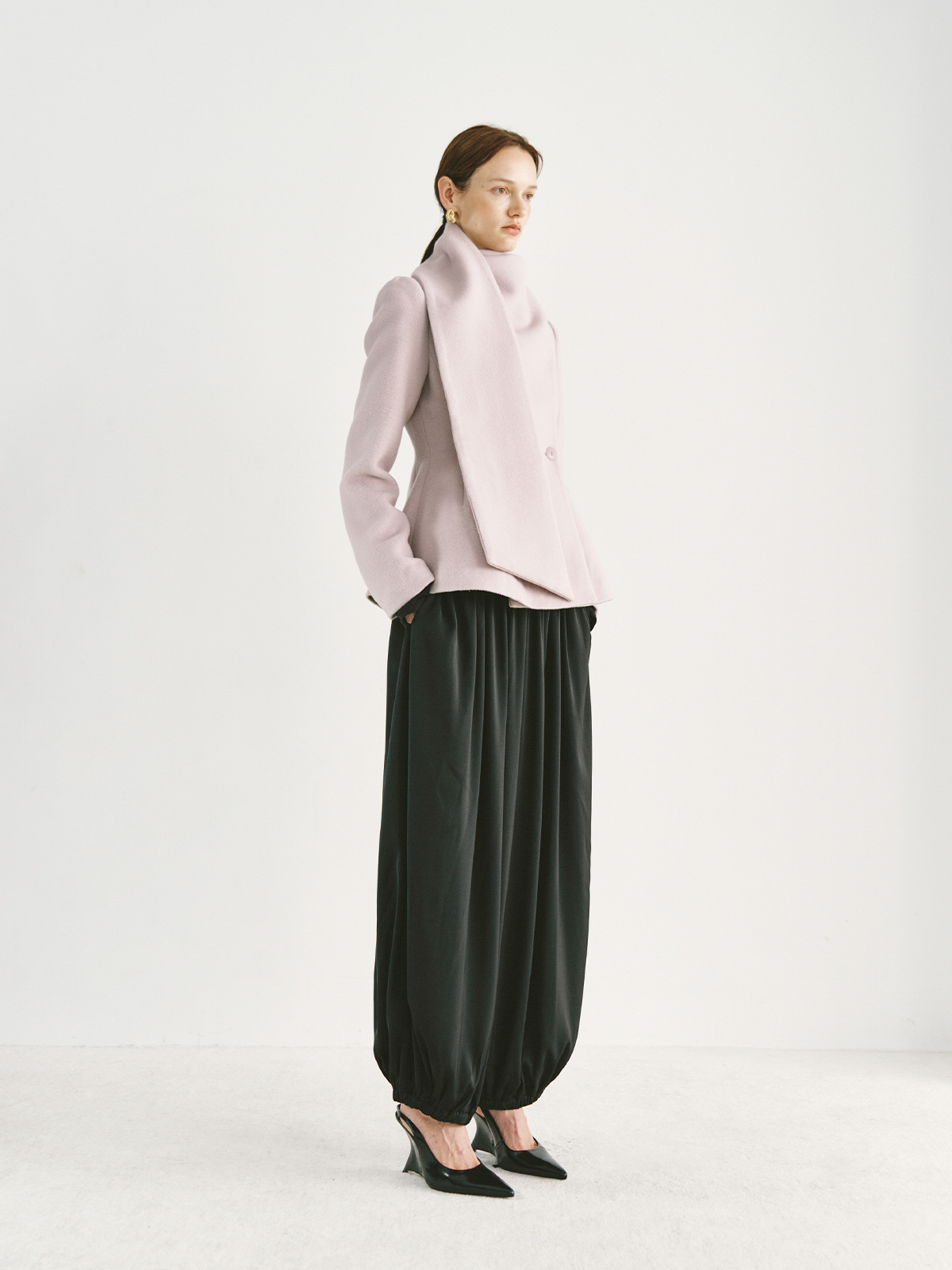 Preekend 100% Wool Pink-Purple/Black Scarf Collar Straight Shoulder Waist-Cinching Short Wool Coat