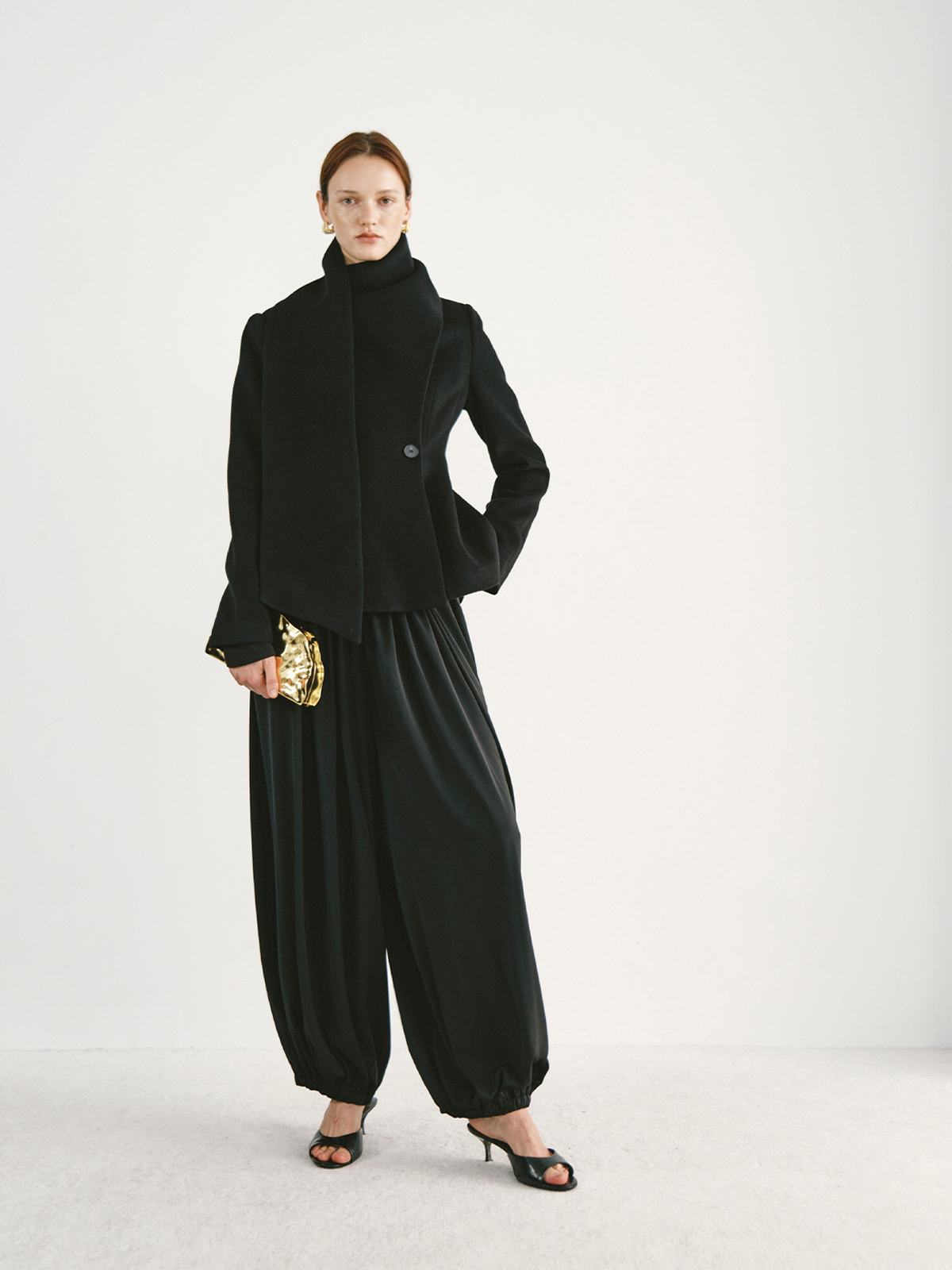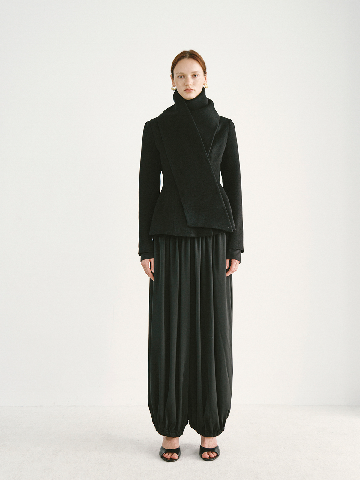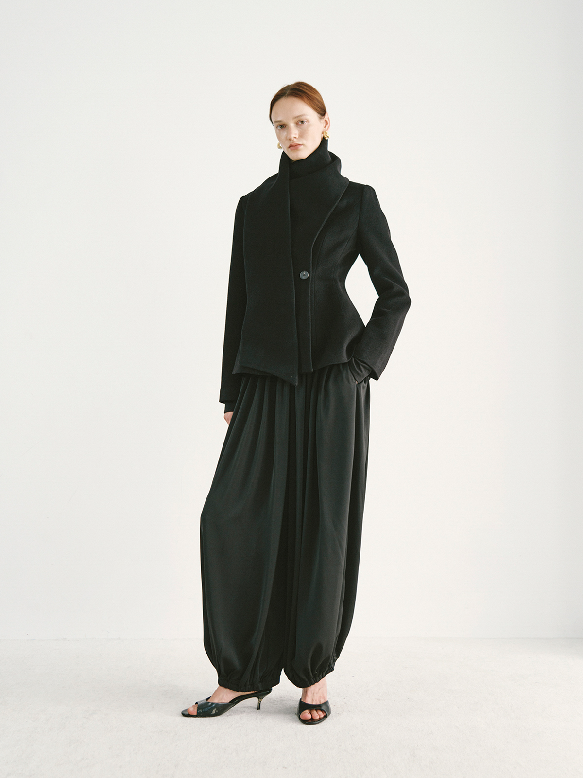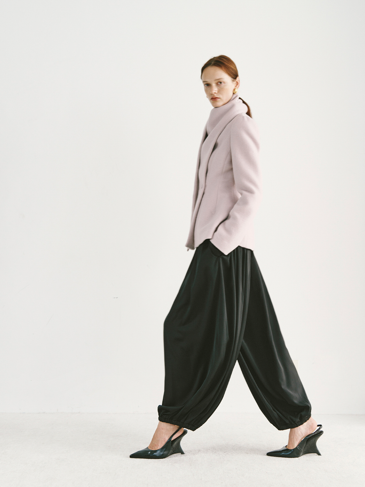 Preekend 100% Wool Pink-Purple/Black Scarf Collar Straight Shoulder Waist-Cinching Short Wool Coat