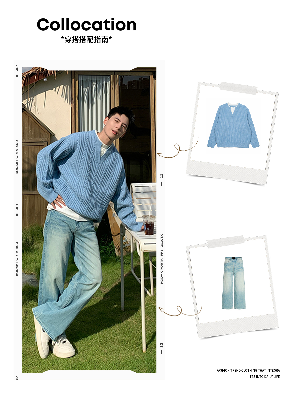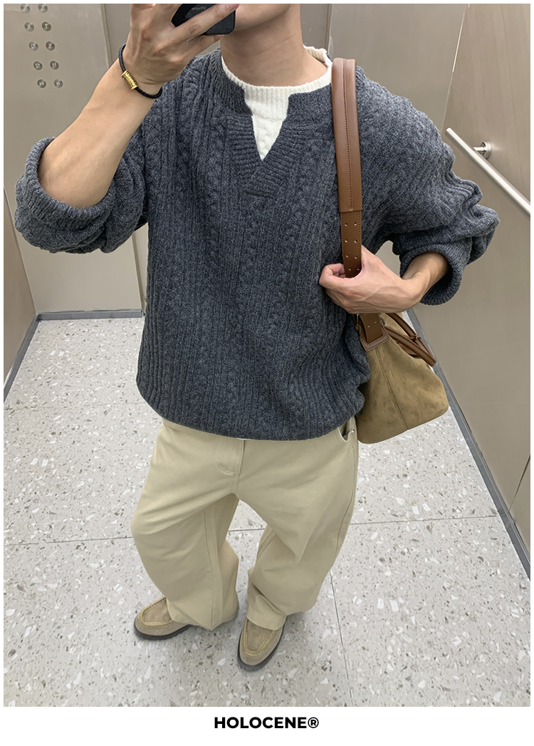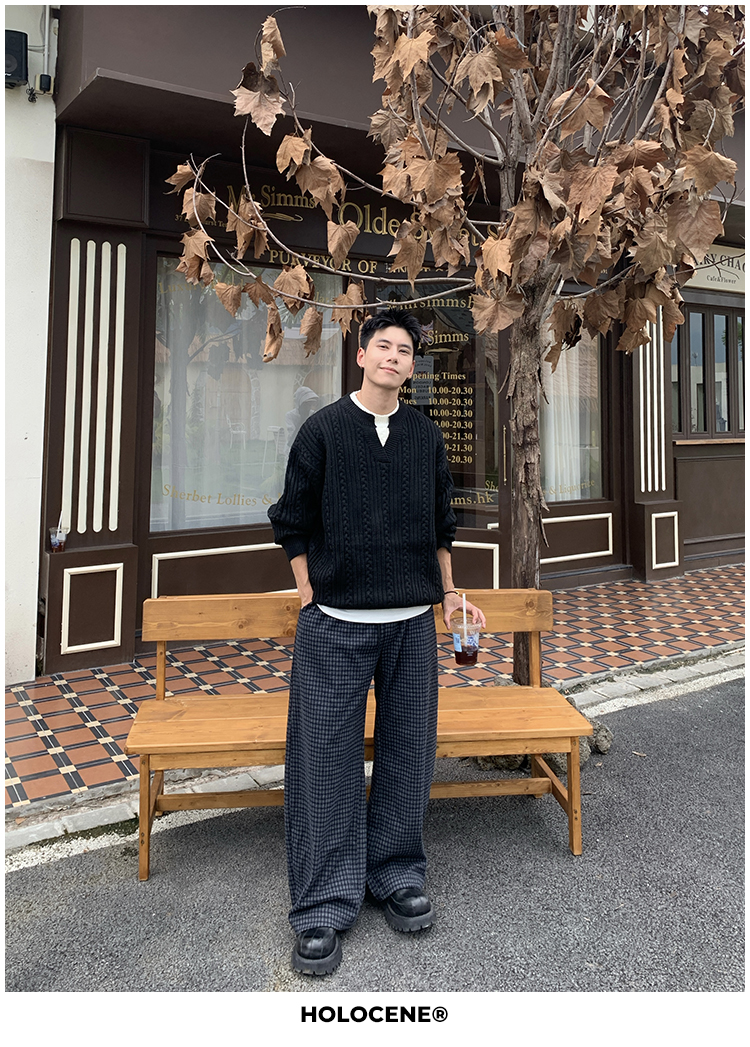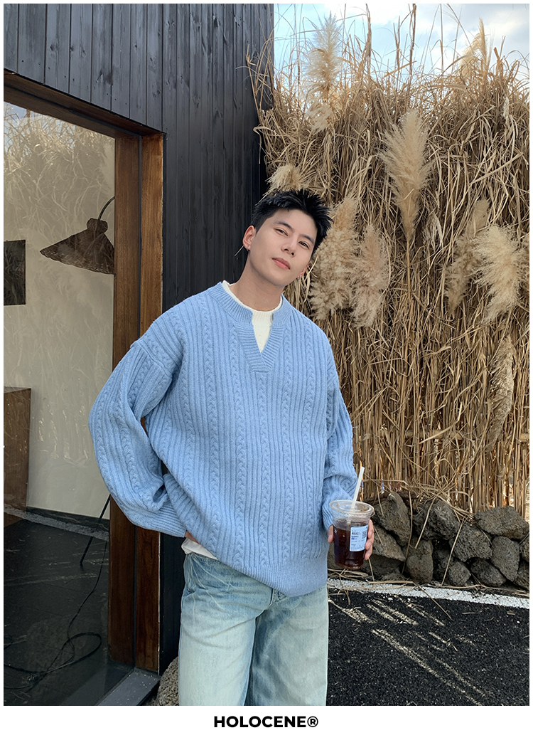 Holocene American-Style Trendy Brand Three-Dimensional Texture Small V-Neck Pullover Sweater for Men, Solid Color, Simple and Loose Knitwear