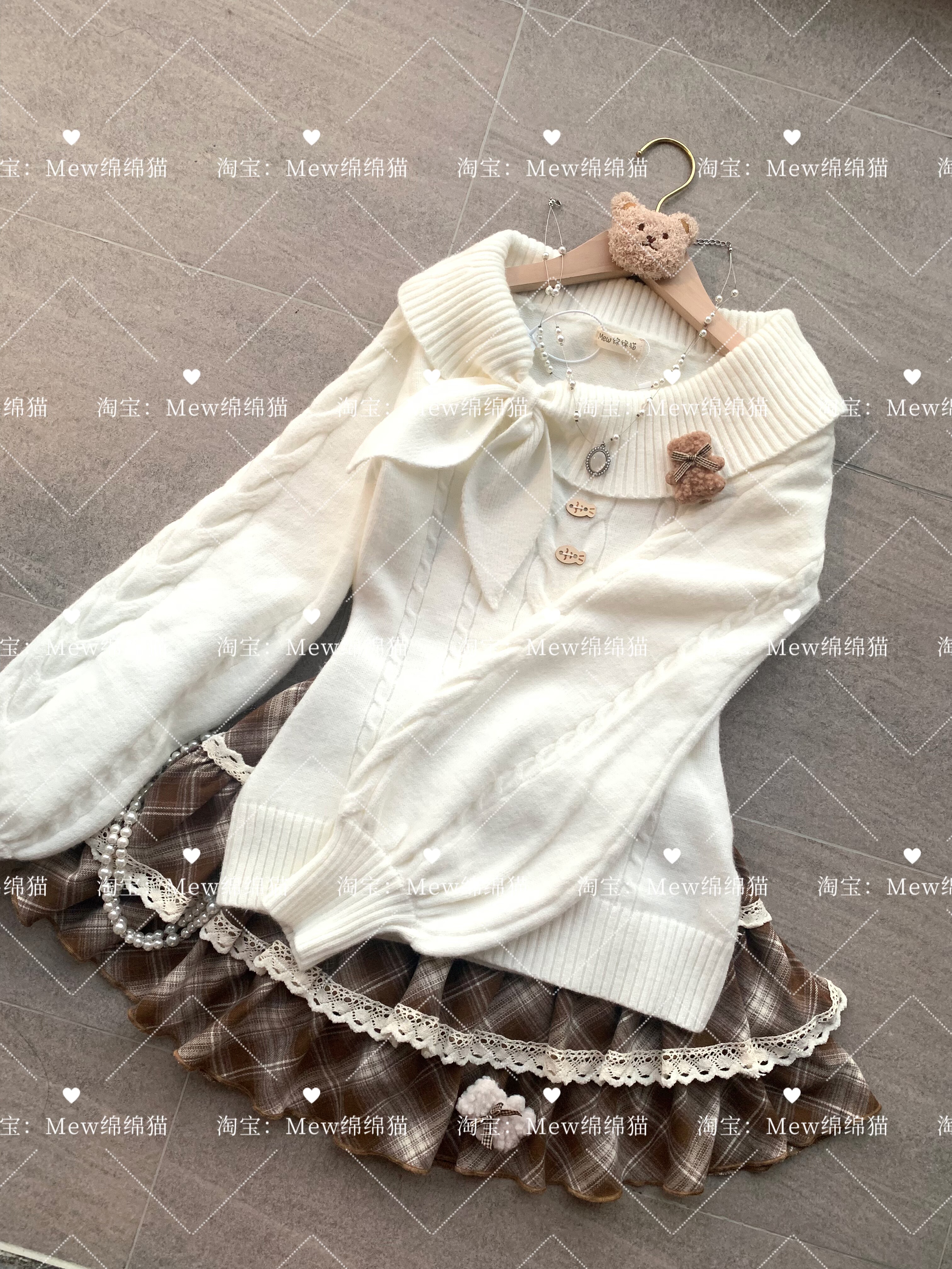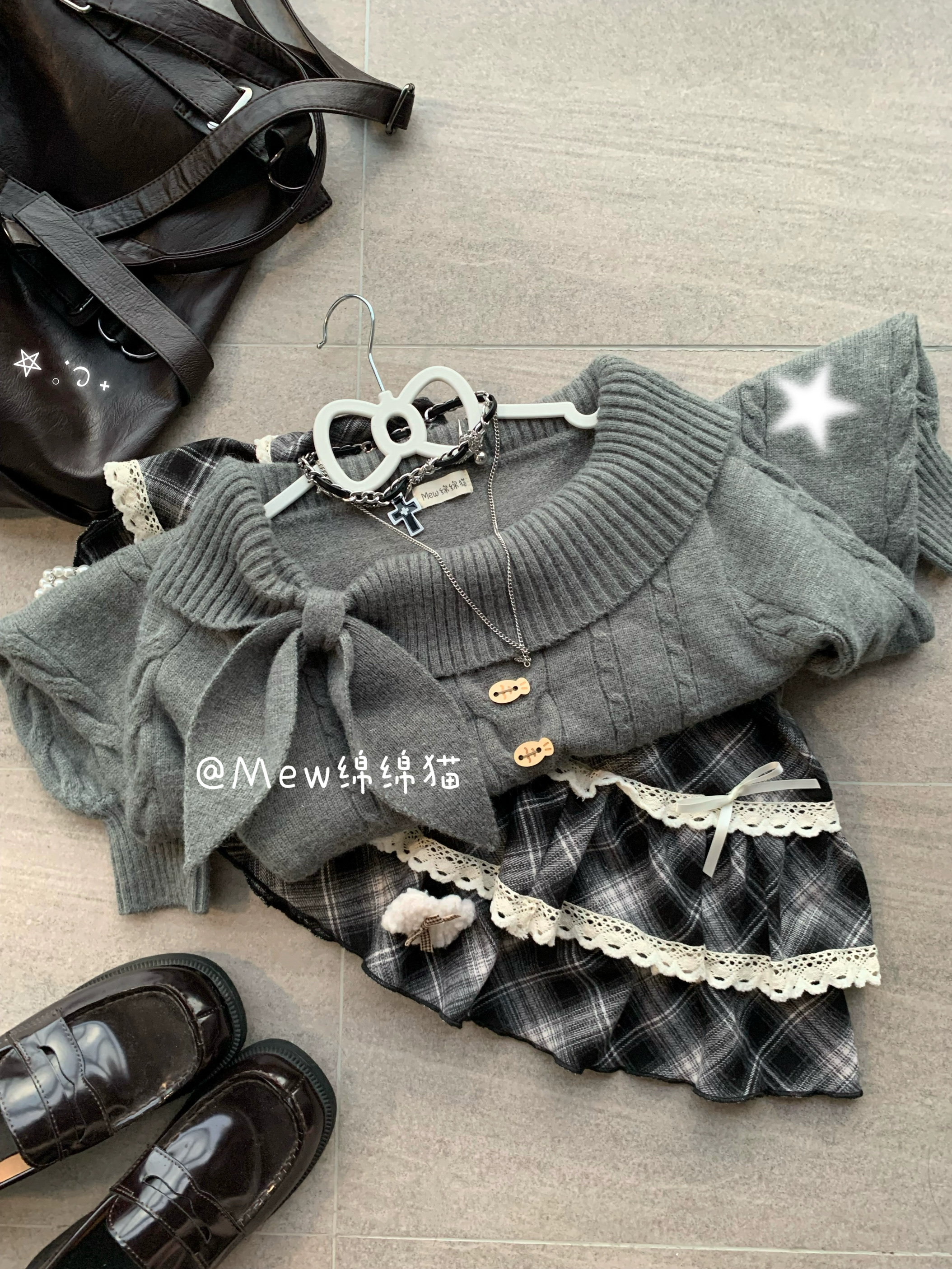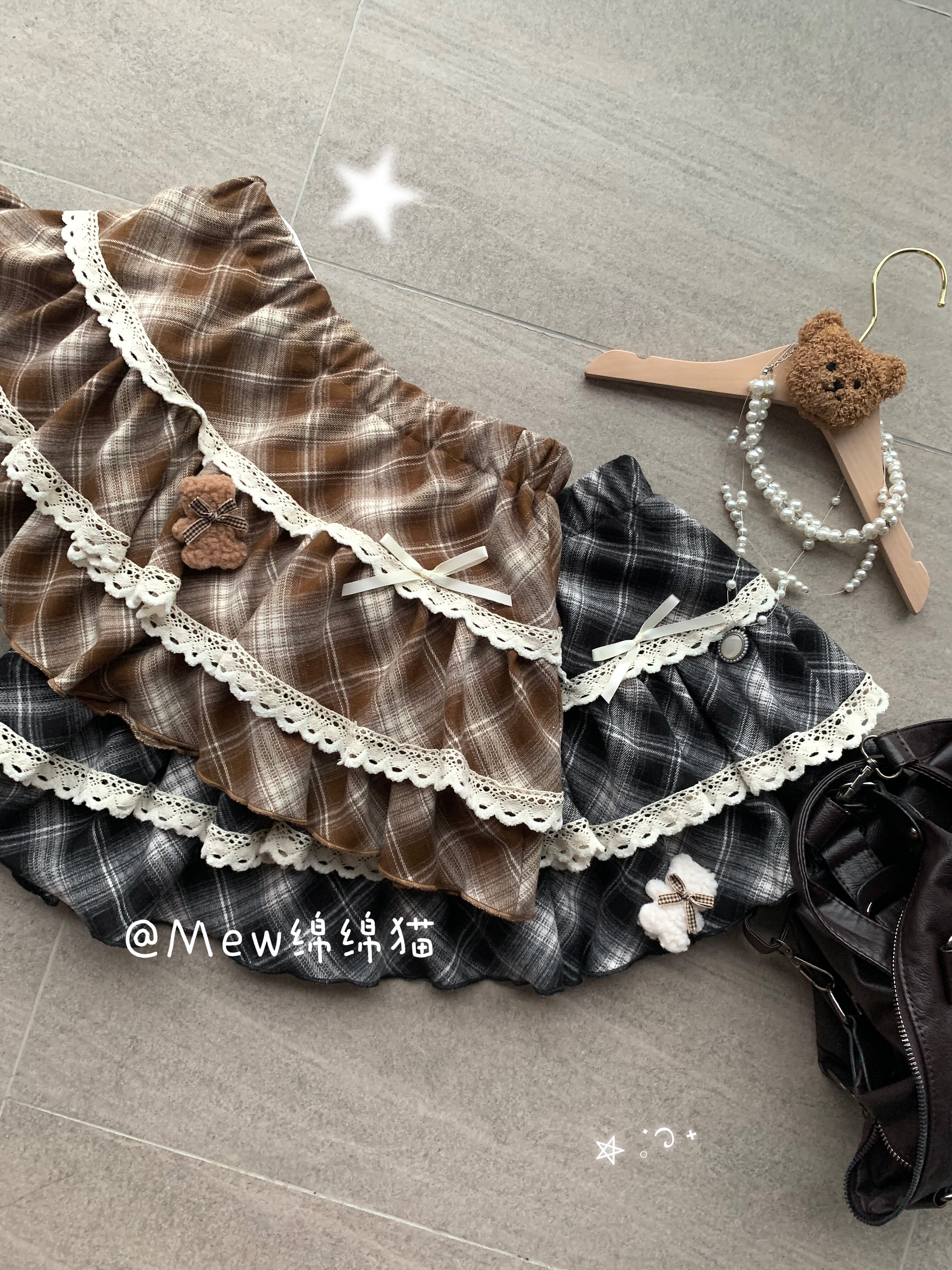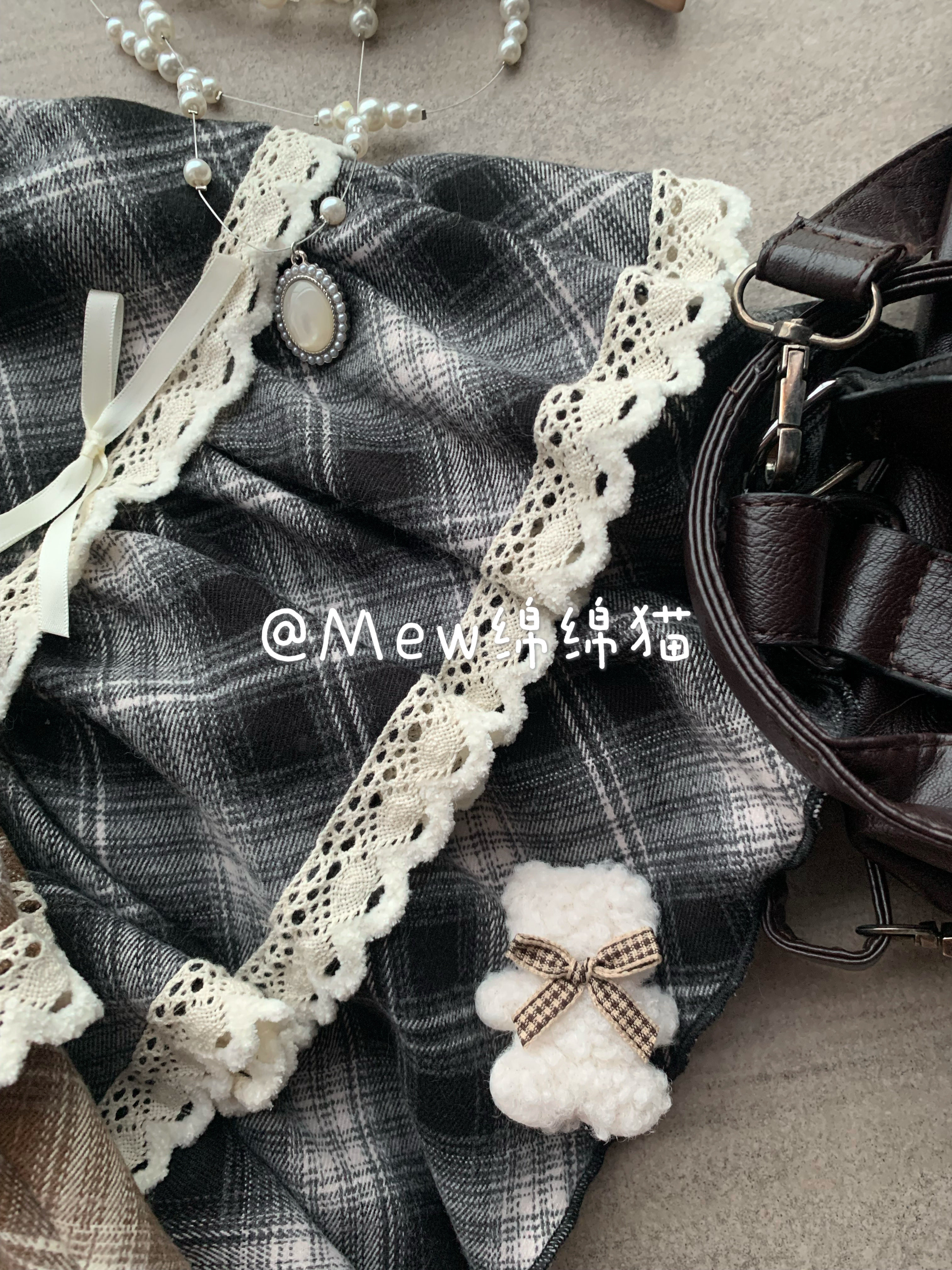 Mew Mianmianmao Autumn and Winter Brushed Plaid Lace Bow Sweet Retro Cake Dress