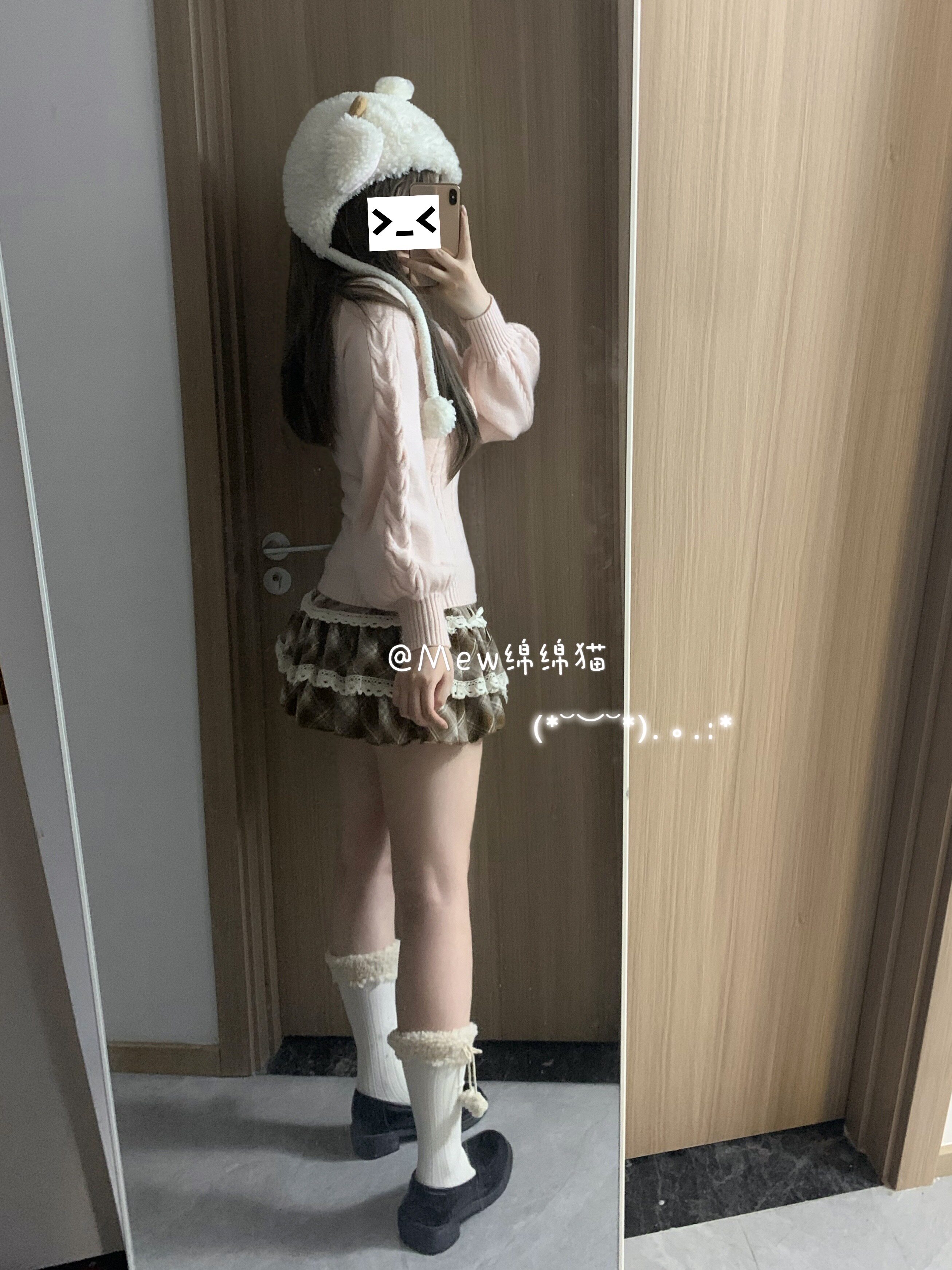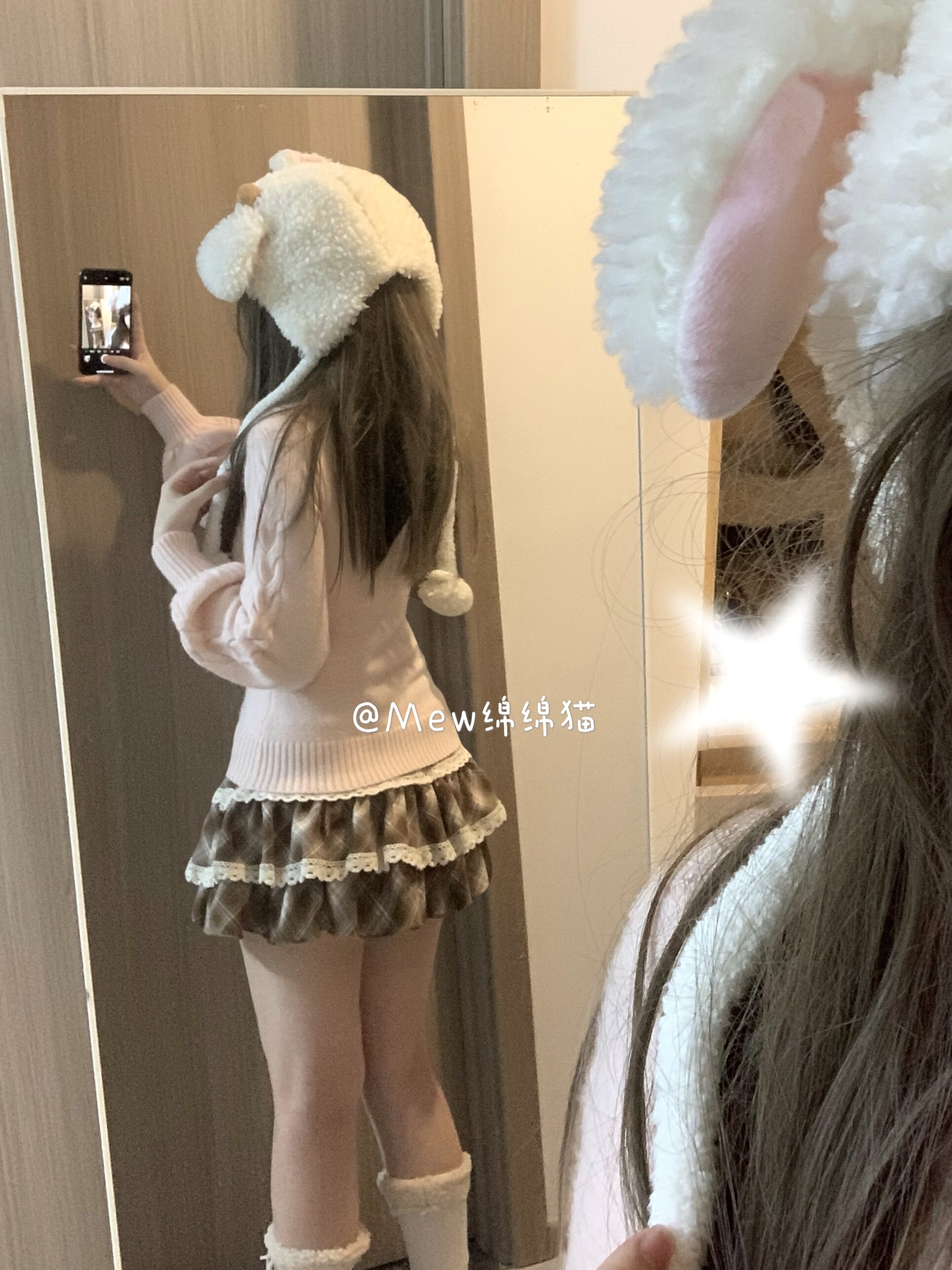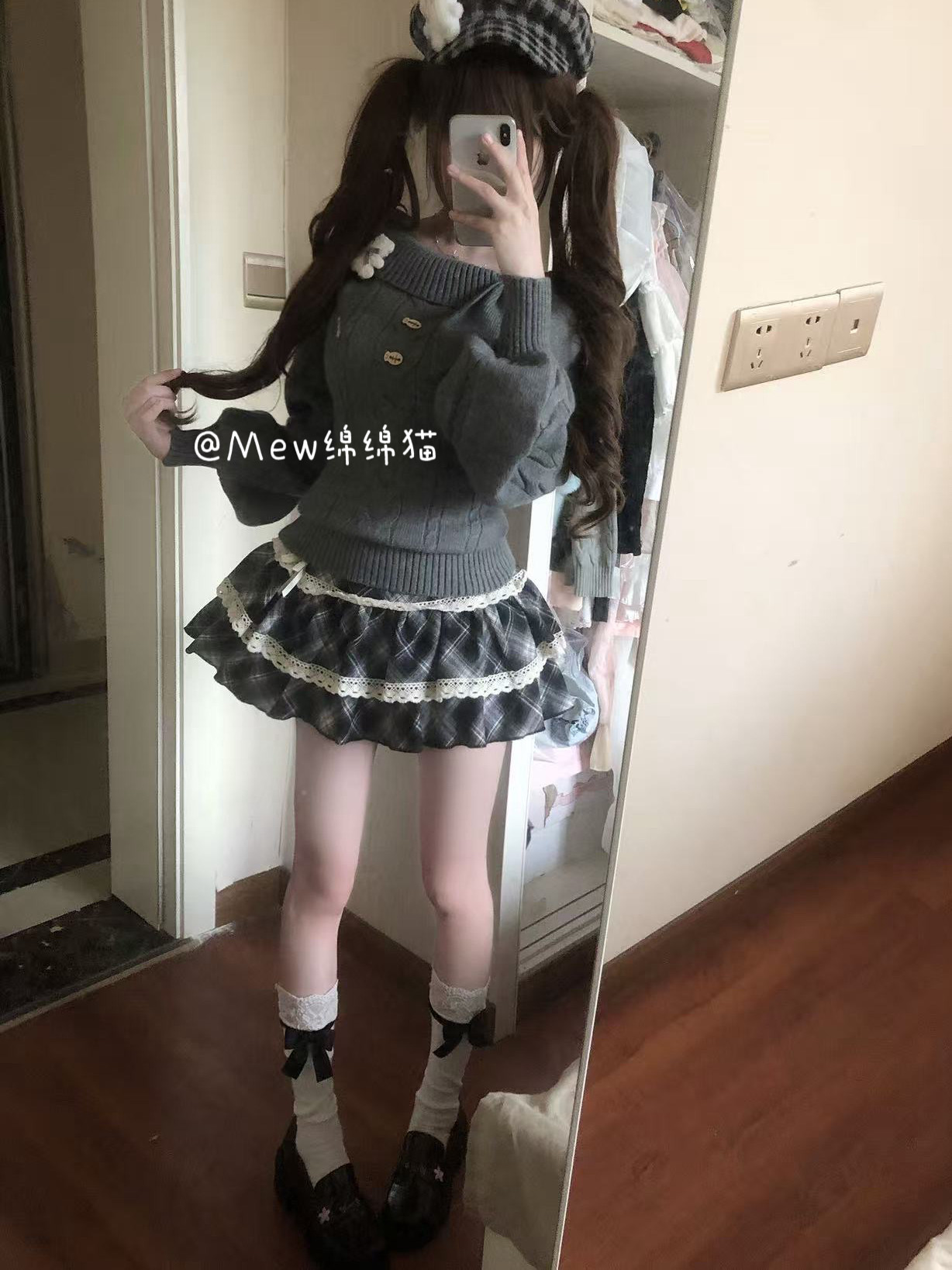 Mew Mianmianmao Autumn and Winter Brushed Plaid Lace Bow Sweet Retro Cake Dress