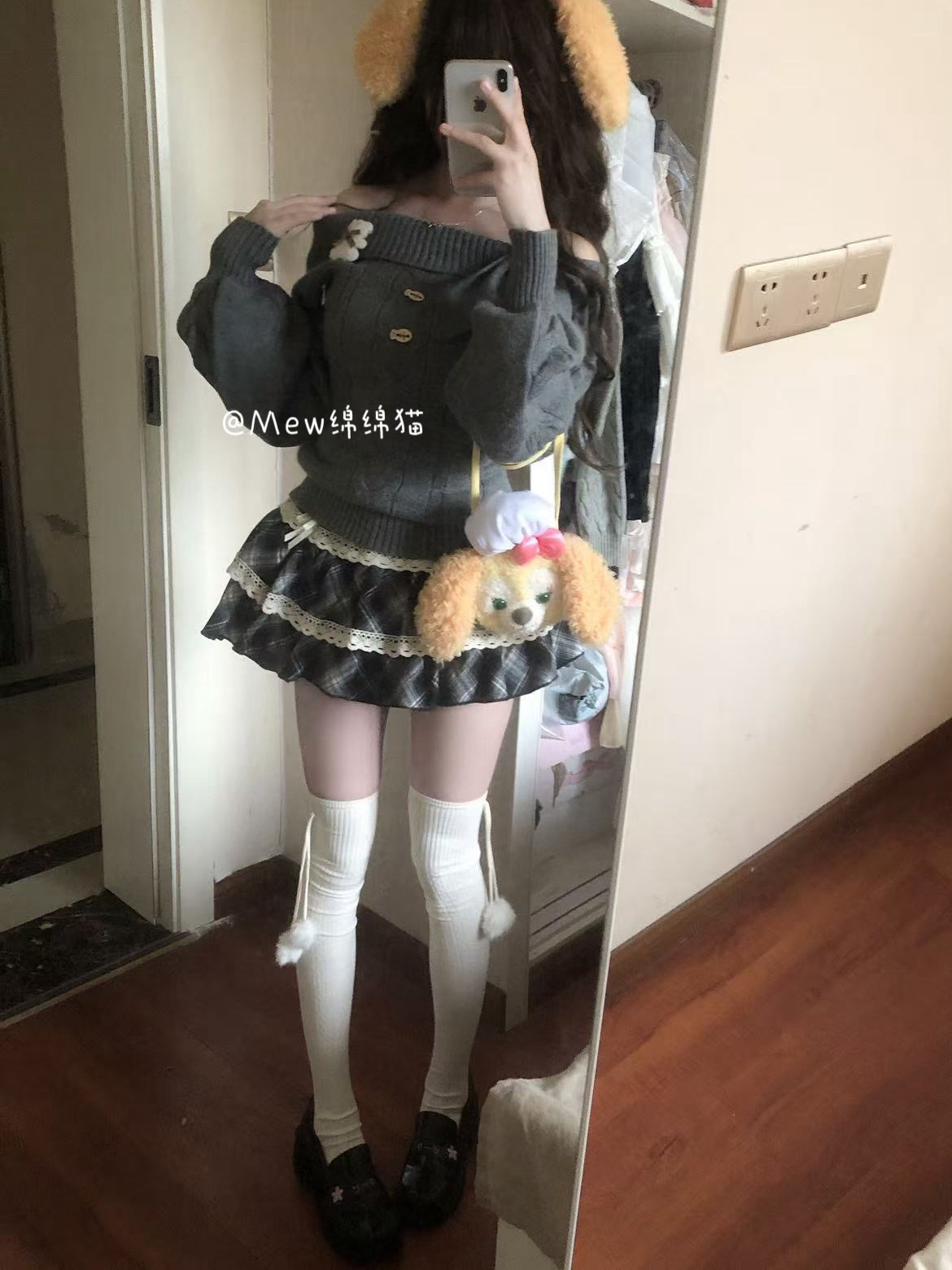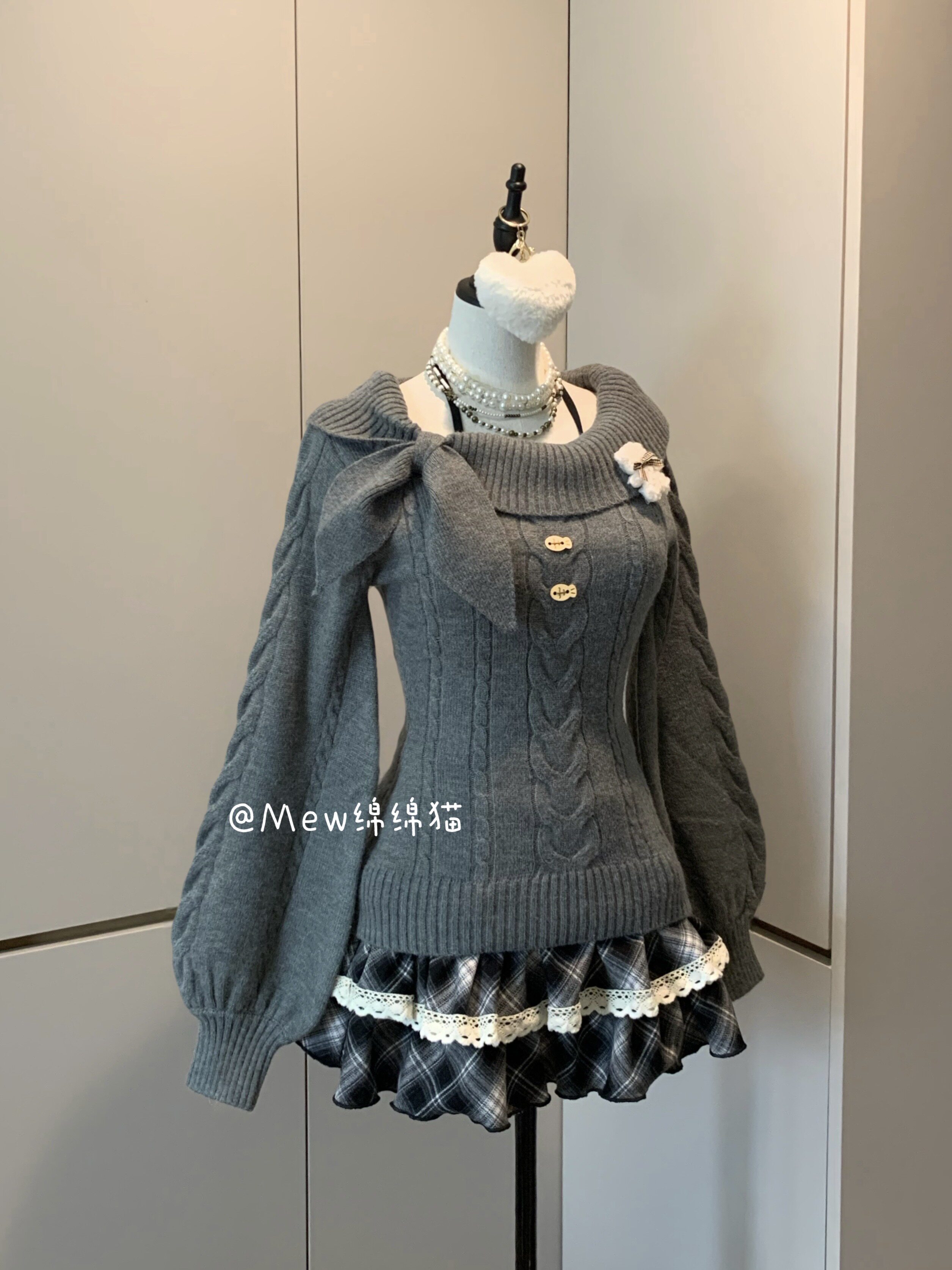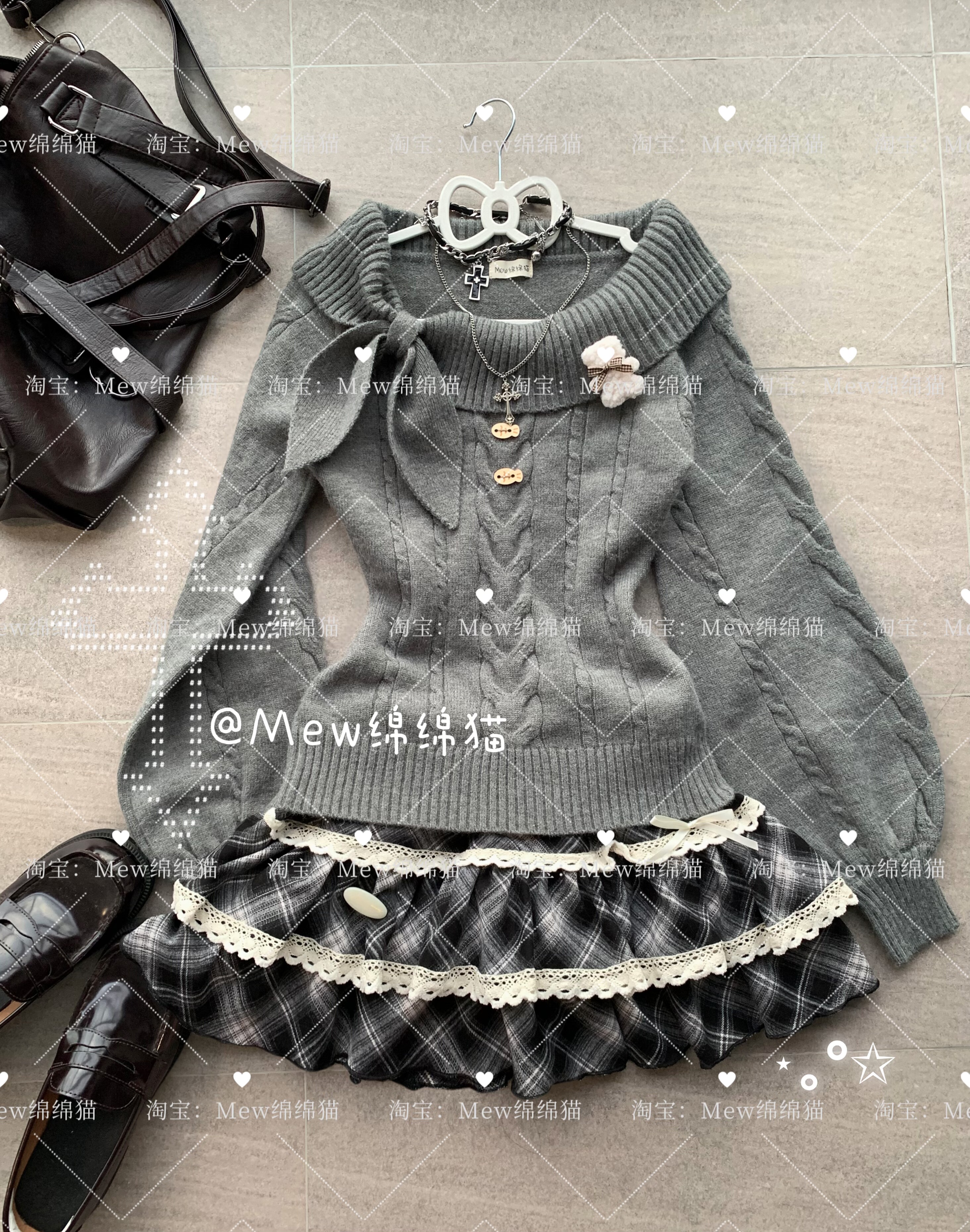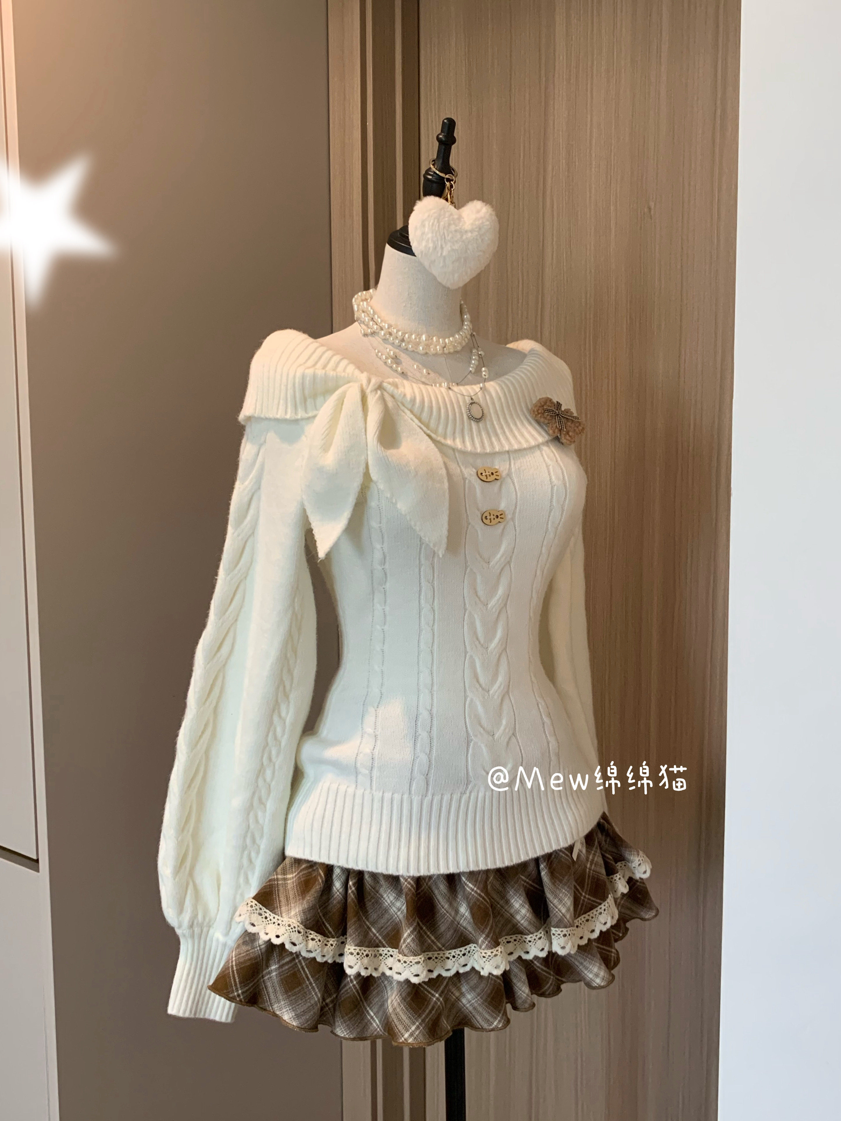 Mew Mianmianmao Autumn and Winter Brushed Plaid Lace Bow Sweet Retro Cake Dress