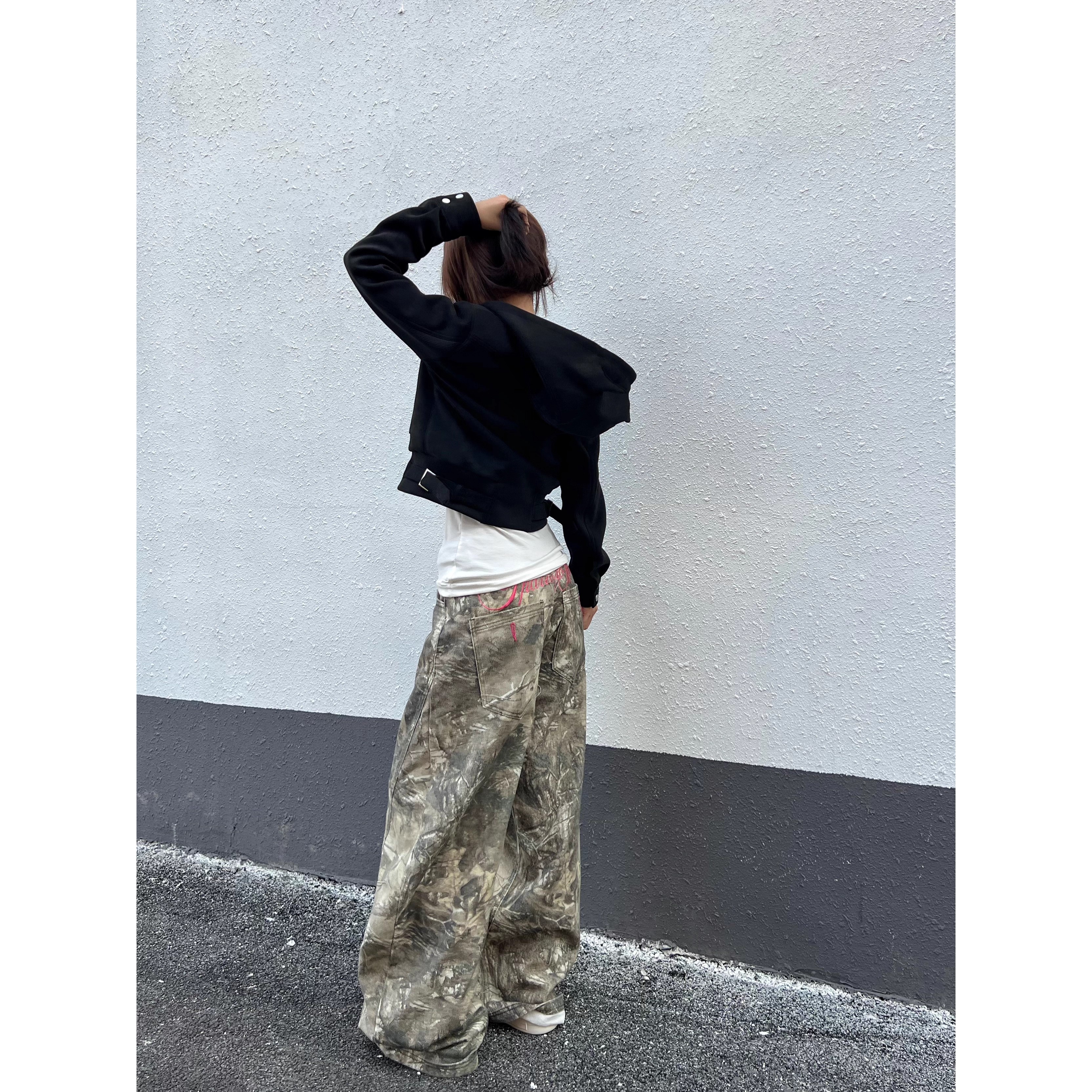 American Vintage Washed Distressed Letter Embroidery Branch Camouflage Casual Pants Unisex Versatile Wide-Leg Straight Pants