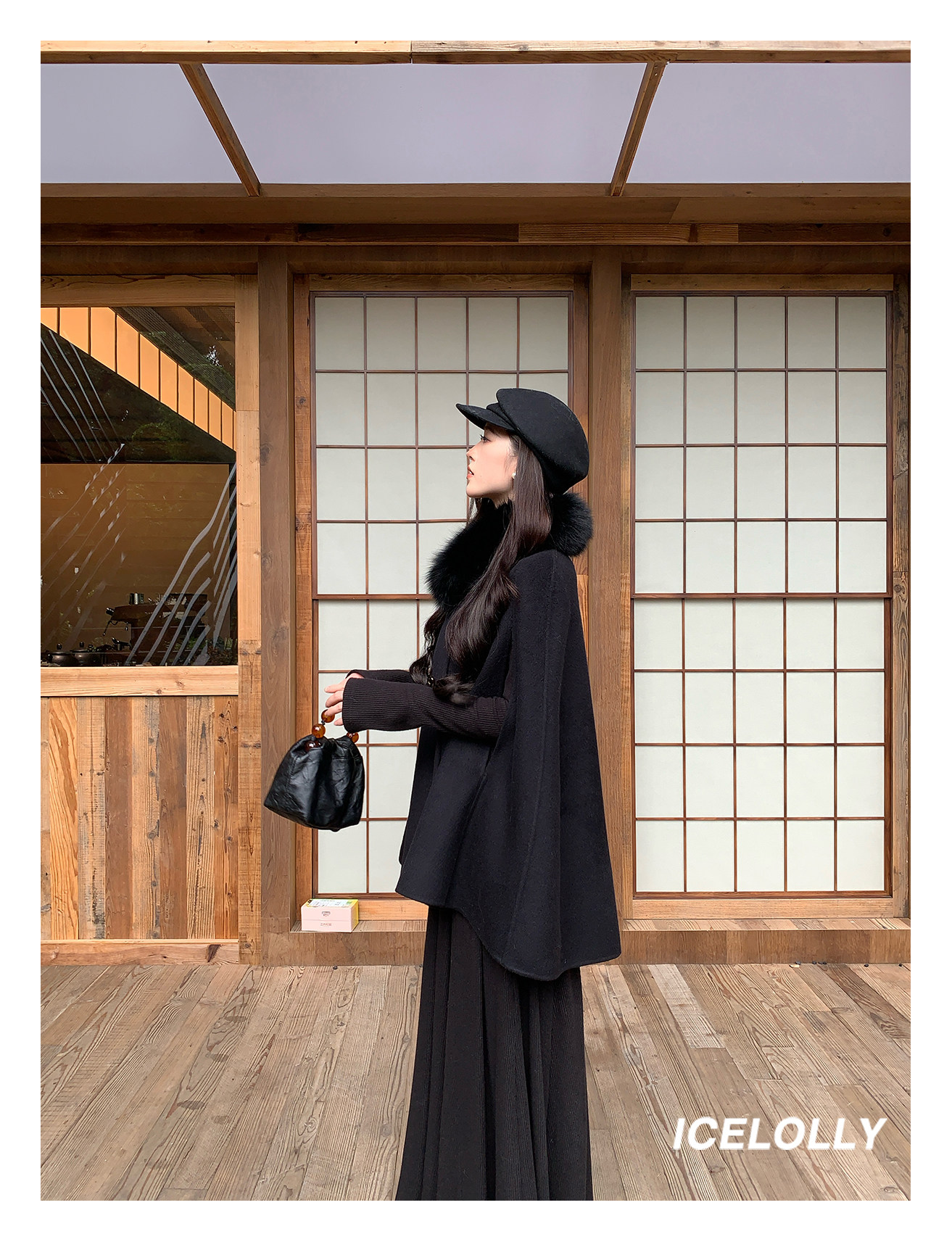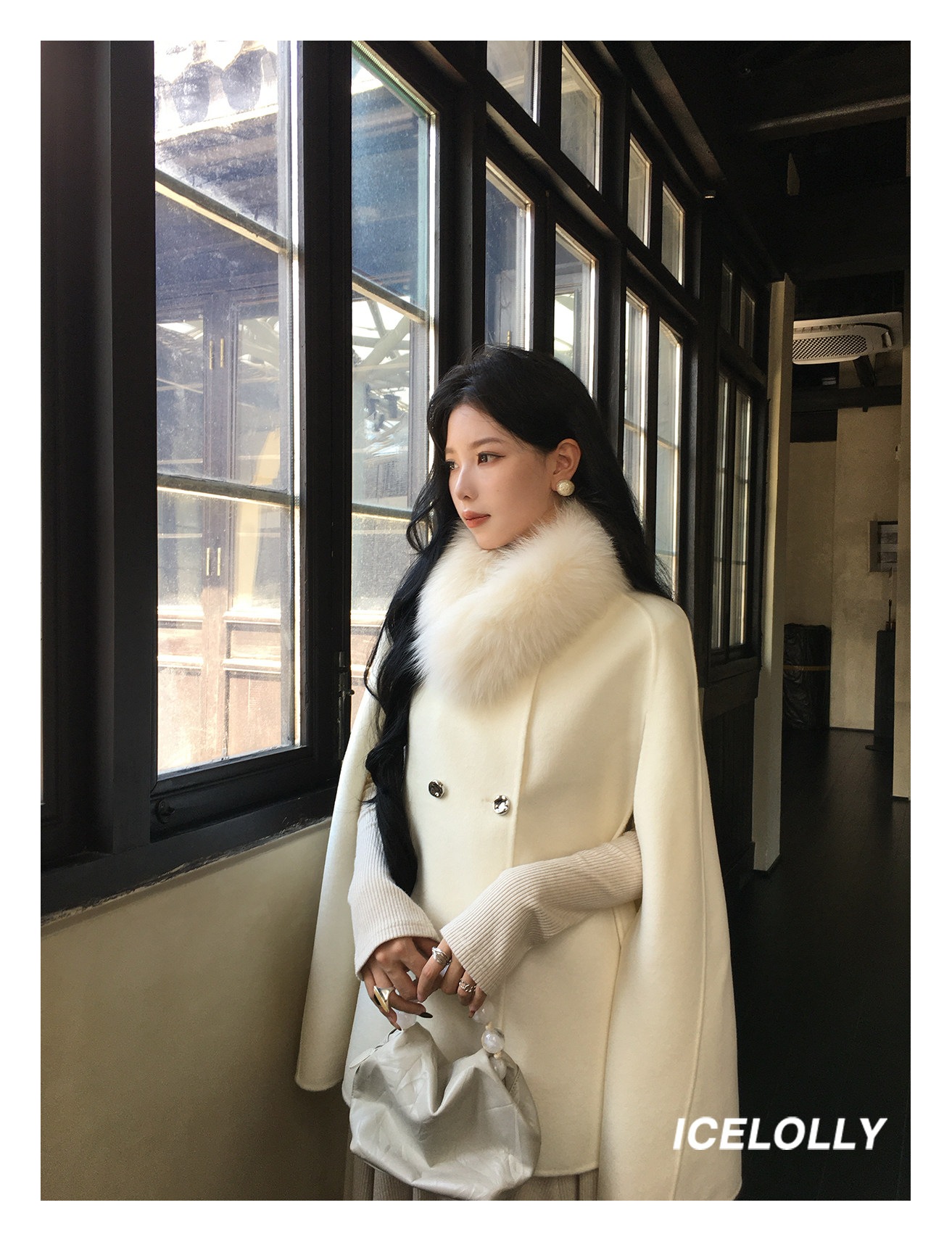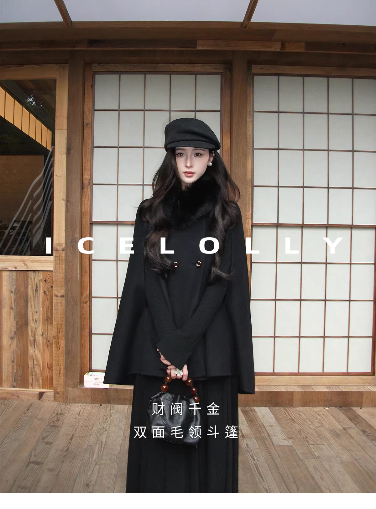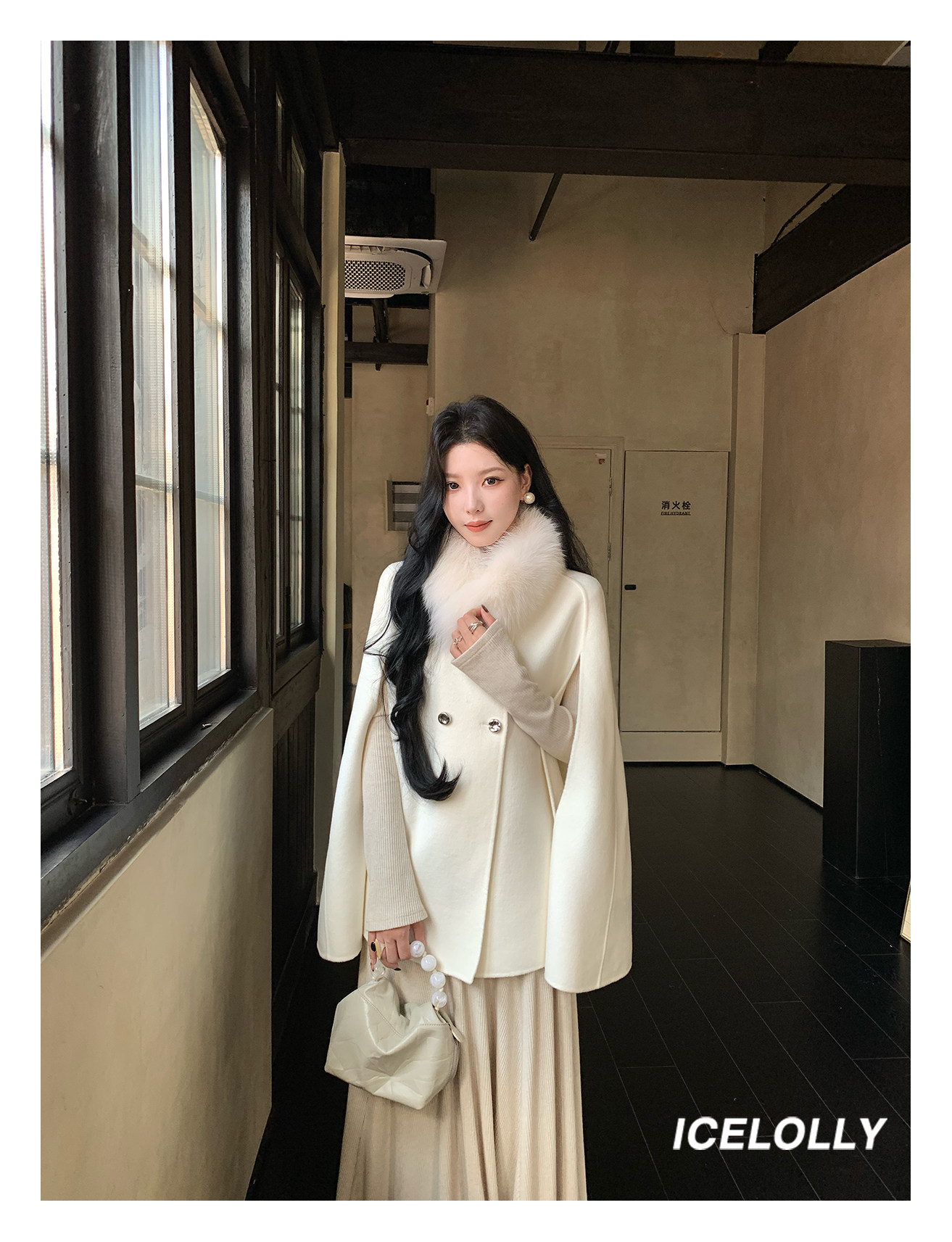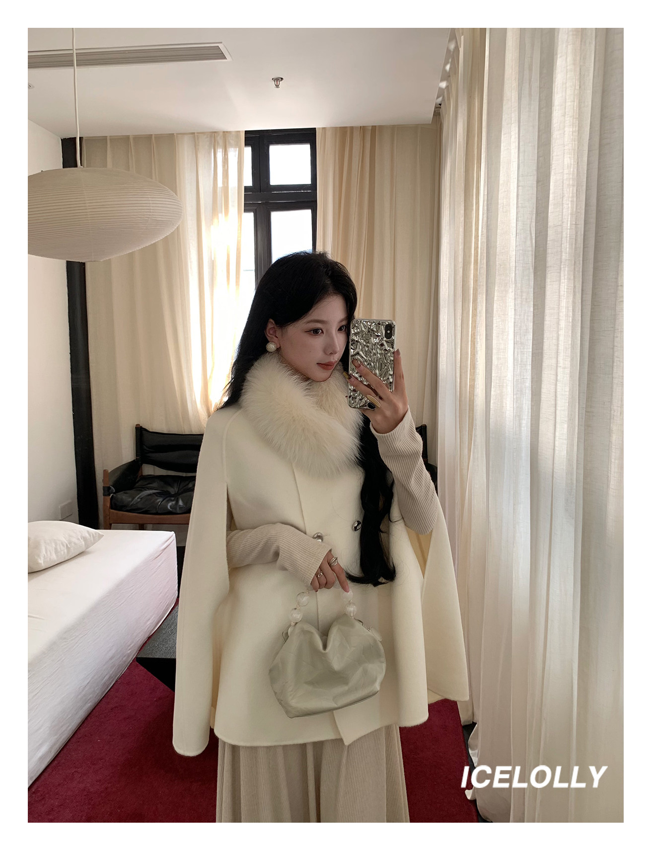 Icelolly Wool Double-Sided Woolen Cape Coat for Women 2025 New Autumn and Winter Fox Fur Collar Short Woolen Coat