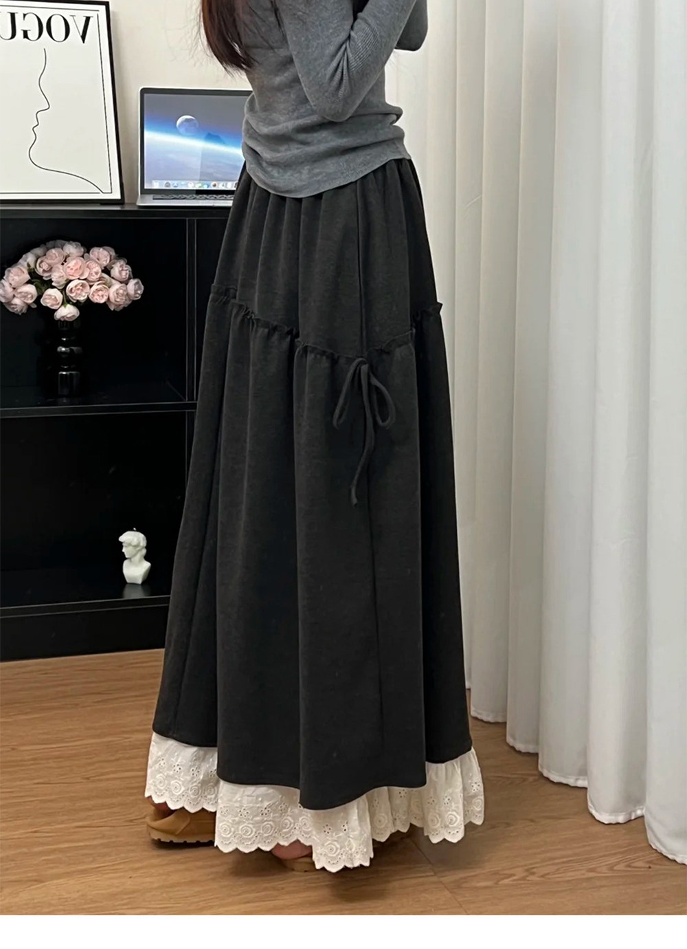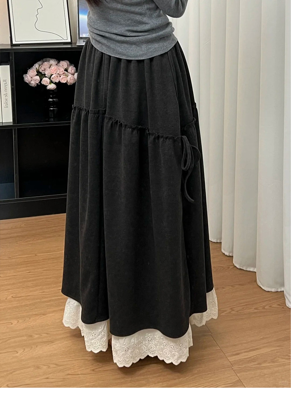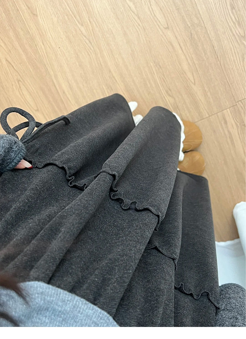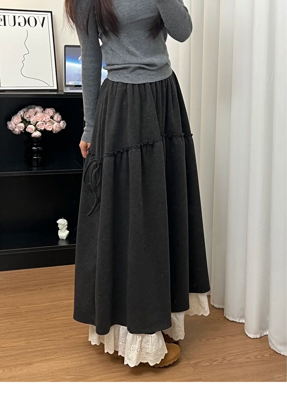 Gray Half-Length Skirt, Winter Plus Size, Soft and Flowy A-Line Long Skirt for Pear-Shaped Body, Hip-Covering Lace Trim Woolen Skirt
