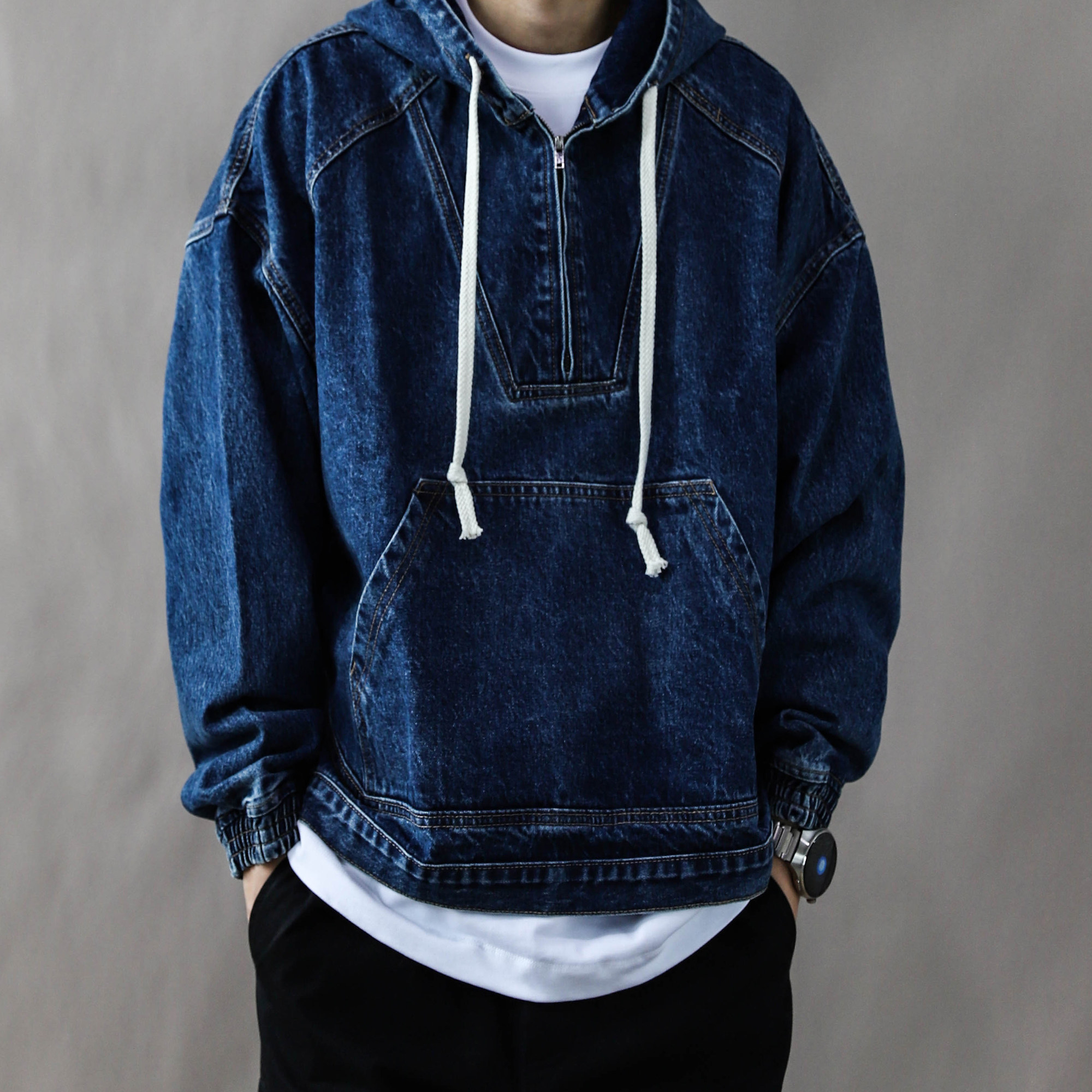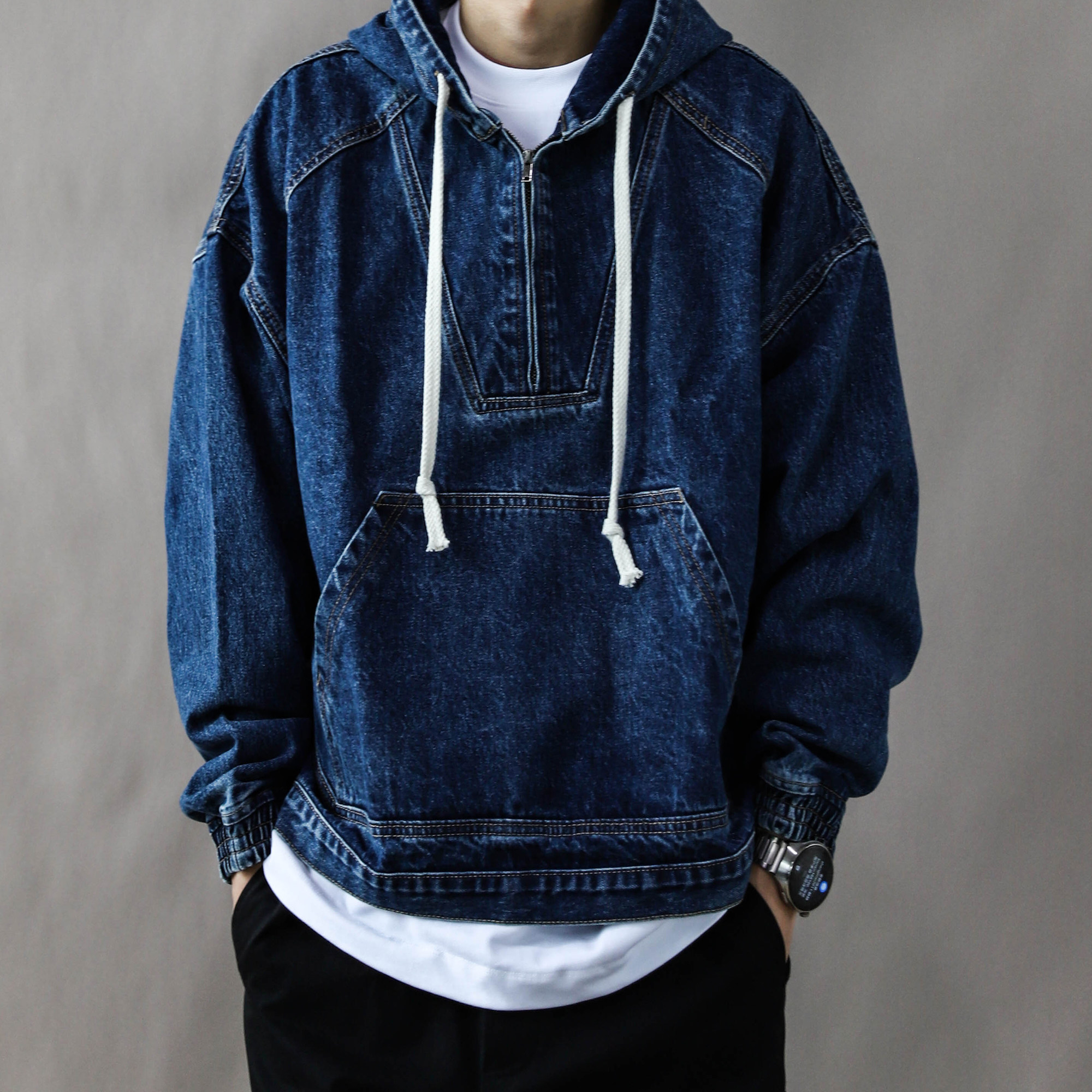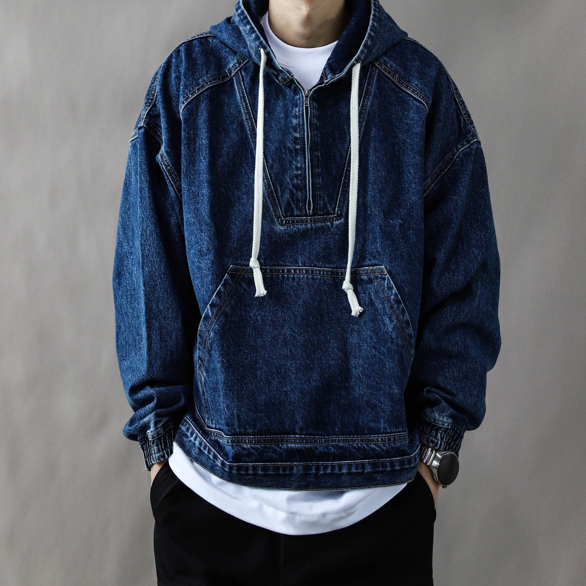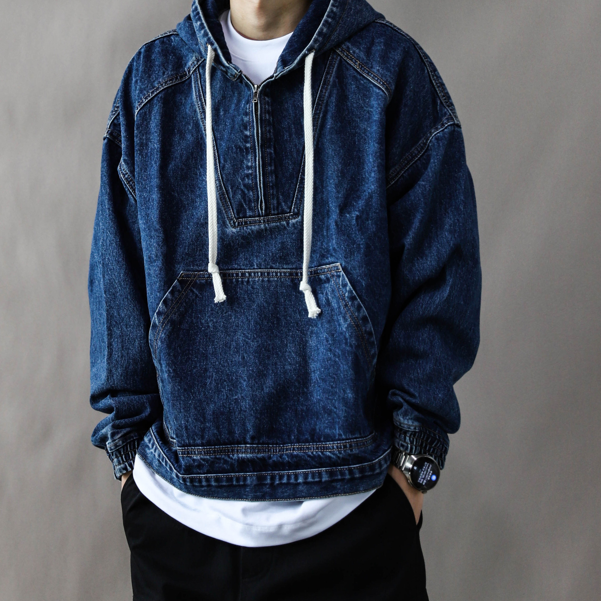 American Retro Heavy Denim Jacket for Men, Spring and Autumn, Loose Casual 2025 New Style, Hooded Top, Washed and Distressed Blue