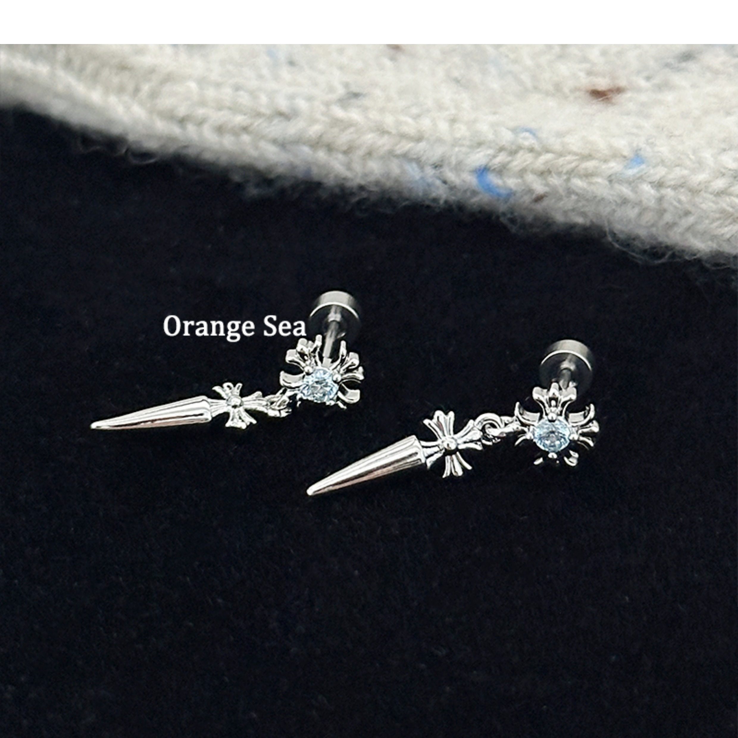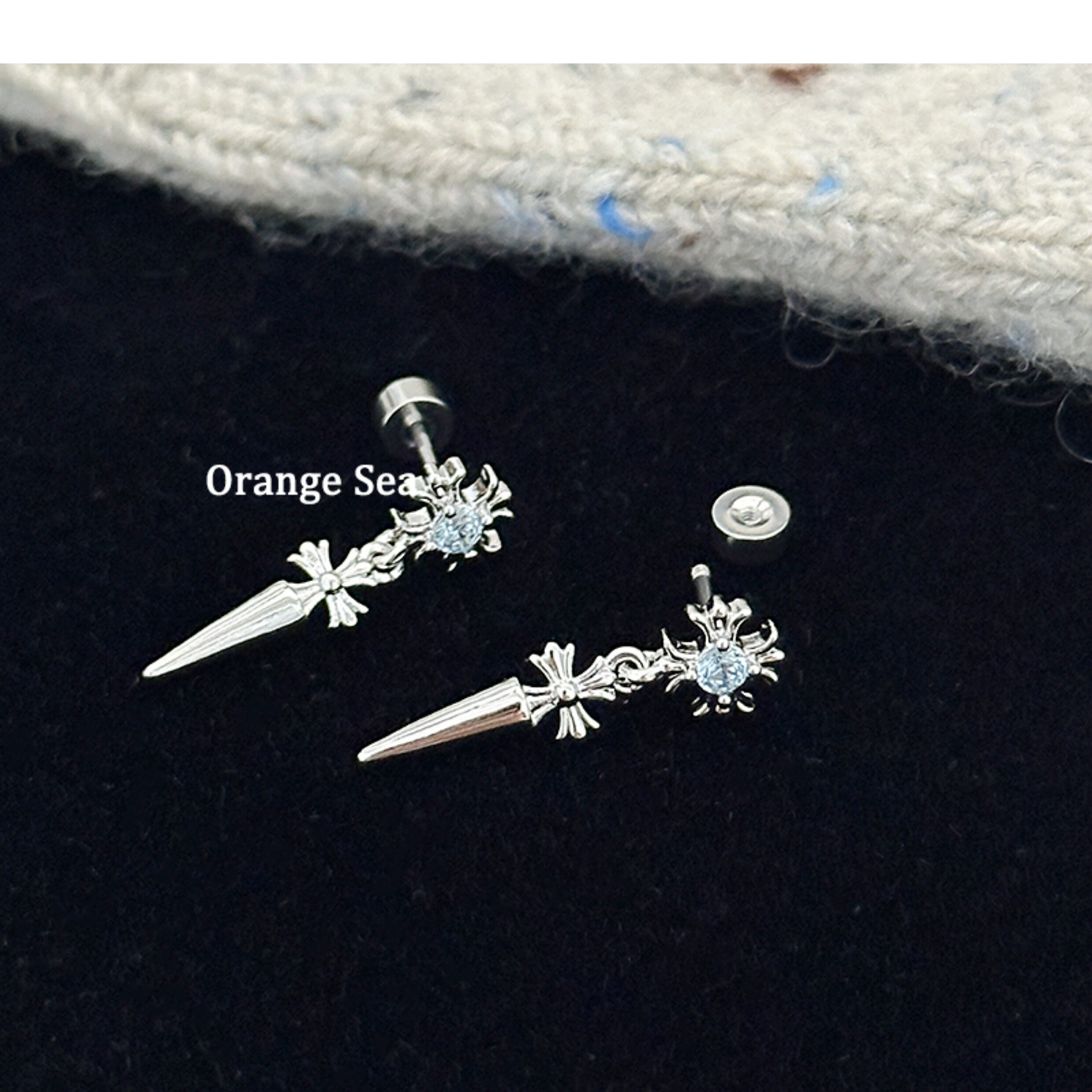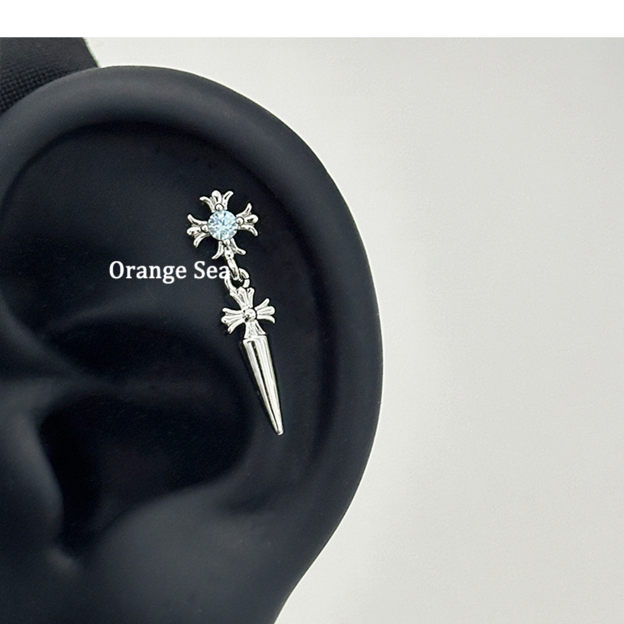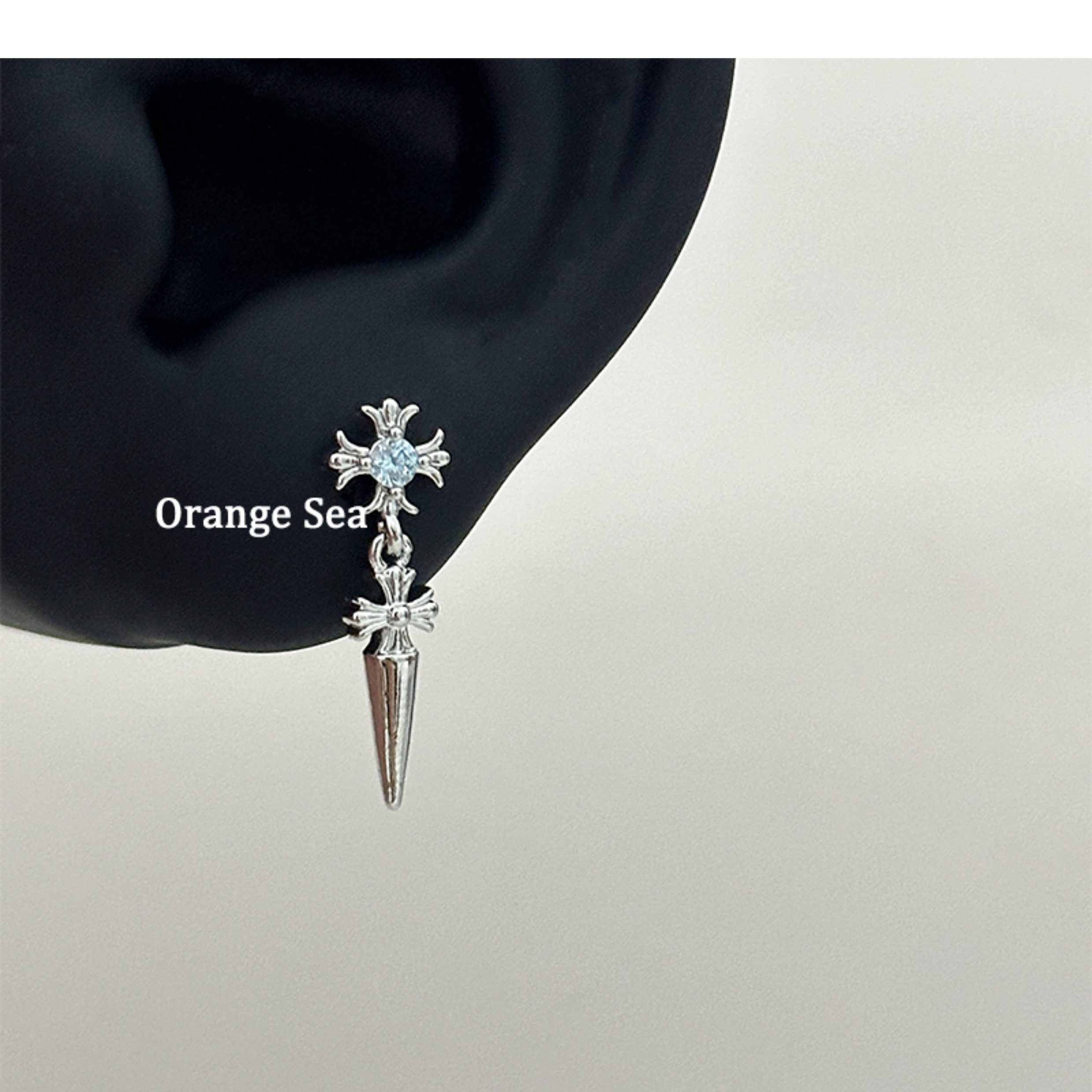 Orange Sea Sweet Cool Style Blue Zircon Cross Ear Bone Stud Unique Titanium Steel Pointed Cone Pendant Earrings