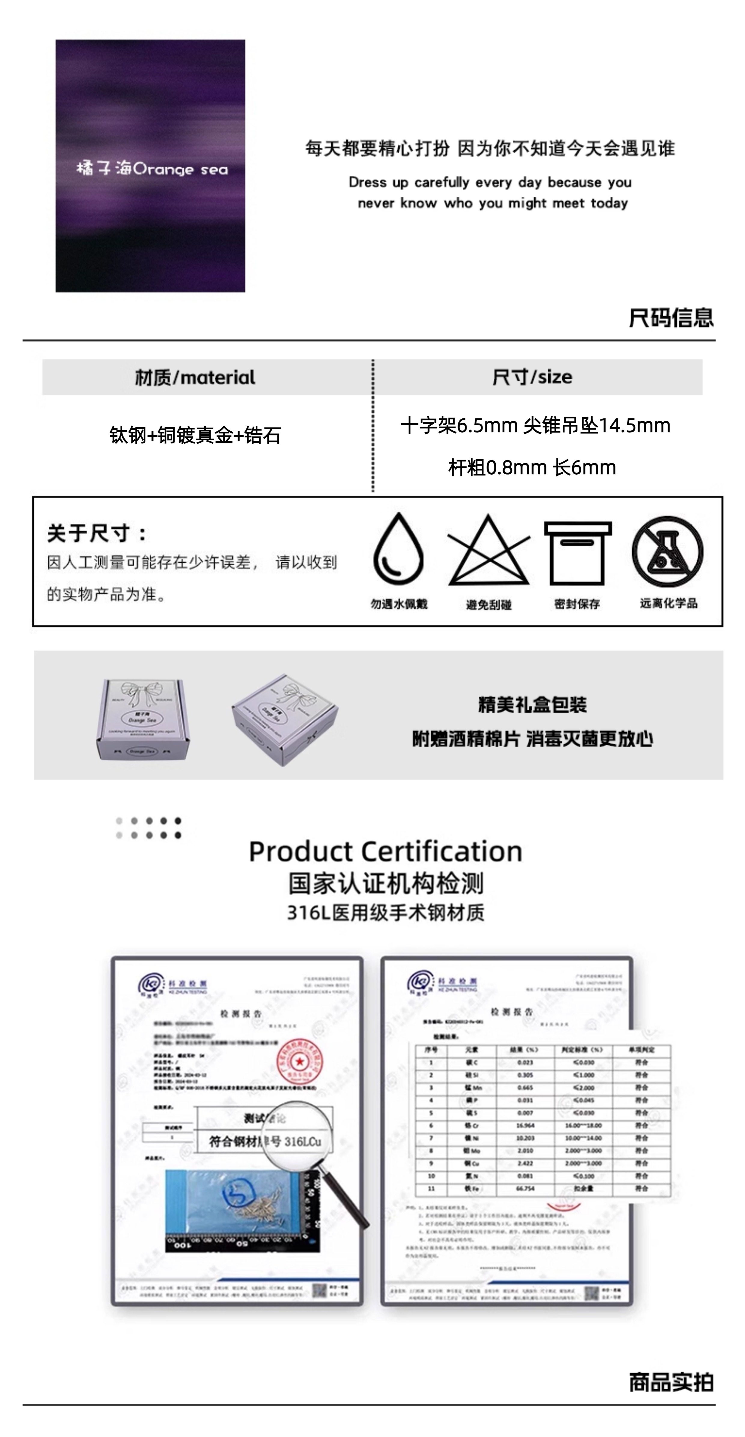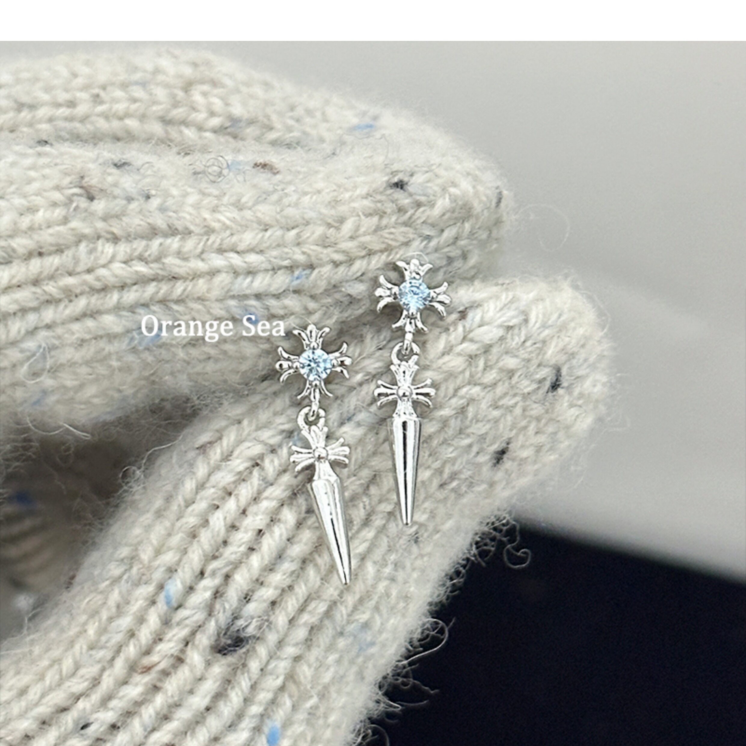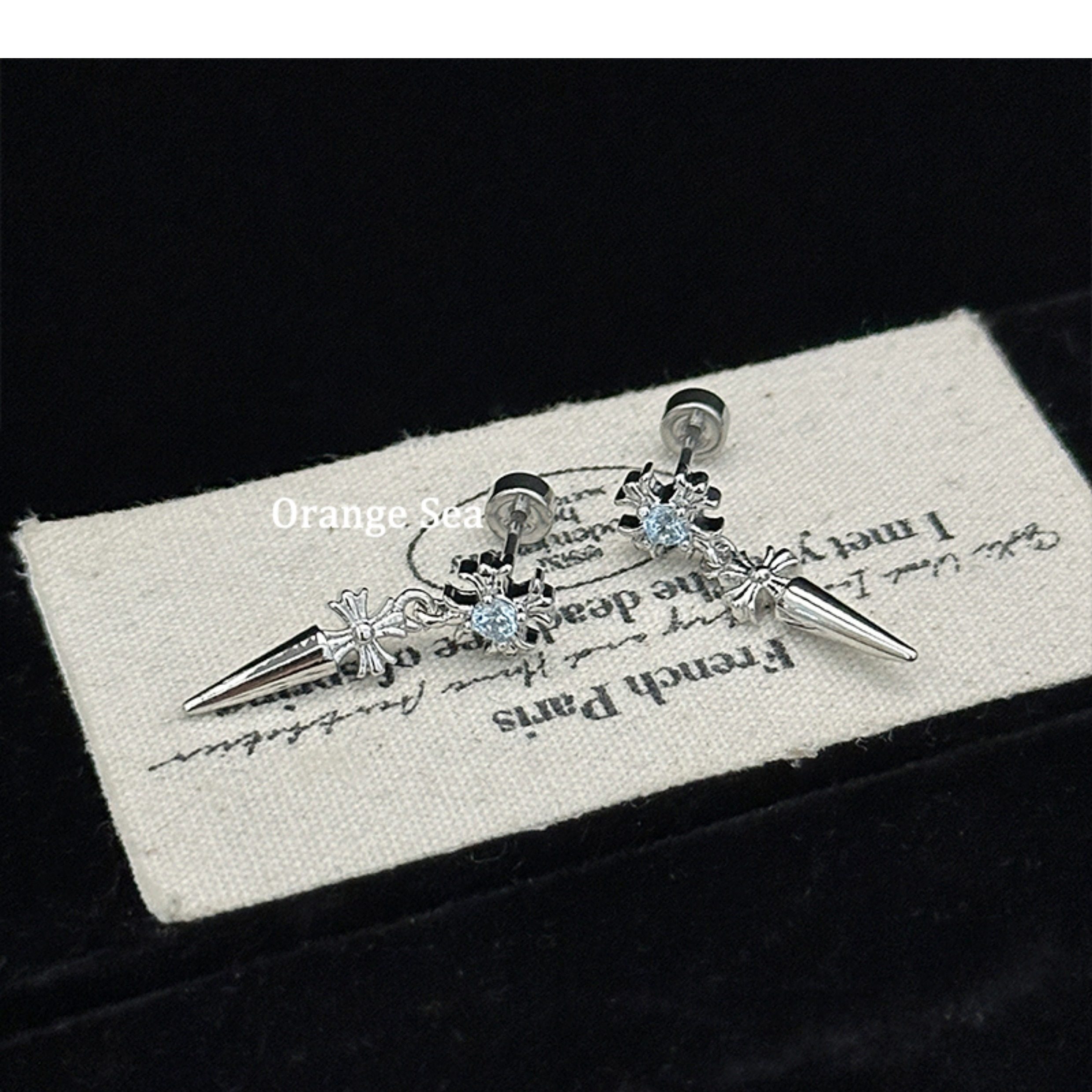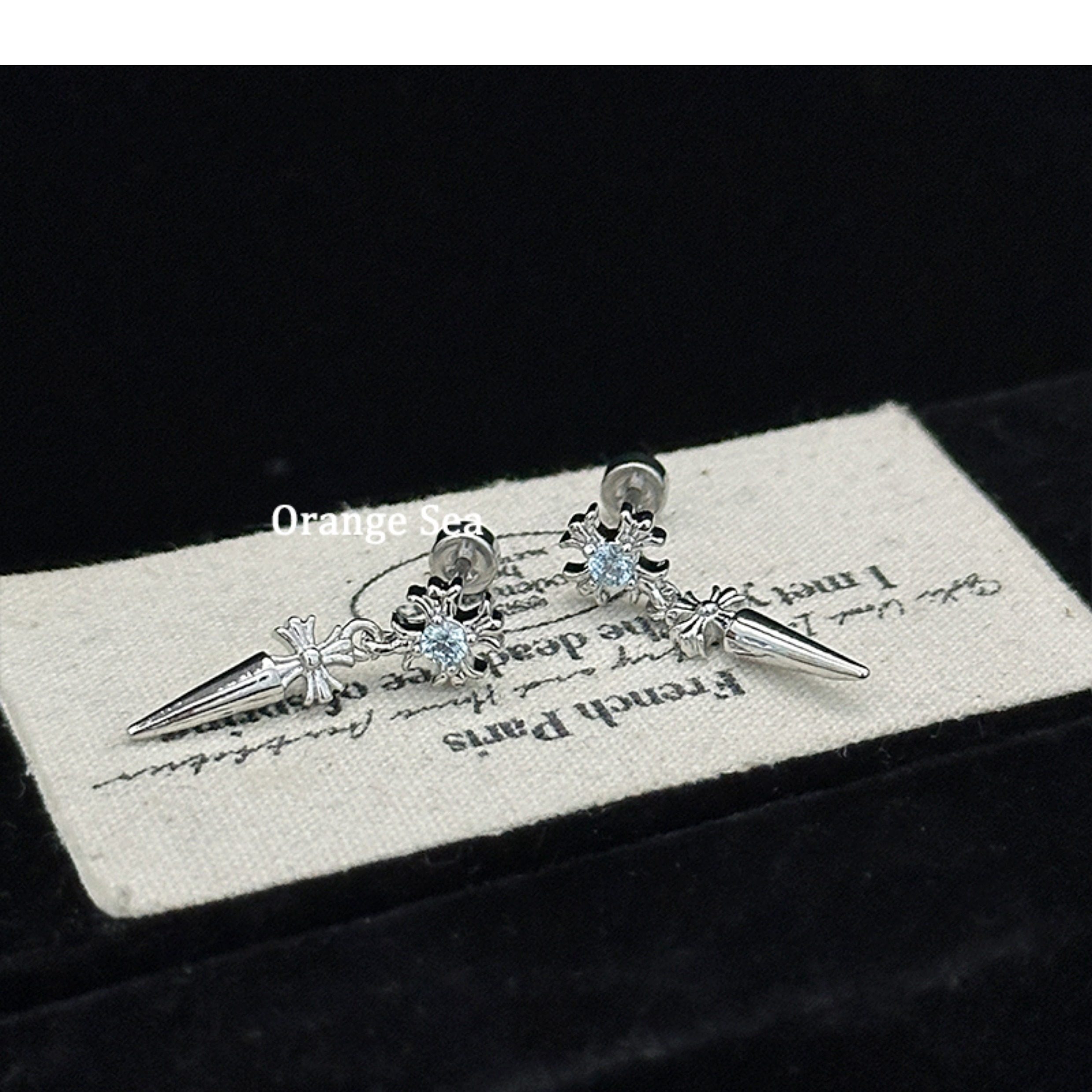 Orange Sea Sweet Cool Style Blue Zircon Cross Ear Bone Stud Unique Titanium Steel Pointed Cone Pendant Earrings