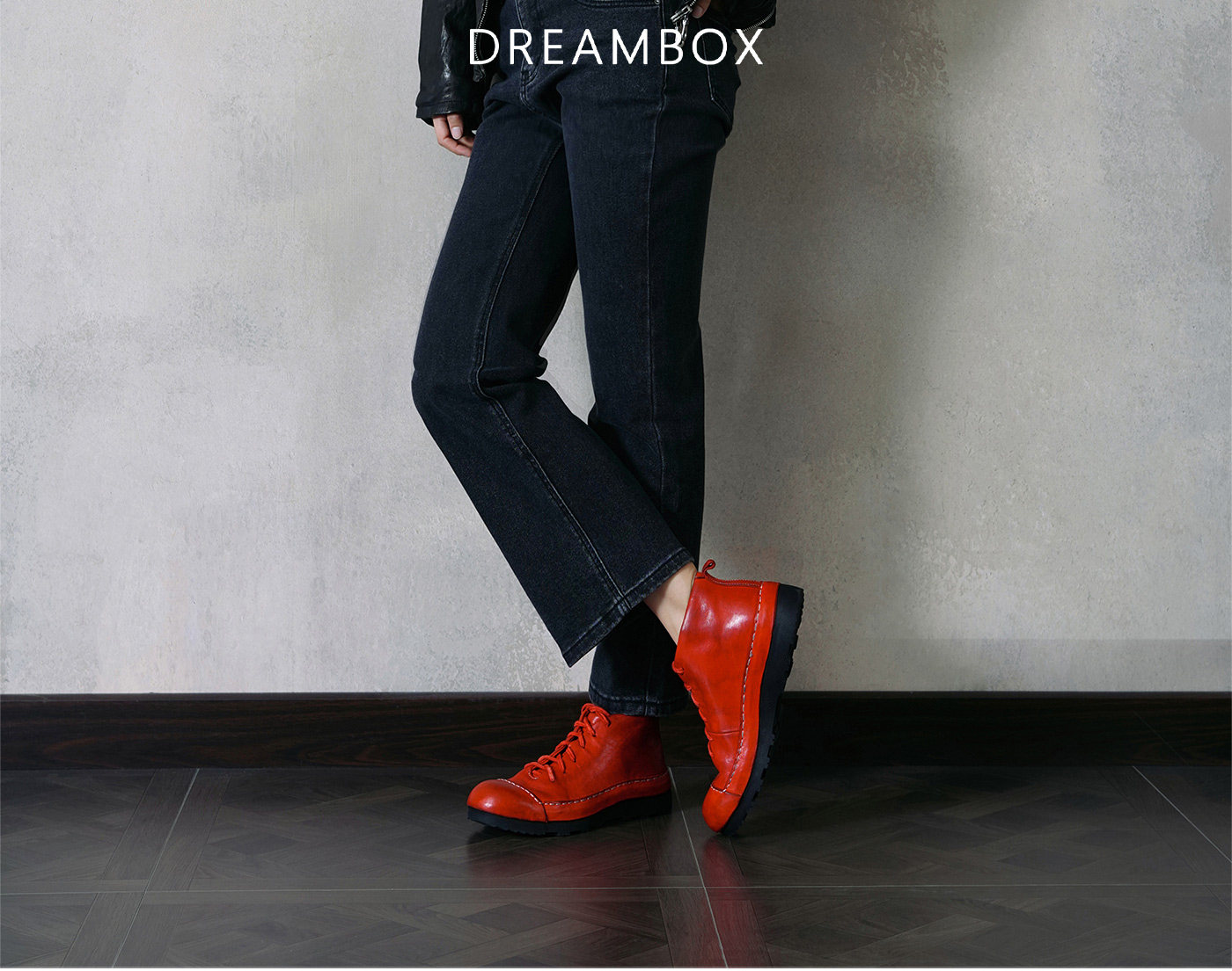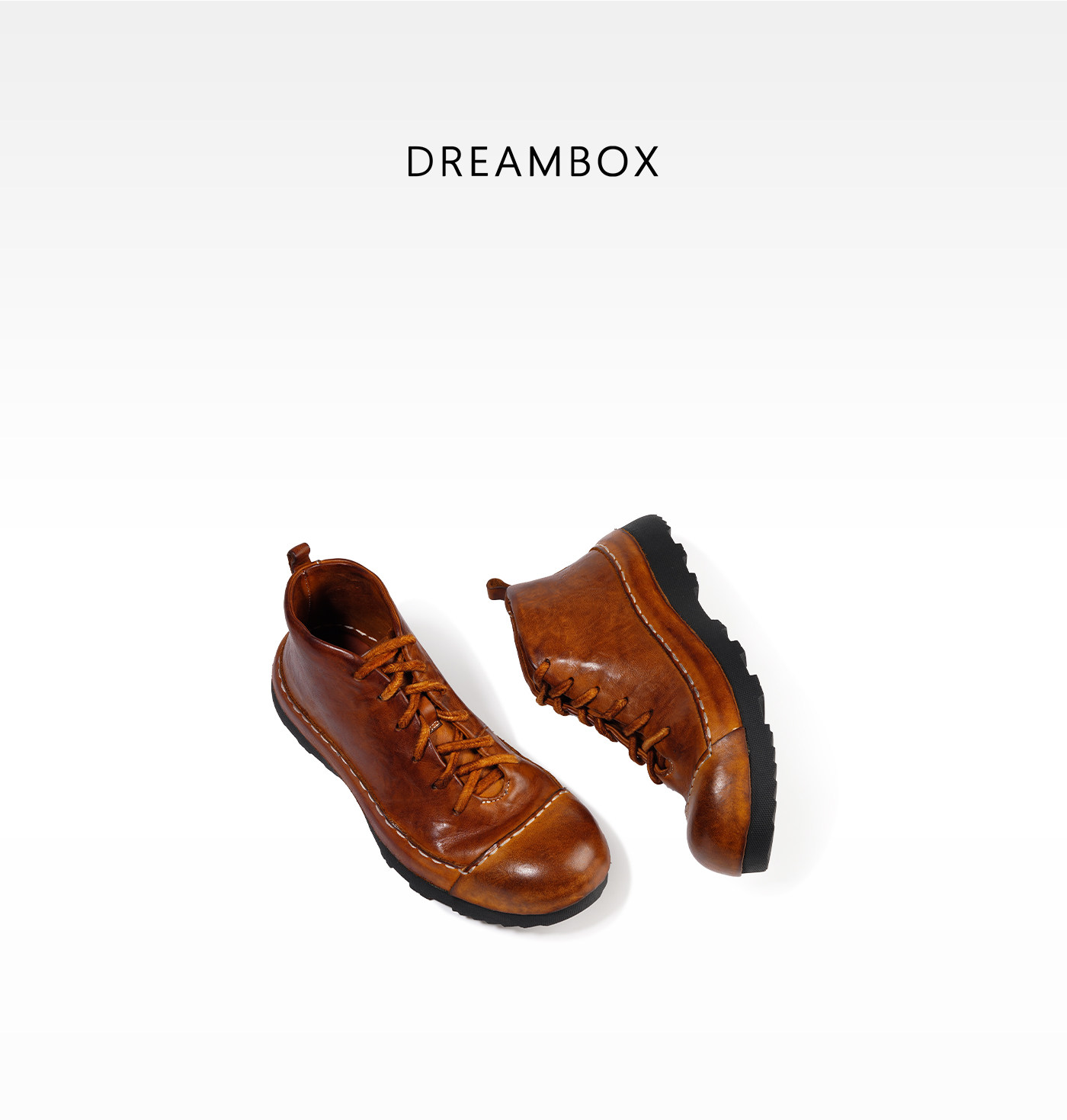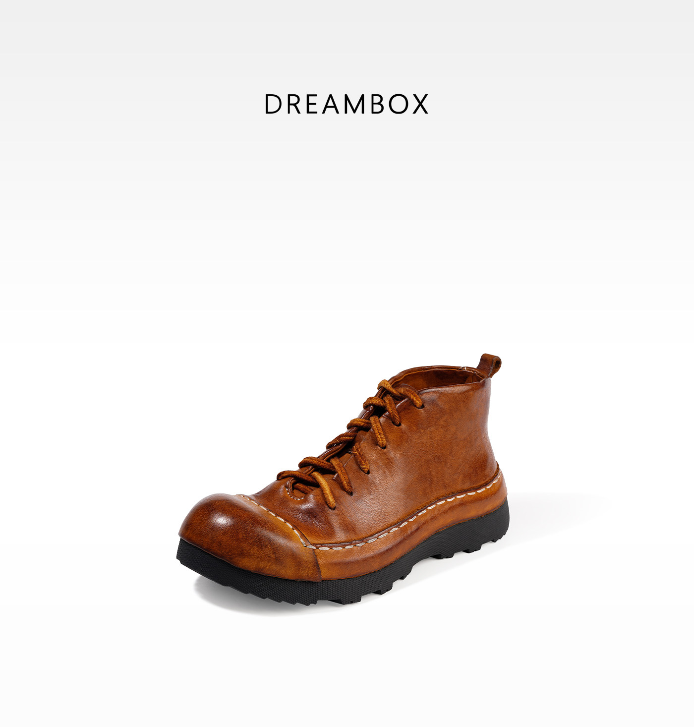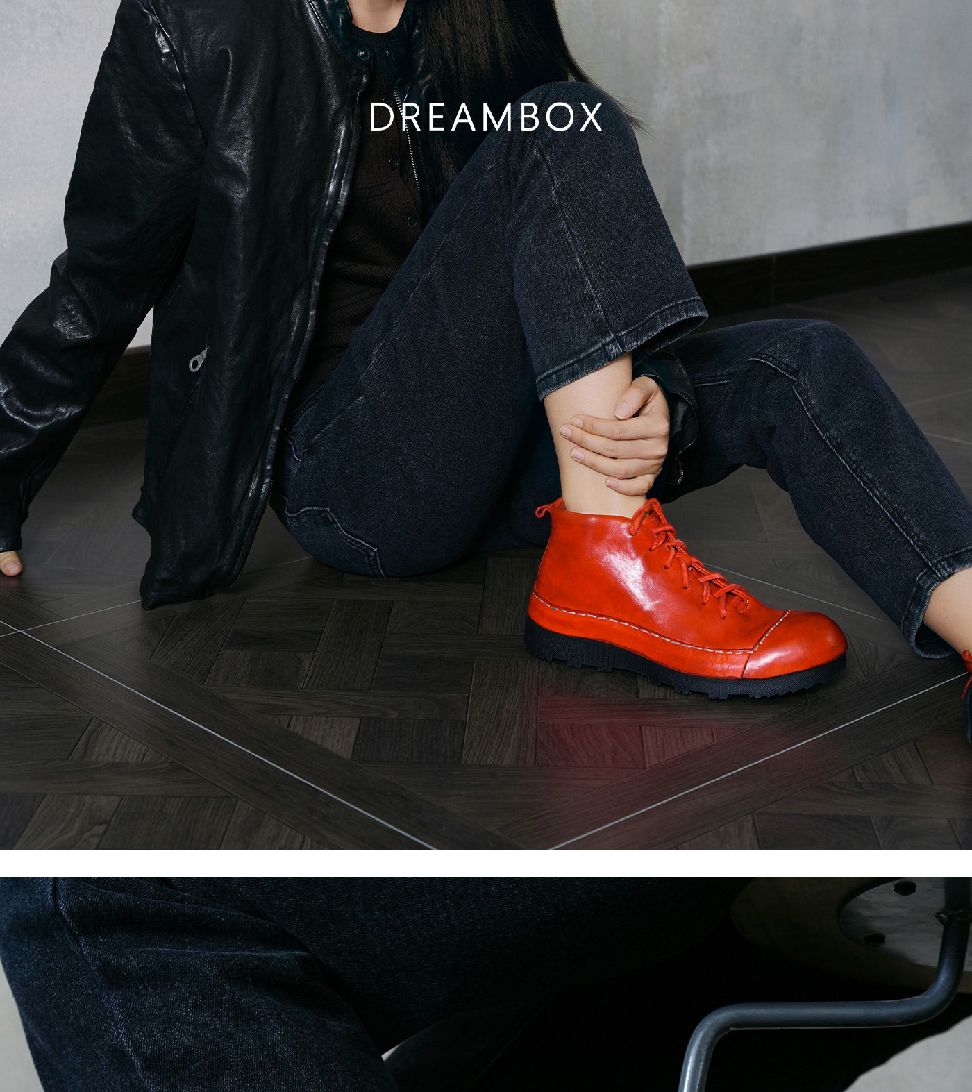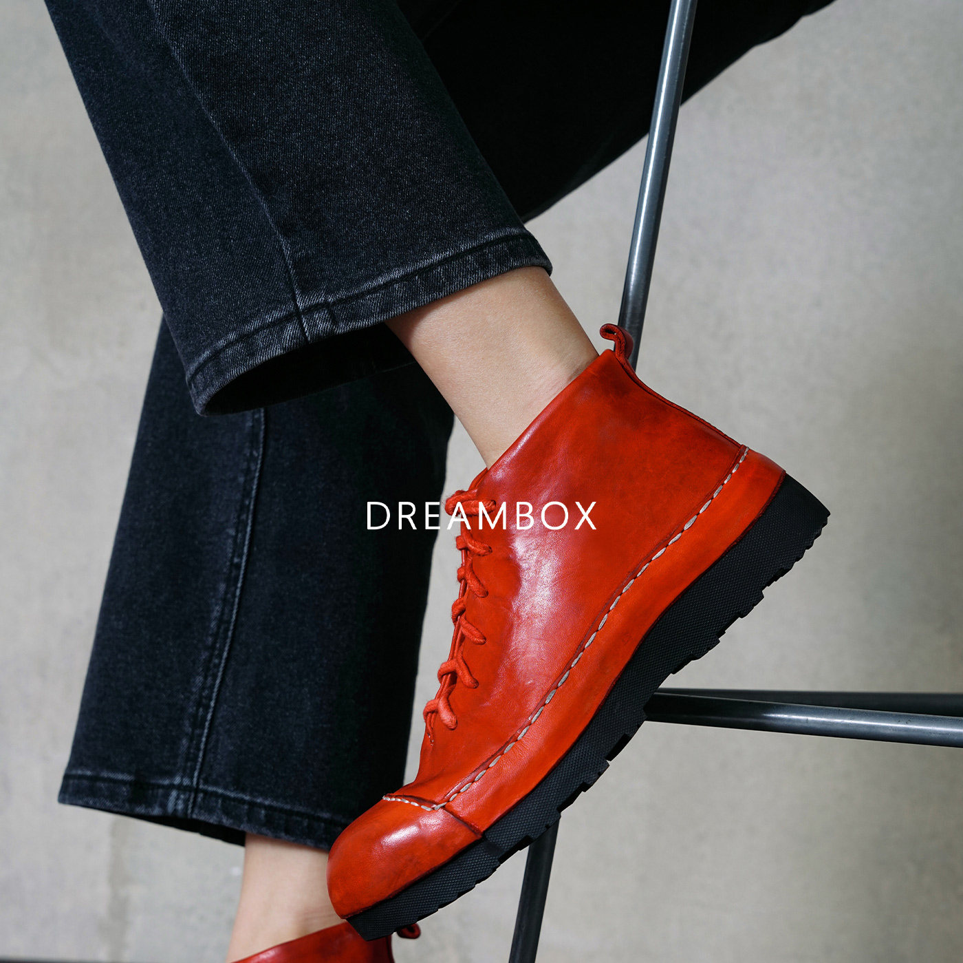 Dreambox Junbo High-Top Women's Shoes with Unique Design, Closed-Toe Short Boots, Washed Vintage Horse Leather, Stylish Martin Boots