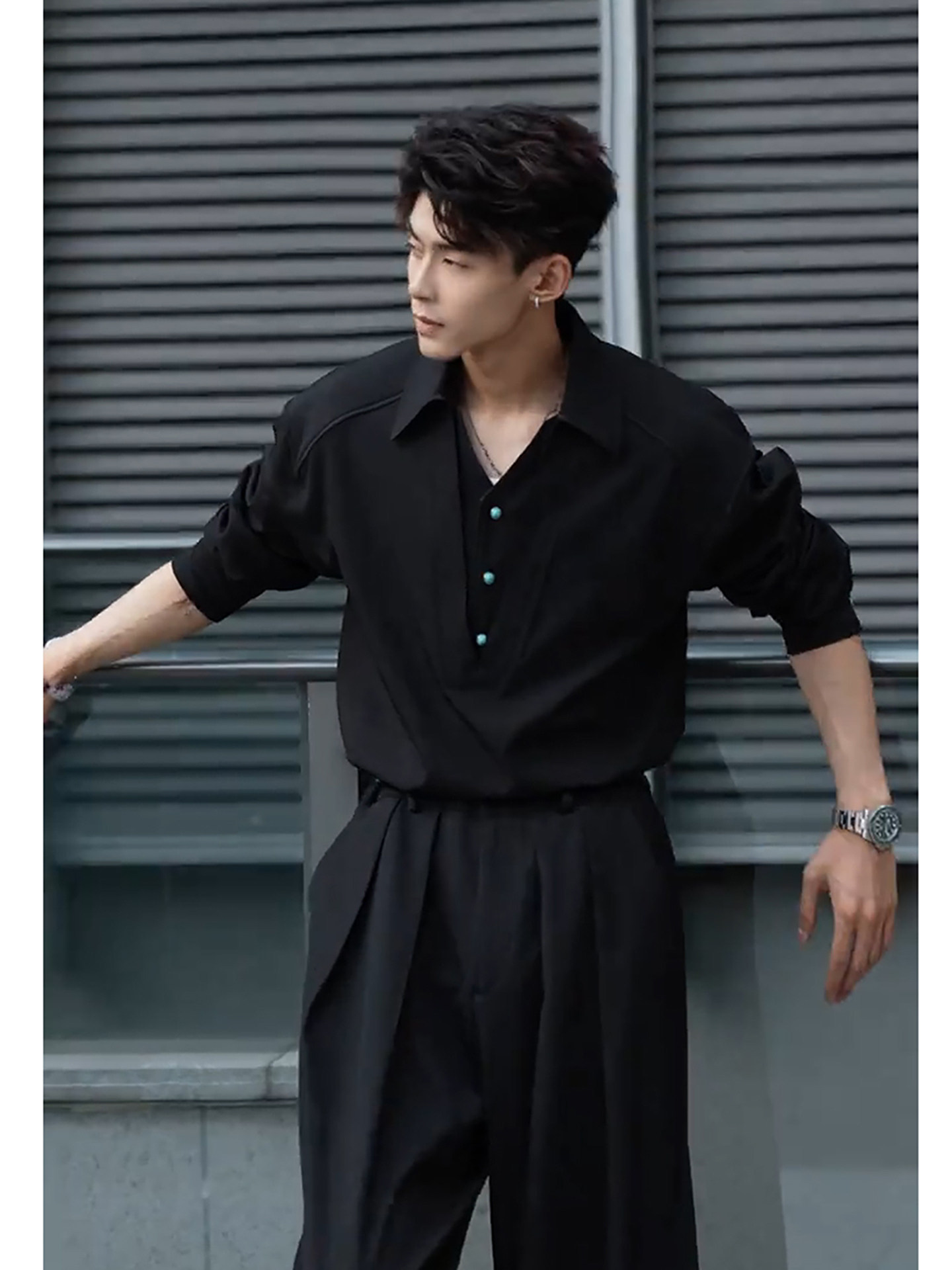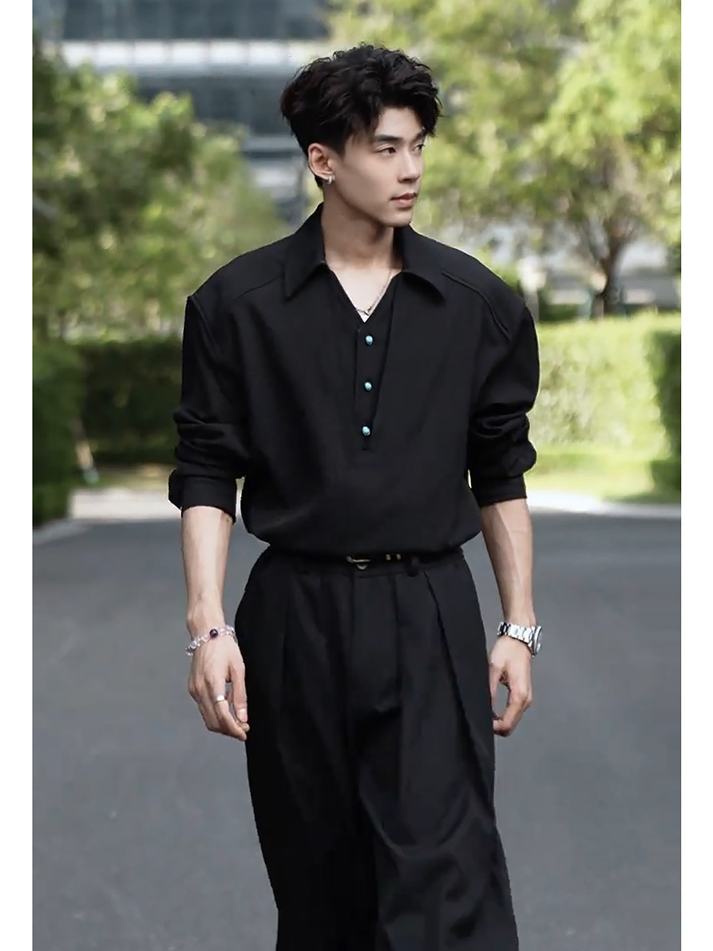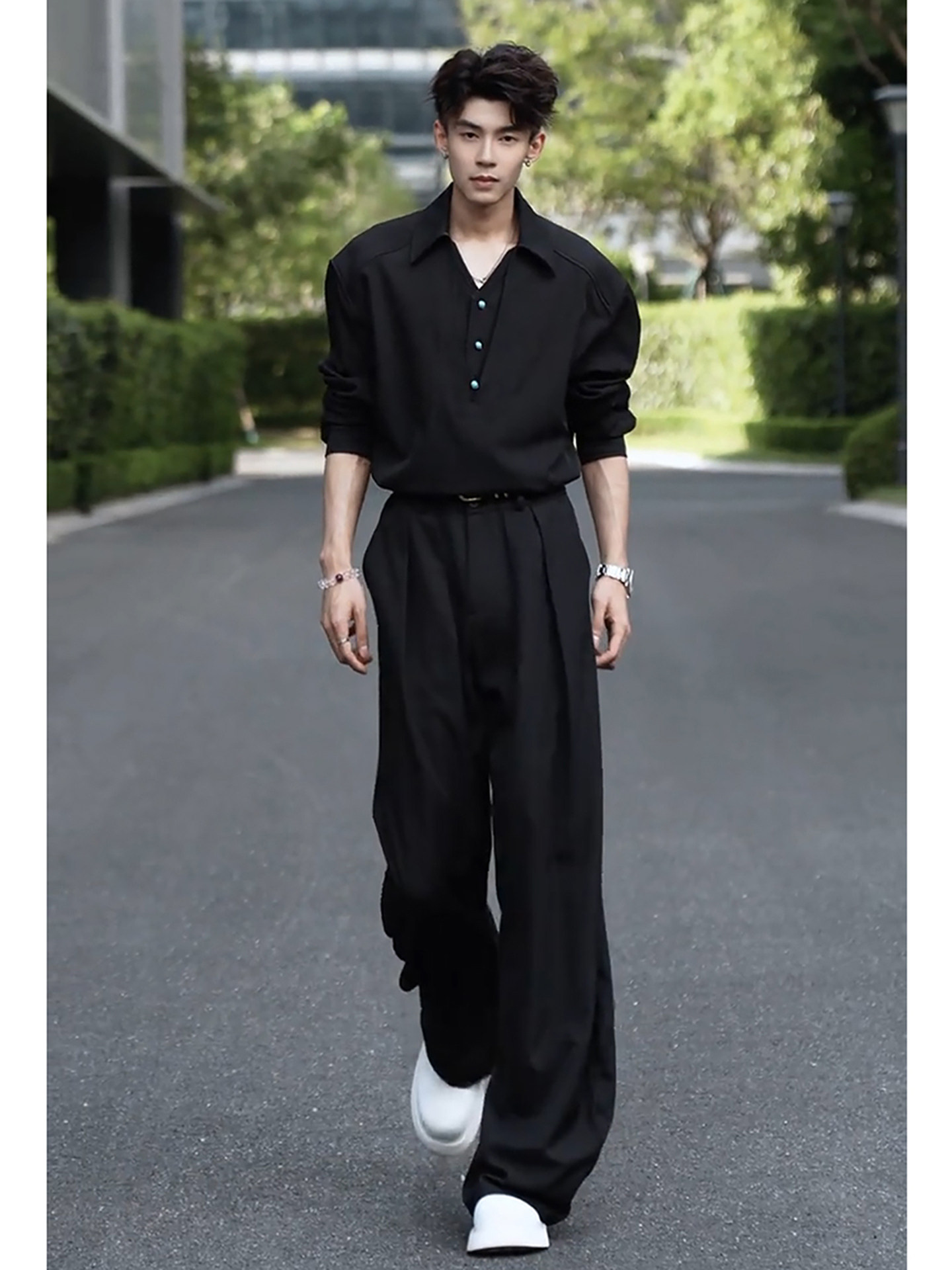 Autumn Ootd Outfit: a Complete Set of Men's Clothing, Fake Two-Piece Shoulder-Padded V-Neck Shirt, British-Style Dandy Suit with Drapey Trousers