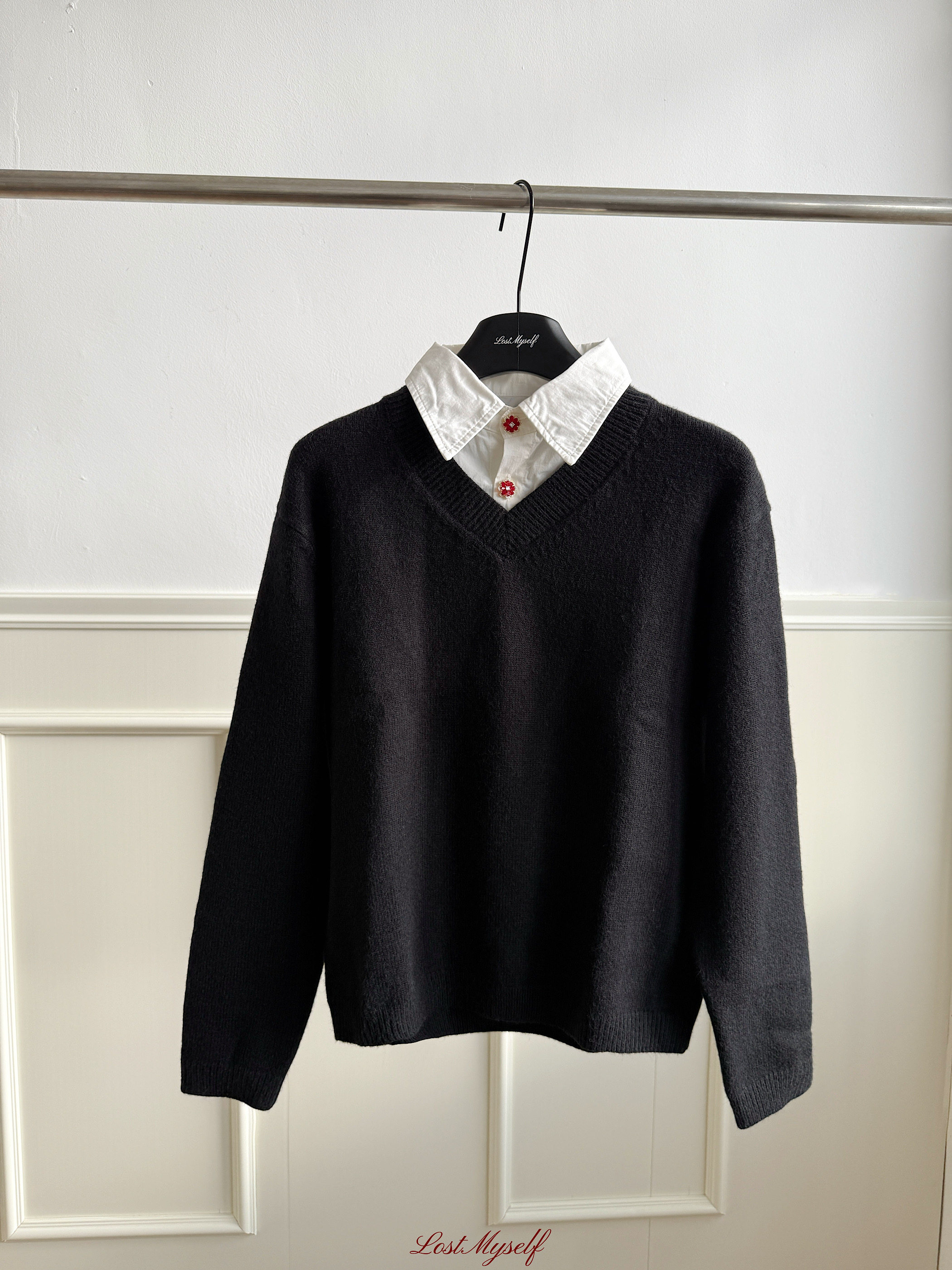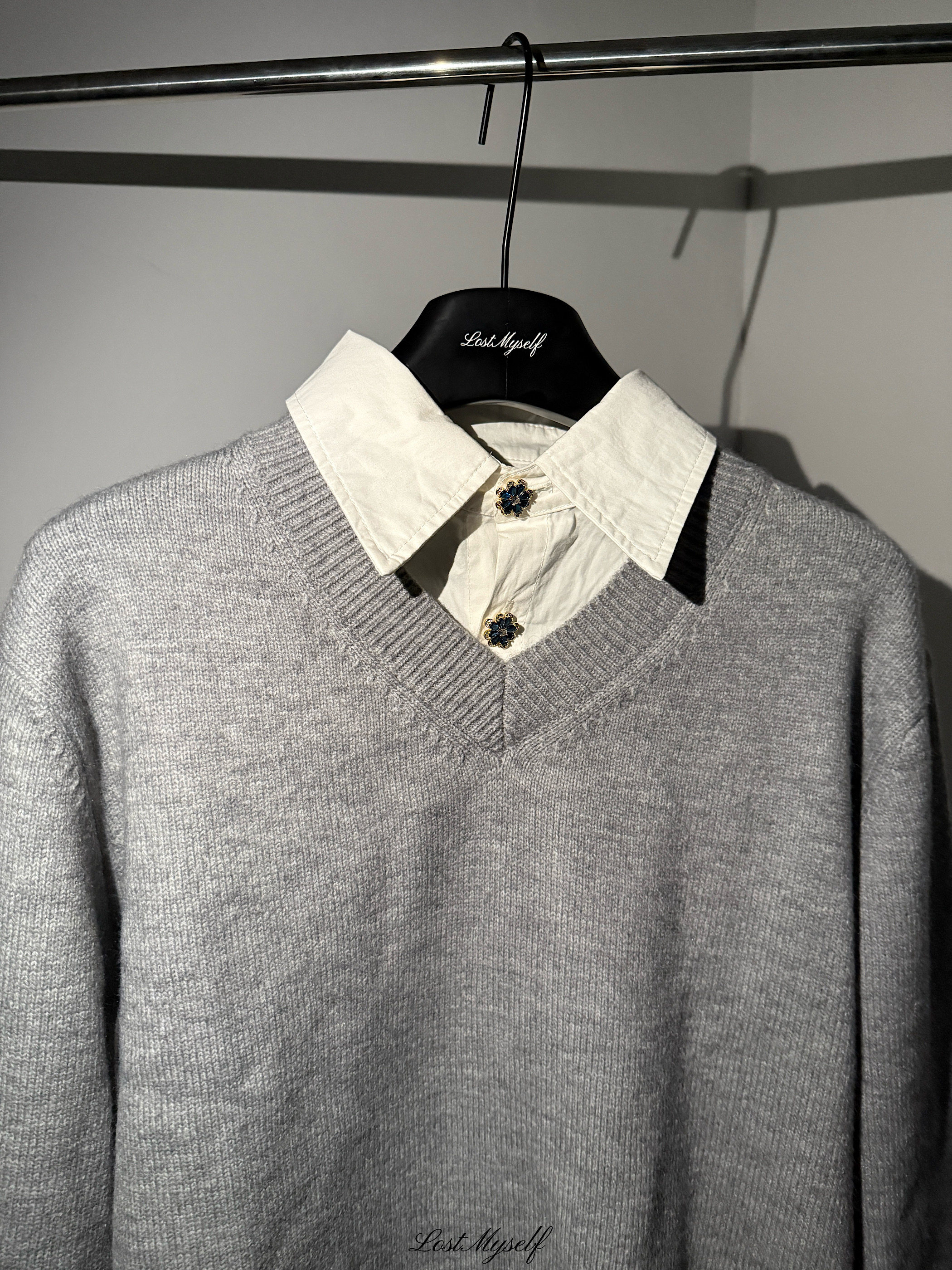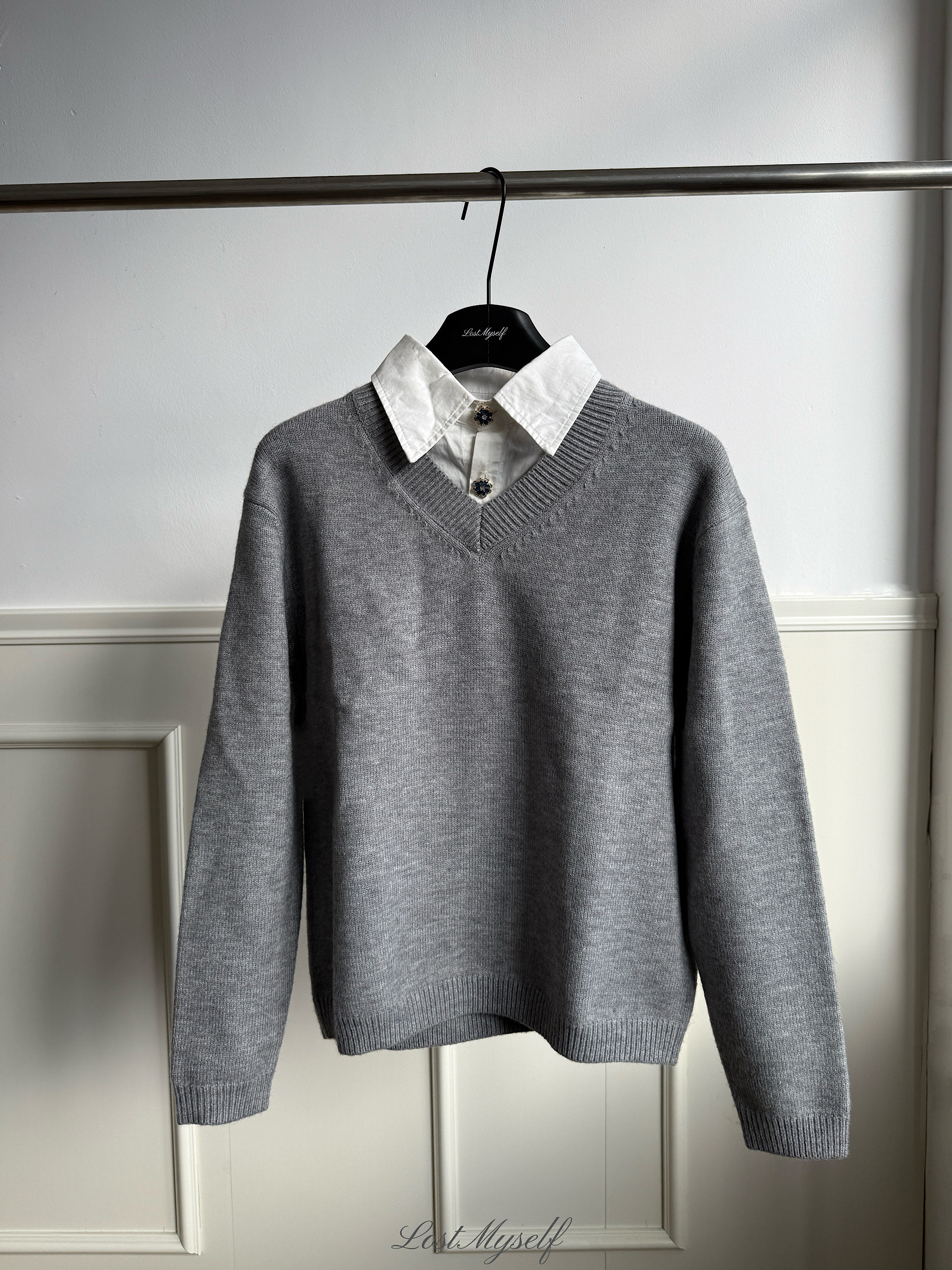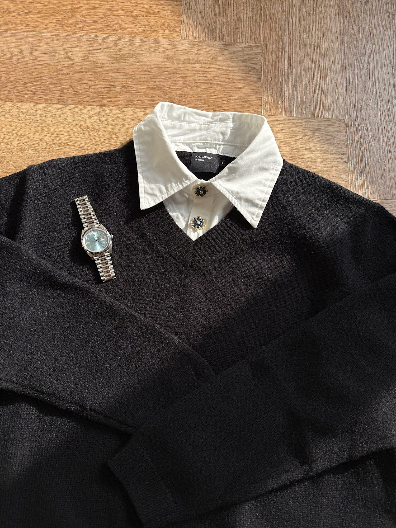 Lostmyself High-Fashion V-Neck Faux Two-Piece Polo Style Knit Sweater with an Elegant and Sophisticated Vibe, Couple Style