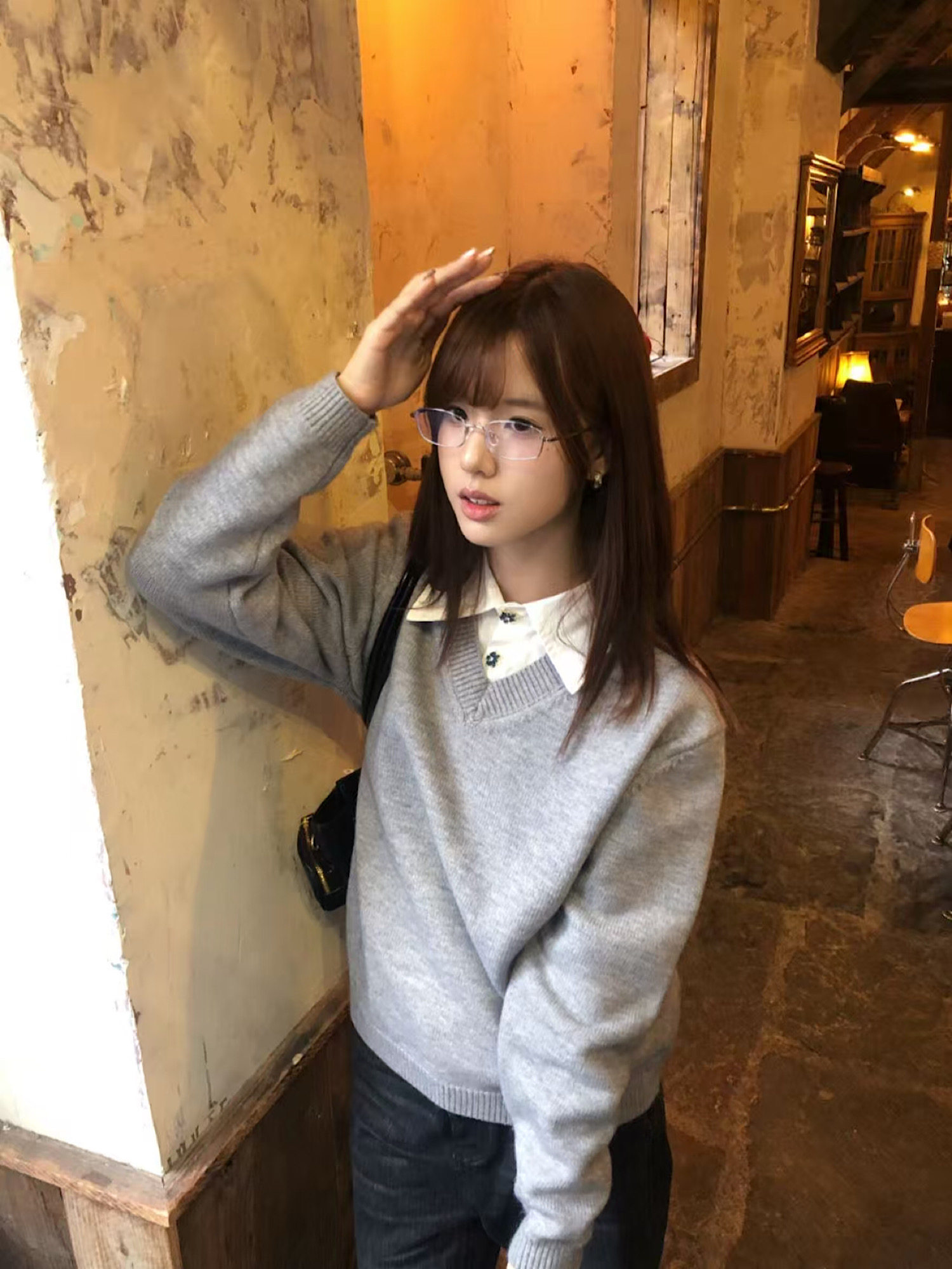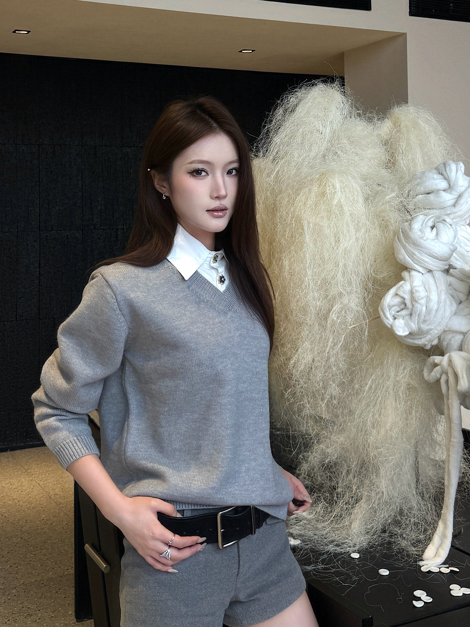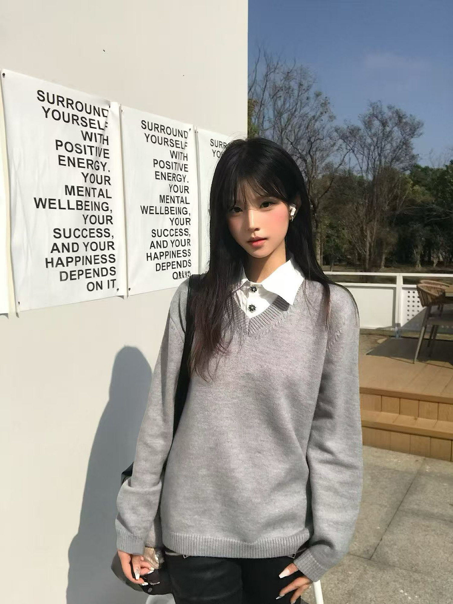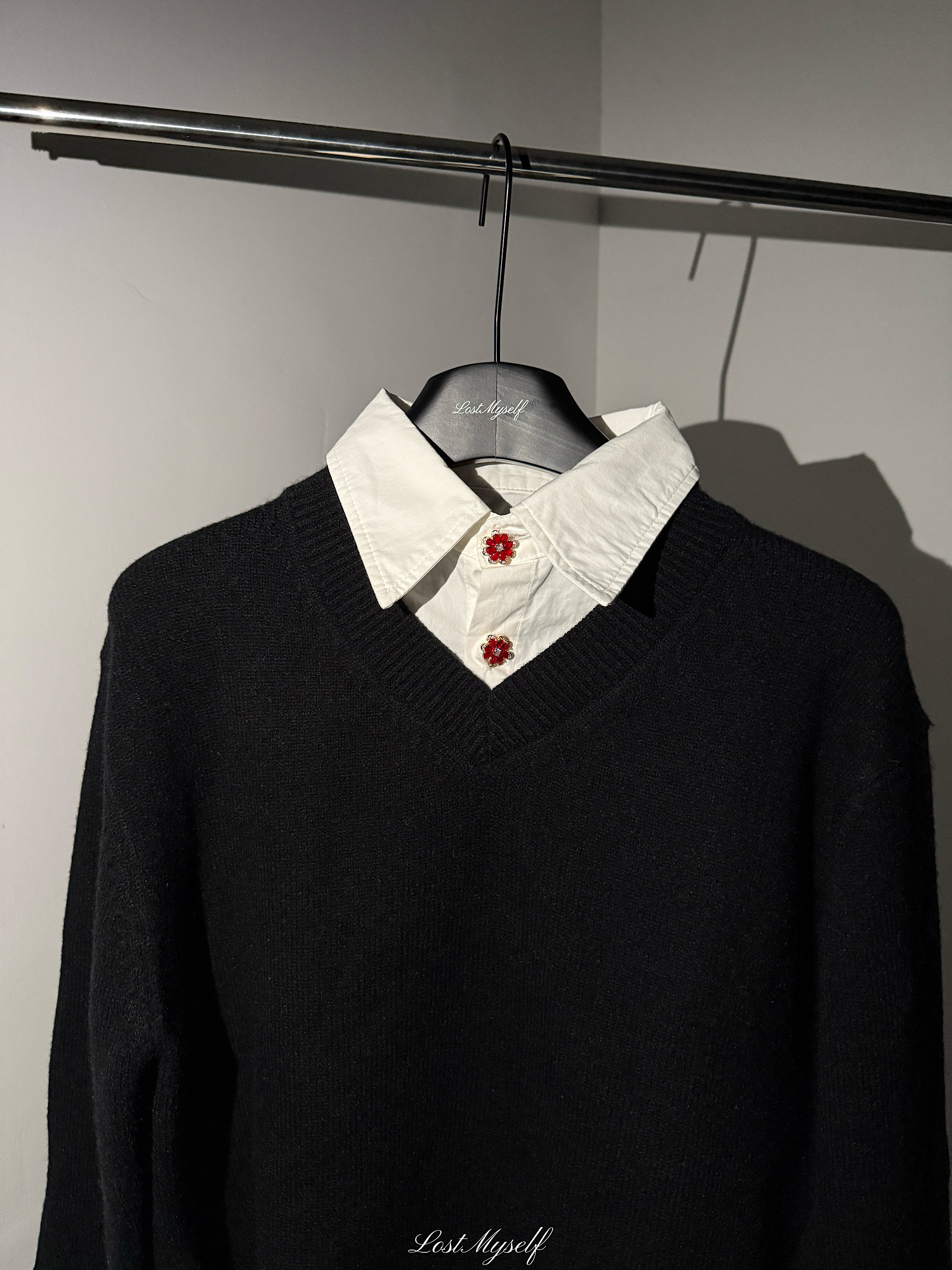 Lostmyself High-Fashion V-Neck Faux Two-Piece Polo Style Knit Sweater with an Elegant and Sophisticated Vibe, Couple Style