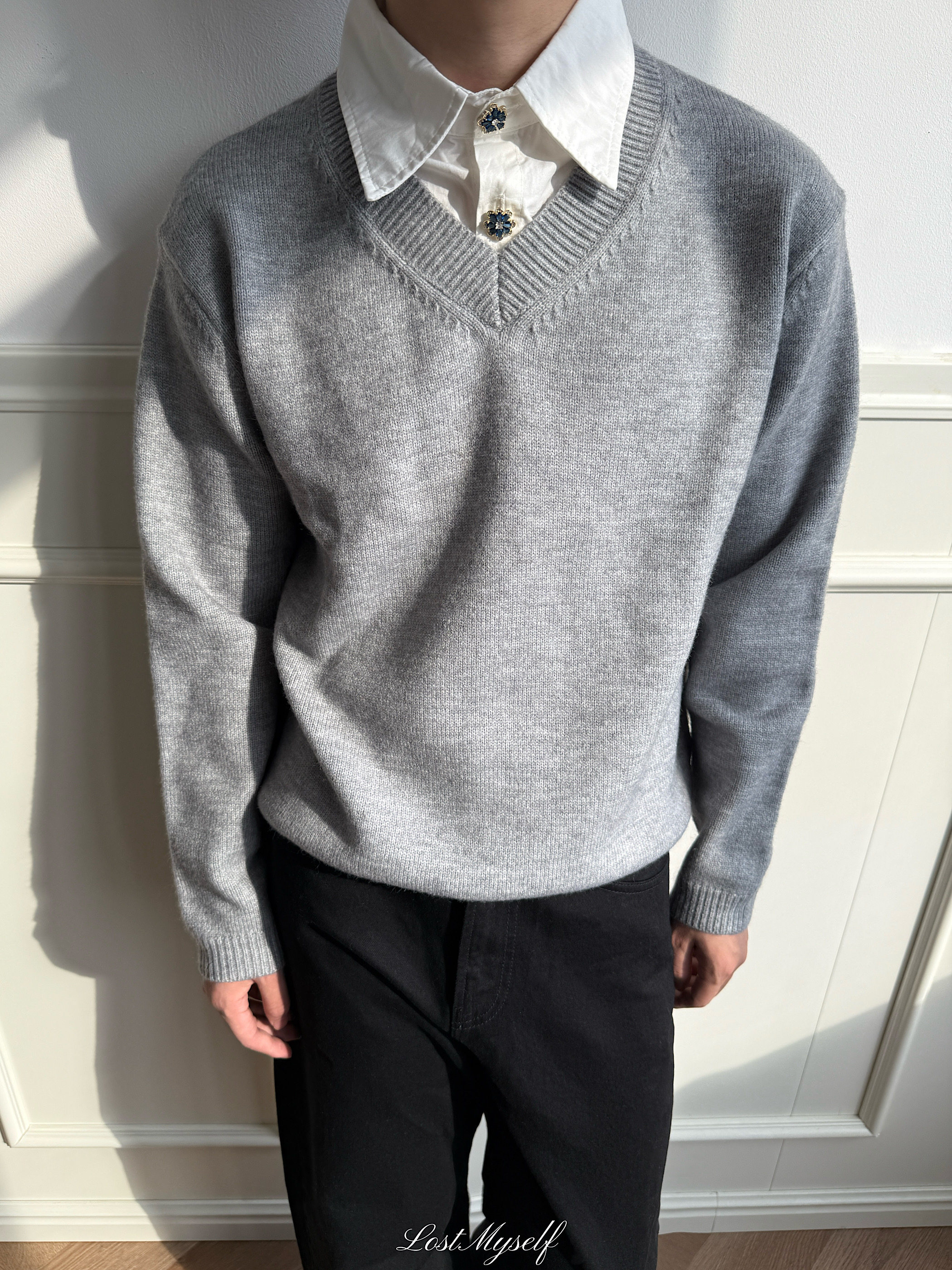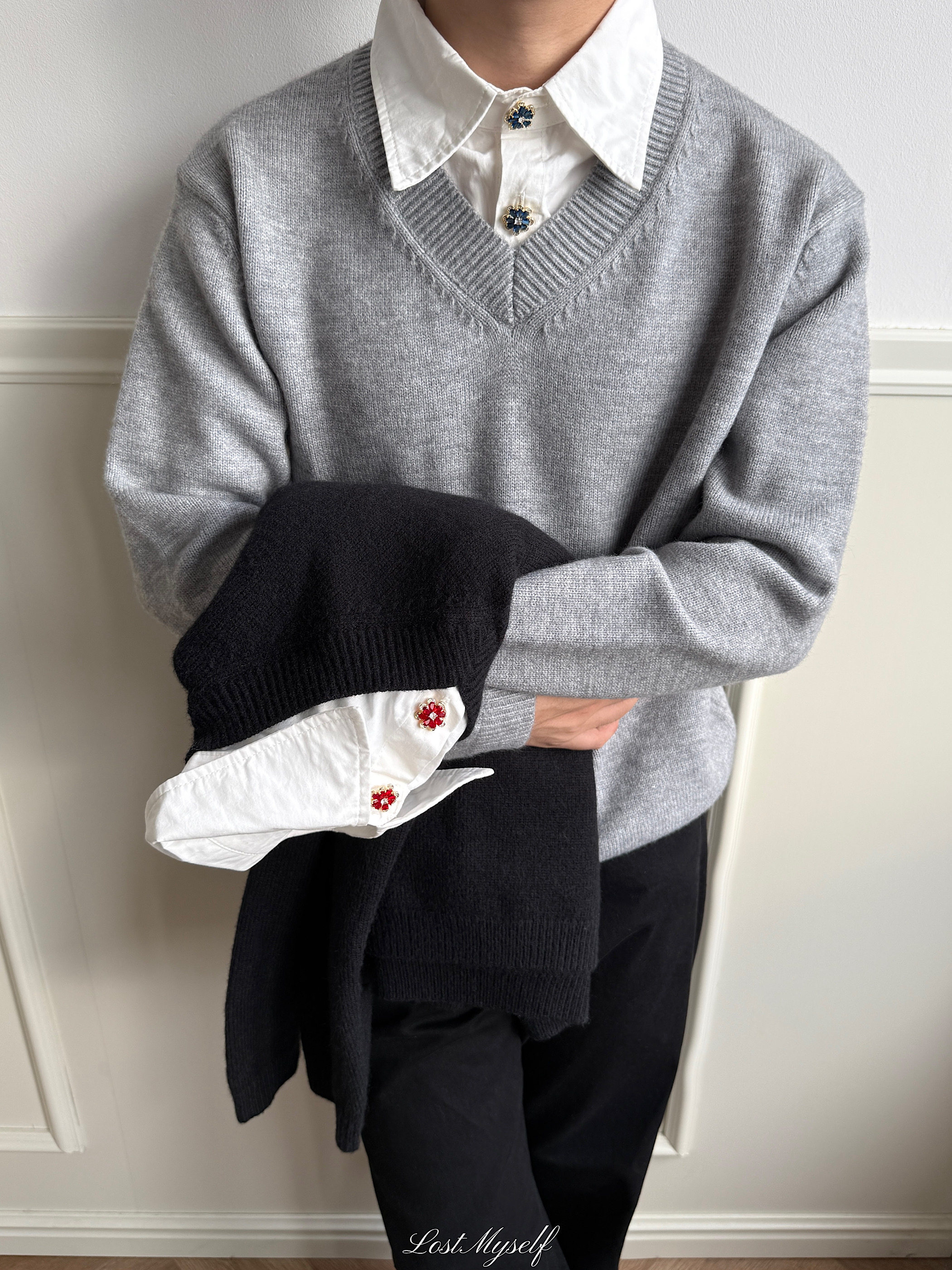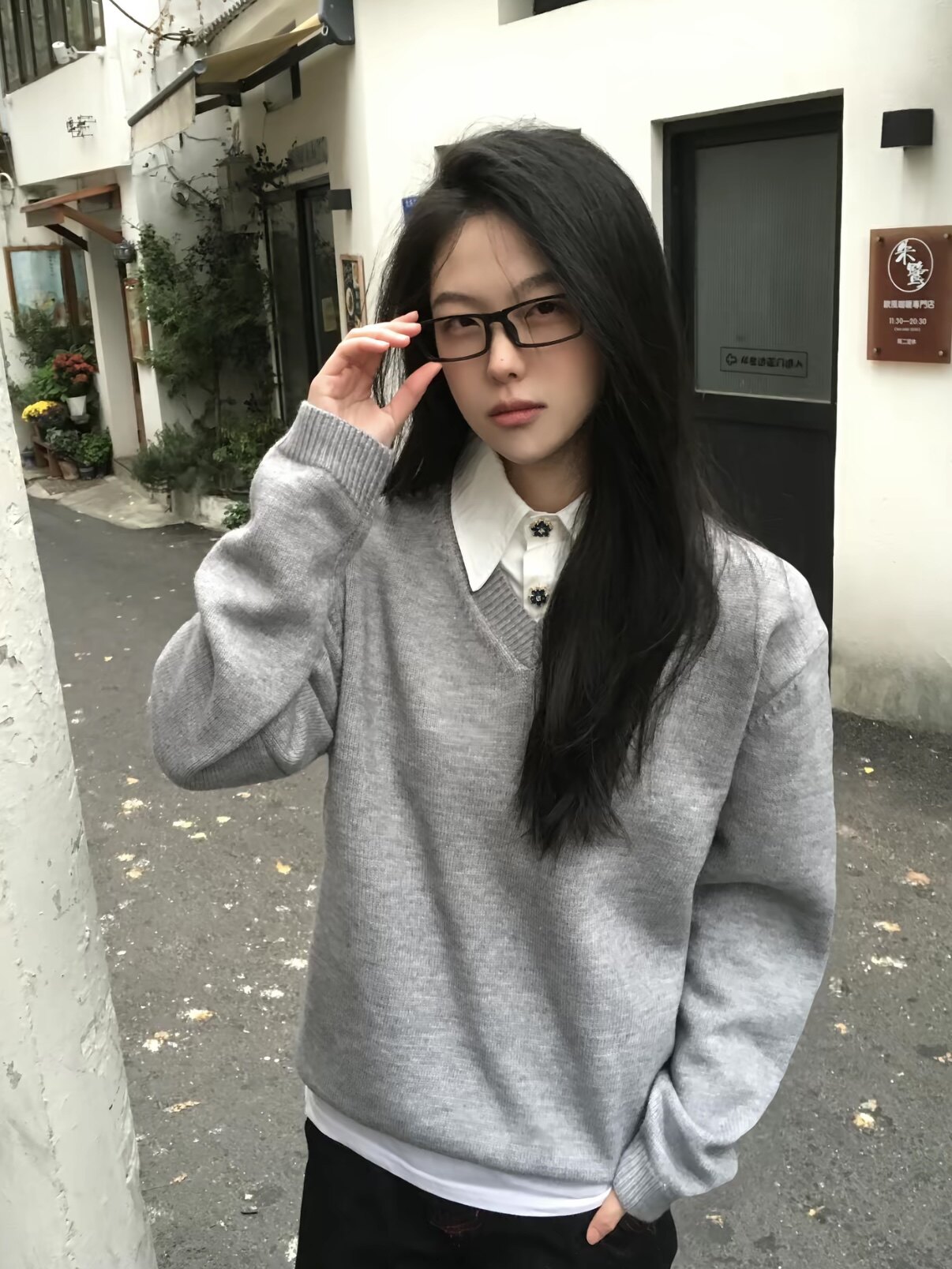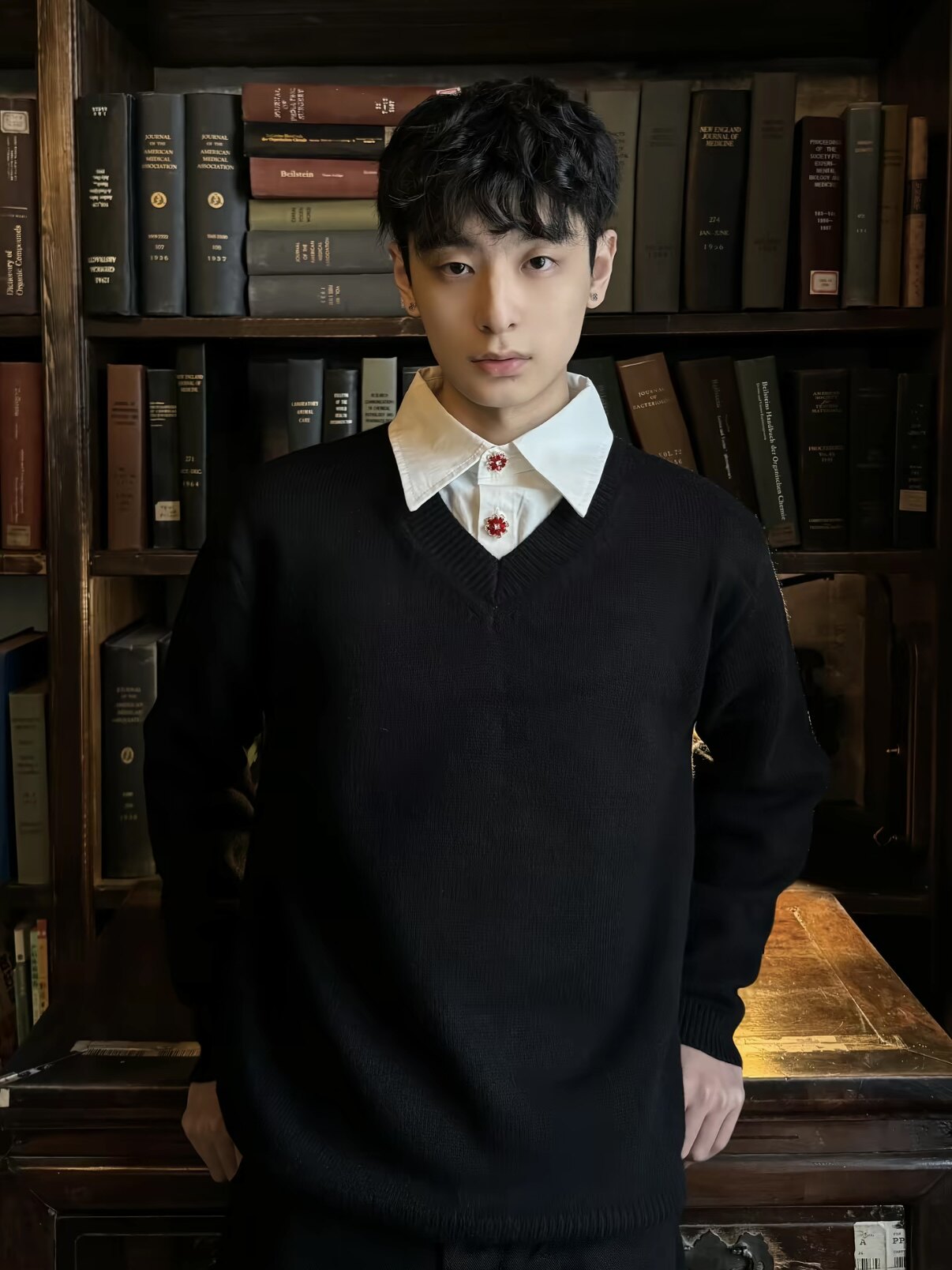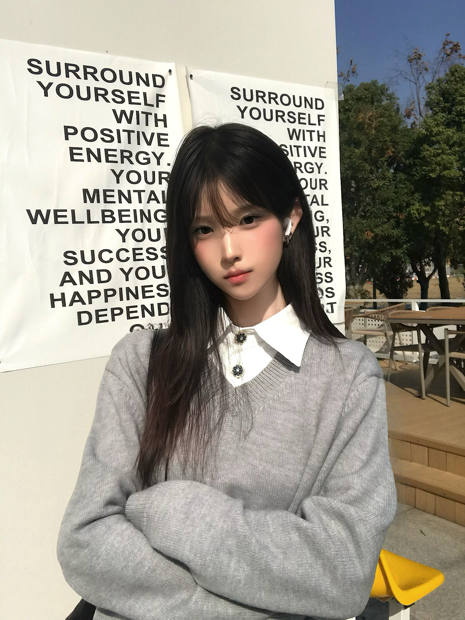 Lostmyself High-Fashion V-Neck Faux Two-Piece Polo Style Knit Sweater with an Elegant and Sophisticated Vibe, Couple Style