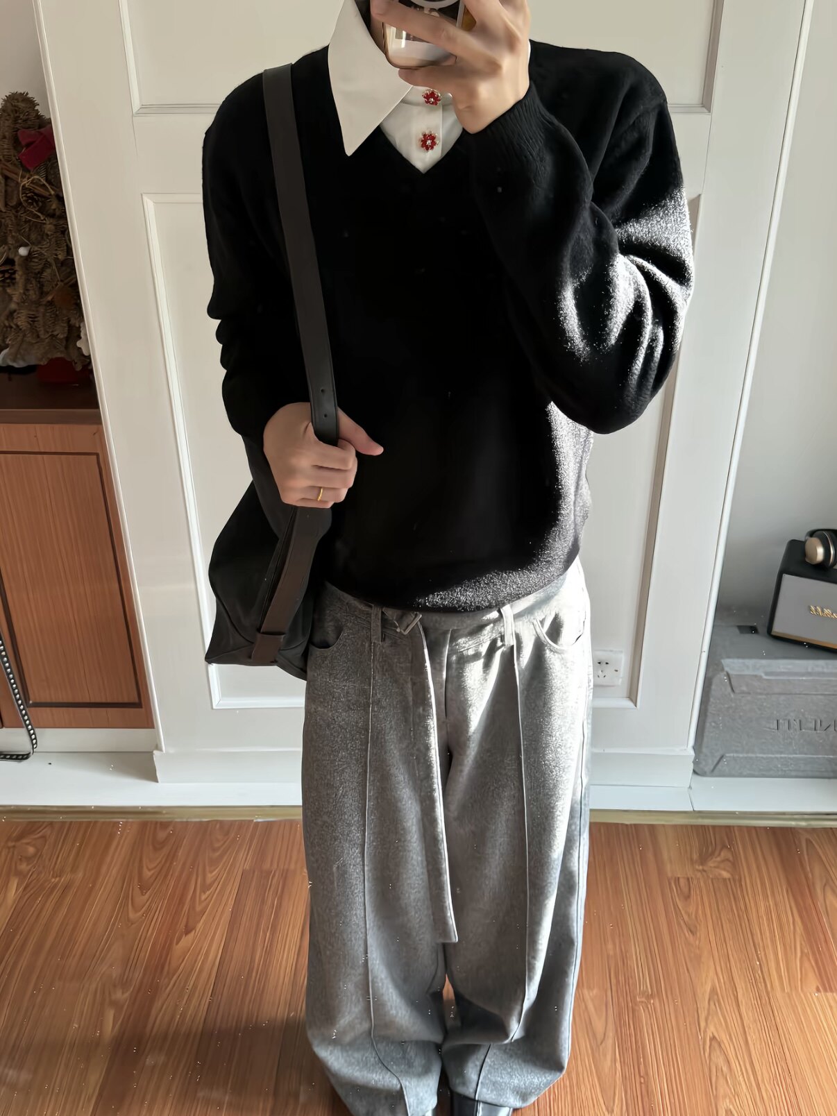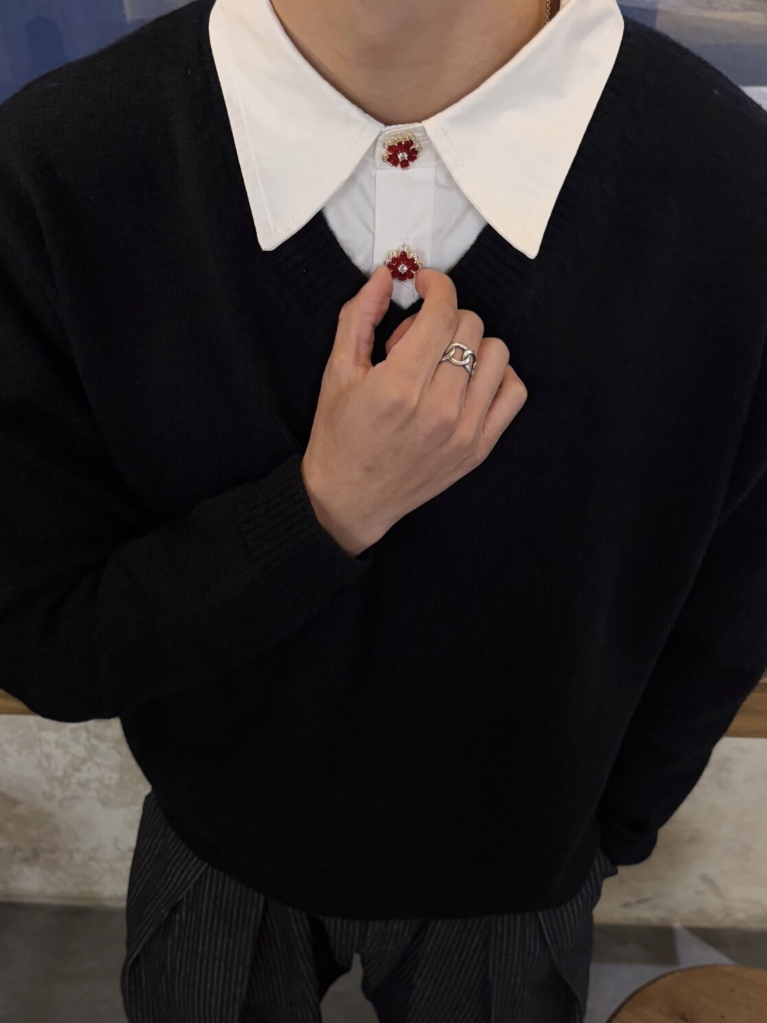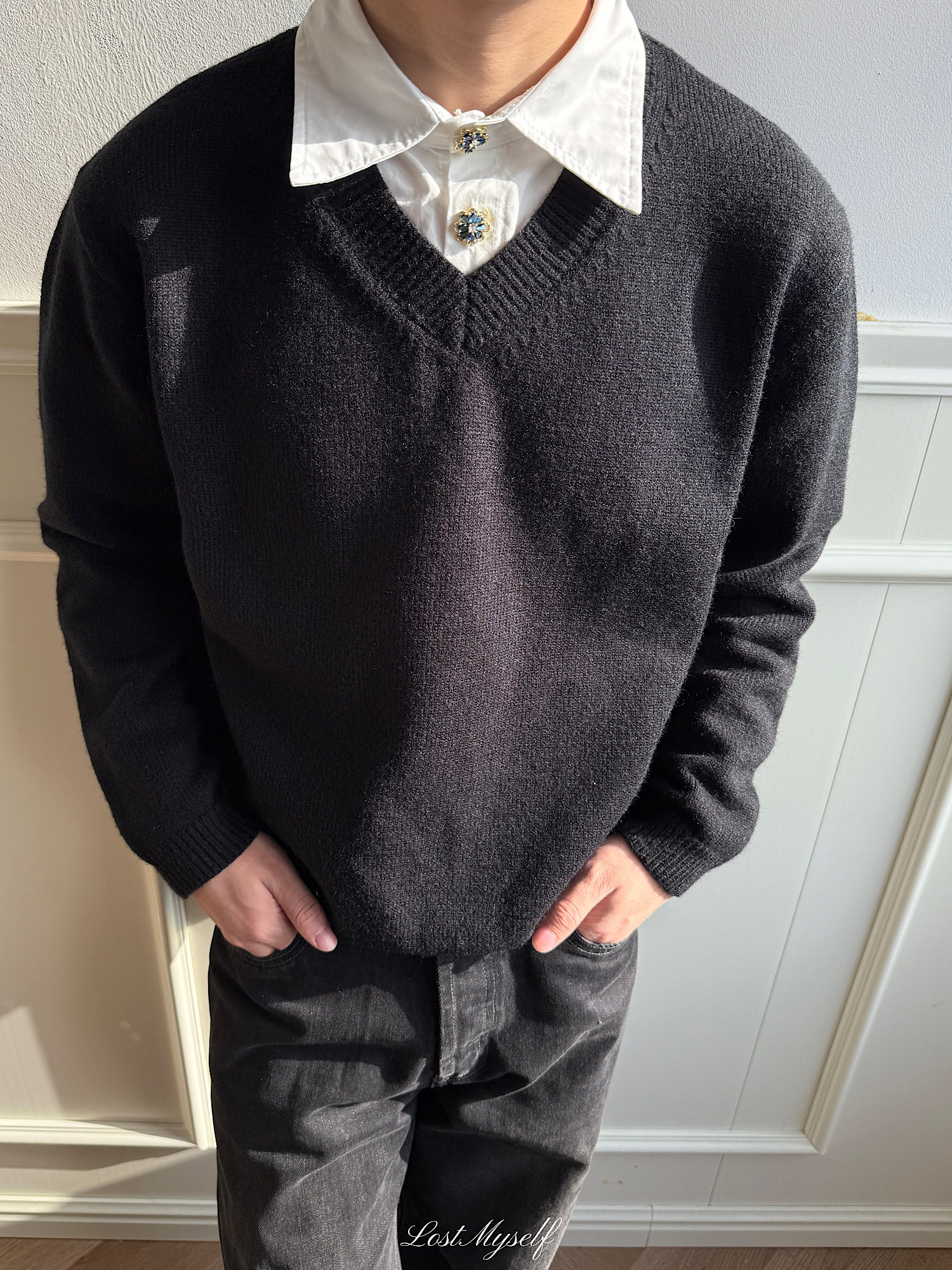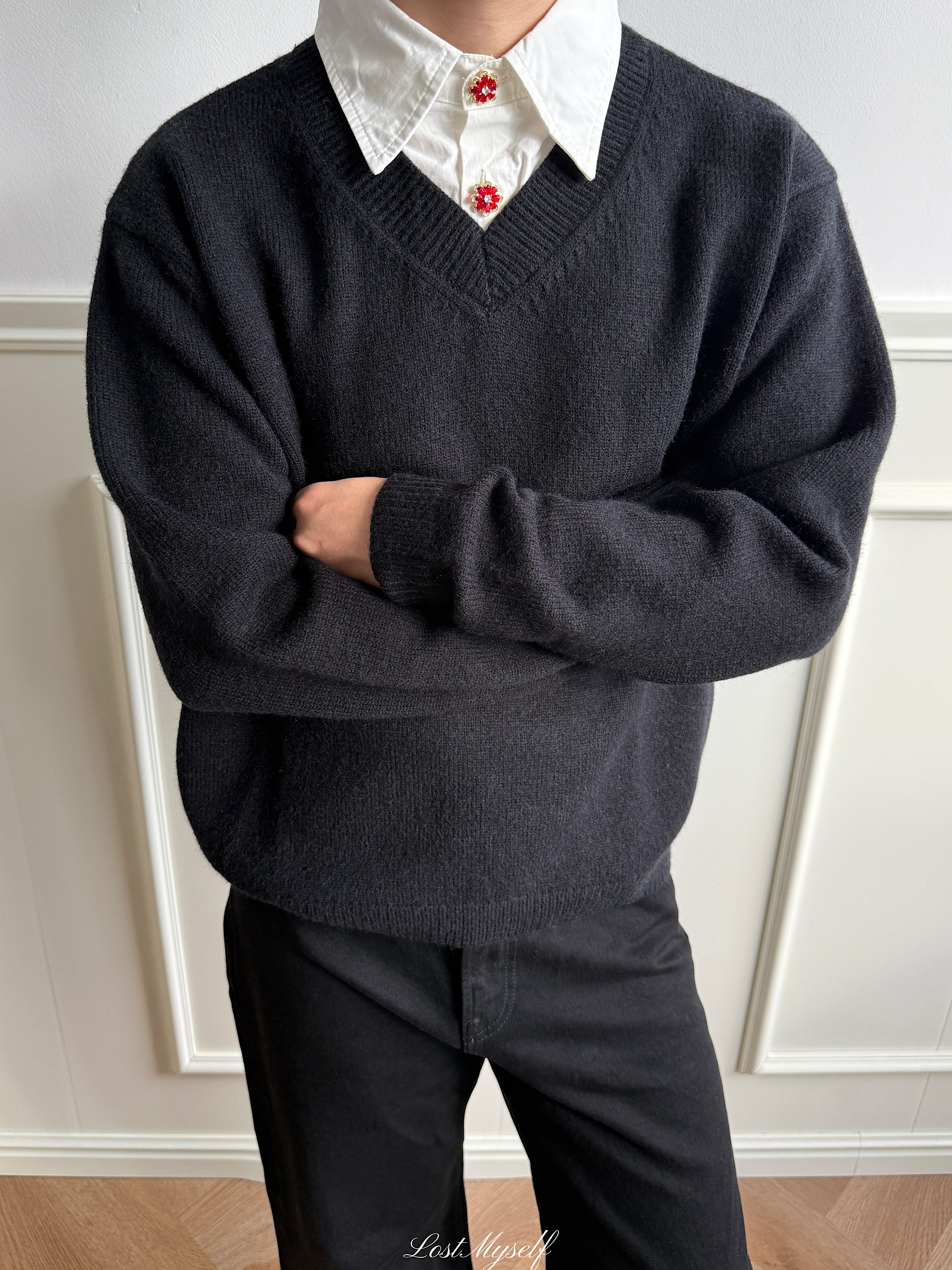 Lostmyself High-Fashion V-Neck Faux Two-Piece Polo Style Knit Sweater with an Elegant and Sophisticated Vibe, Couple Style