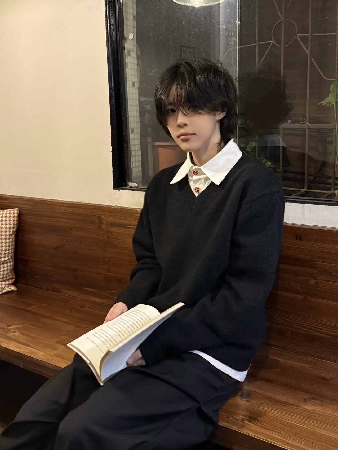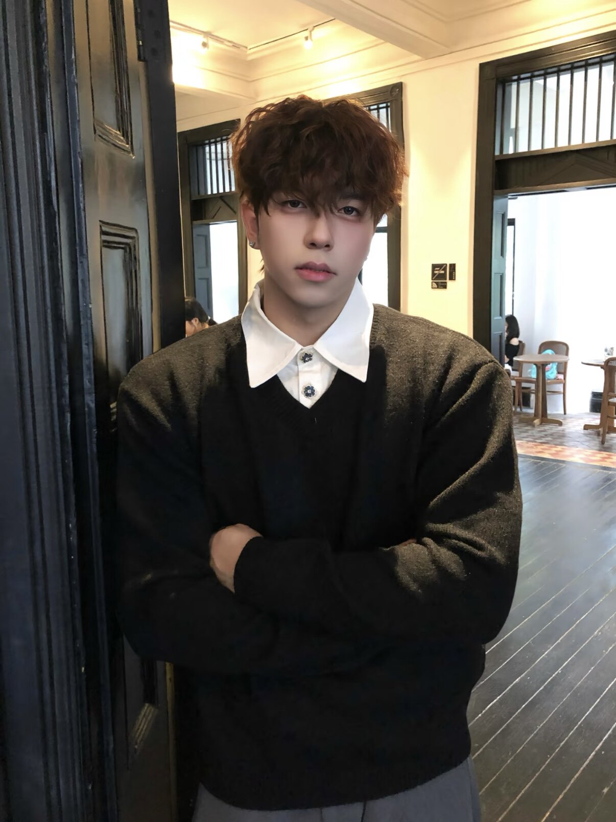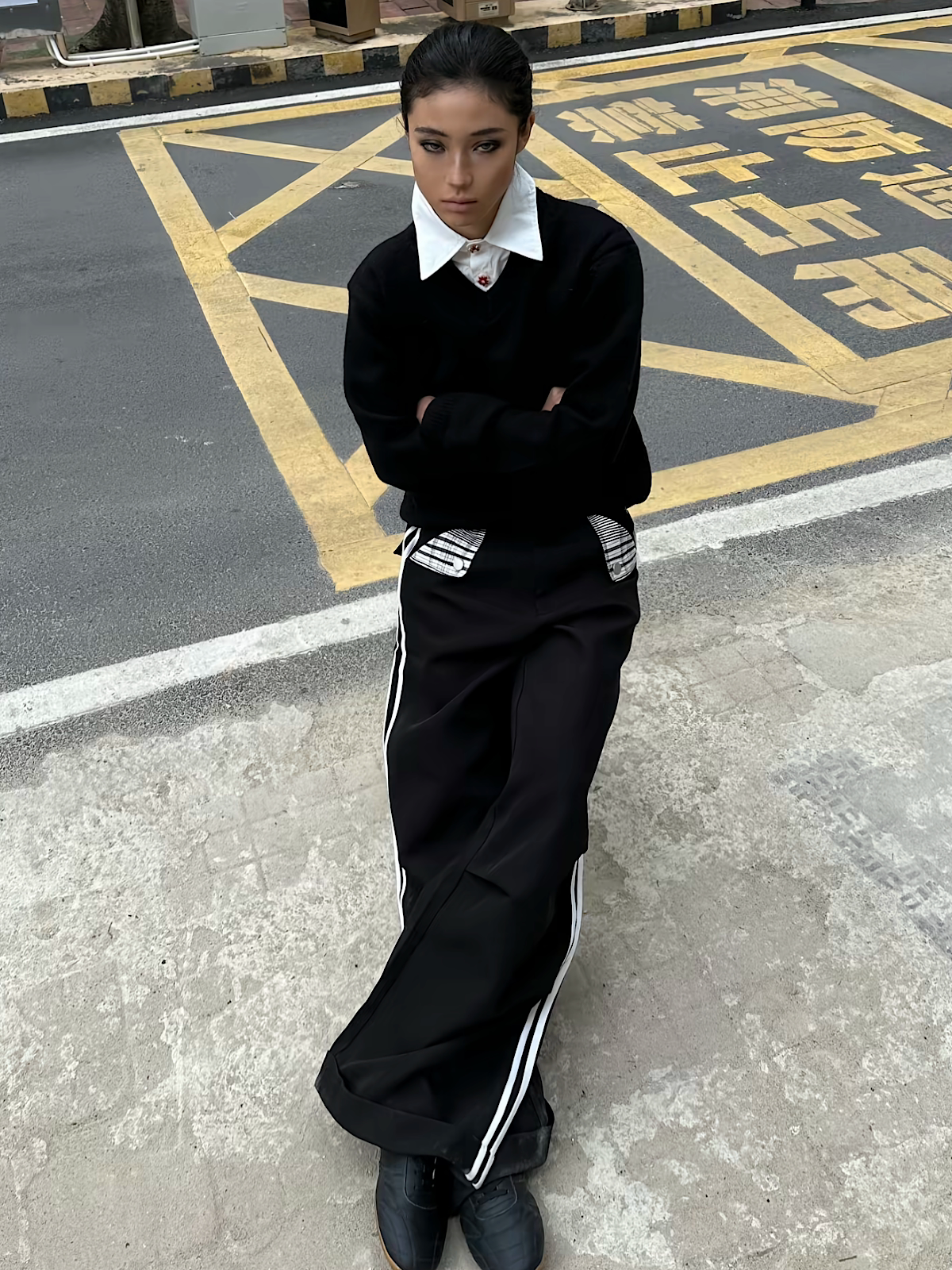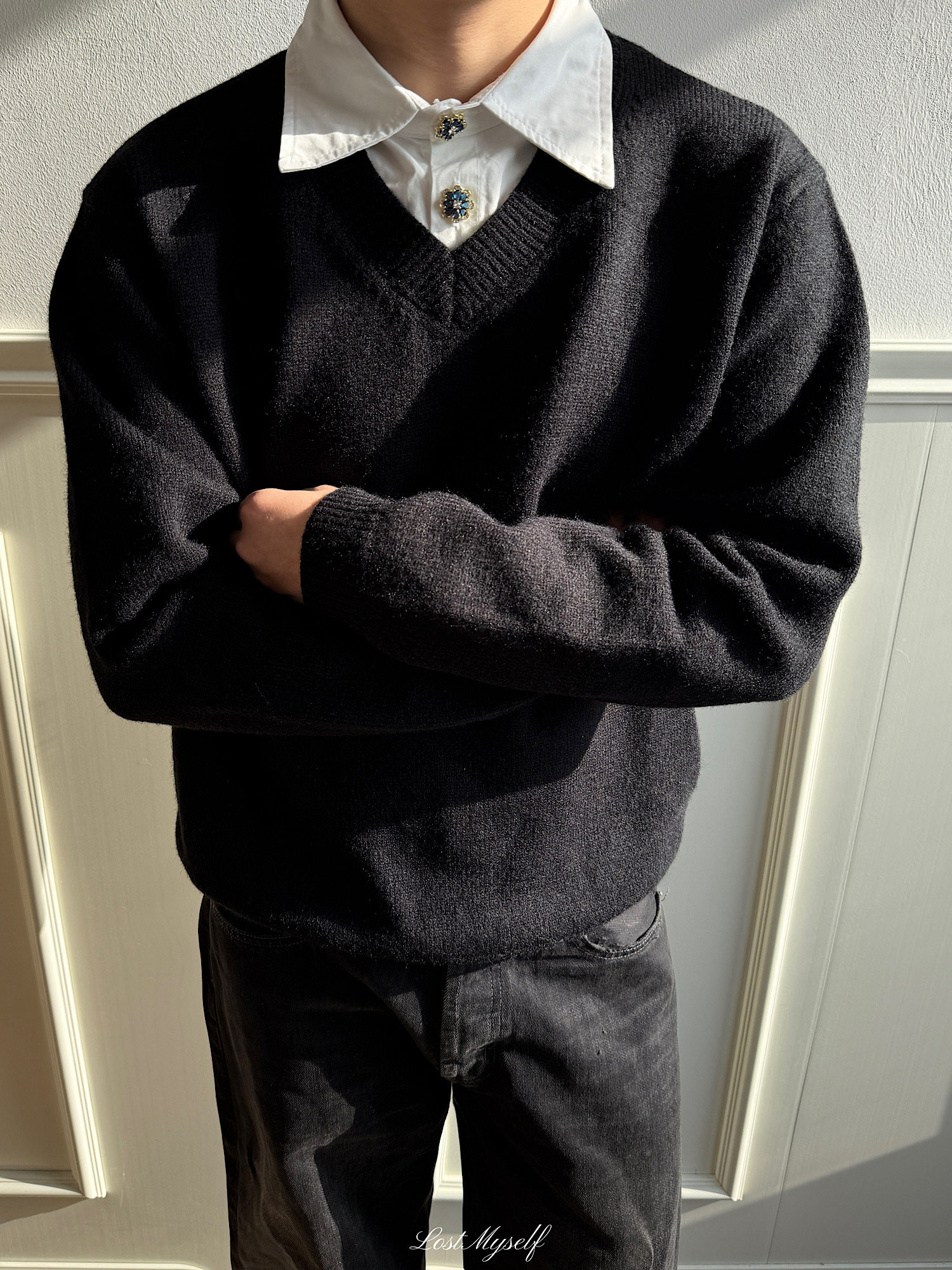 Lostmyself High-Fashion V-Neck Faux Two-Piece Polo Style Knit Sweater with an Elegant and Sophisticated Vibe, Couple Style