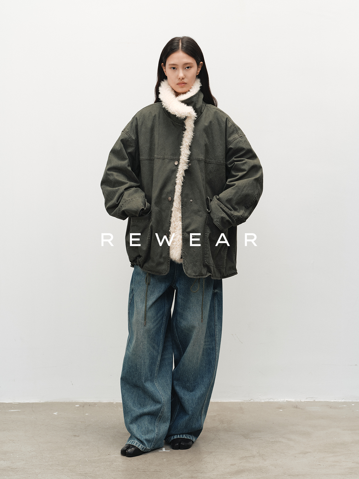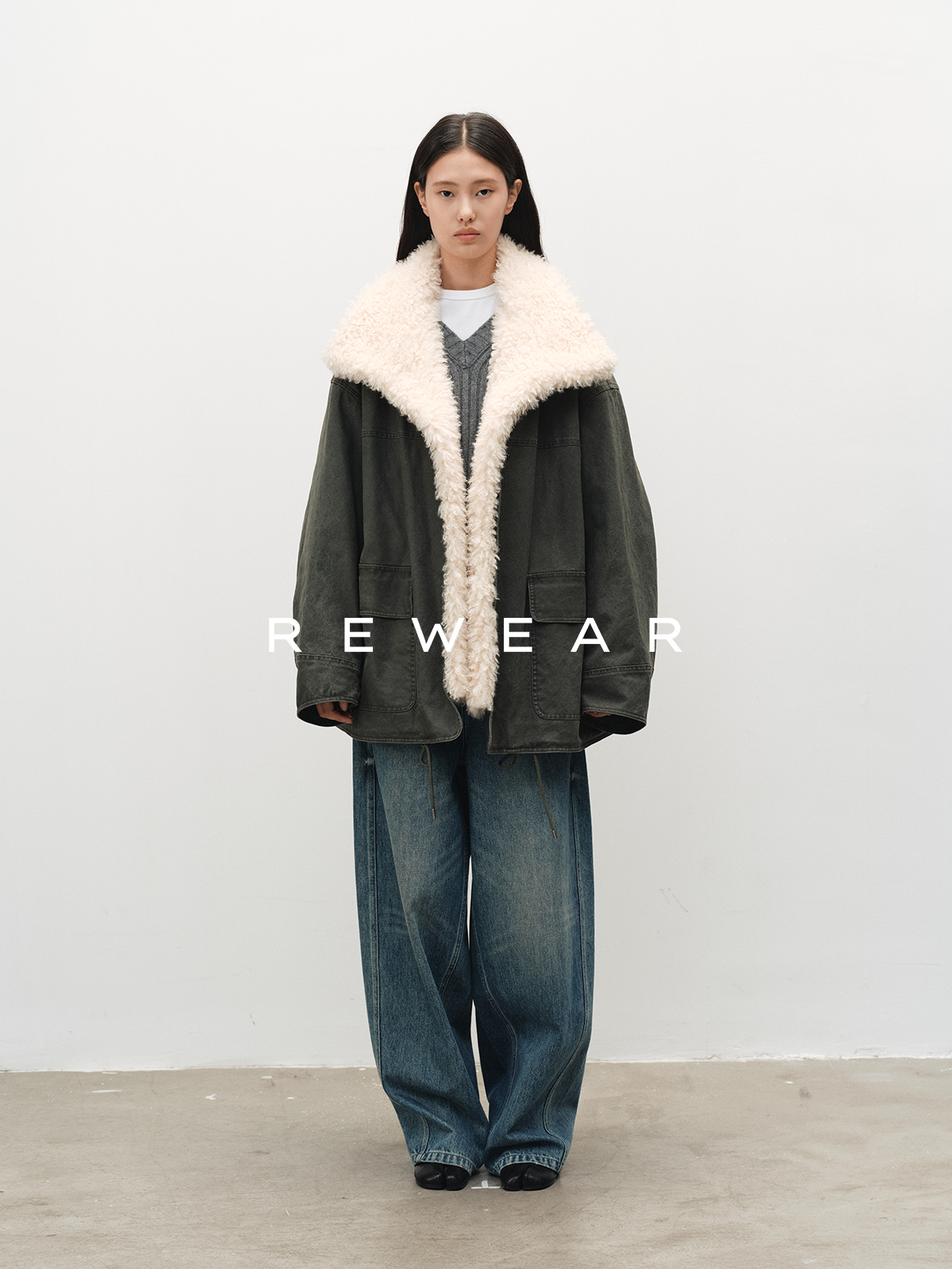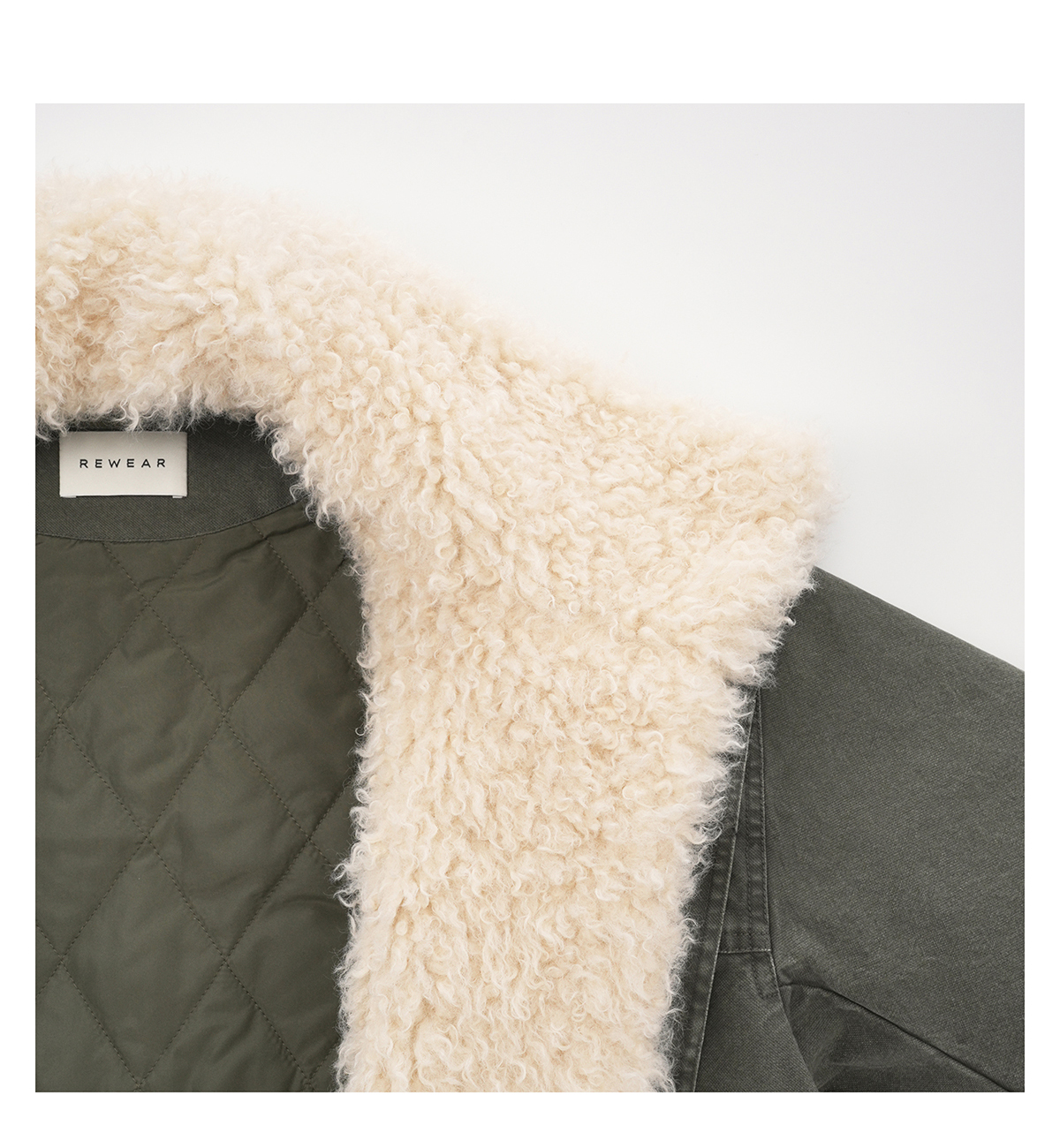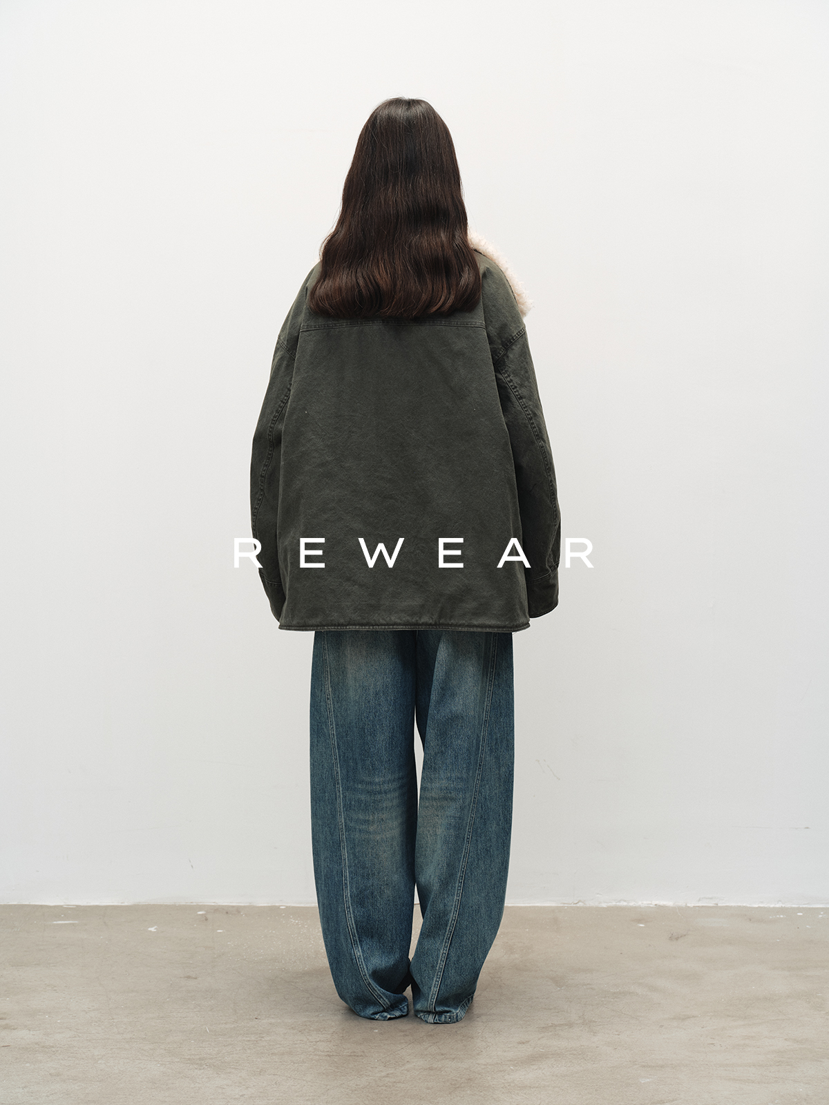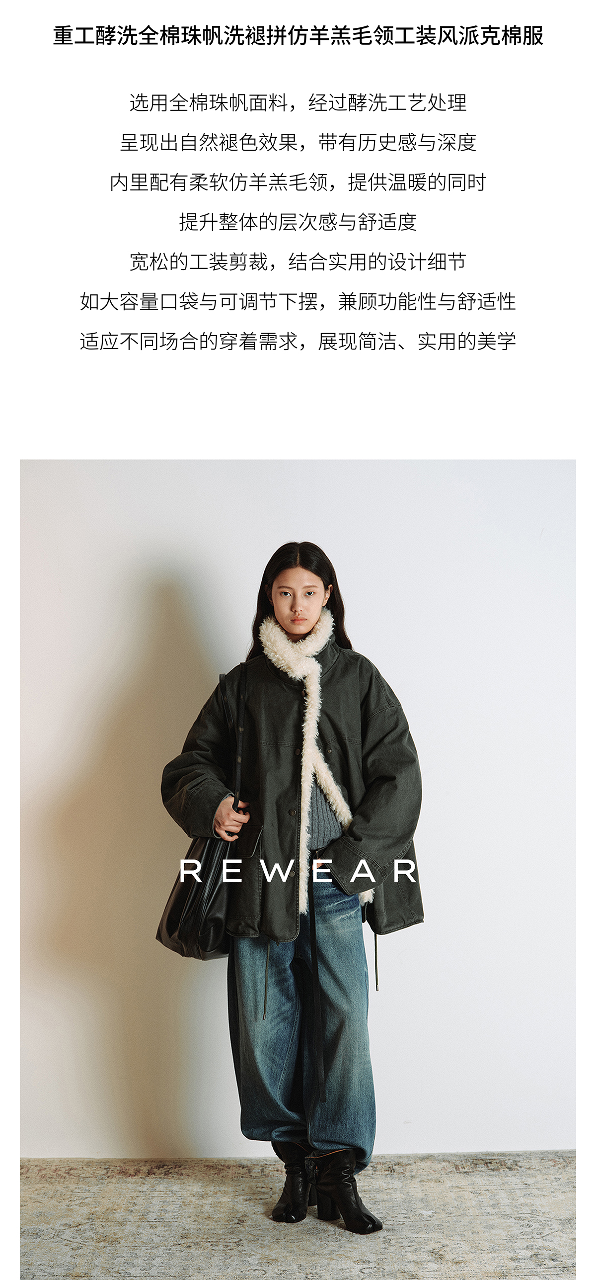 Rewear/Heavy-Duty Enzyme-Washed Cotton Pearl-Sail Wash Faded Detachable Faux Shearling Collar Workwear Parka Cotton Jacket 11355