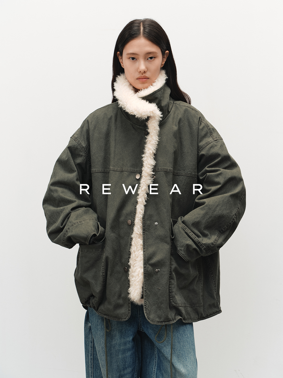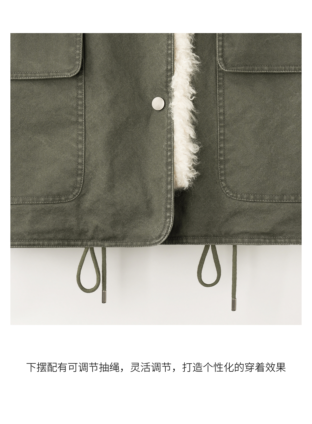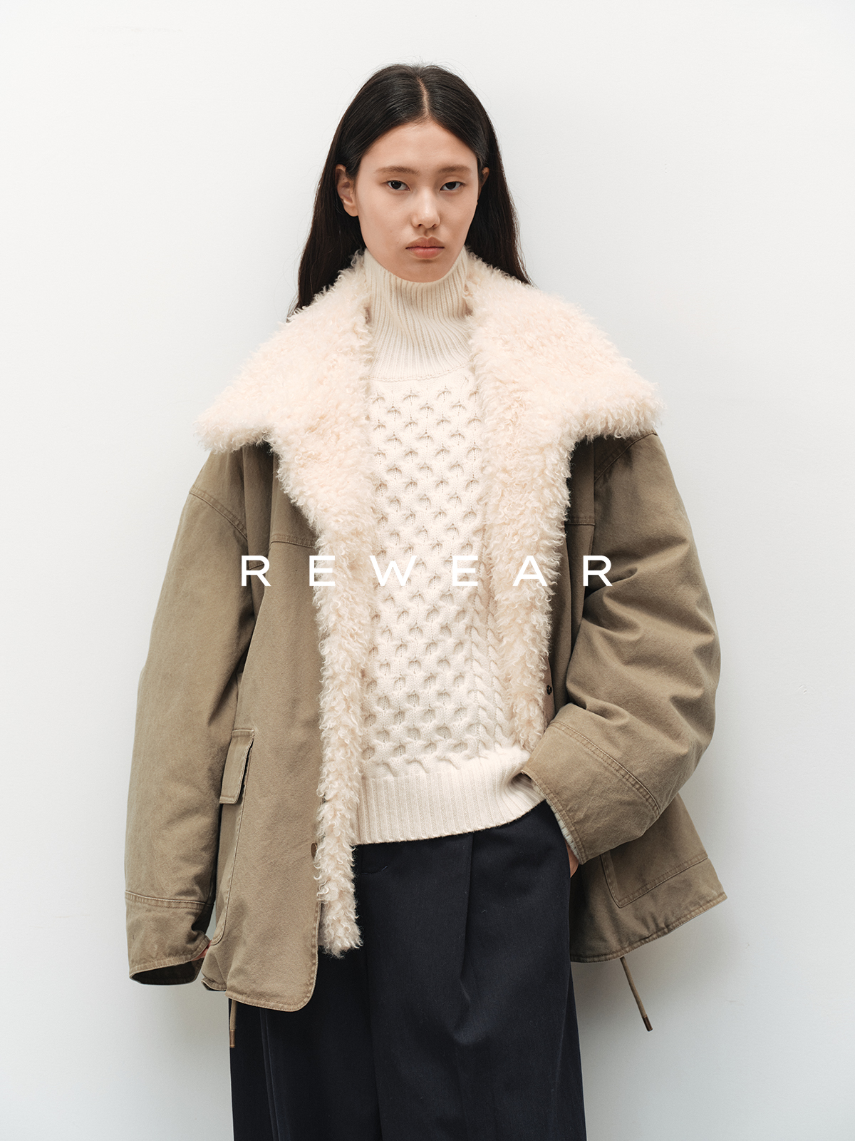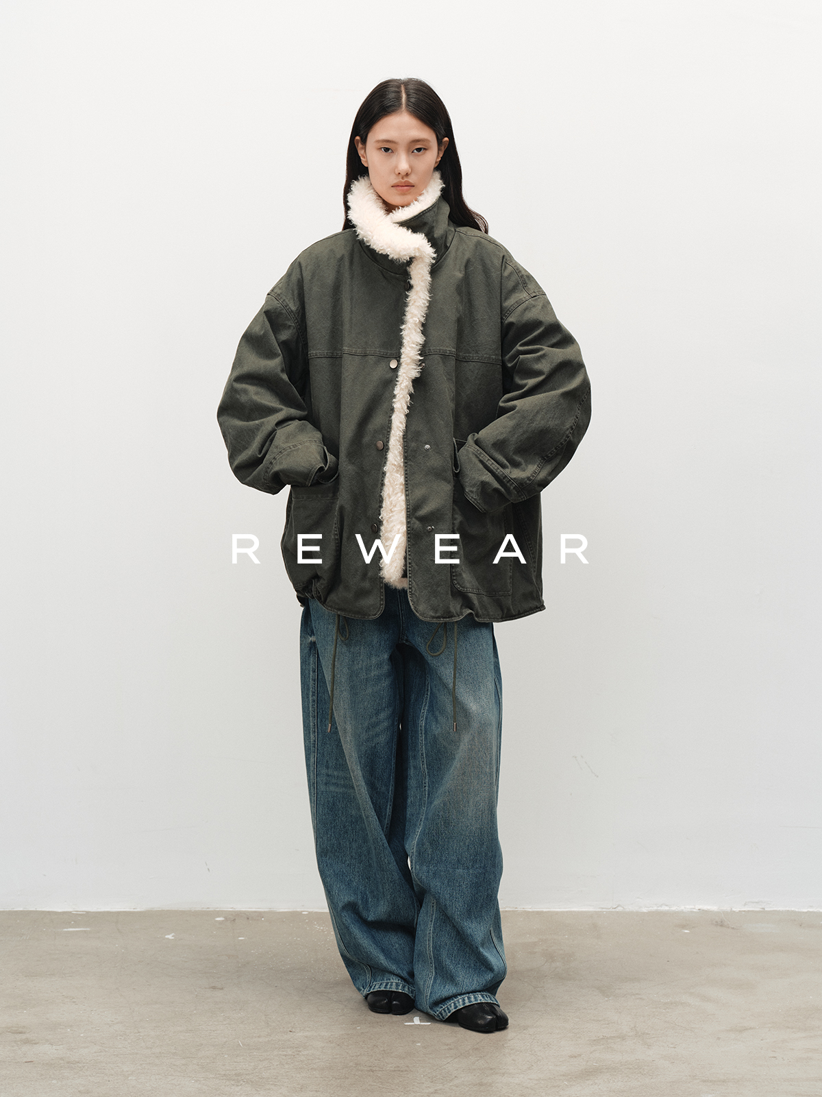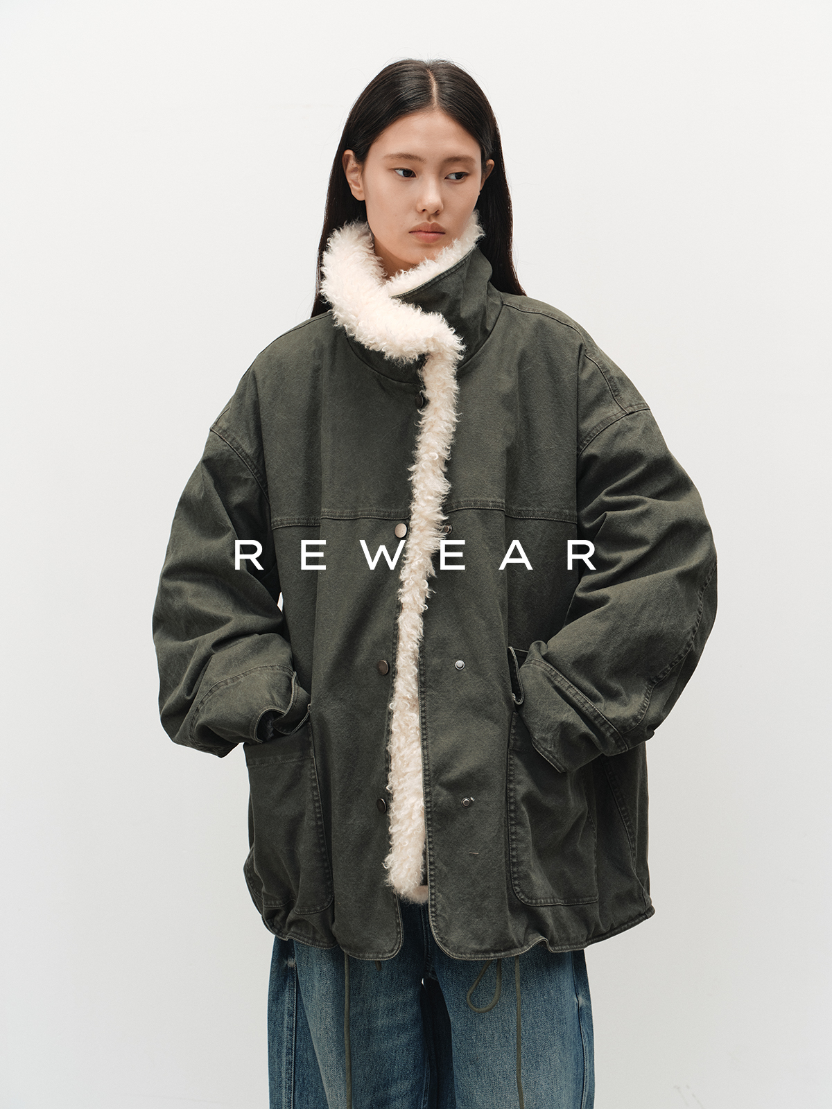 Rewear/Heavy-Duty Enzyme-Washed Cotton Pearl-Sail Wash Faded Detachable Faux Shearling Collar Workwear Parka Cotton Jacket 11355