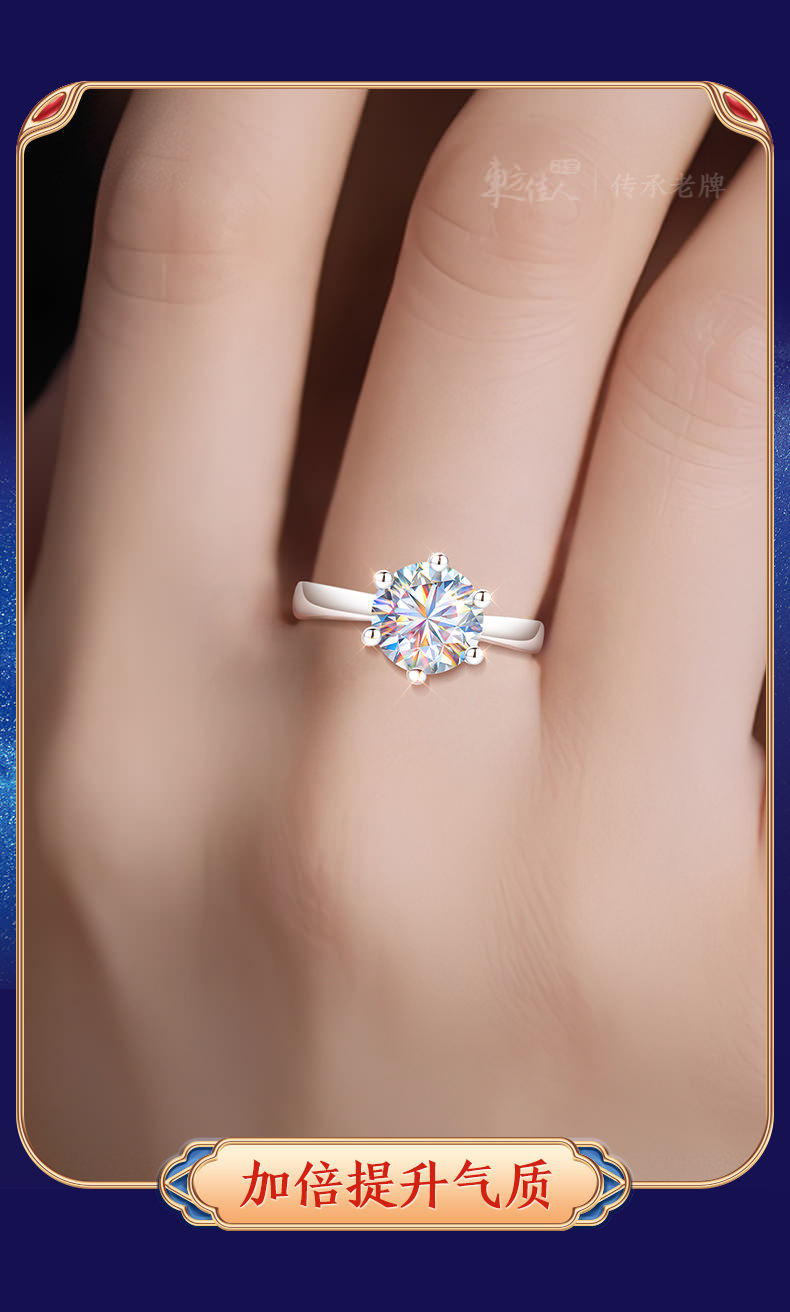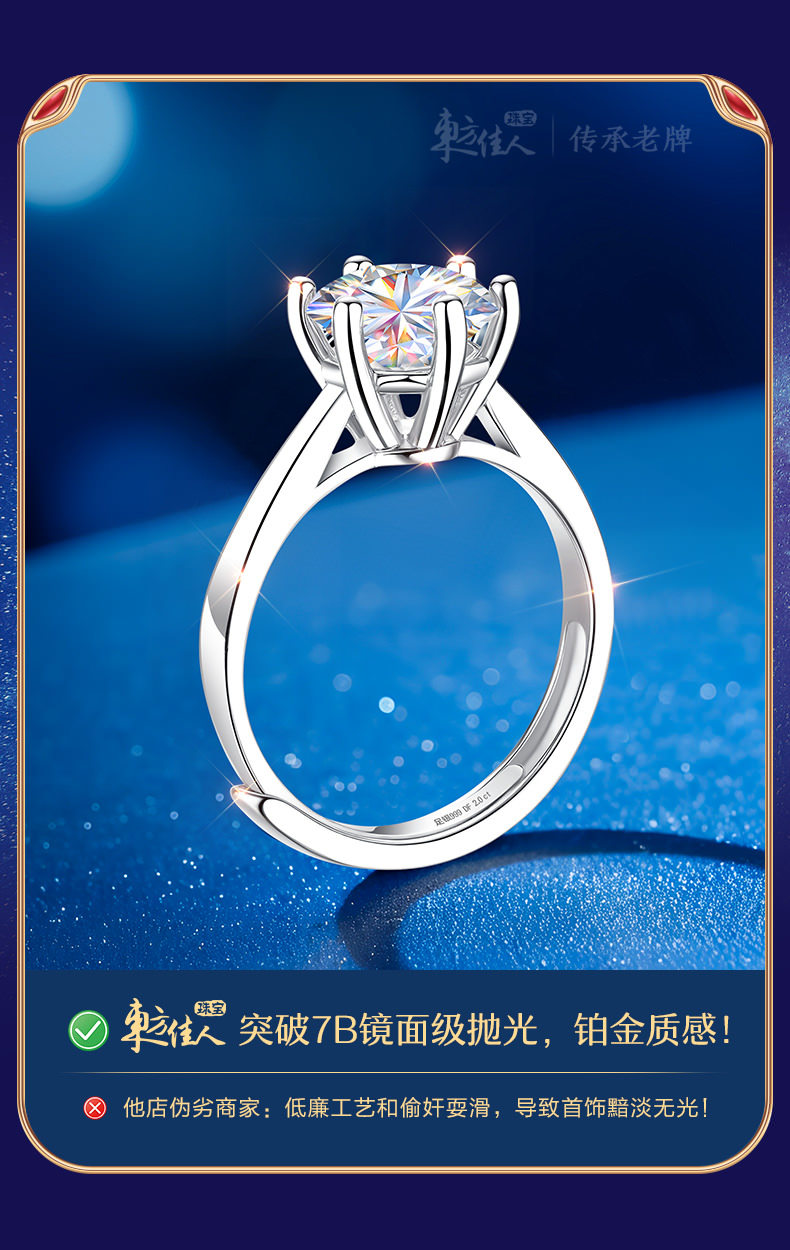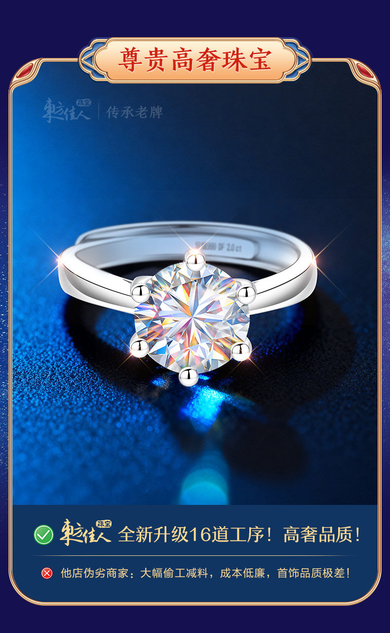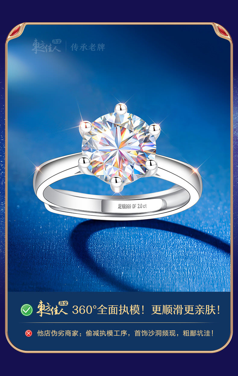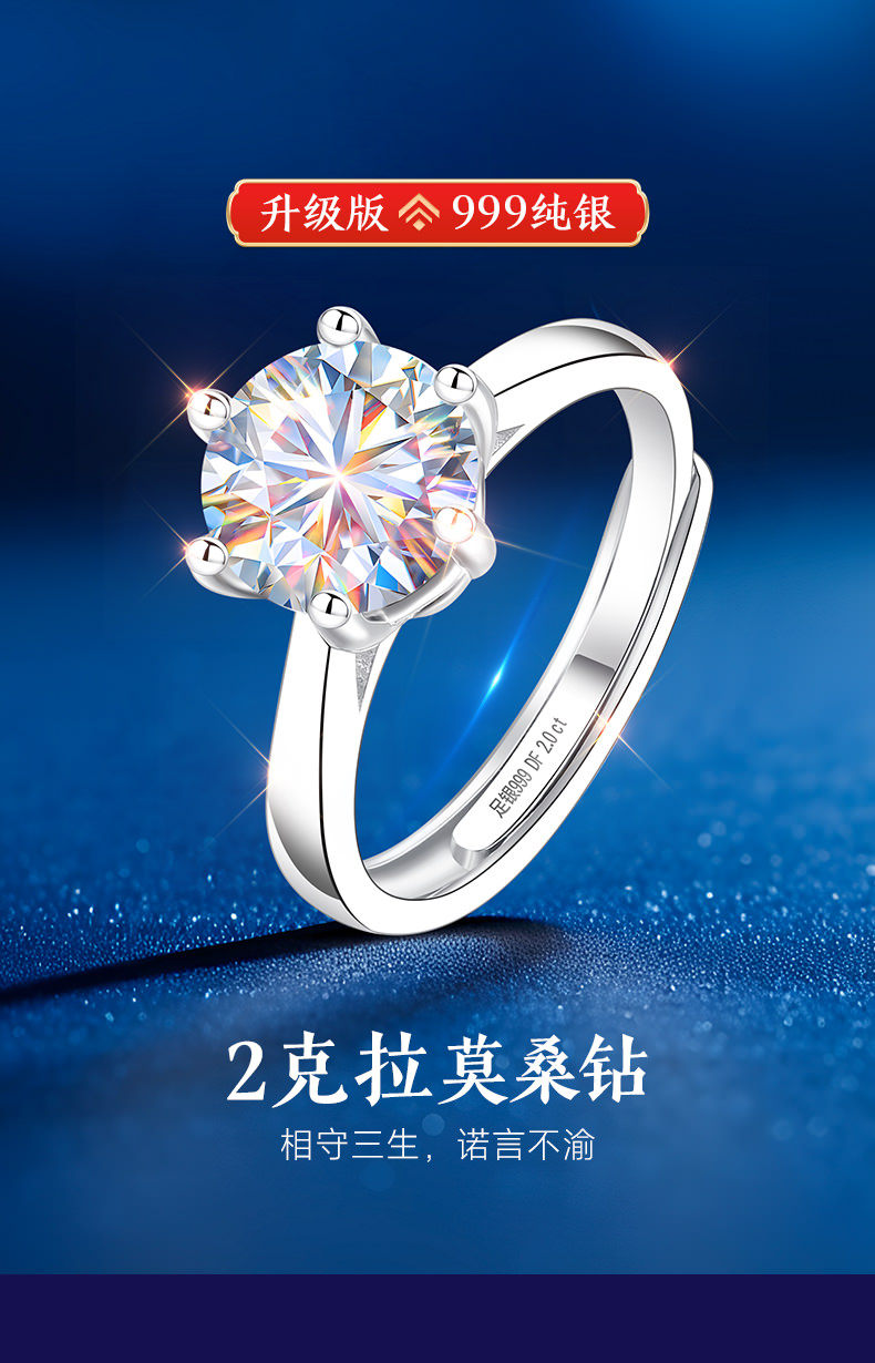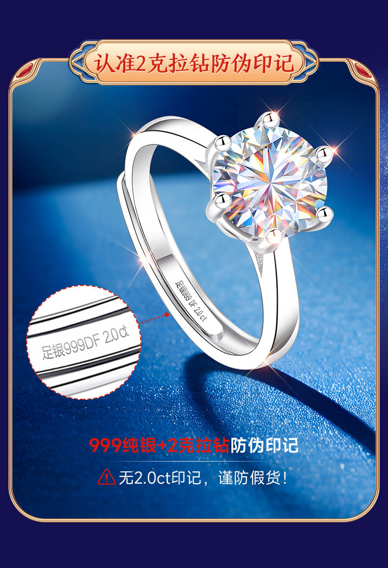 2 Carat Moissanite Diamond Ring, Silver 999 Pure Silver Six-Claw Diamond Ring, Women's Couple's Ring, Wedding Ceremony Ring for Women
