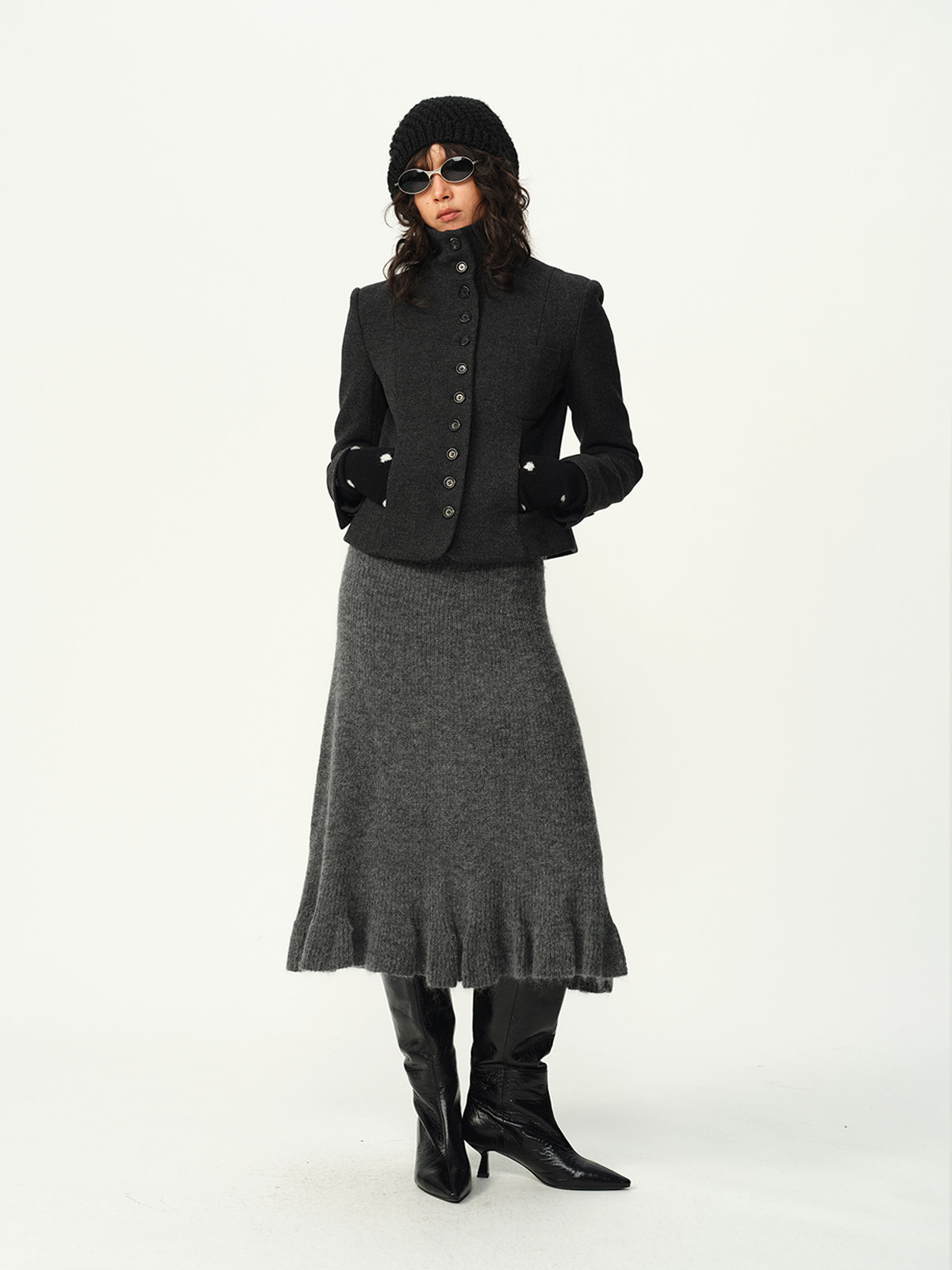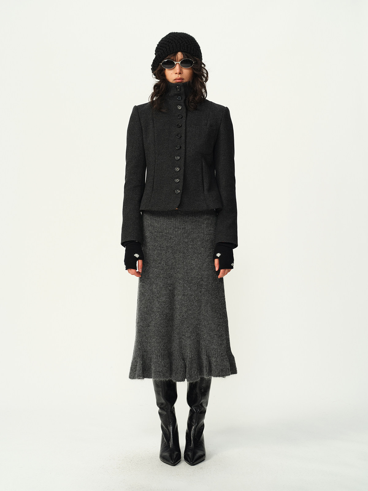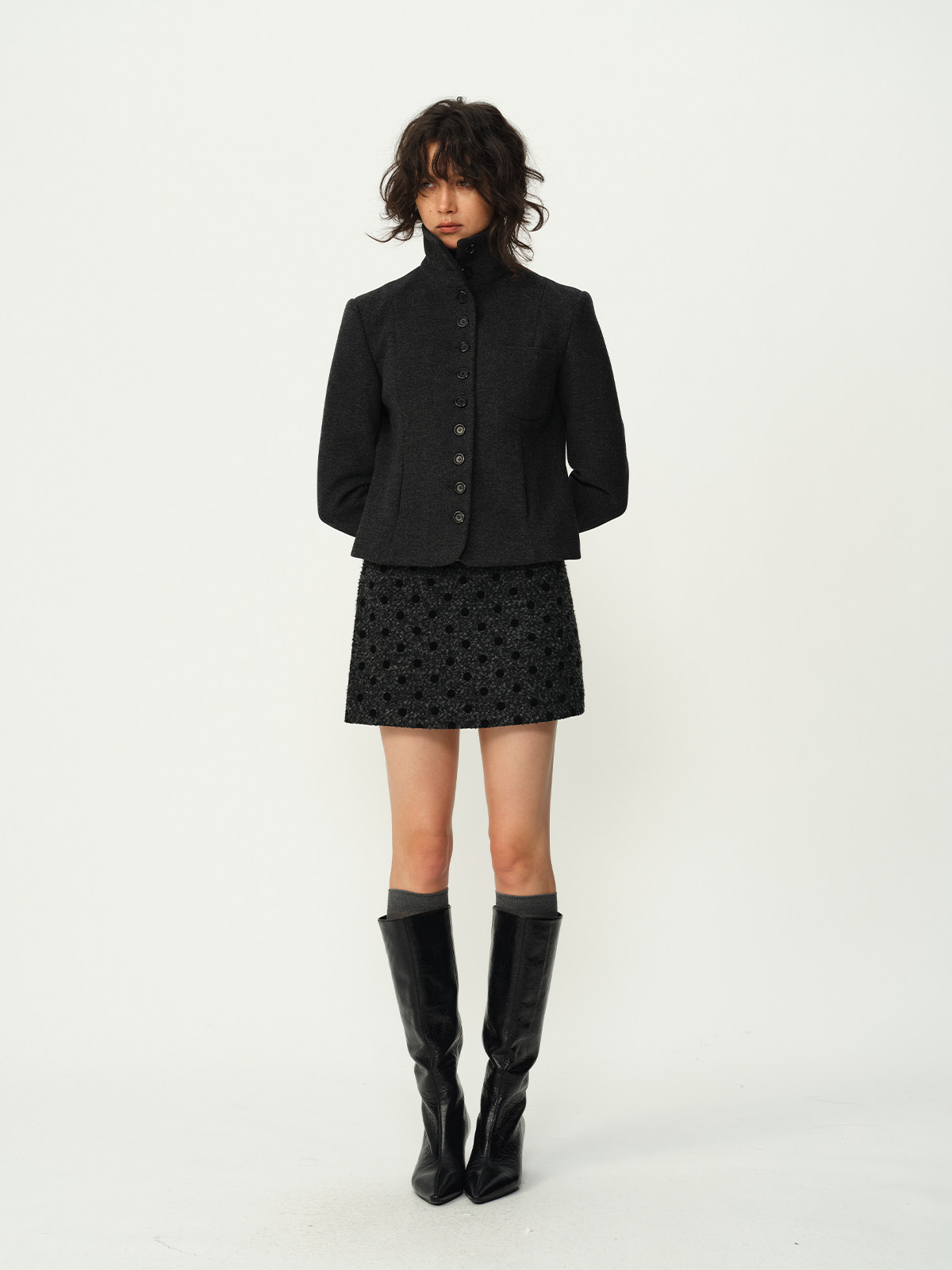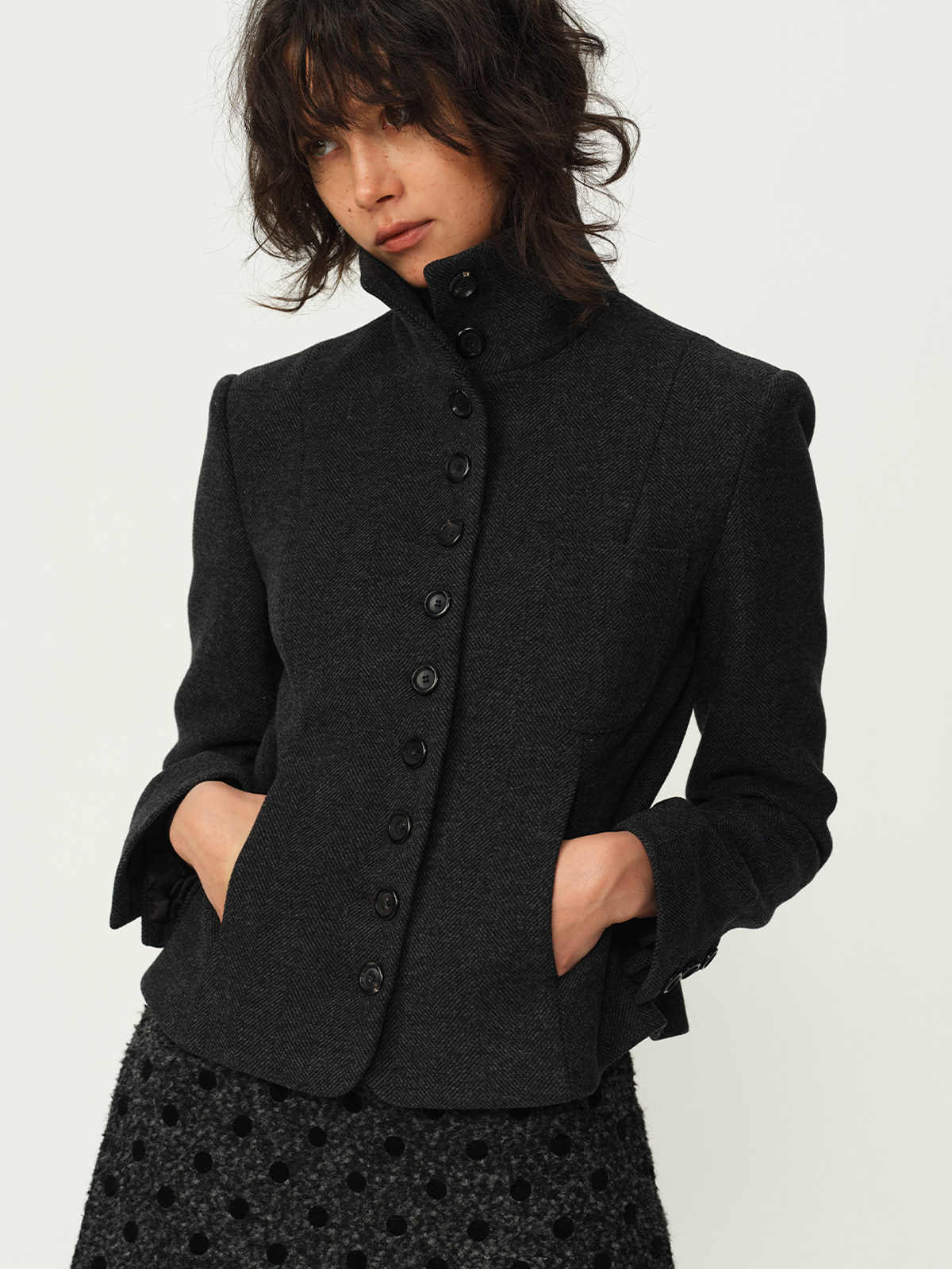 Evistub Retro Wool Herringbone Pattern Detachable Fur Collar Casual Fit Regular Shoulder Short Woolen Coat for Autumn and Winter