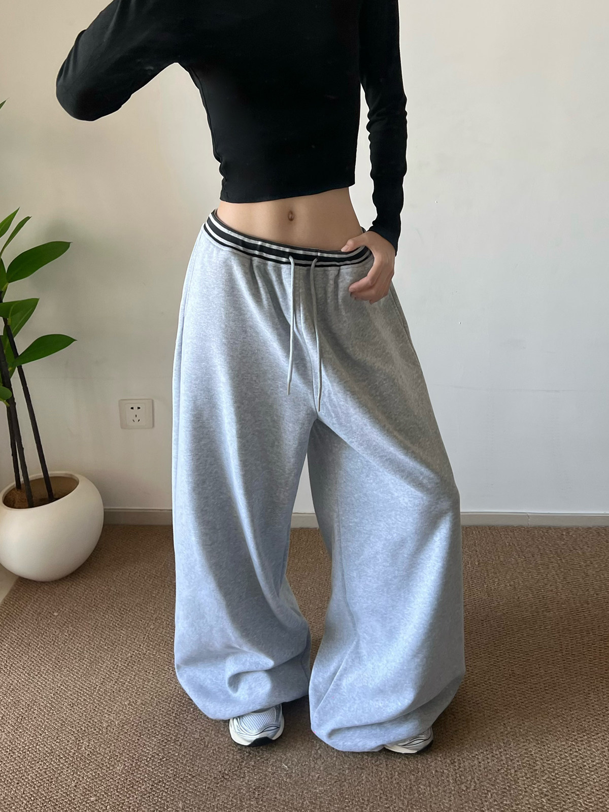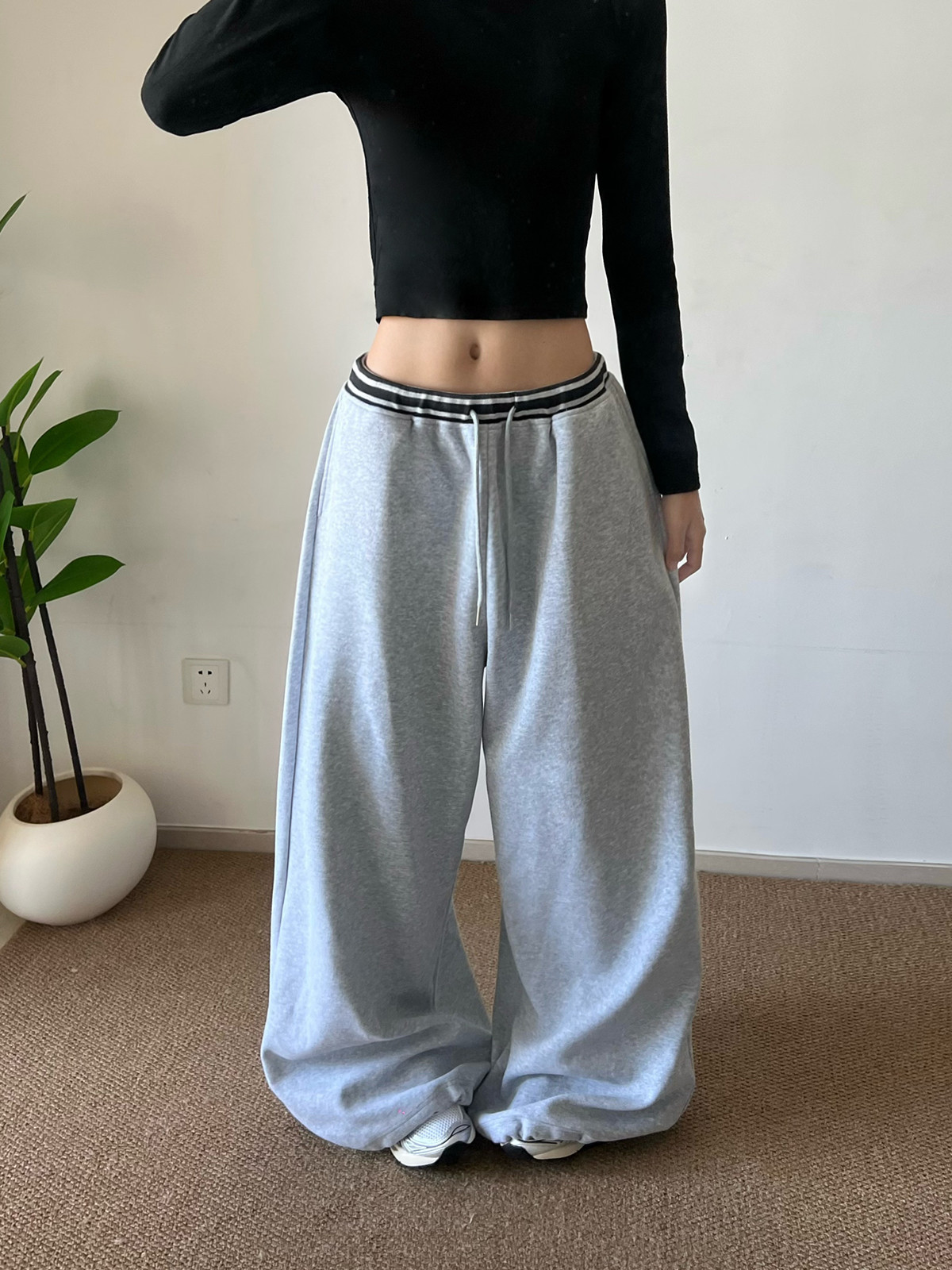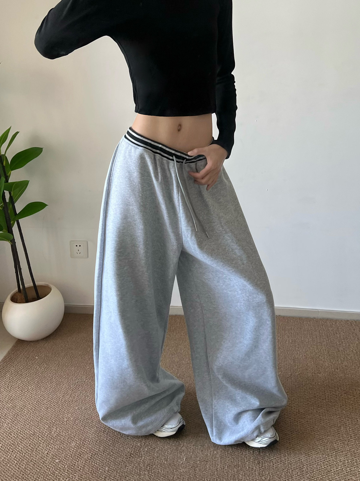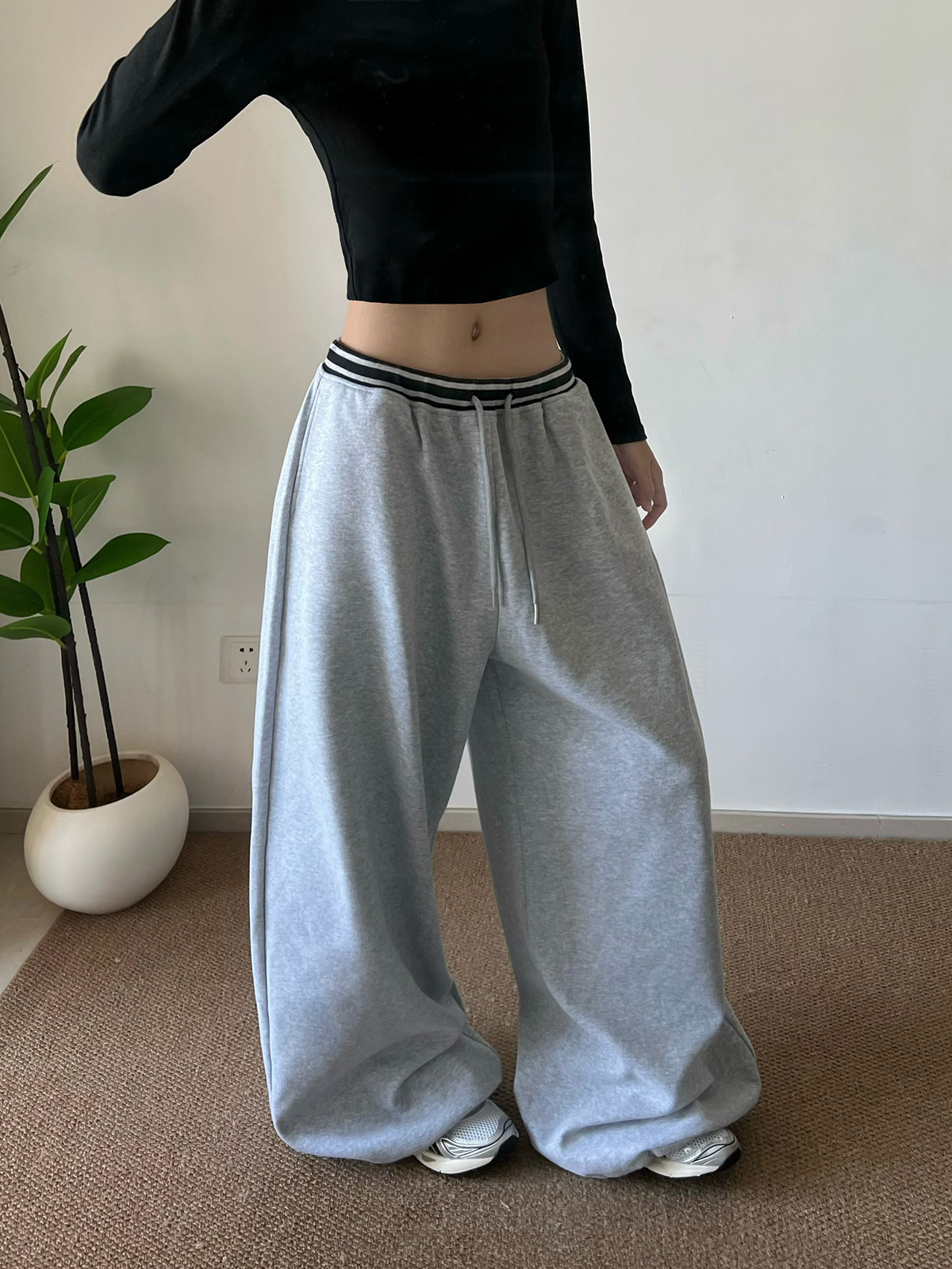 Strawberry Bear Basic Casual Style Composite Cotton Elastic Striped Ribbed Waist Loose Drawstring Sports Floor-Length Sweatpants for Women
