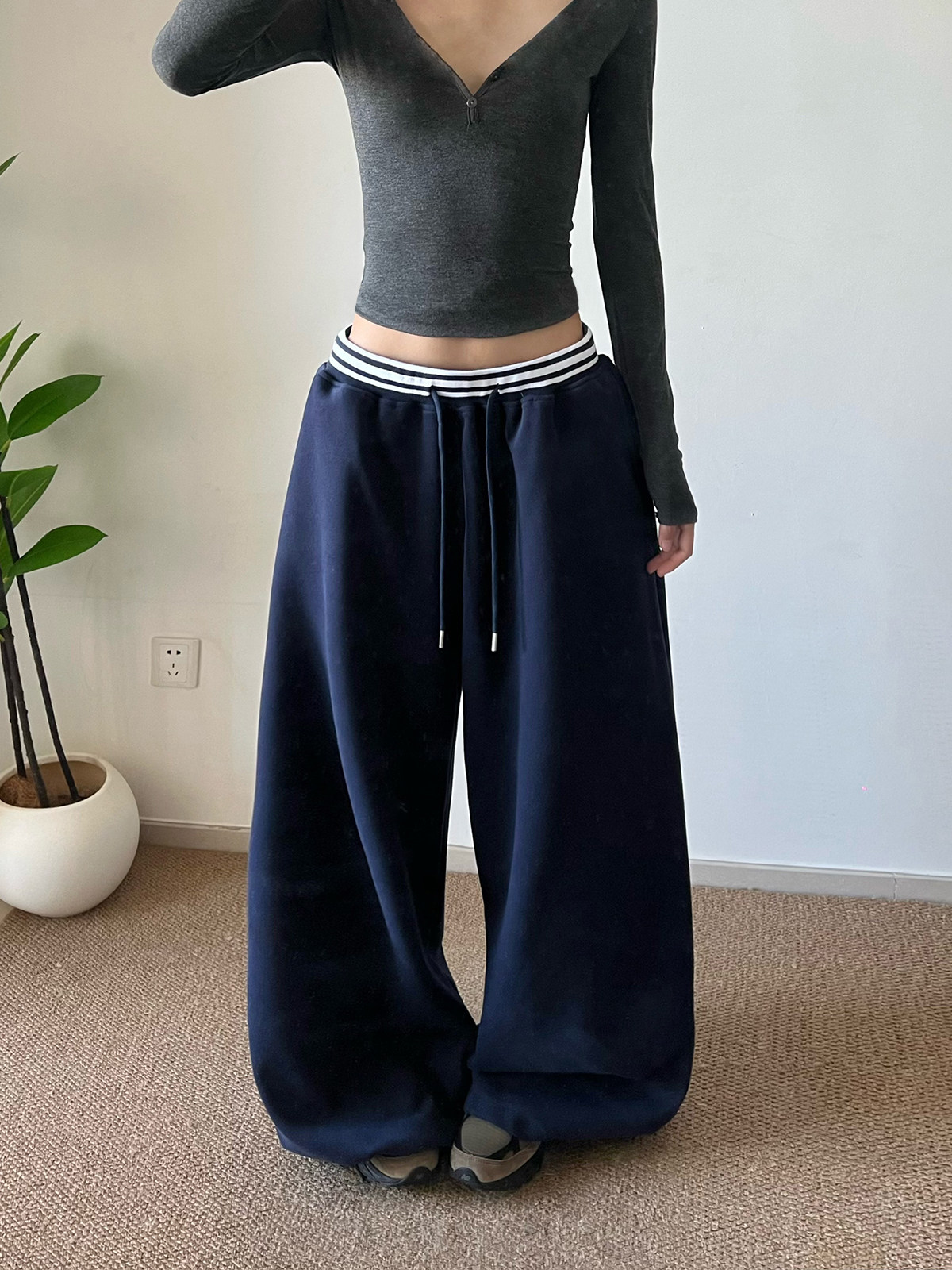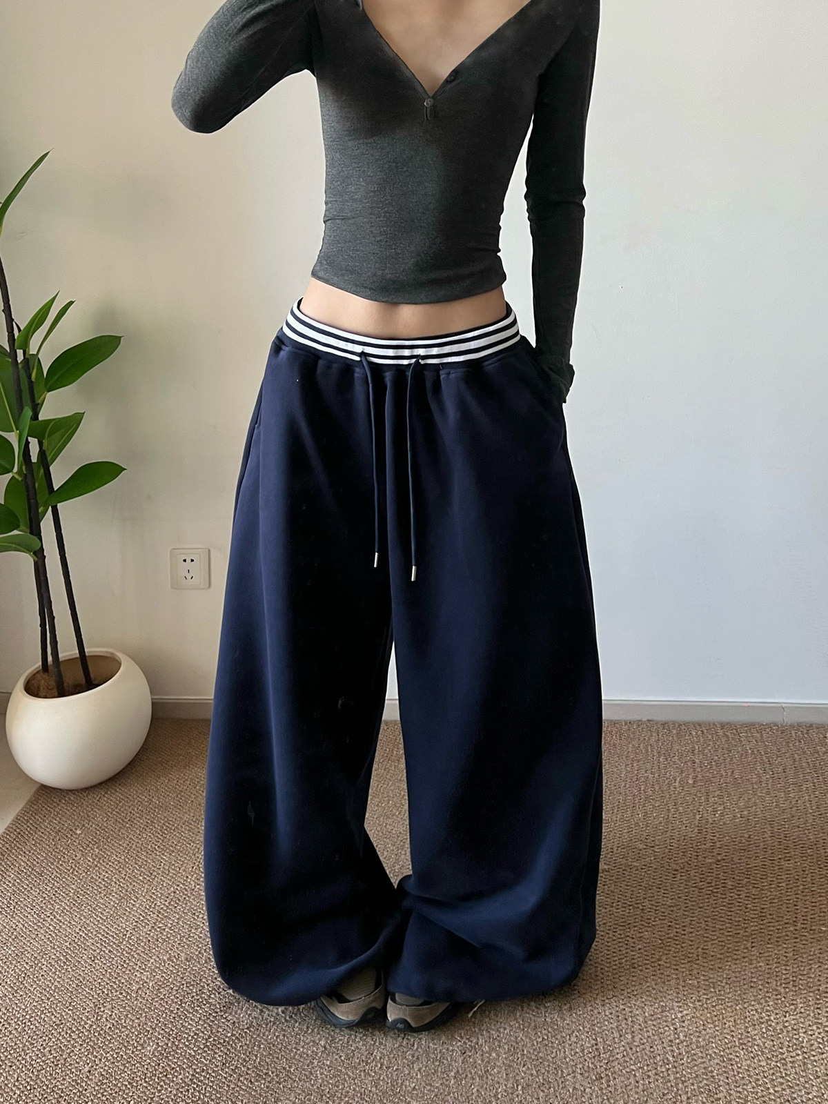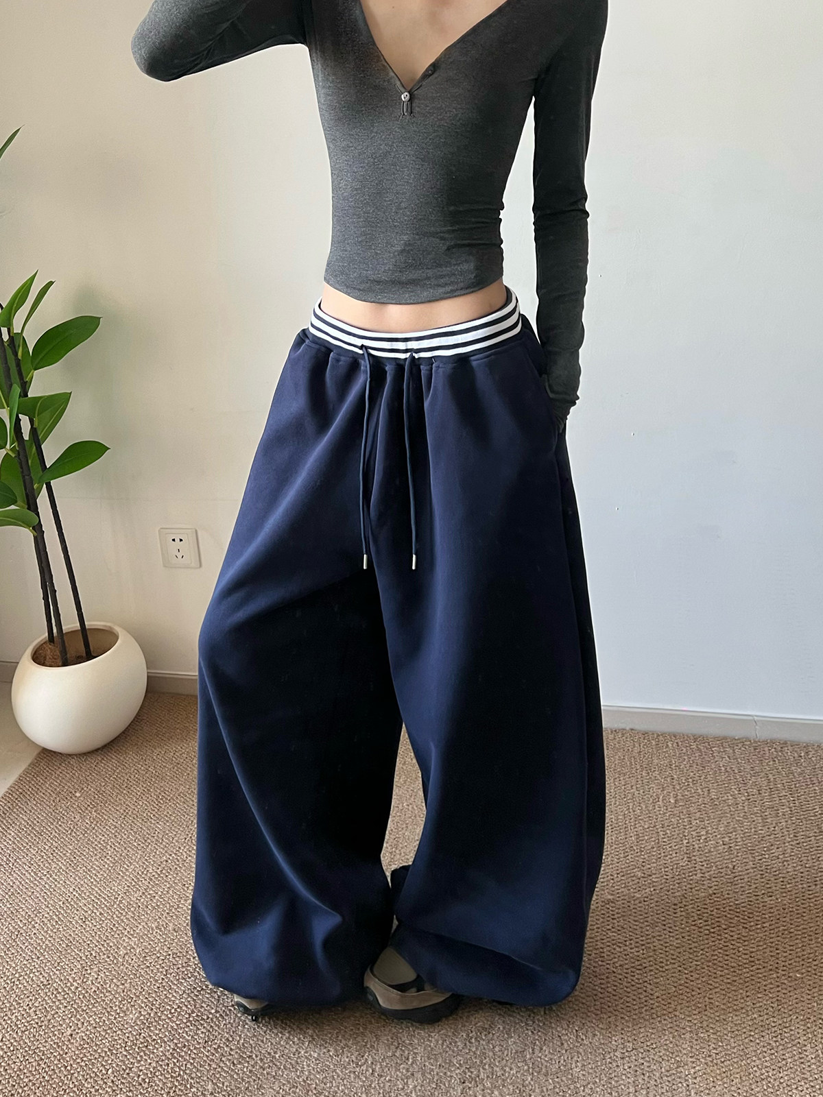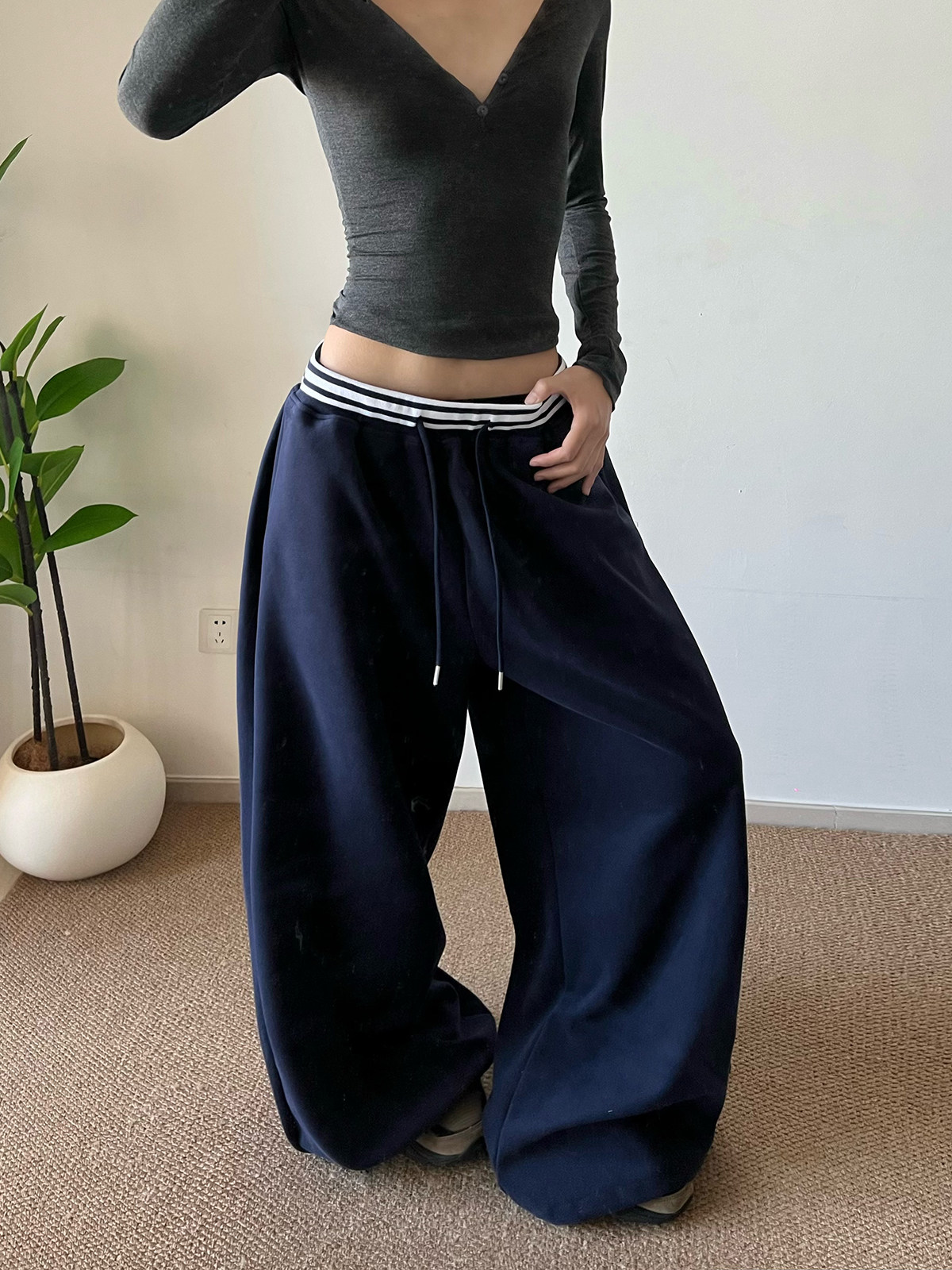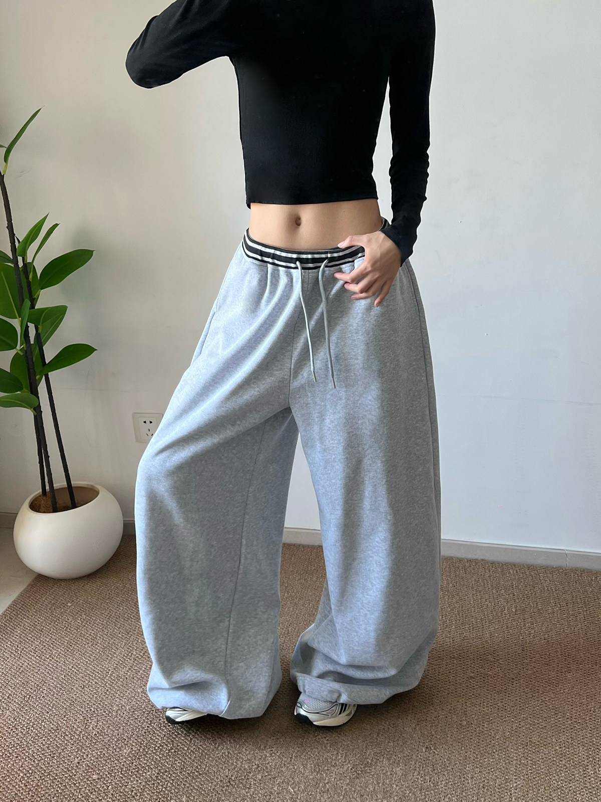 Strawberry Bear Basic Casual Style Composite Cotton Elastic Striped Ribbed Waist Loose Drawstring Sports Floor-Length Sweatpants for Women