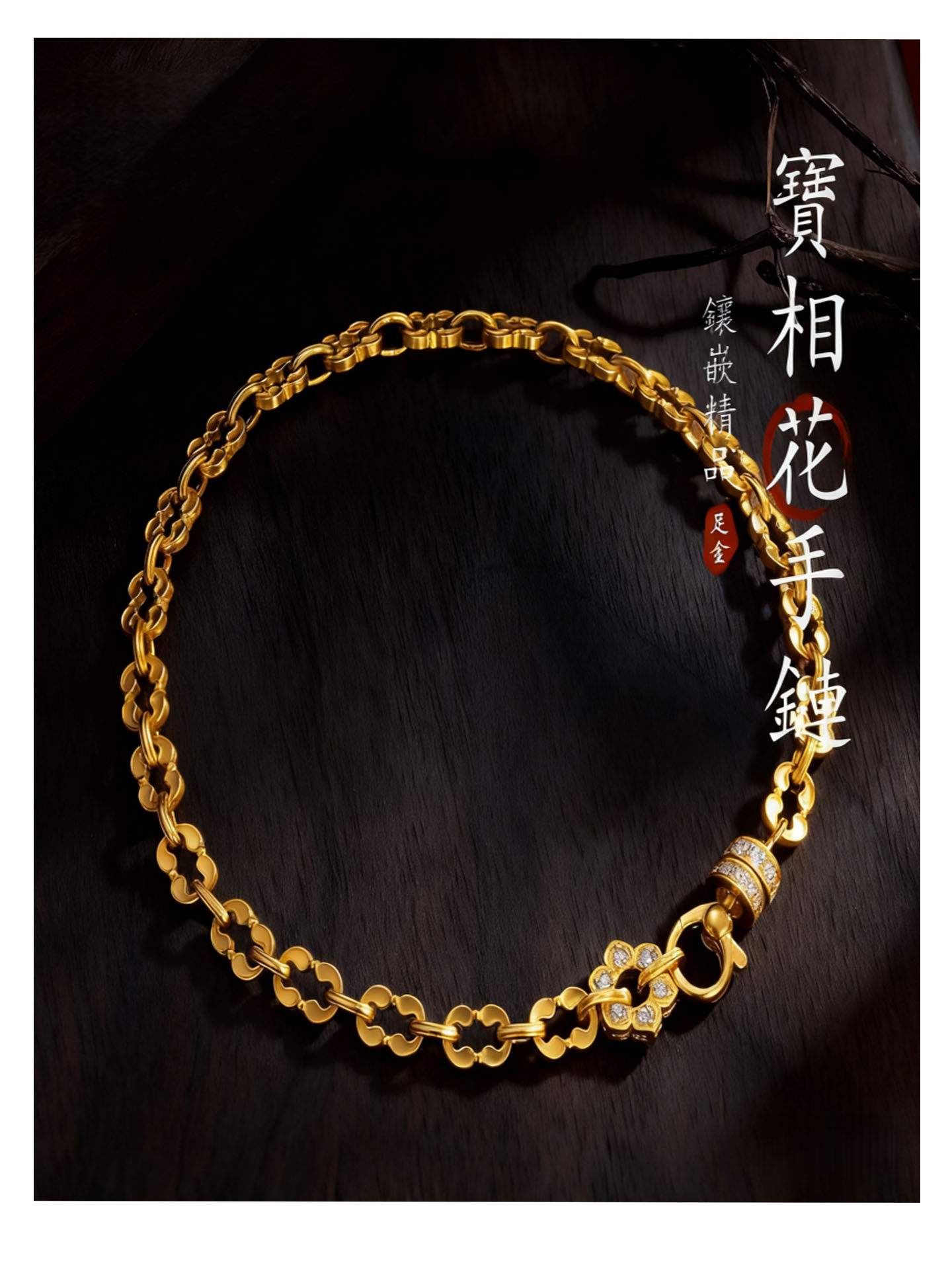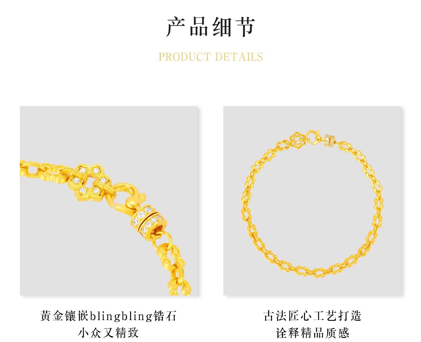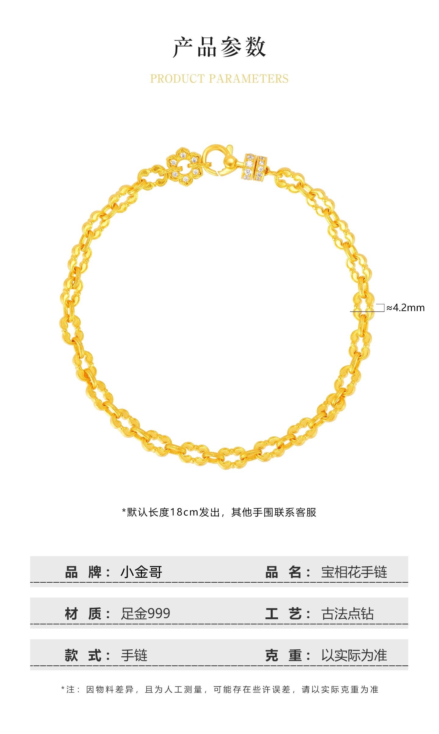 Little Golden Brother Gold Fortune Bracelet Pure Gold 999 Flower Pattern Eight-Character Chain Solid Bracelet for Women Gift