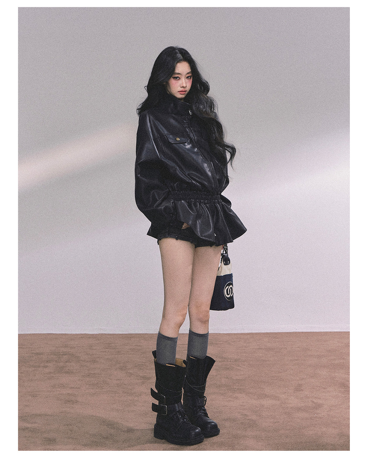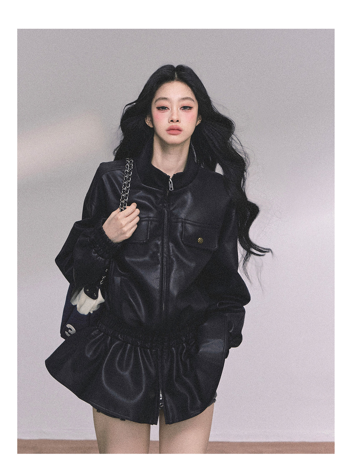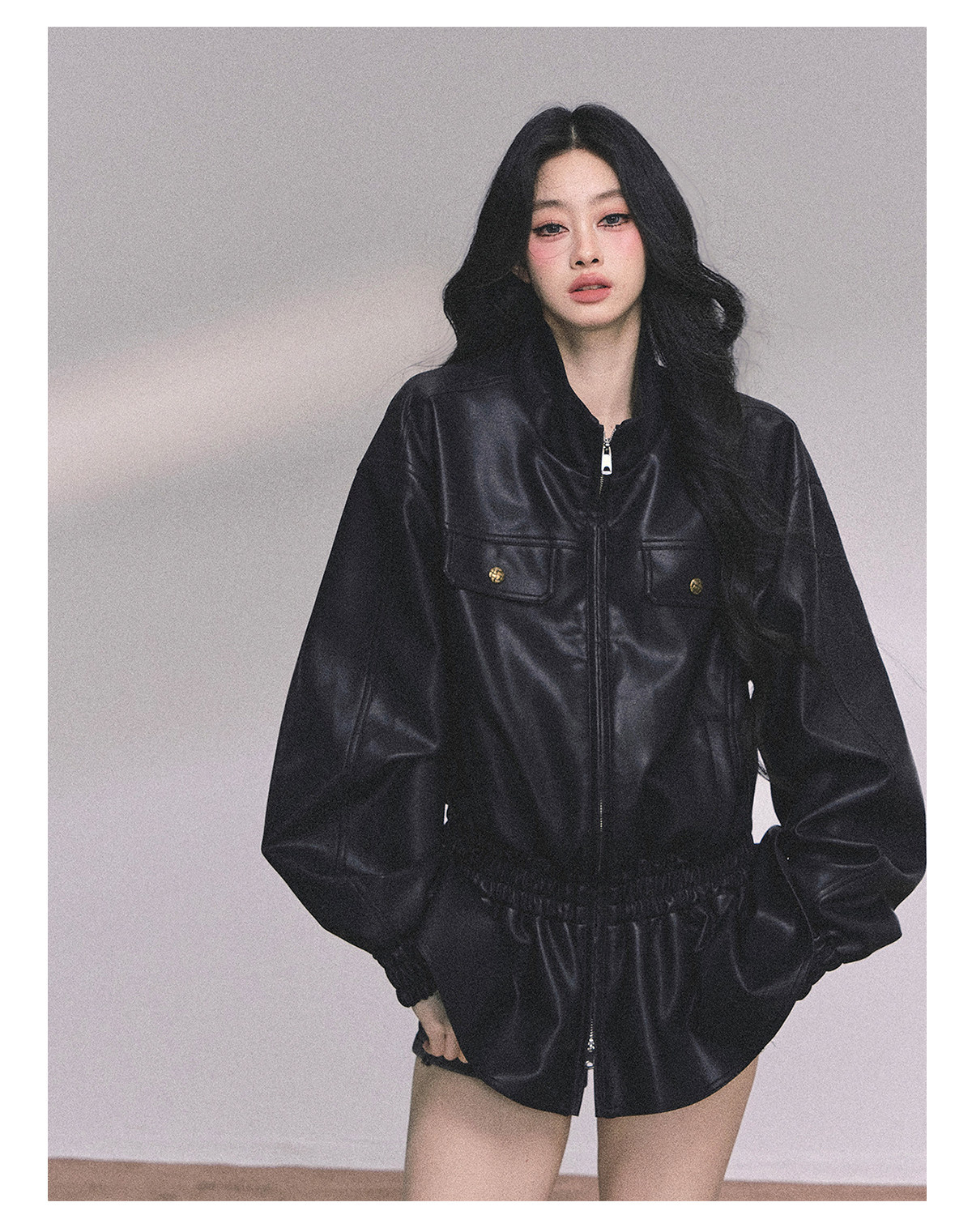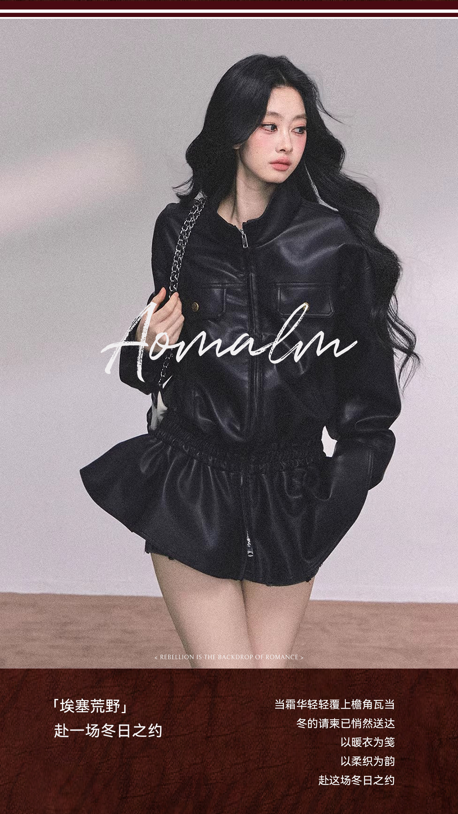 Aomalm Young Style "Ethiopian Wilderness"% Cool and Stylish Pu Leather Jacket for Women, Autumn and Winter Loose Stand Collar Leather Jacket