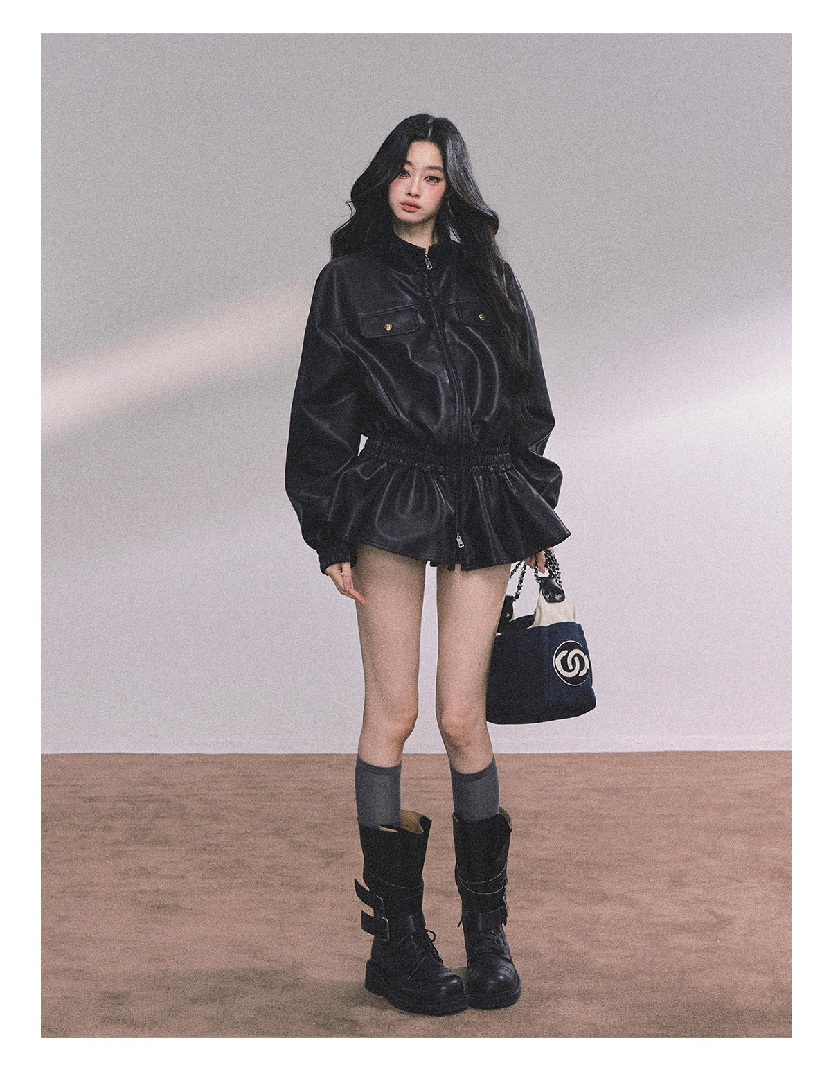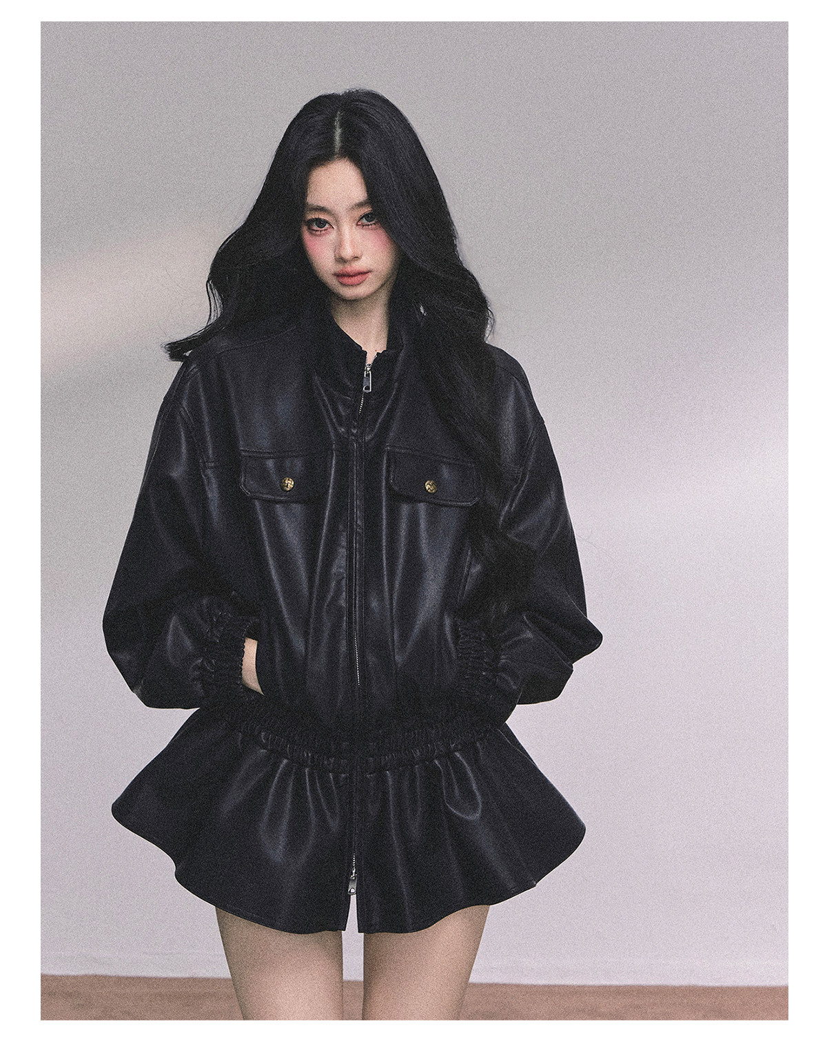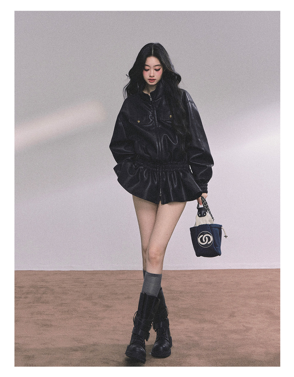 Aomalm Young Style "Ethiopian Wilderness"% Cool and Stylish Pu Leather Jacket for Women, Autumn and Winter Loose Stand Collar Leather Jacket