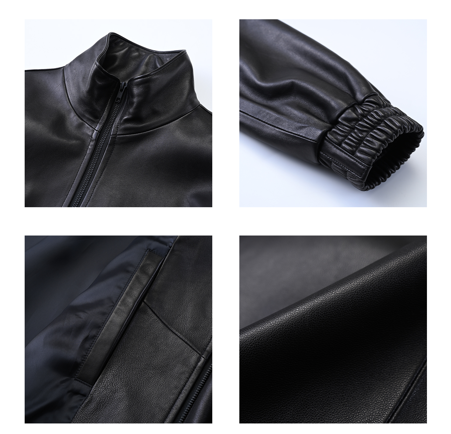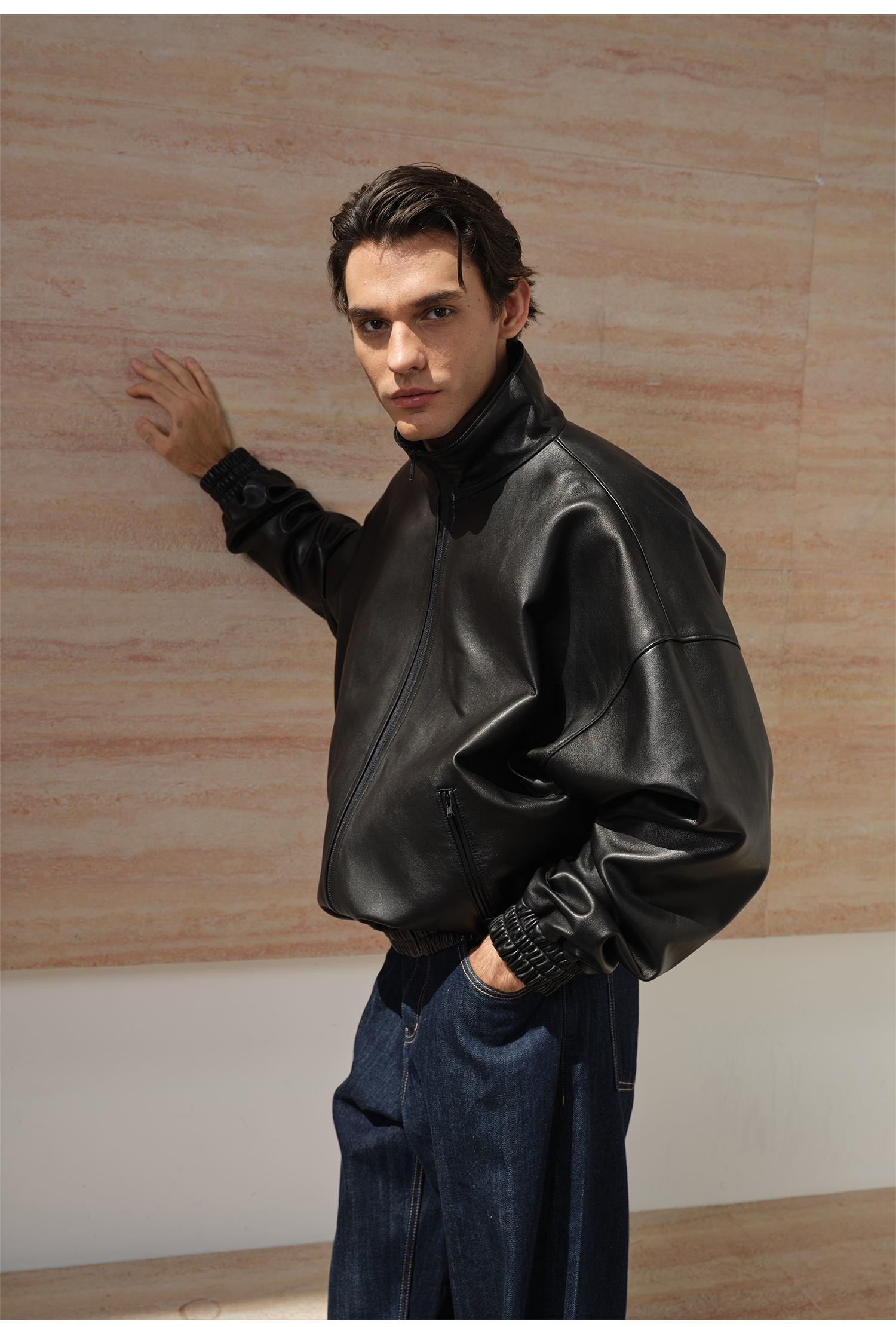 Roolrren New Zealand Vegetable-Tanned Sheepskin Uncoated and Unwaxed Stand-Up Collar Genuine Leather Jacket