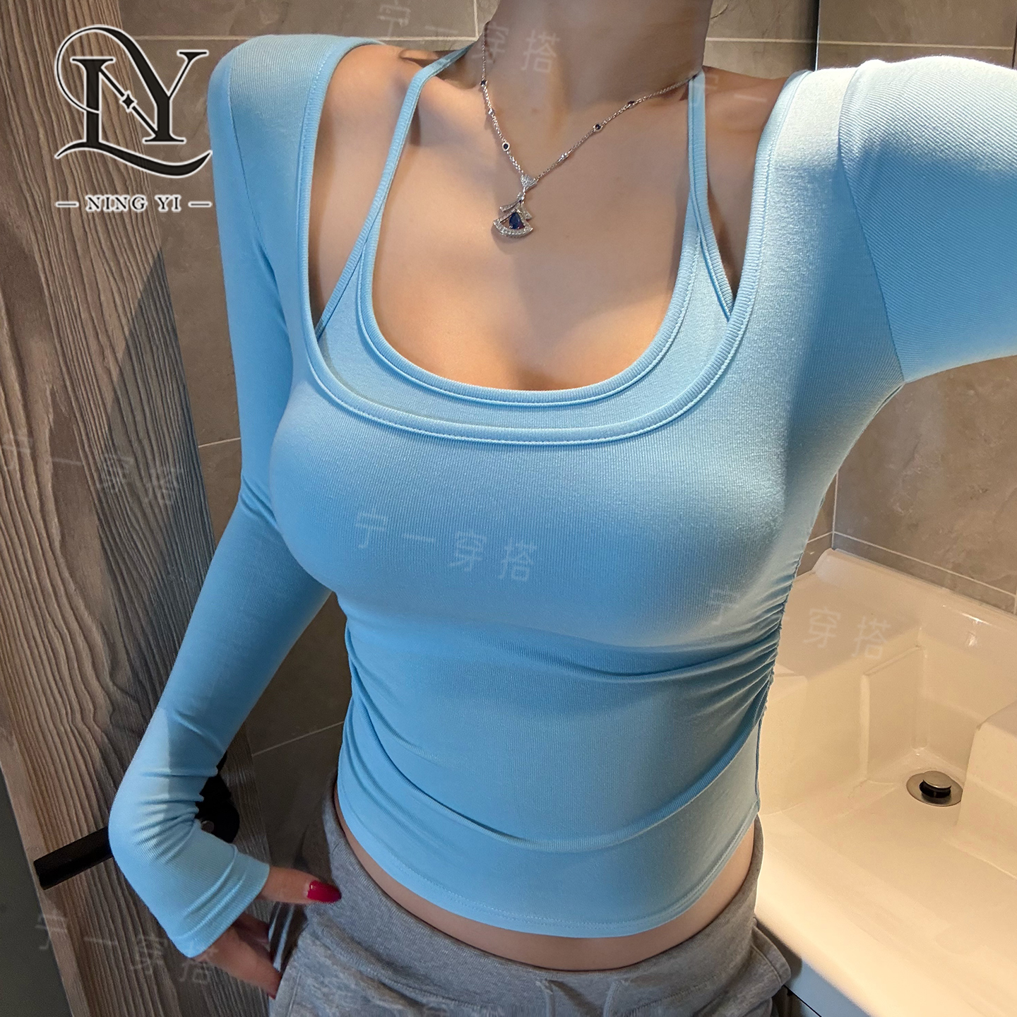 A0023 Modal Autumn Design Two-In-One Long Sleeve T-Shirt with Chest Pad, Fake Hot Girl Style Tight Base Shirt for Women