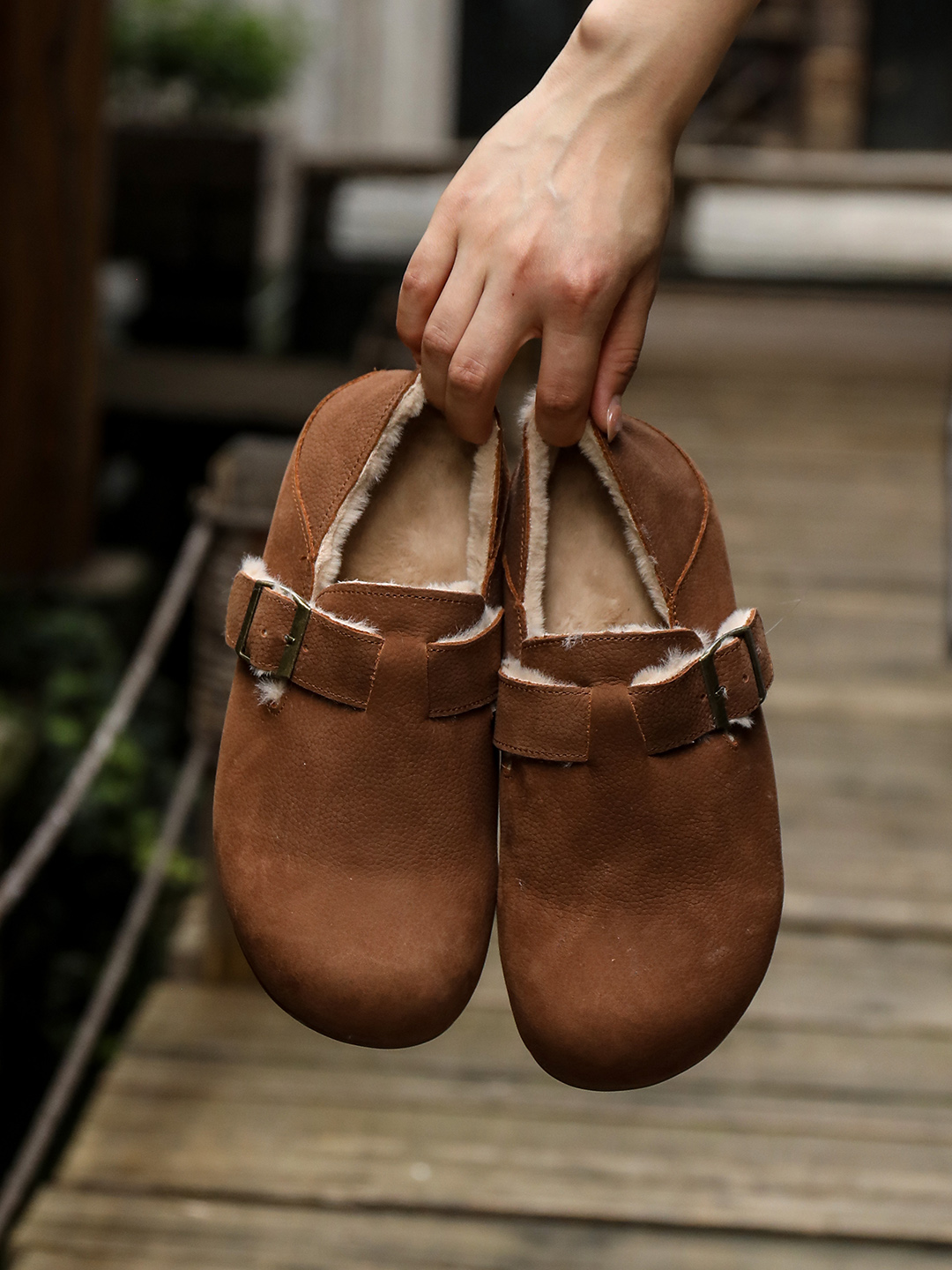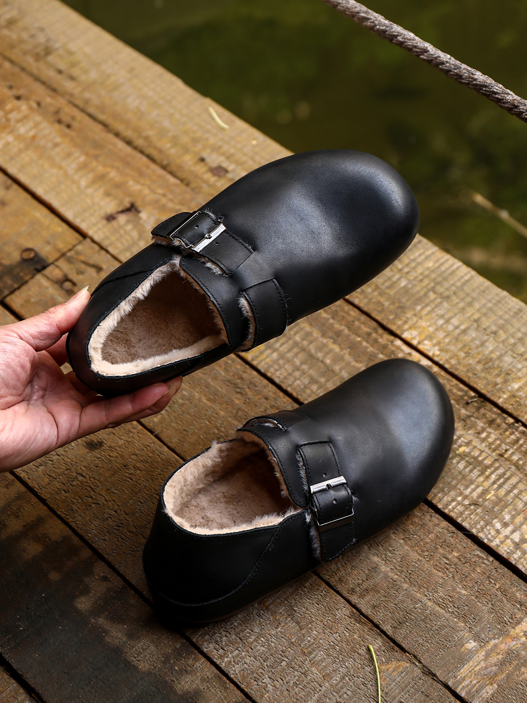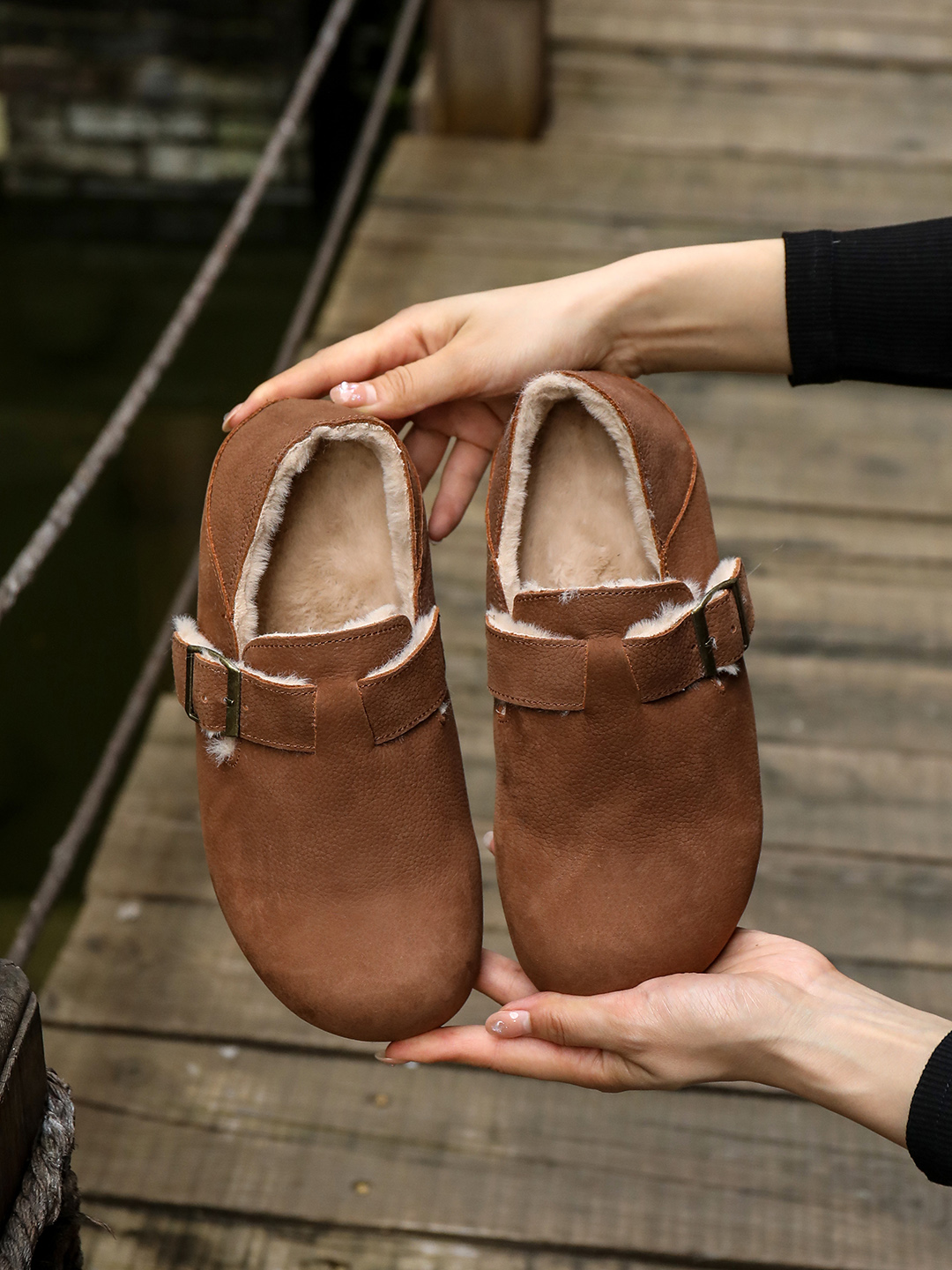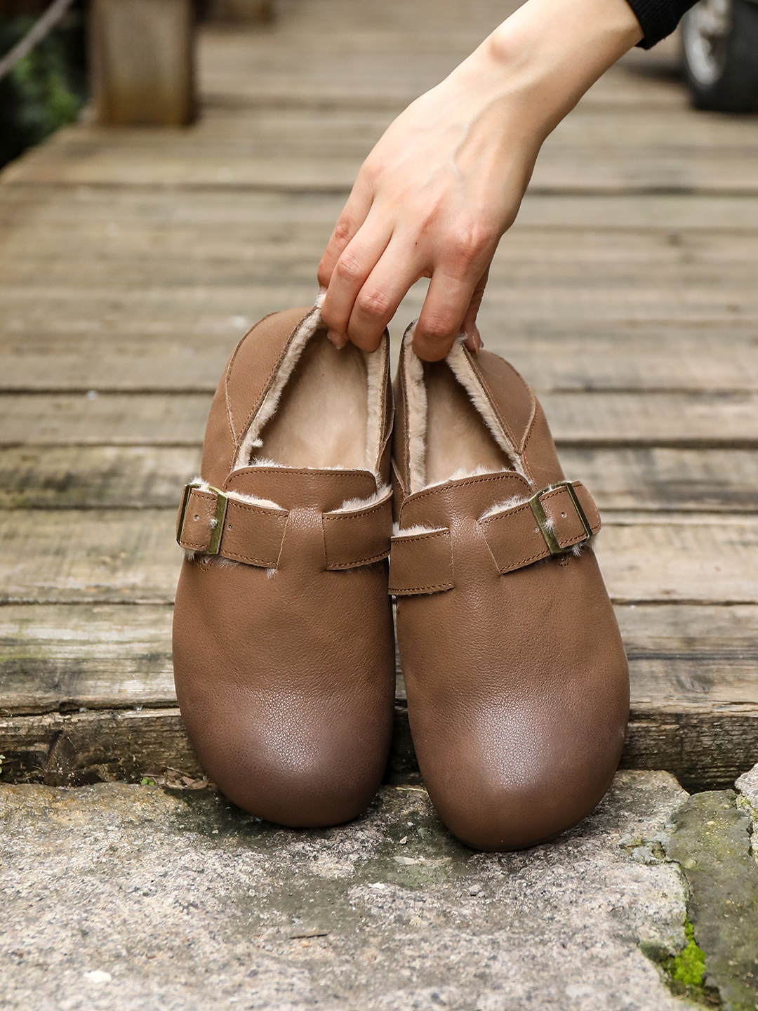 [Highly Recommended! Genuine Leather, Two-Way Wear] Elegant Winter Fleece-Lined Warm Cotton Shoes, Round Toe Slip-On Women's Shoes with Hidden Height Increase