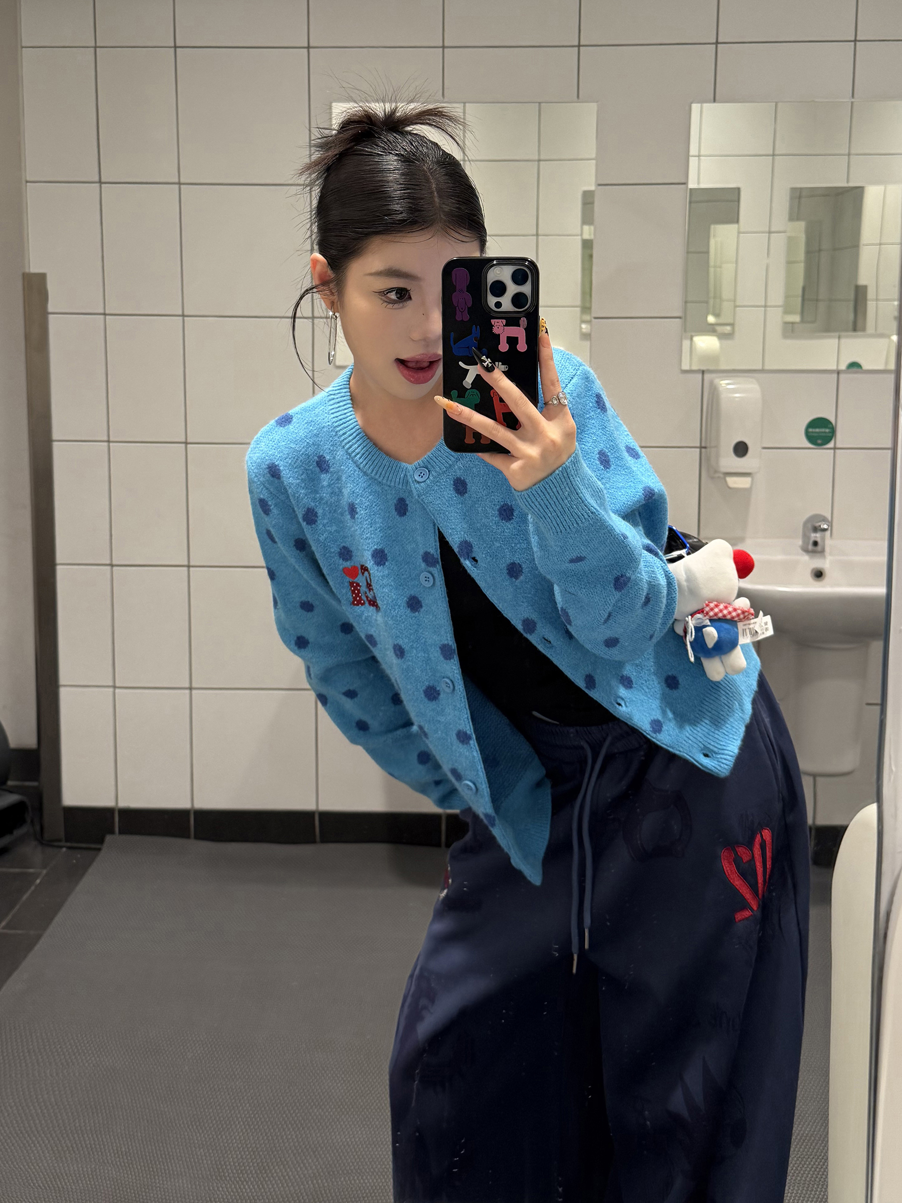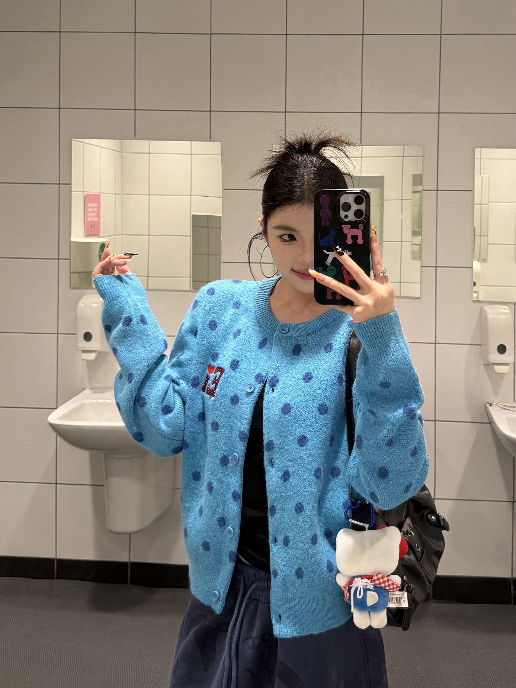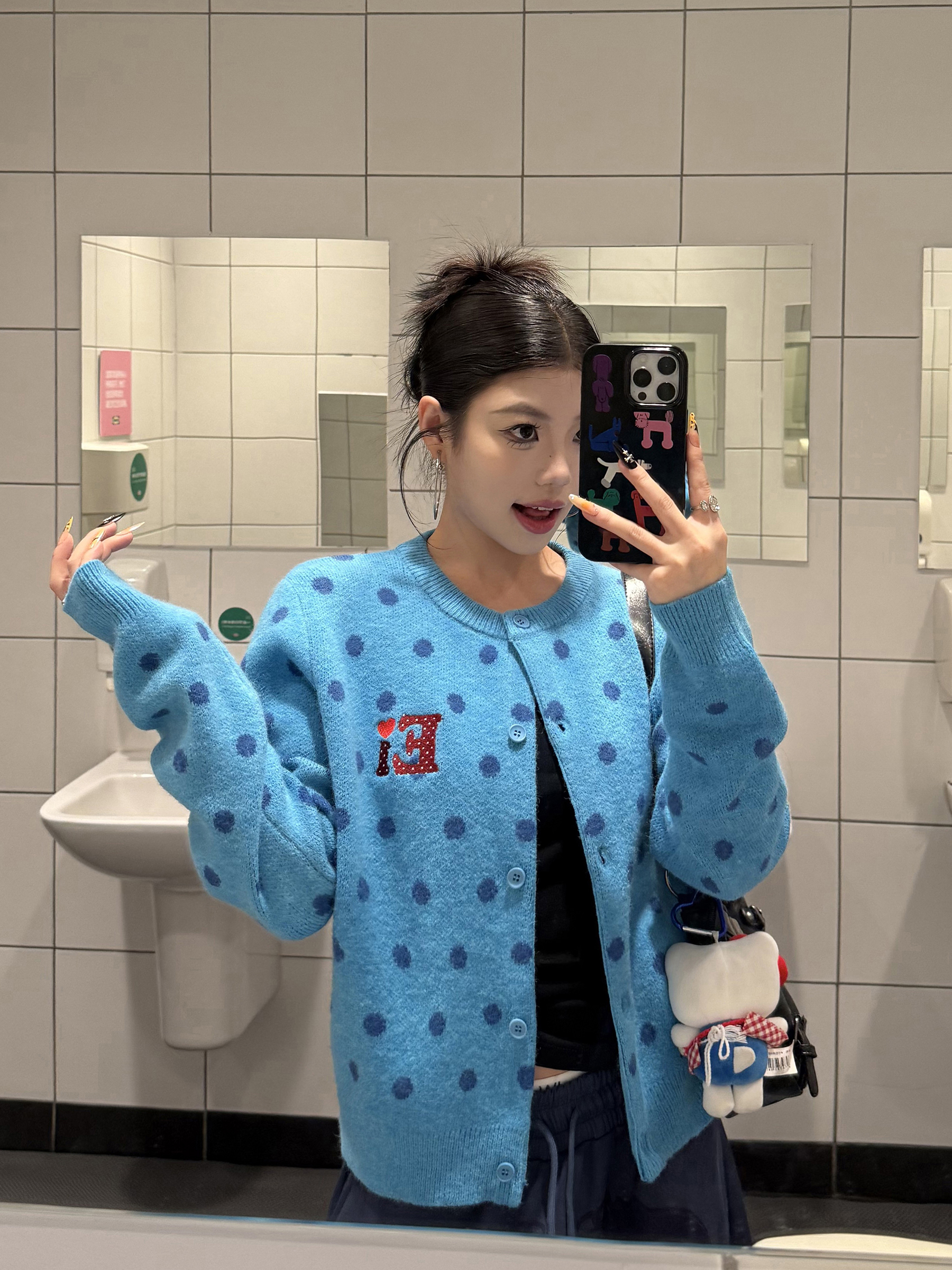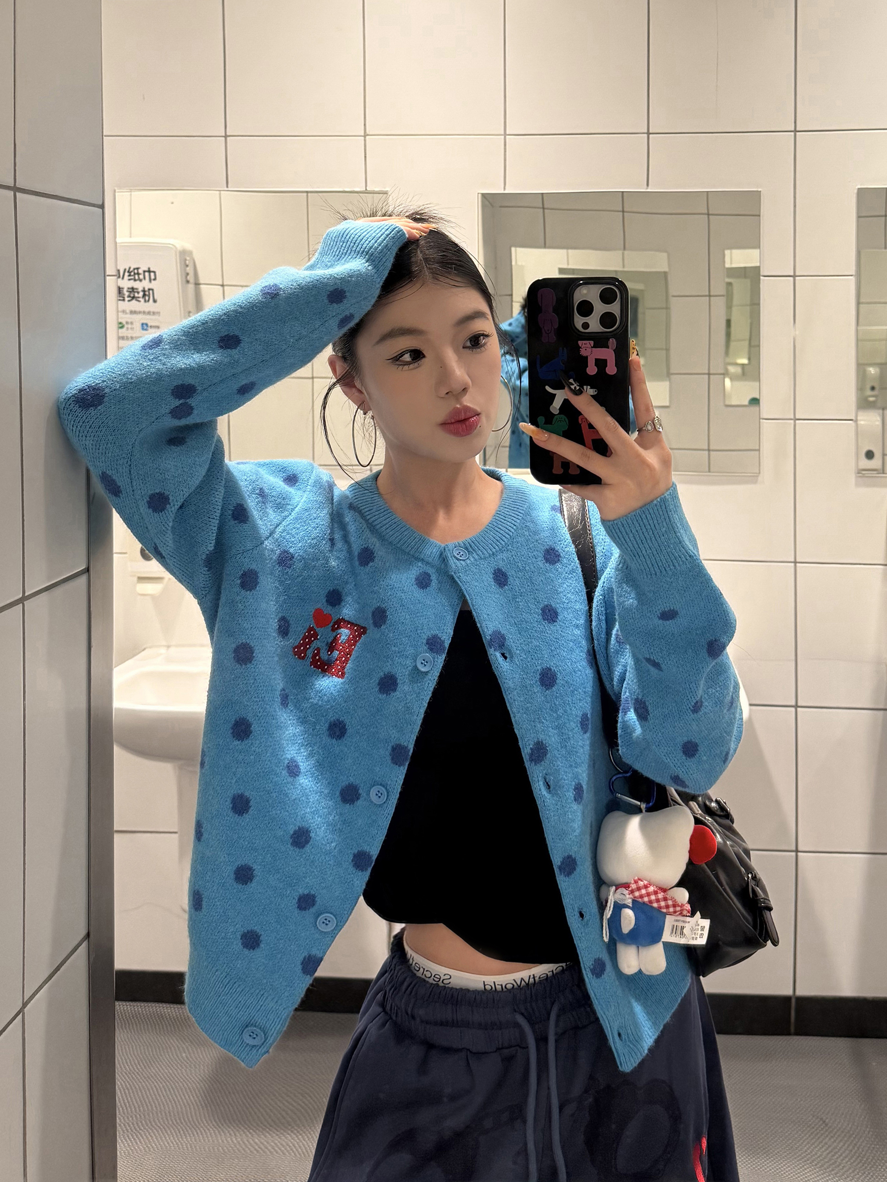 Koiisle American Retro Polka-Dot Round-Neck Cardigan Knitwear Jacket for Women, Autumn Short Style, Soft and Lazy Style Knitwear