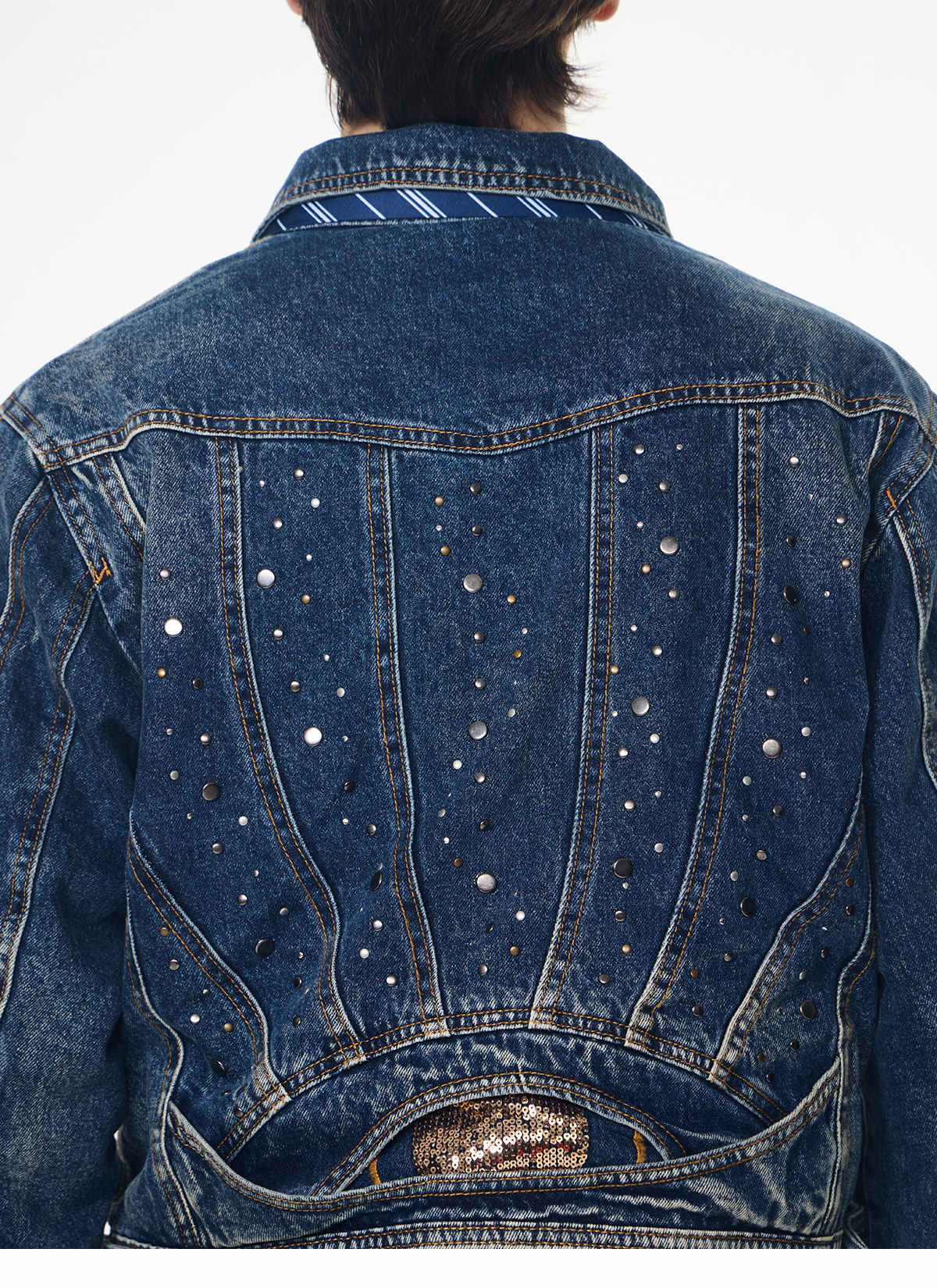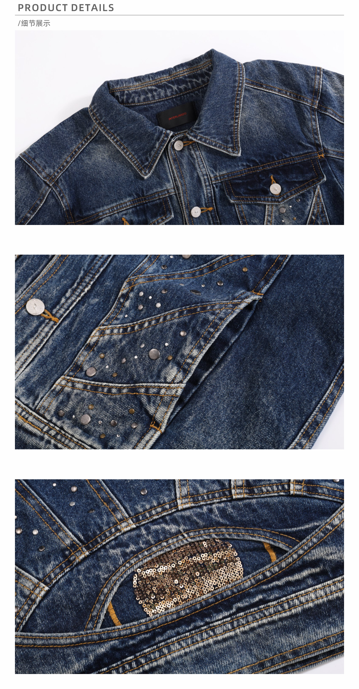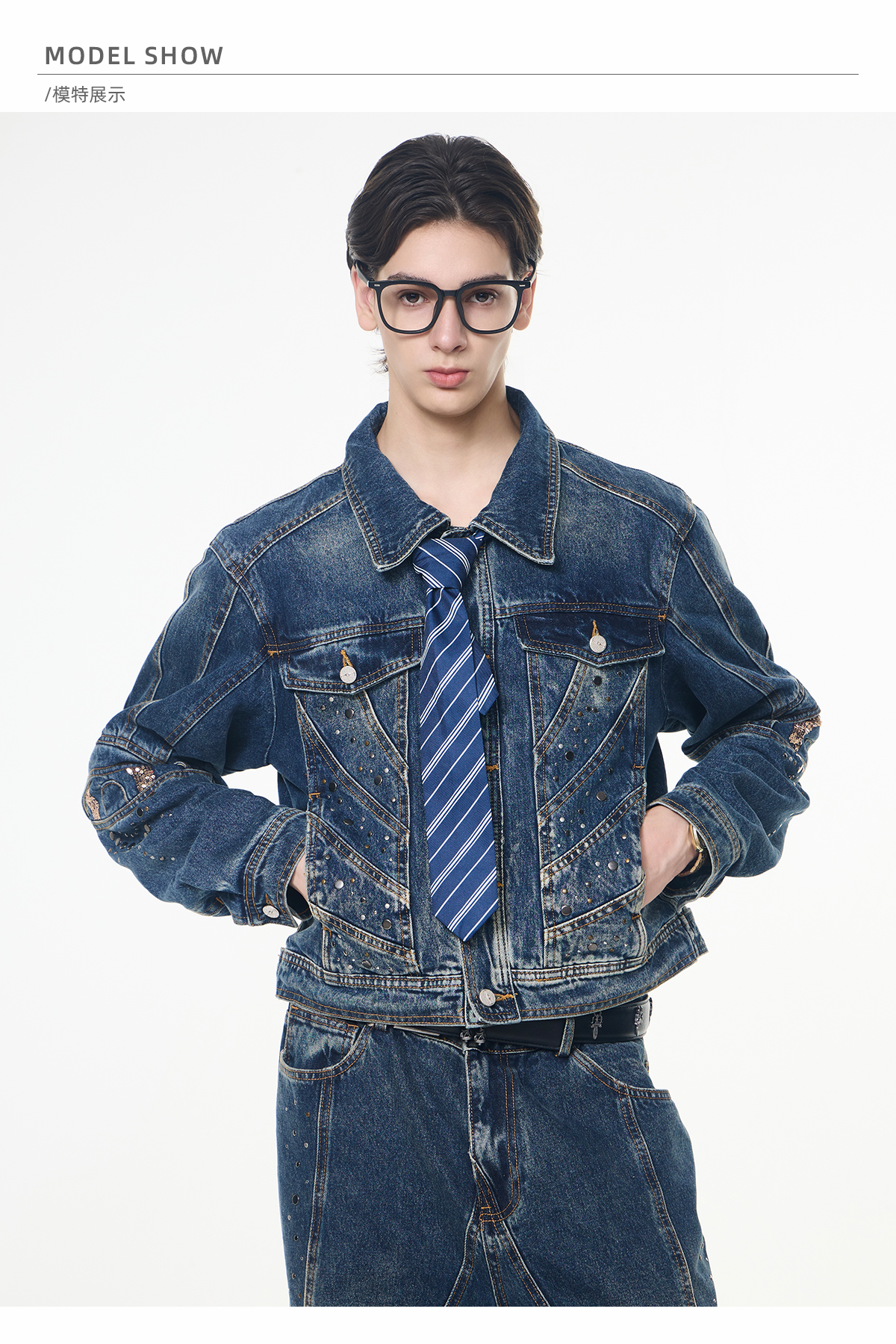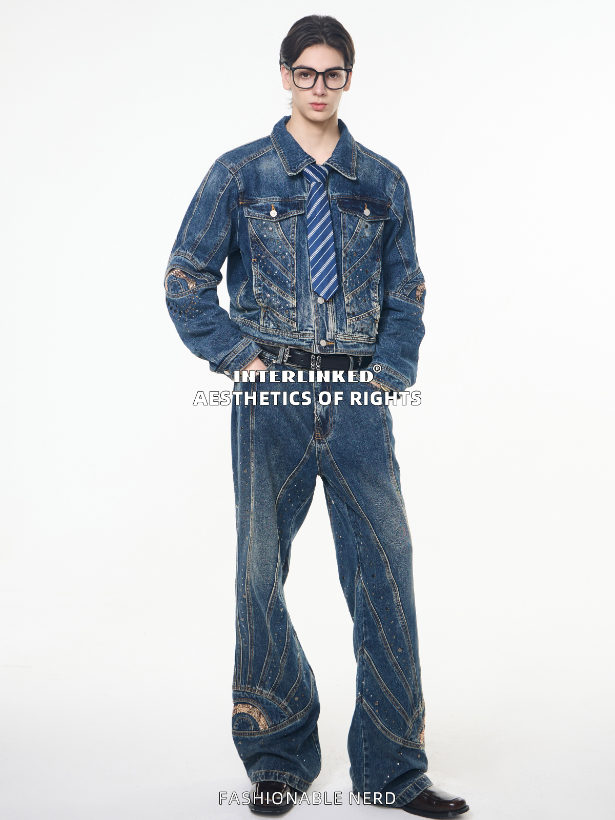 INTERLINKED Retro rivet jacket Outwear distressed Loose Loose pants flash Stylish denim Suit