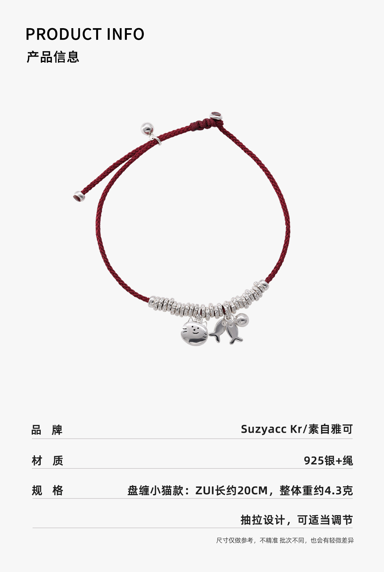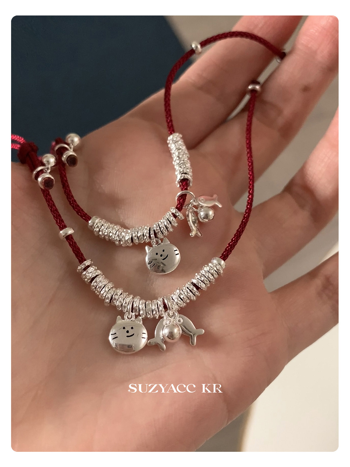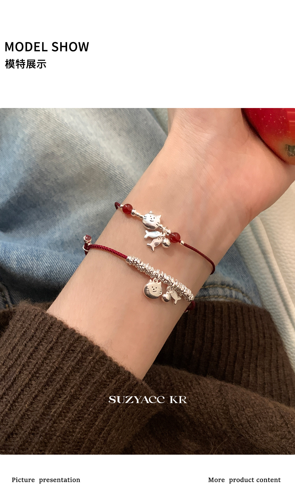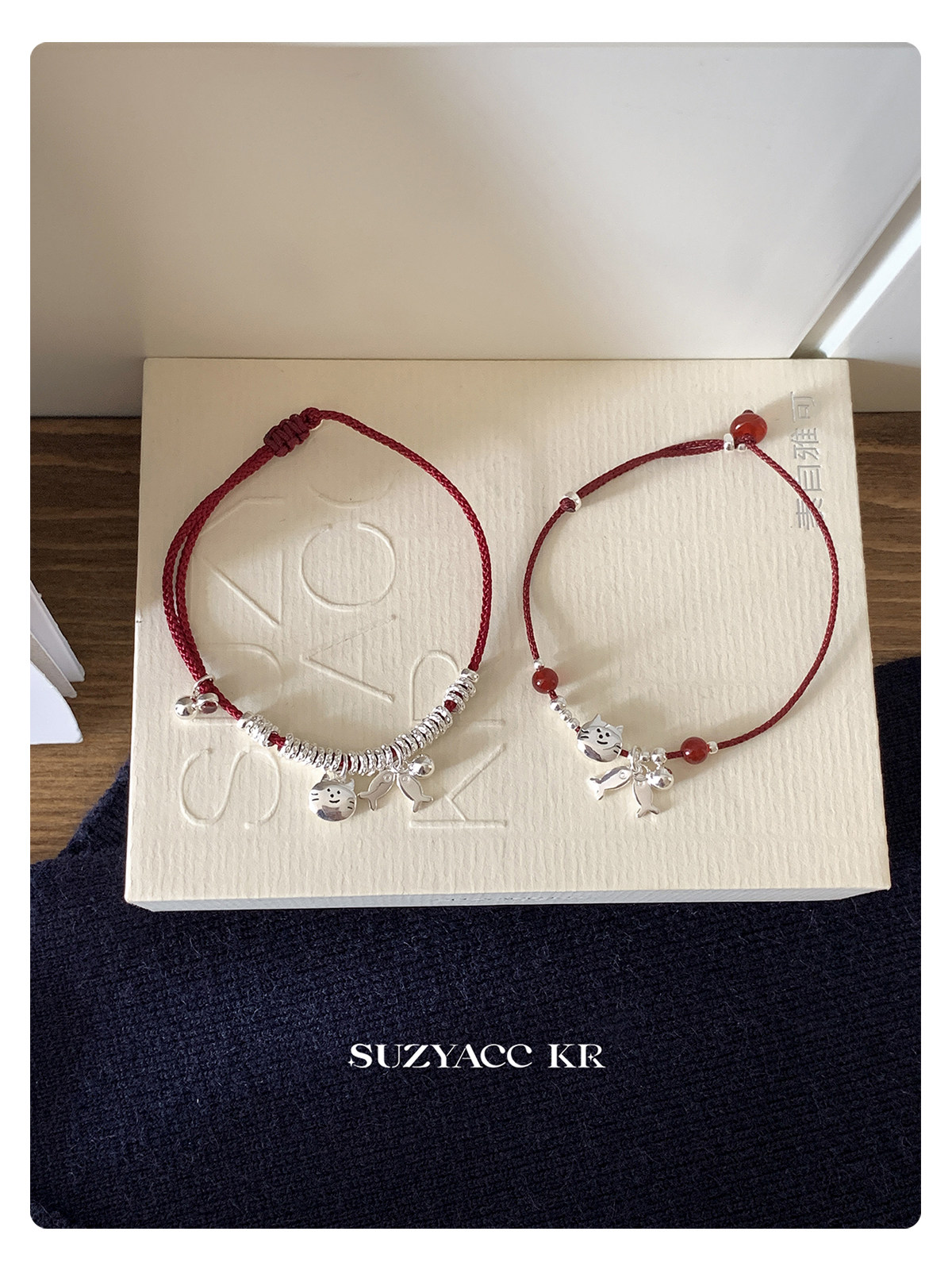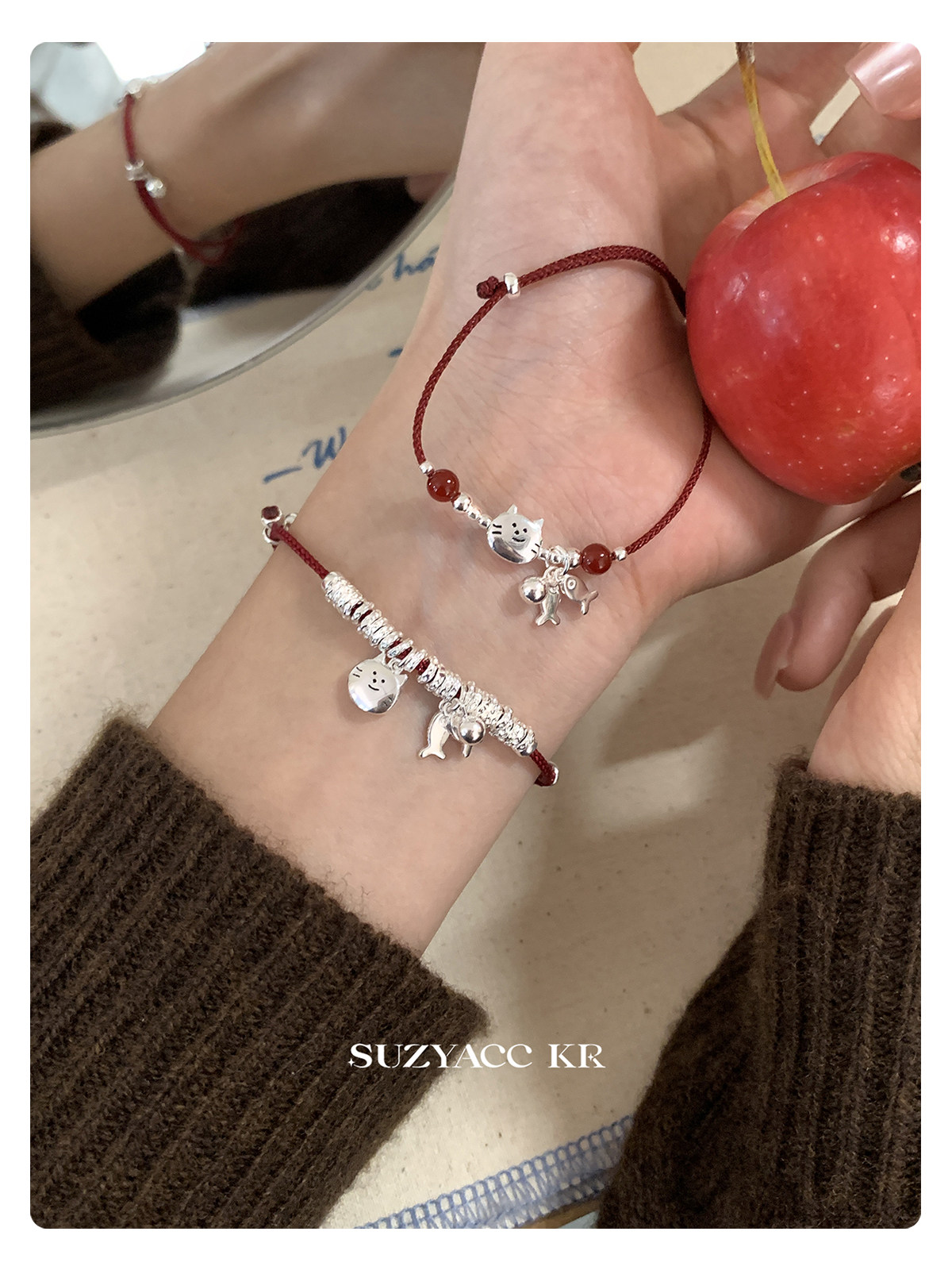 Suzyacc Silver Plate Wrapped Around a Cat and a Small Fish, Sterling Silver Red String Bracelet, Versatile for the Year of Birth, Stackable High-End Jewelry