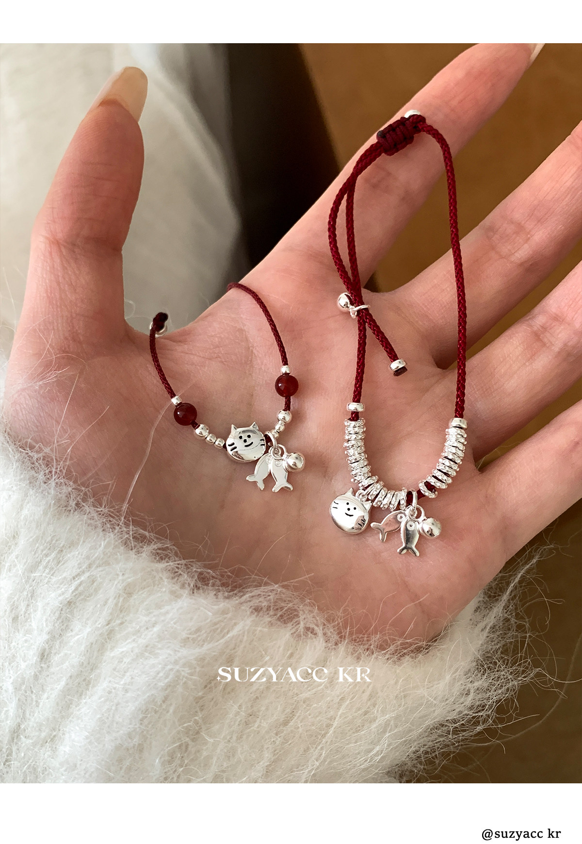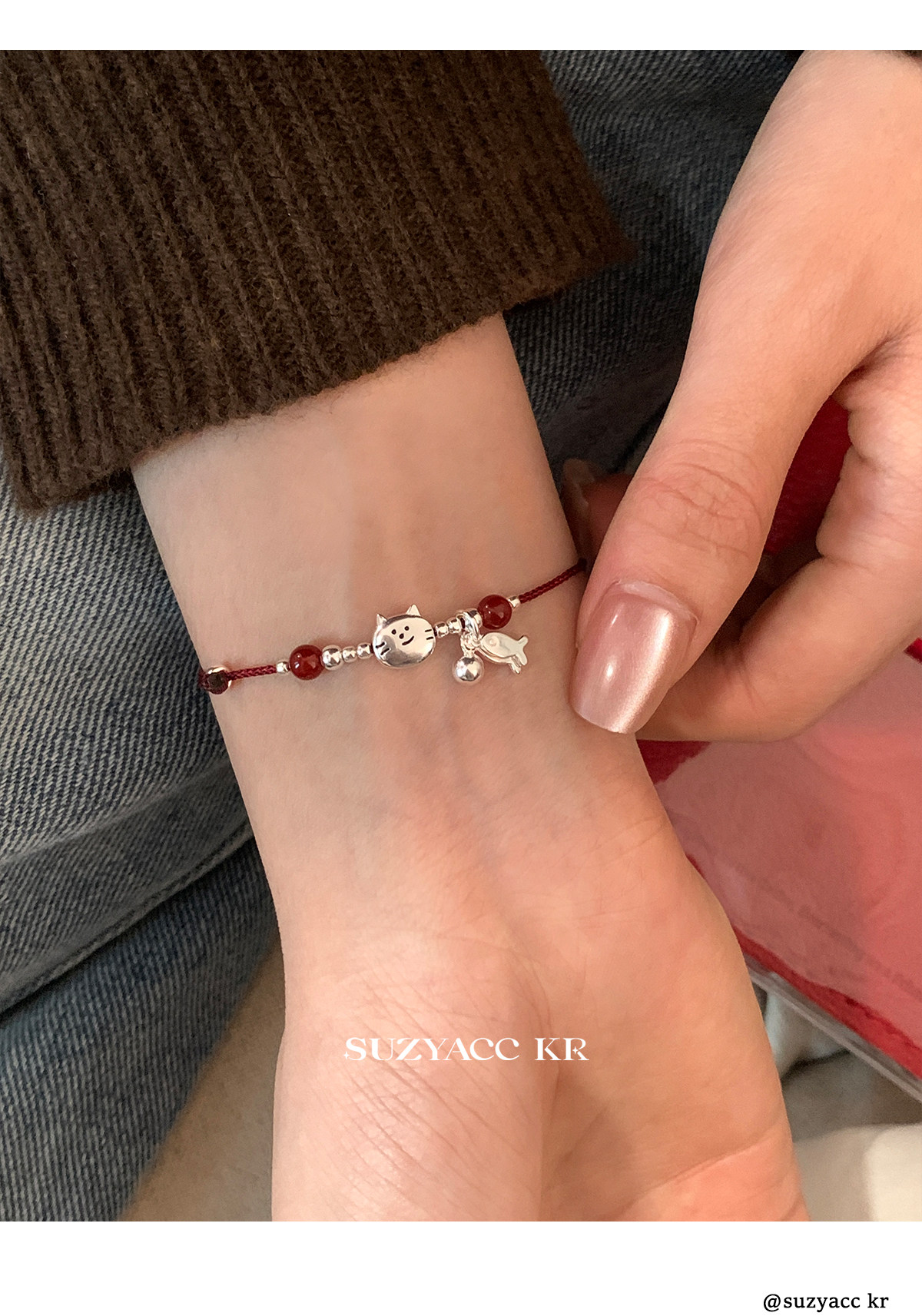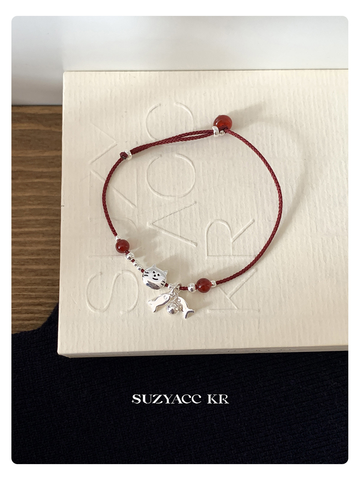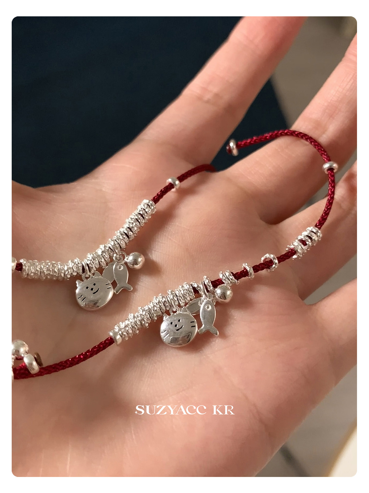 Suzyacc Silver Plate Wrapped Around a Cat and a Small Fish, Sterling Silver Red String Bracelet, Versatile for the Year of Birth, Stackable High-End Jewelry