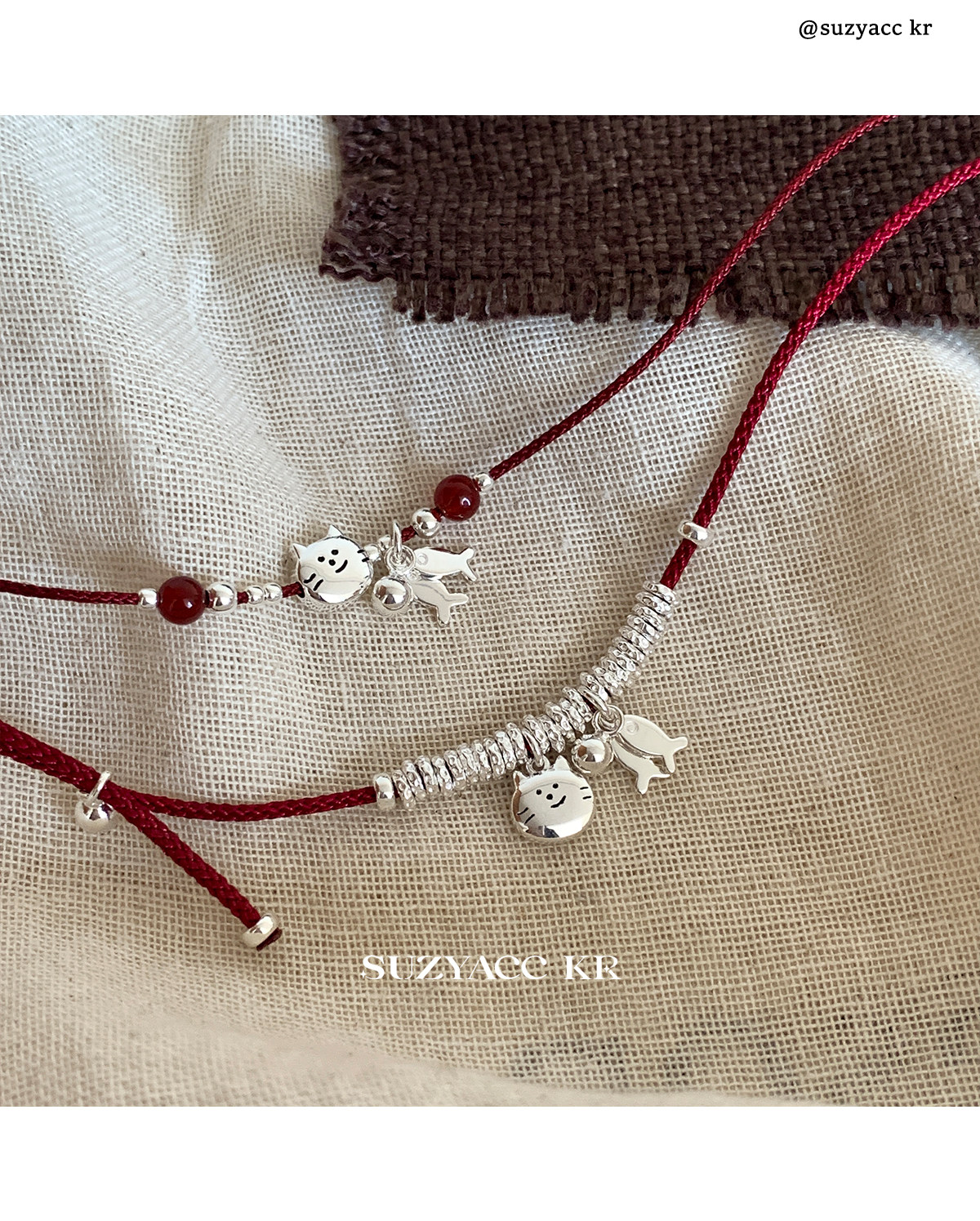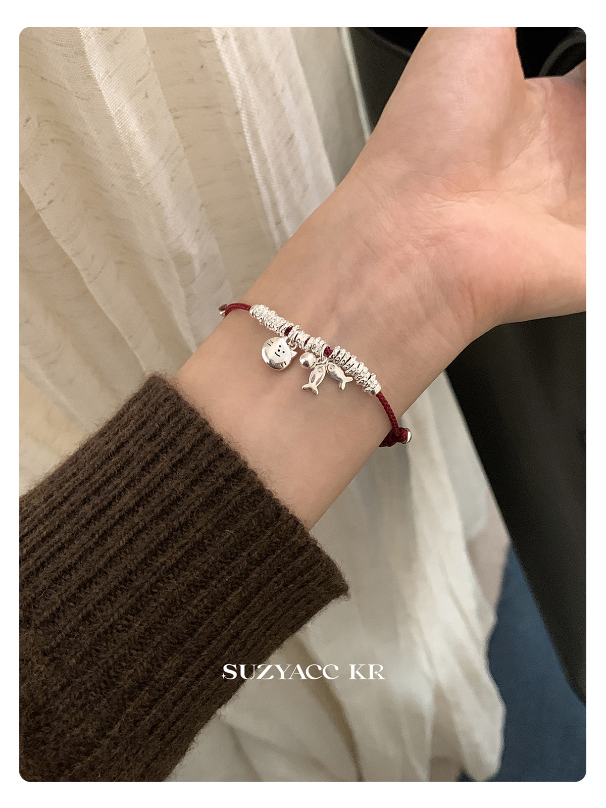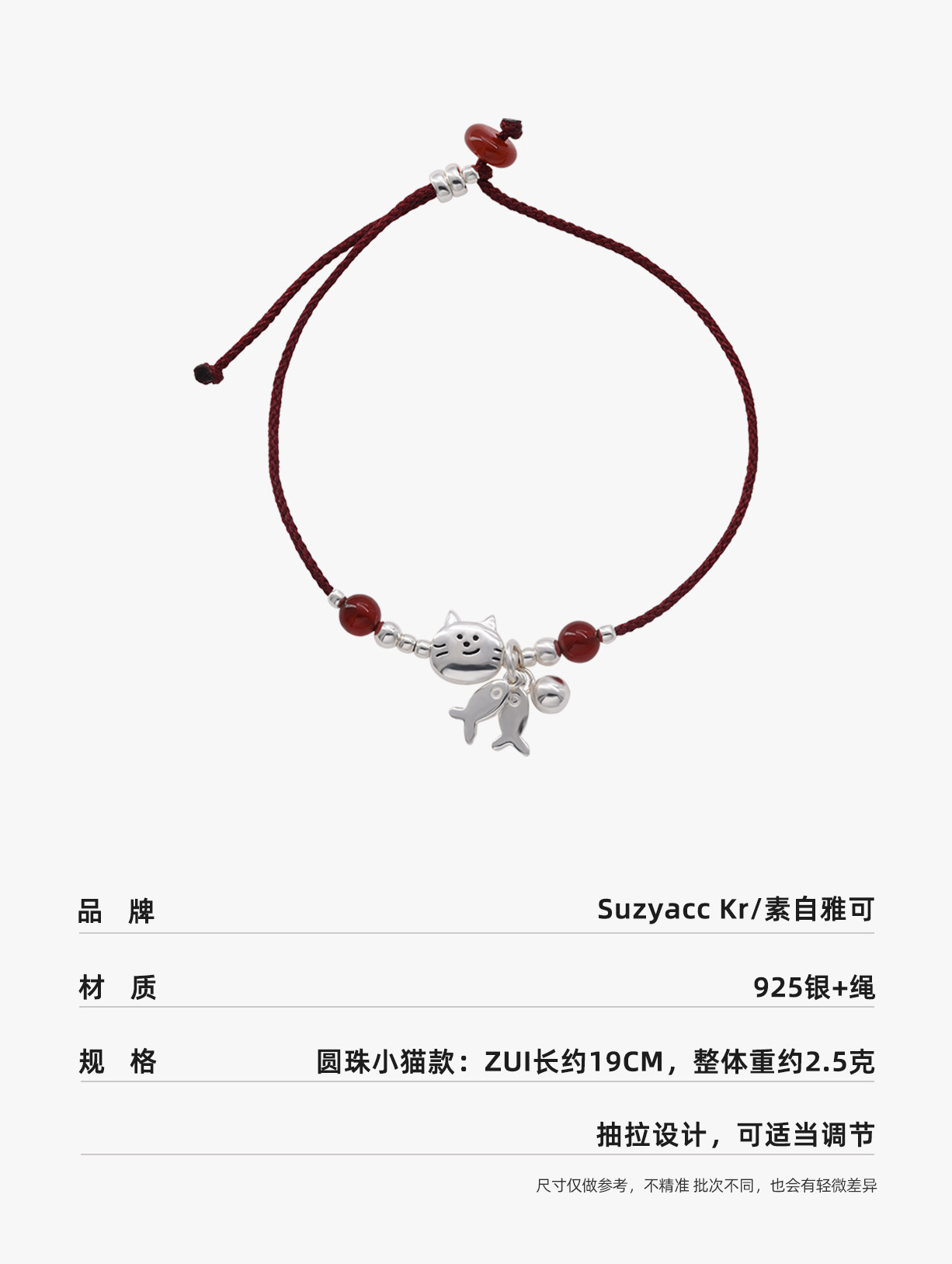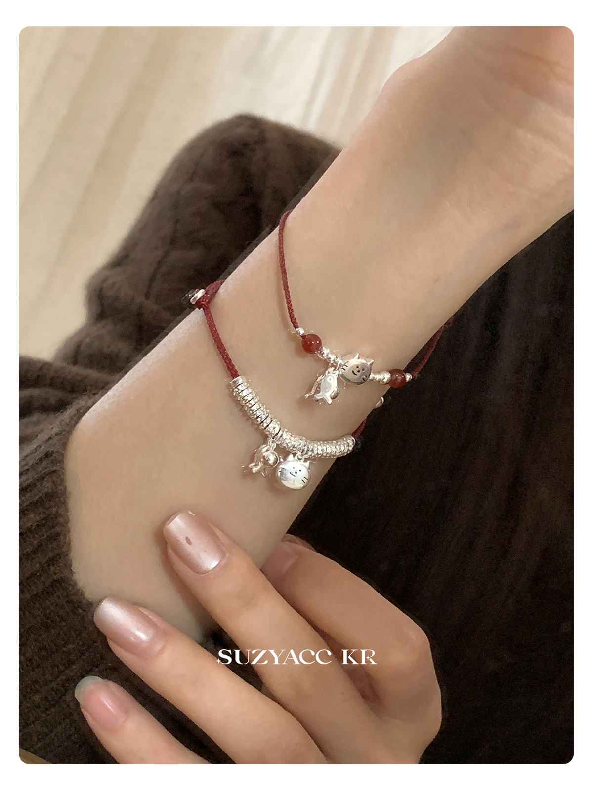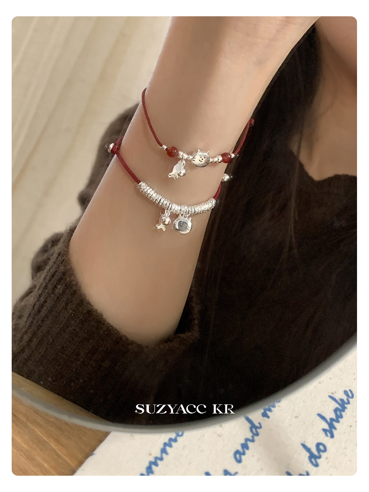 Suzyacc Silver Plate Wrapped Around a Cat and a Small Fish, Sterling Silver Red String Bracelet, Versatile for the Year of Birth, Stackable High-End Jewelry