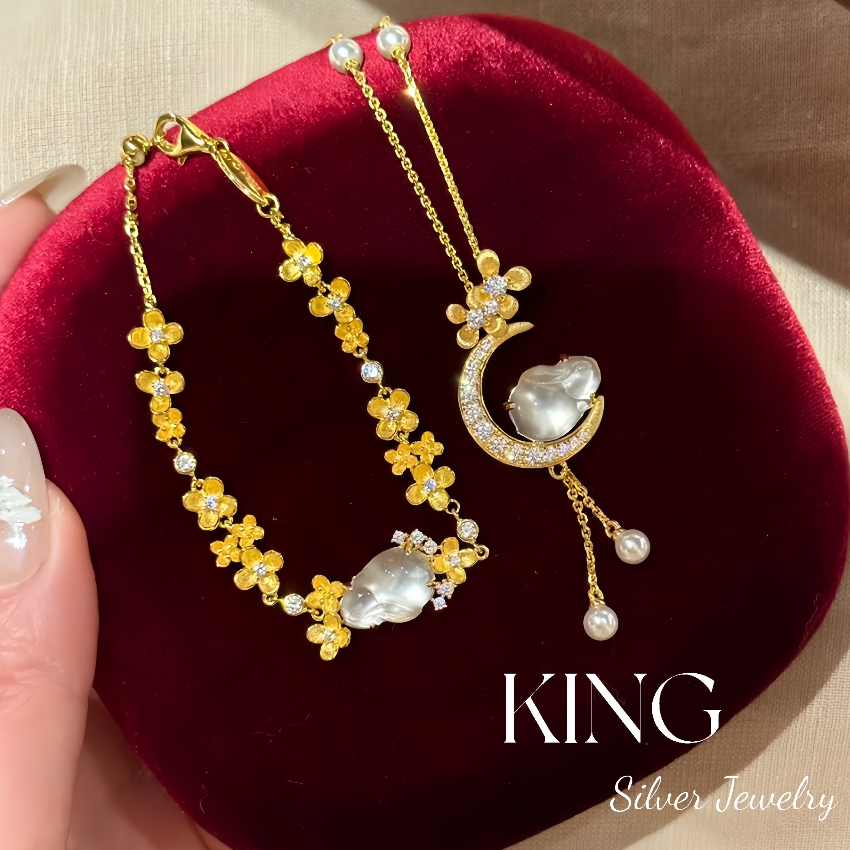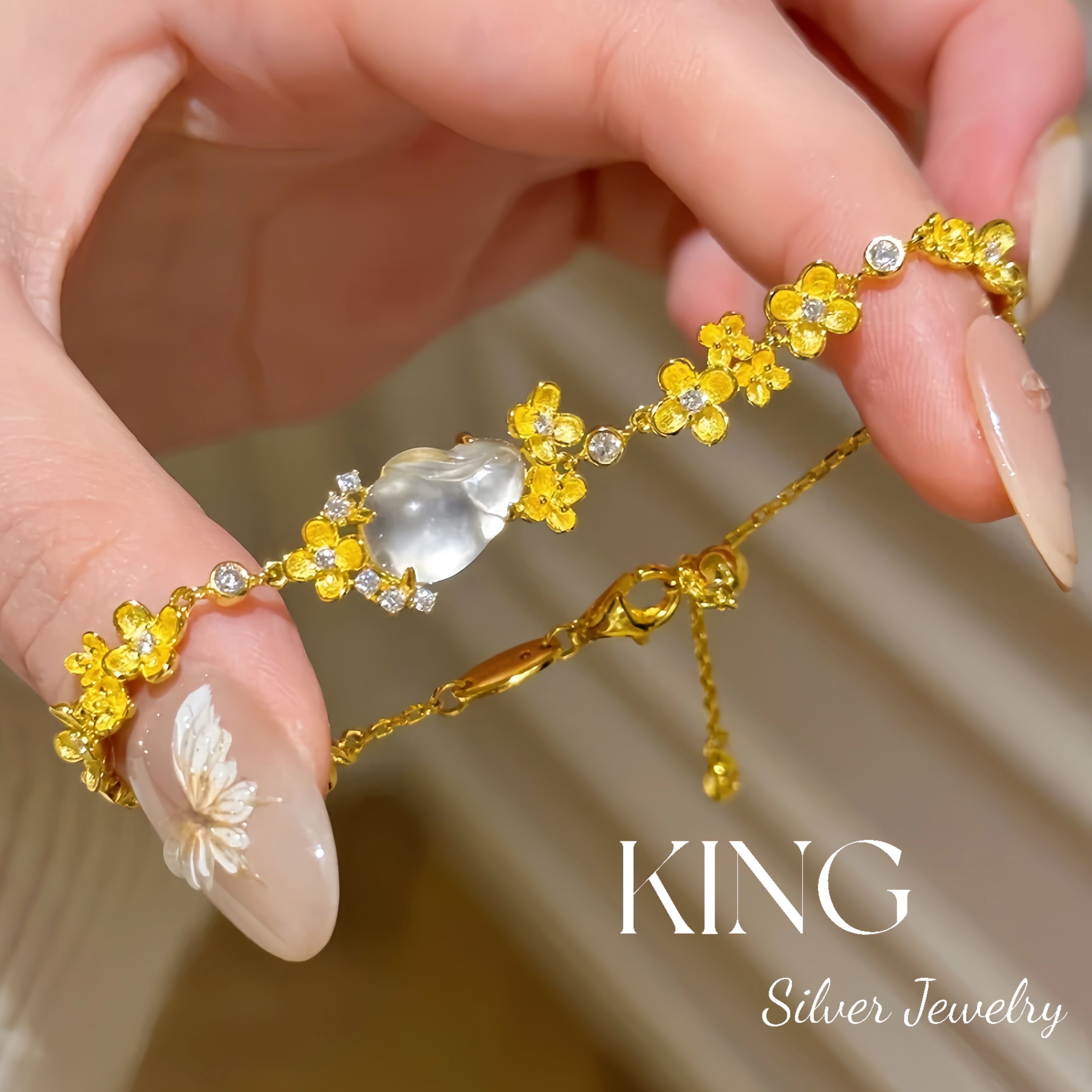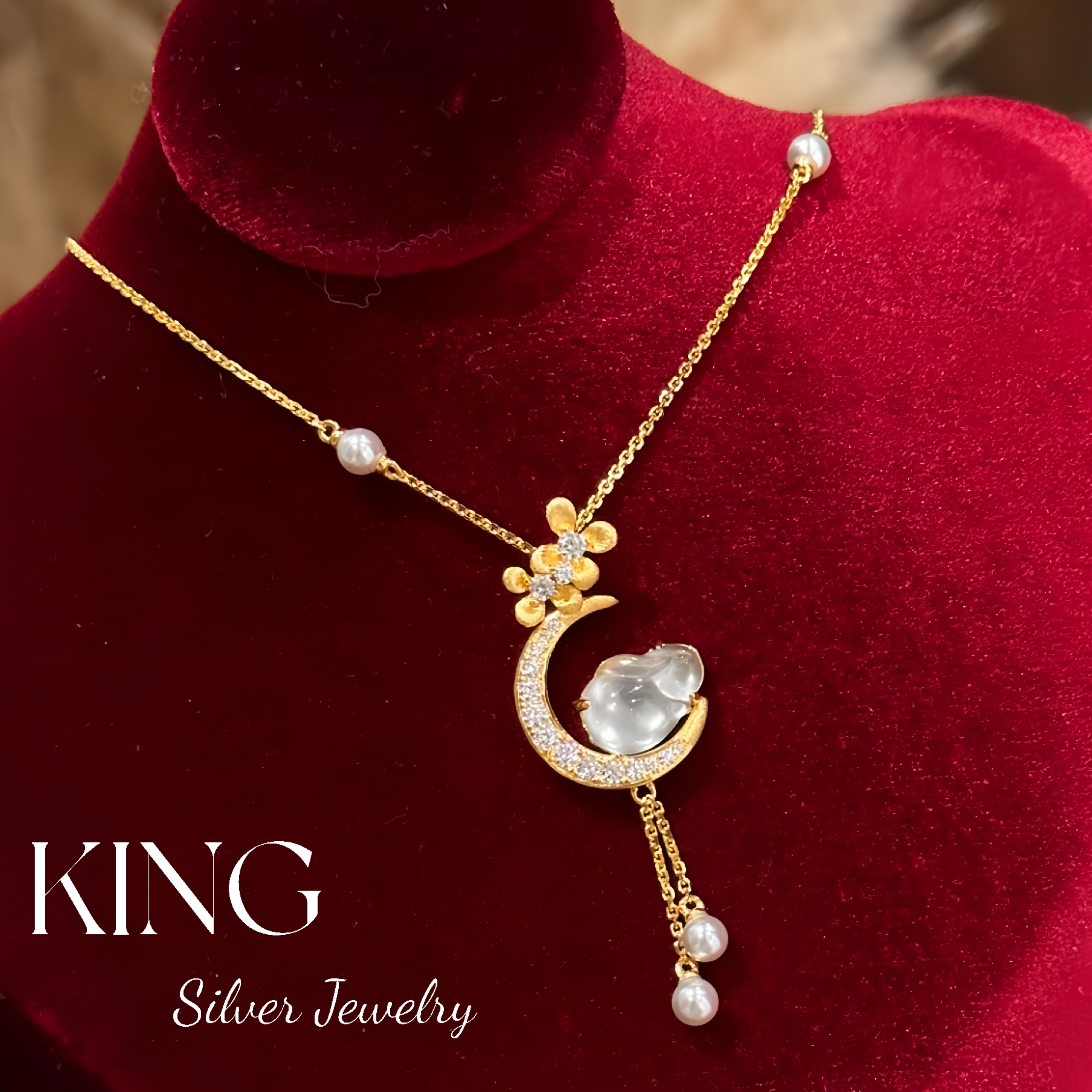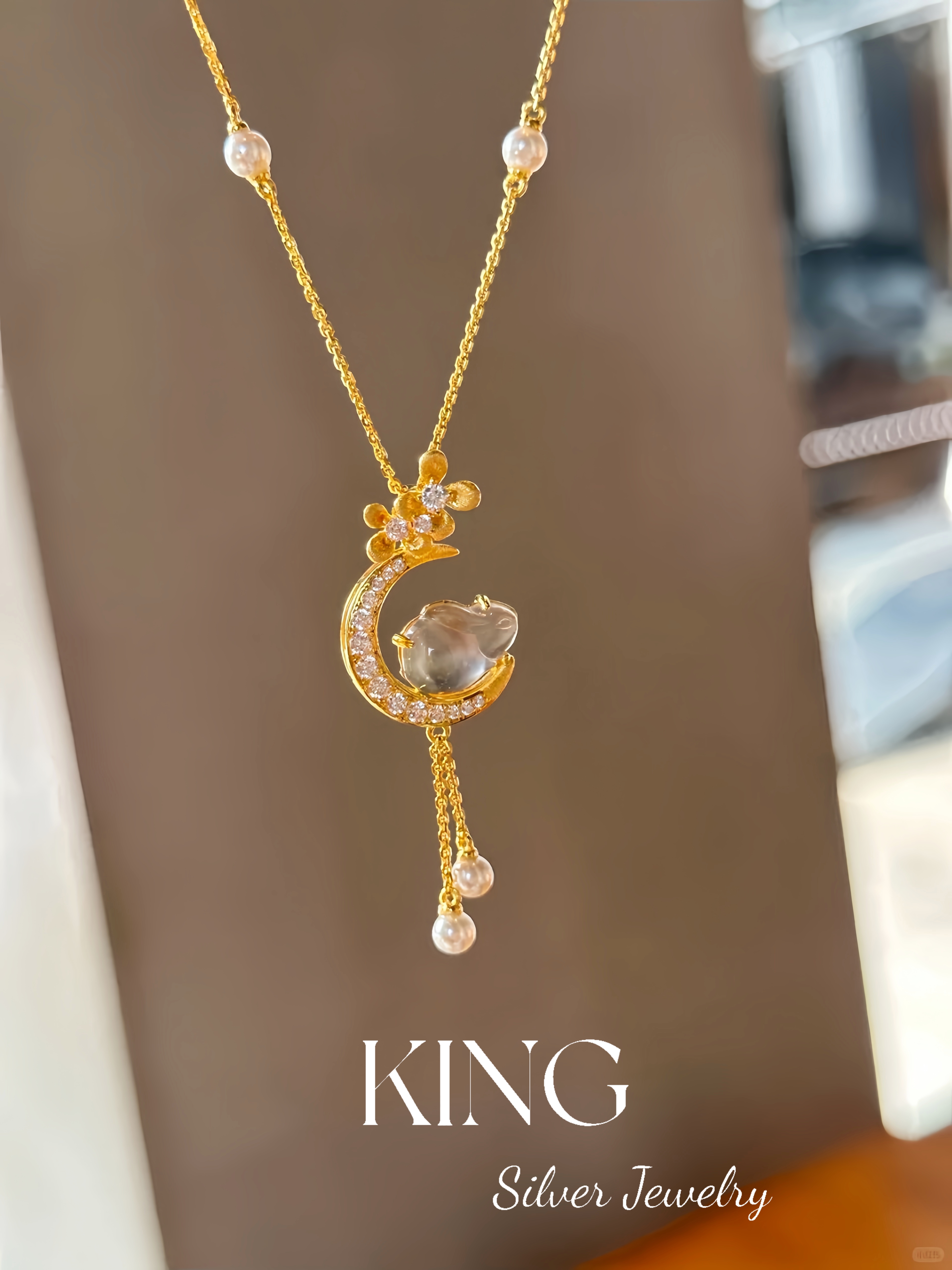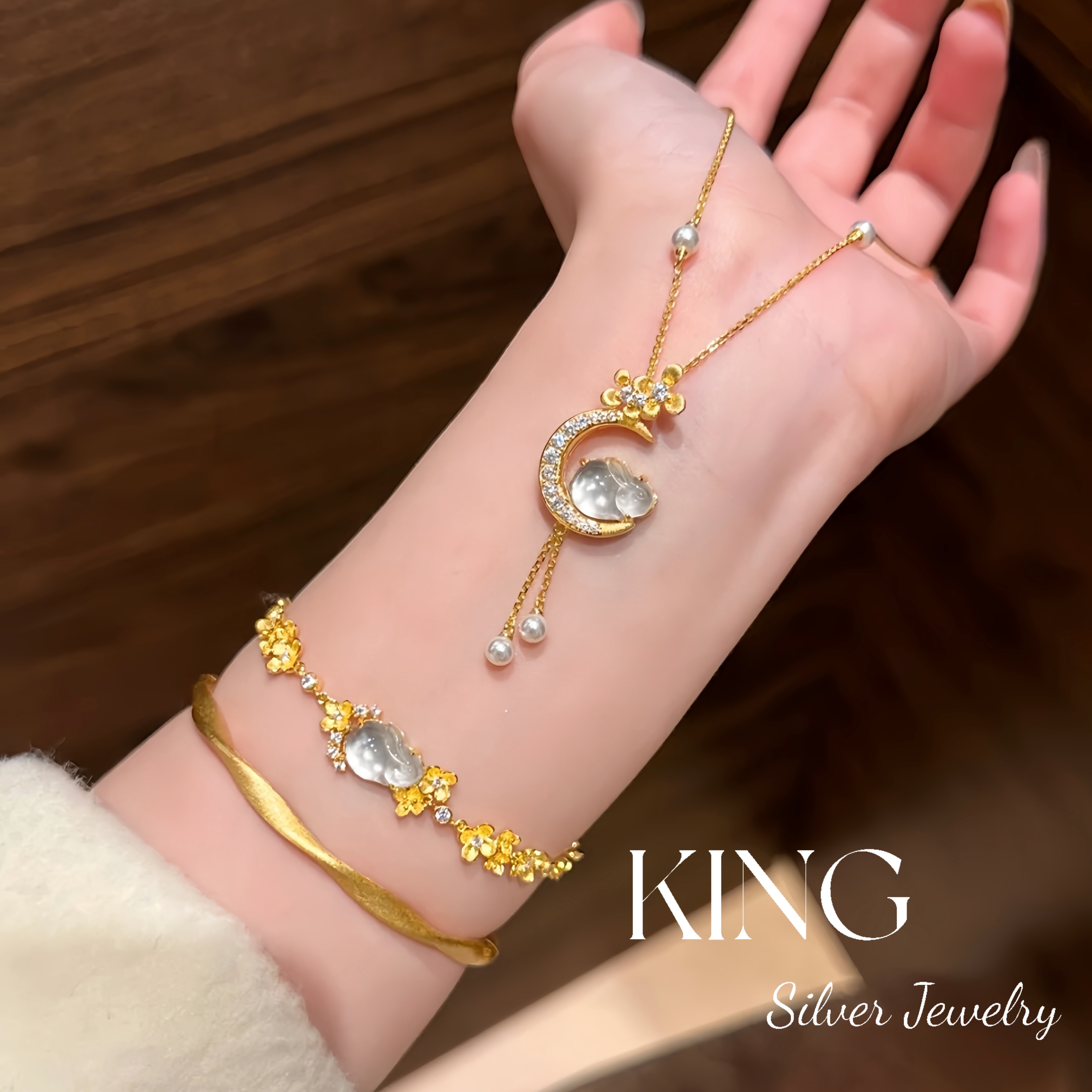 Jade Rabbit Sleeping | king Silver Jewelry Brushed Osmanthus Flowers Shuimo Jade Rabbit Tassel Retro Sterling Silver Necklace Bracelet