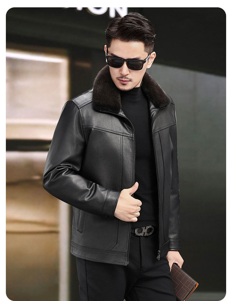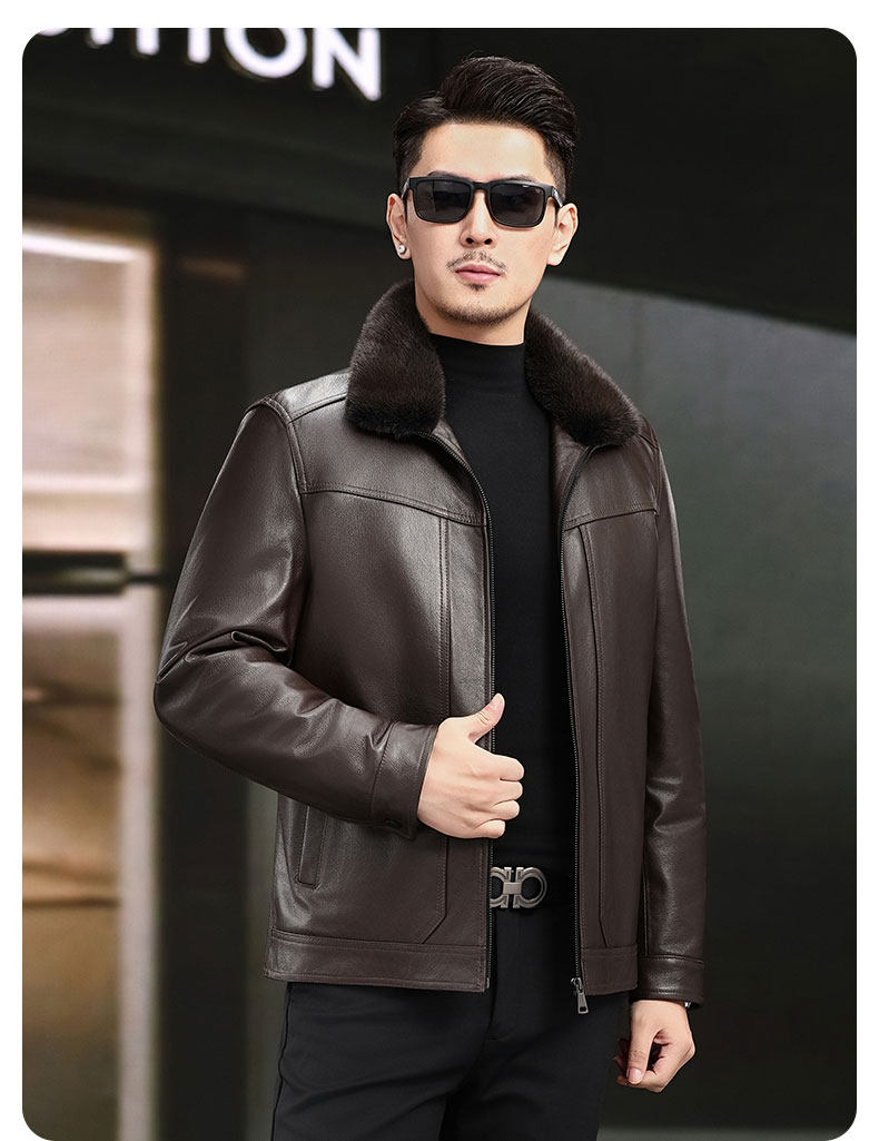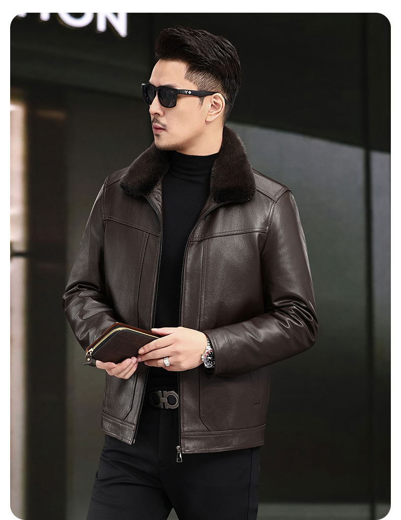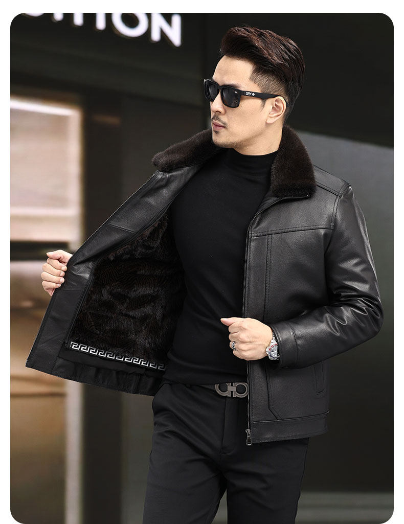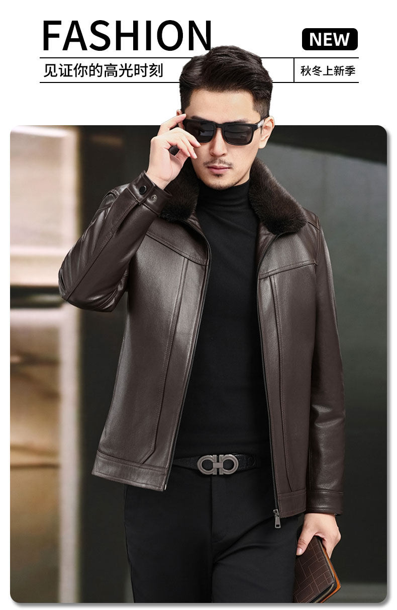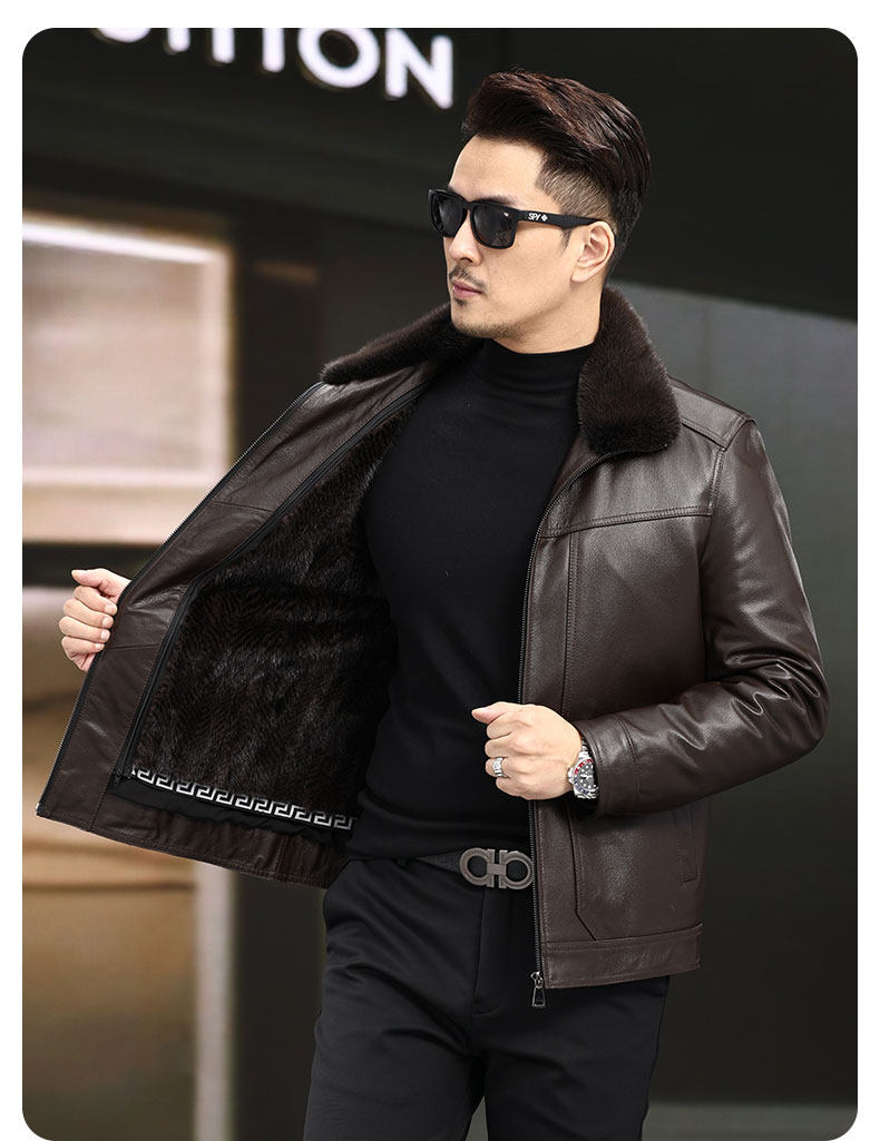 Winter New Style First-Layer Cowhide Leather Jacket for Men, Genuine Leather with Removable Mink Lining, Detachable Lapel, Fur Integrated Leather Jacket