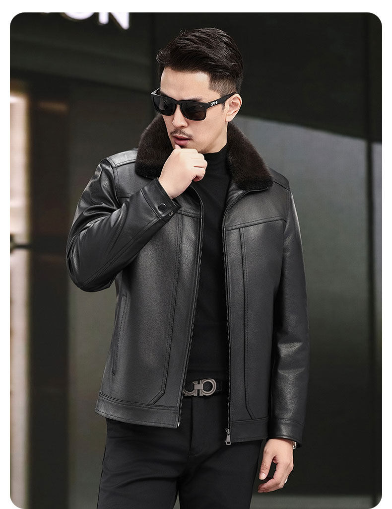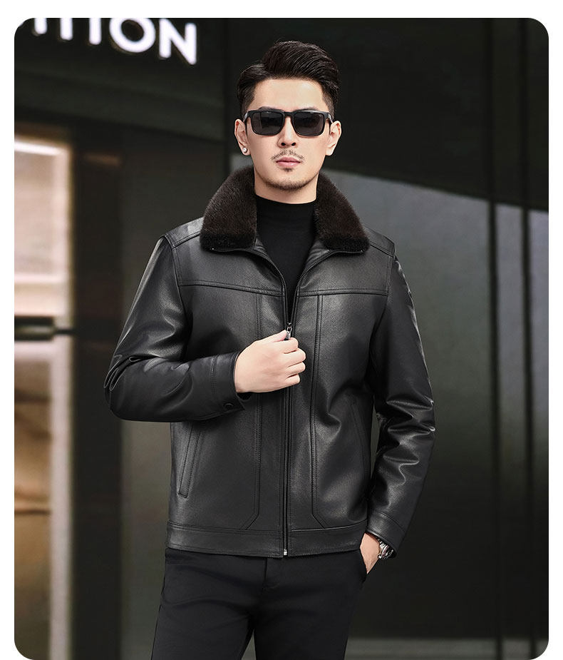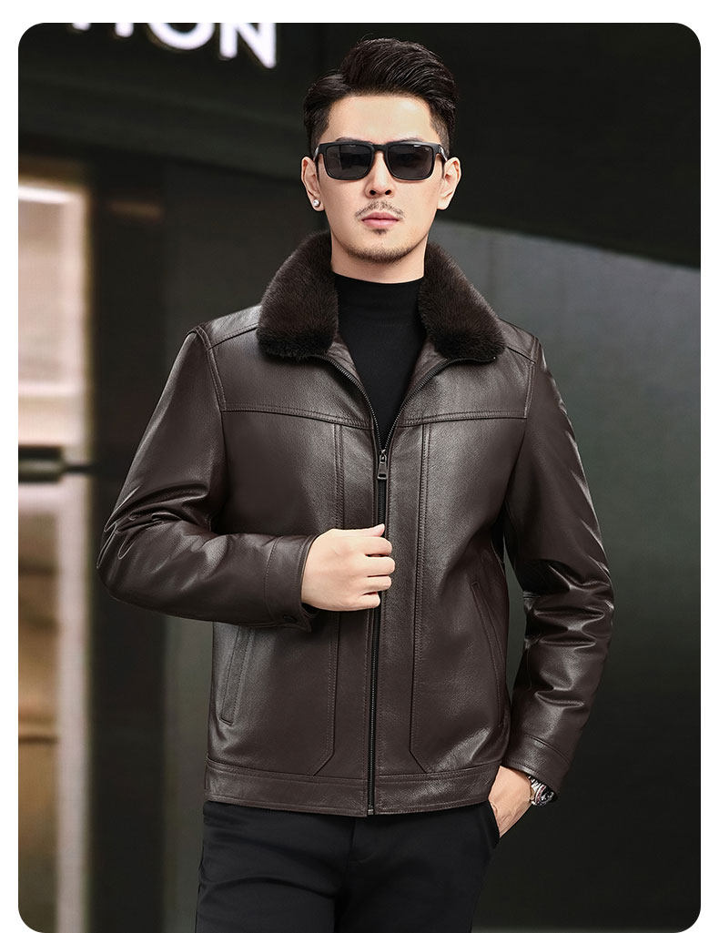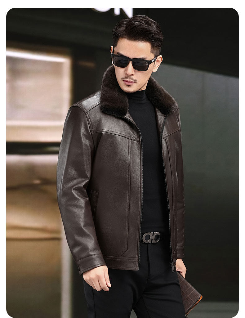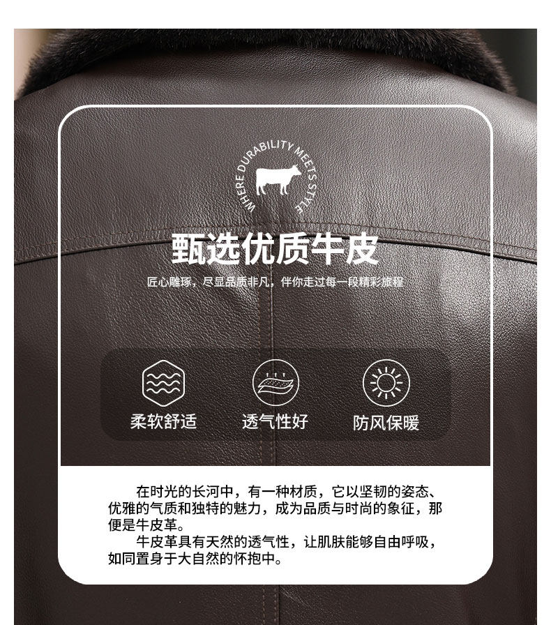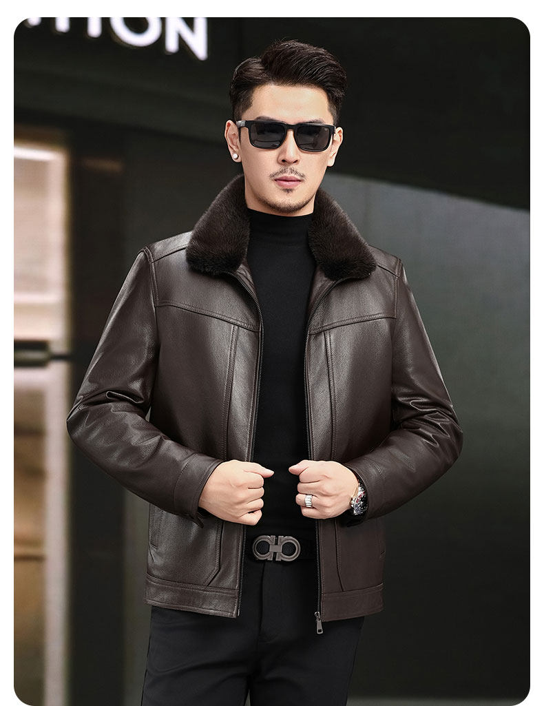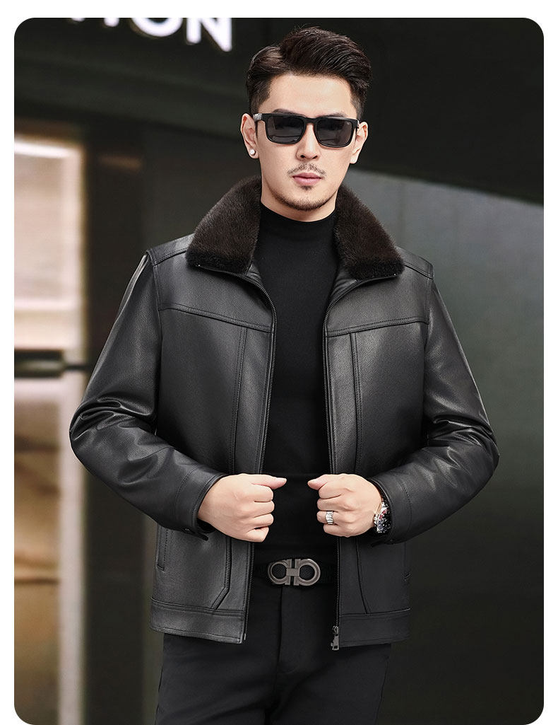 Winter New Style First-Layer Cowhide Leather Jacket for Men, Genuine Leather with Removable Mink Lining, Detachable Lapel, Fur Integrated Leather Jacket