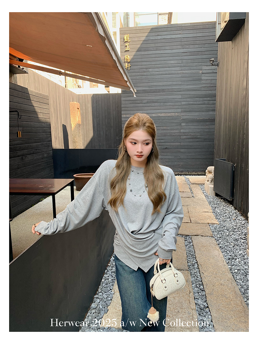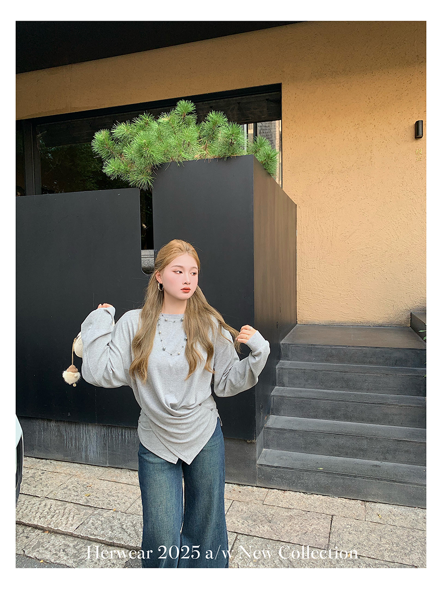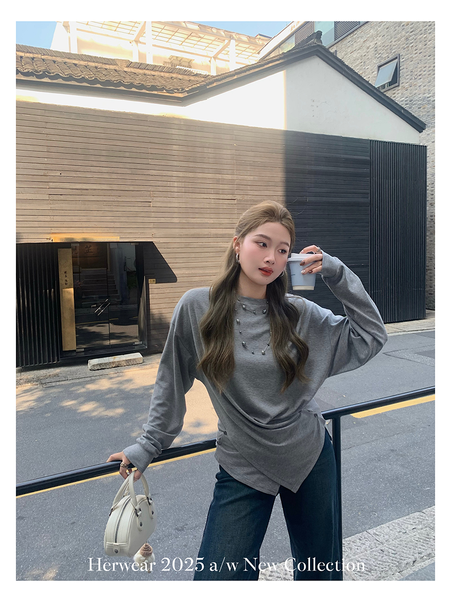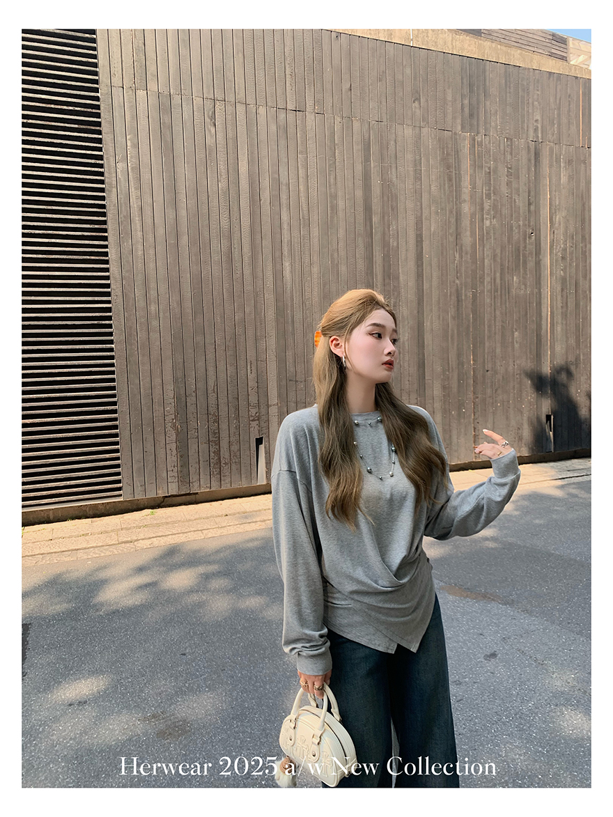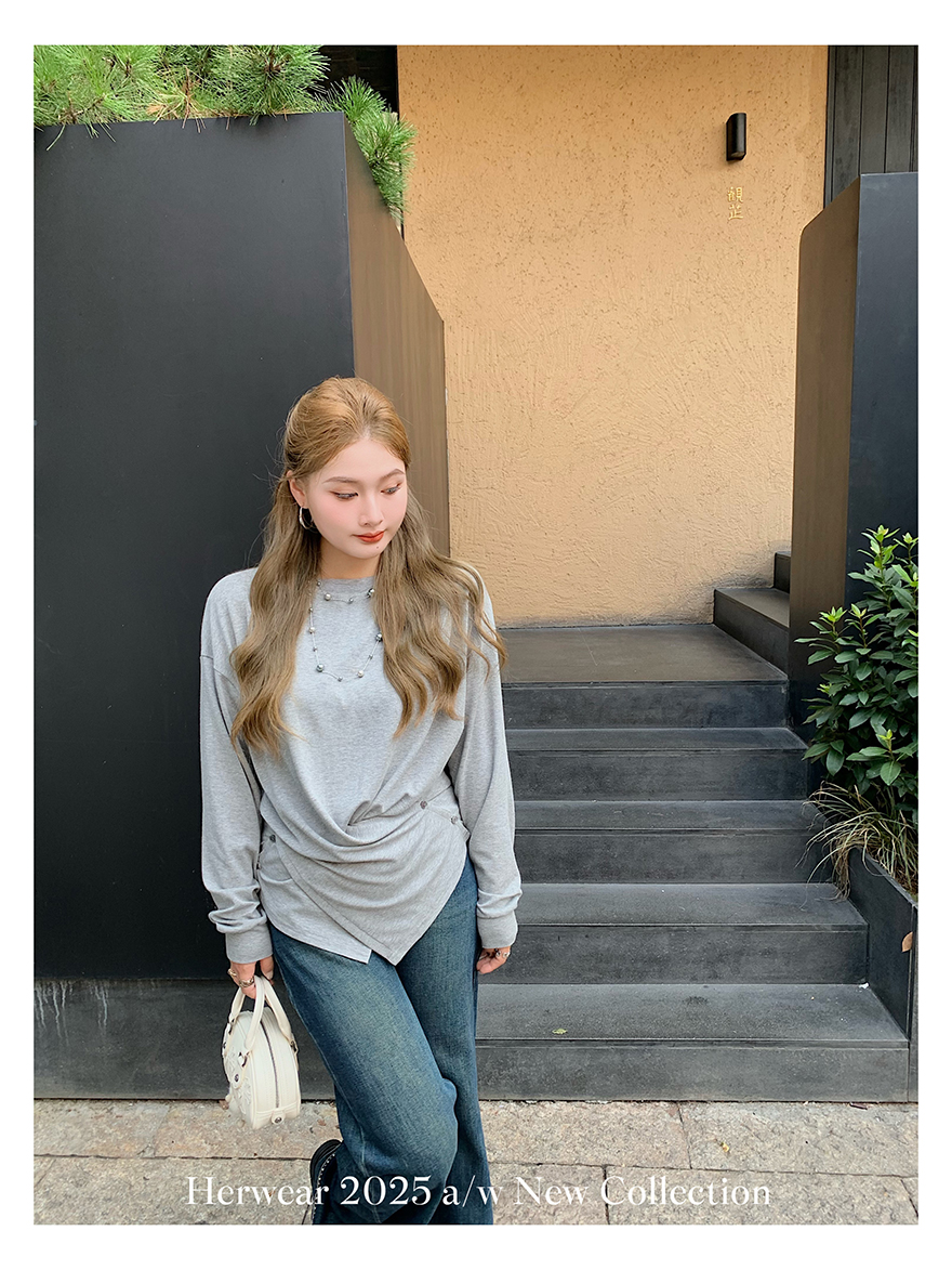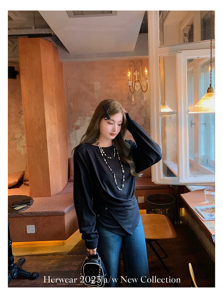 Herwear Slightly Chubby mm Deconstructed Aesthetics Slimming Waist-Cinching Long-Sleeve T-Shirt for Women with Cross Placket Loose Silhouette Top