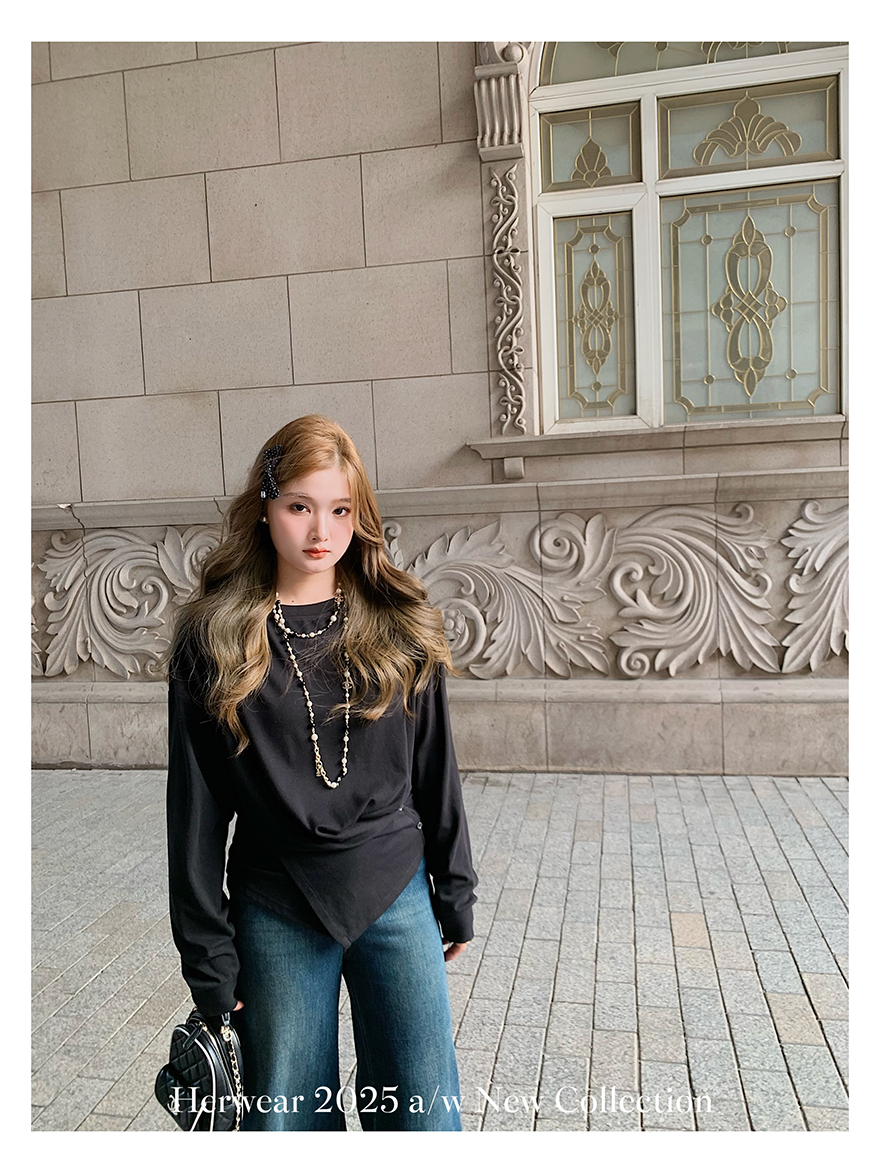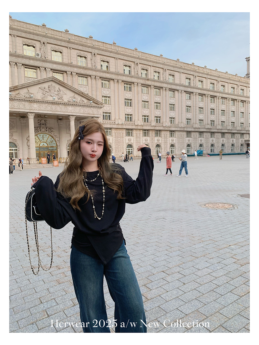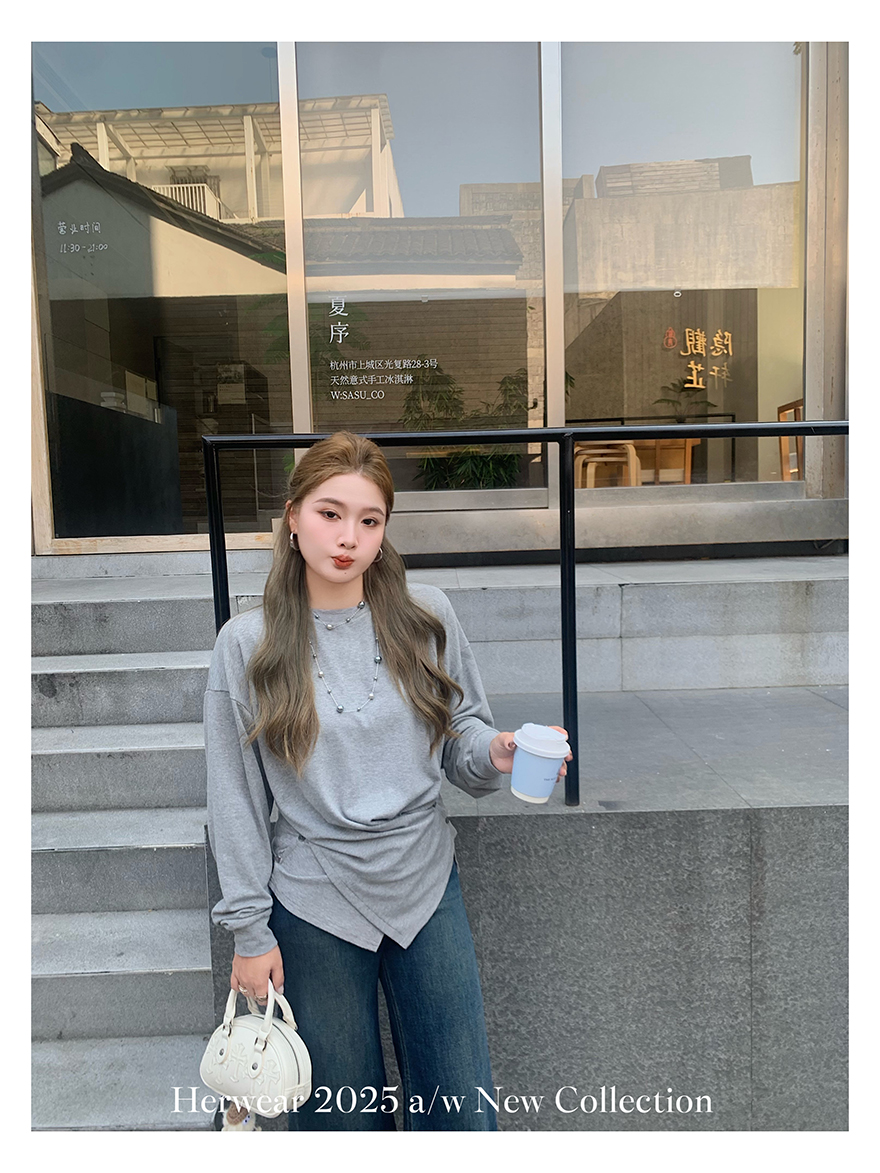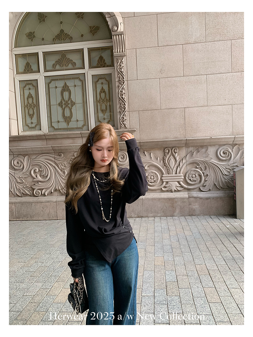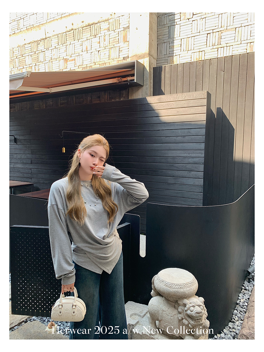 Herwear Slightly Chubby mm Deconstructed Aesthetics Slimming Waist-Cinching Long-Sleeve T-Shirt for Women with Cross Placket Loose Silhouette Top