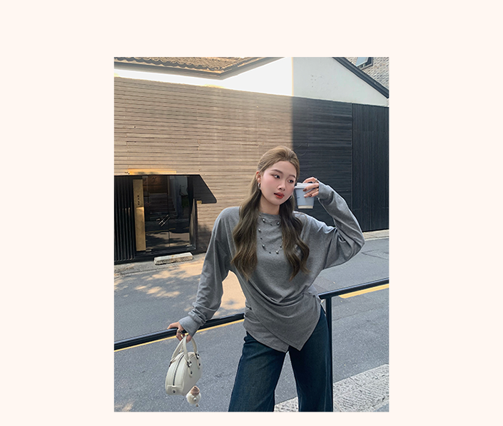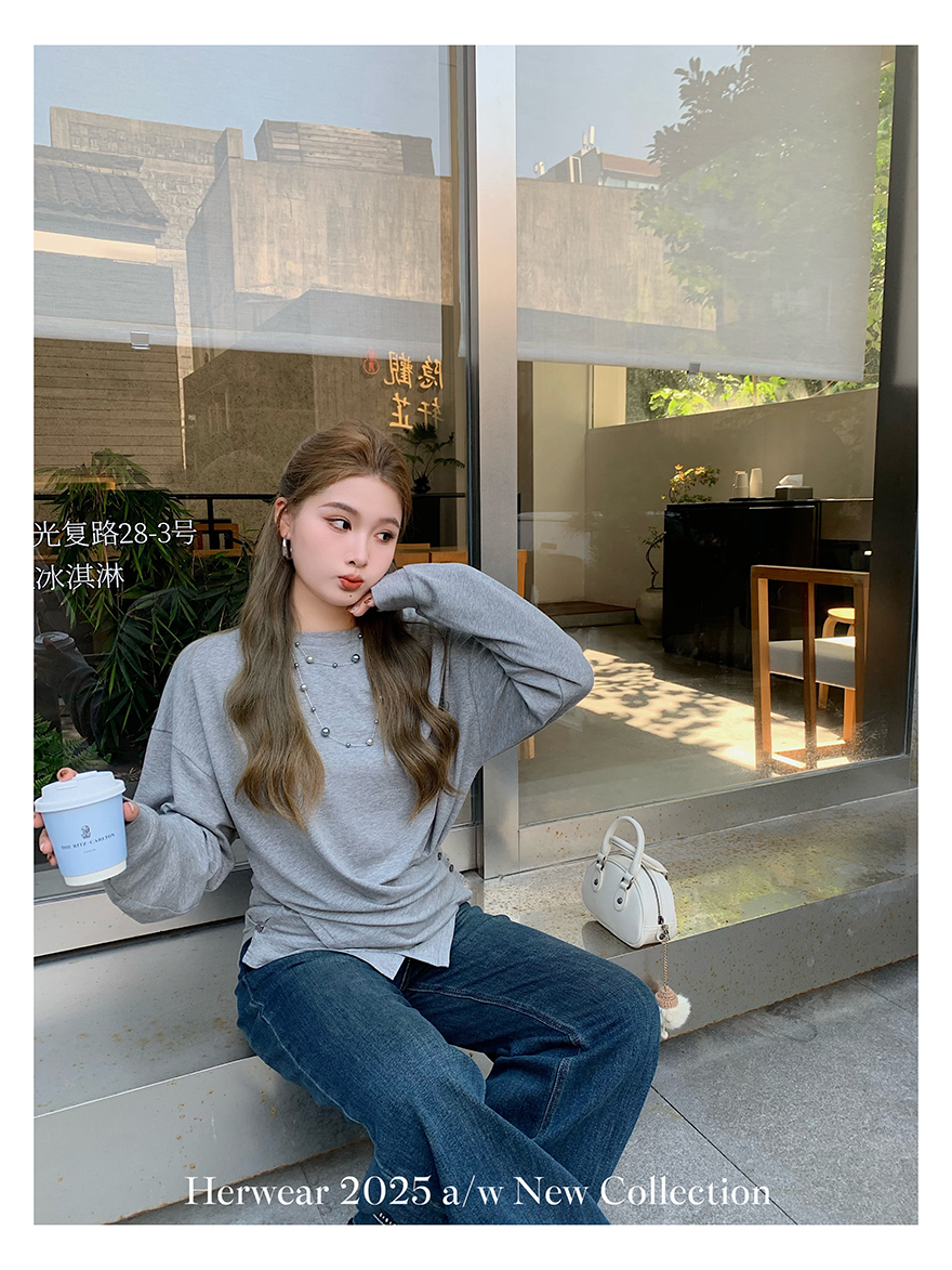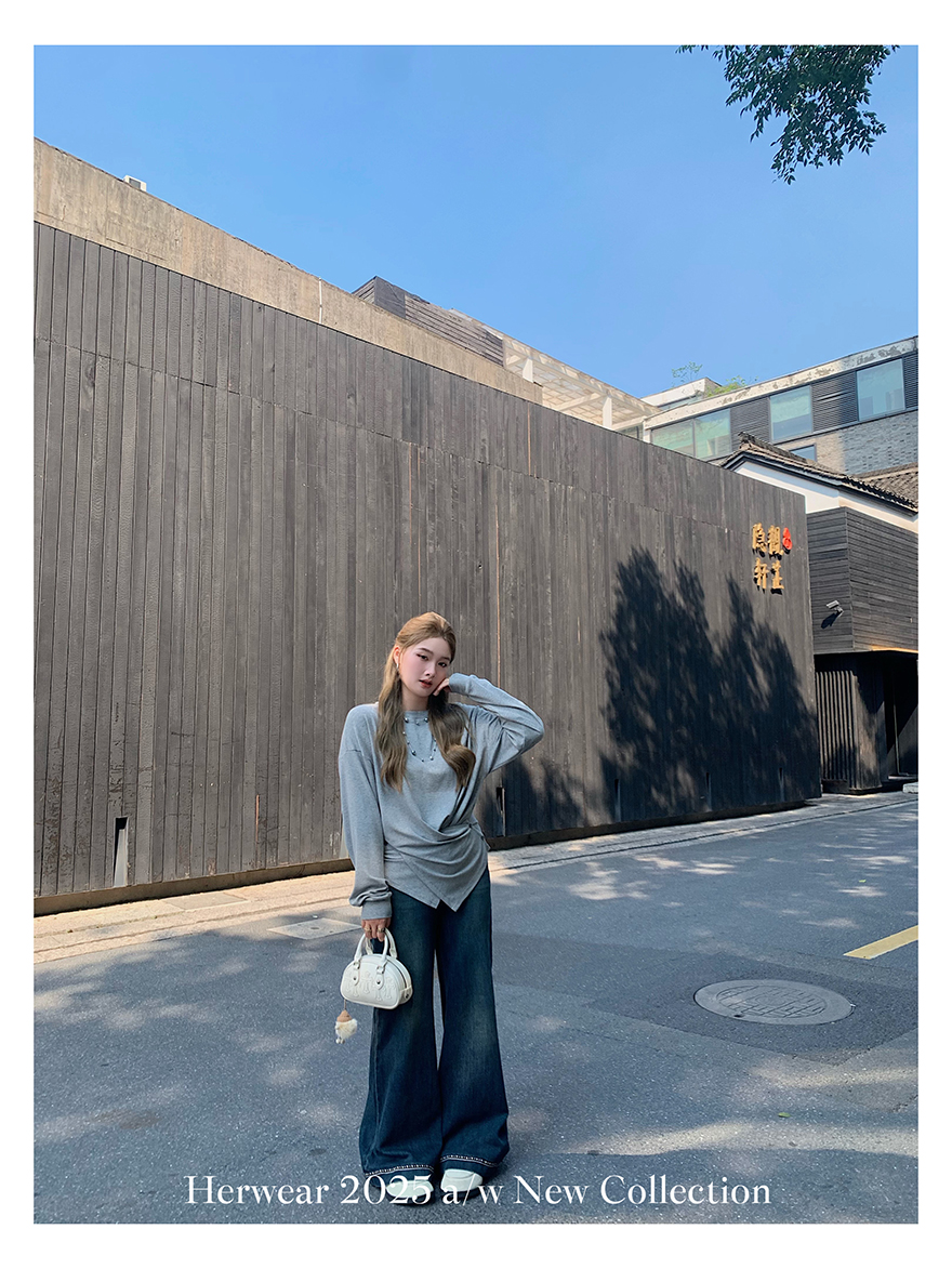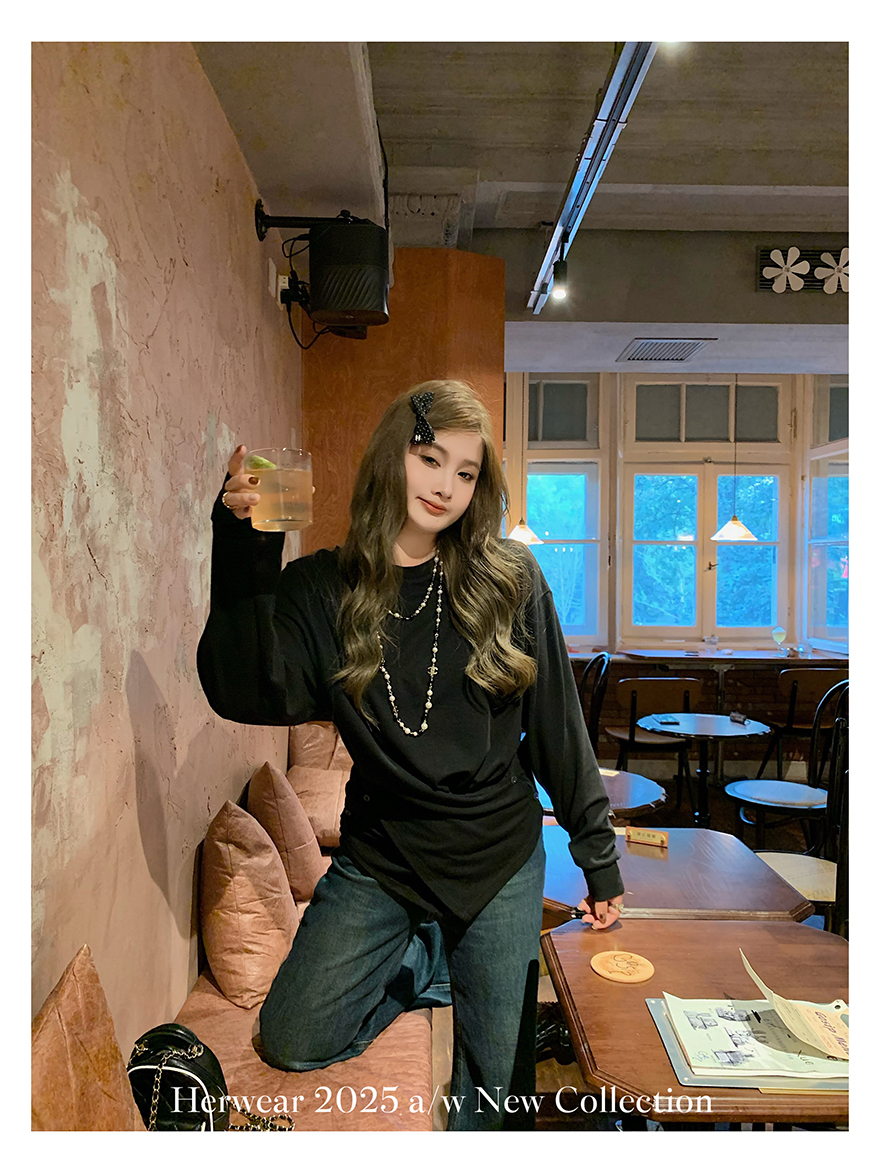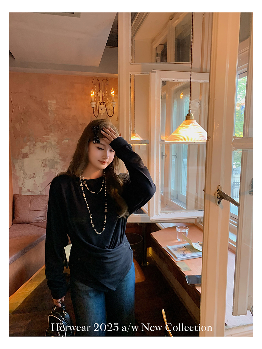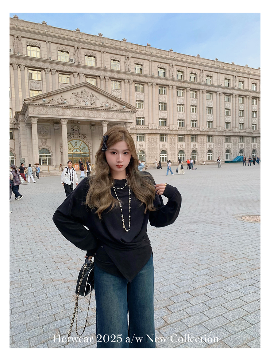Herwear Slightly Chubby mm Deconstructed Aesthetics Slimming Waist-Cinching Long-Sleeve T-Shirt for Women with Cross Placket Loose Silhouette Top