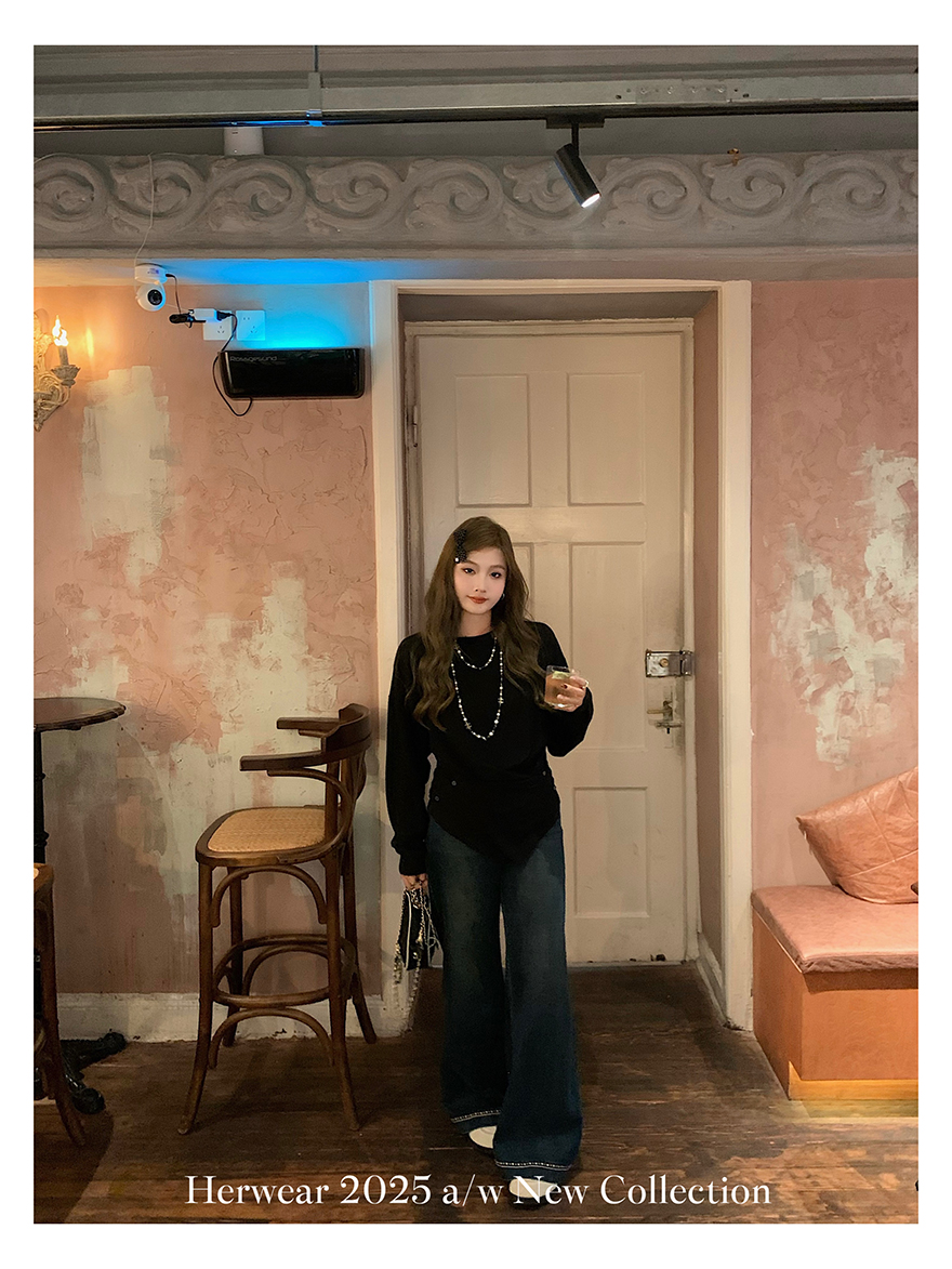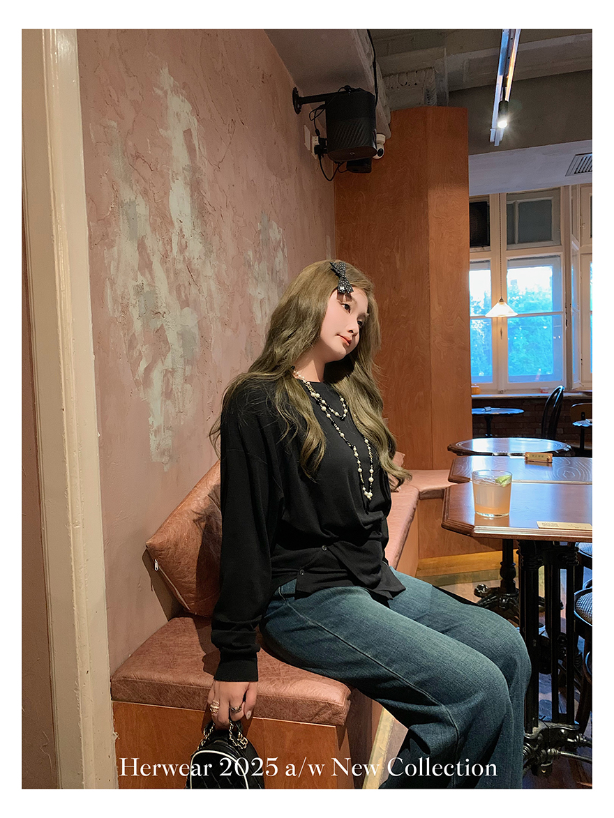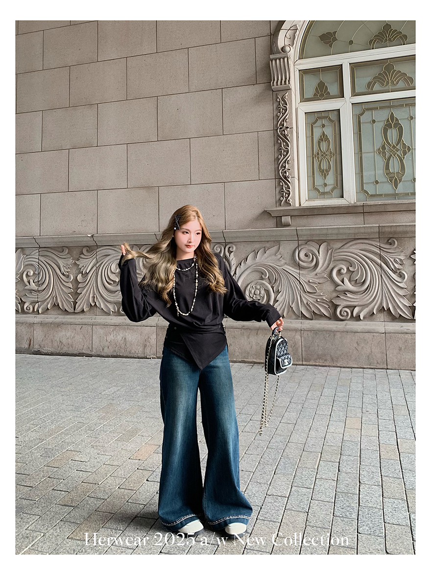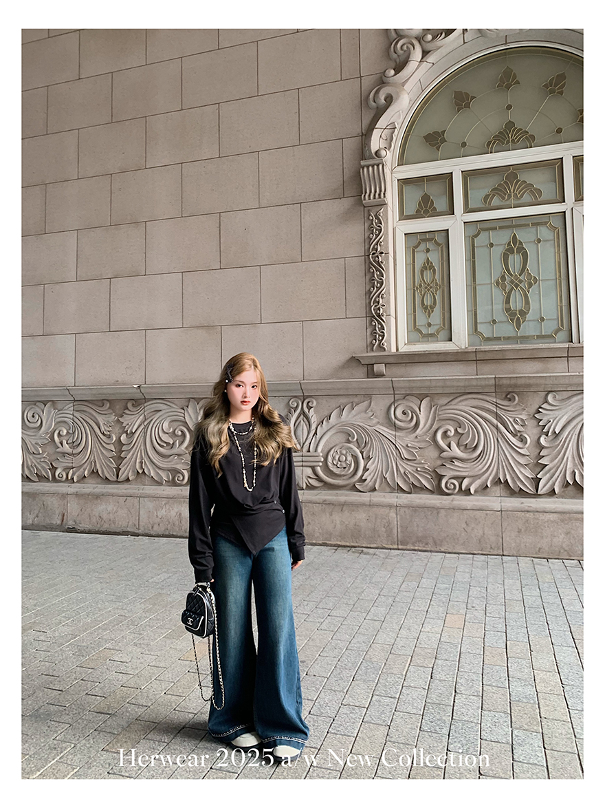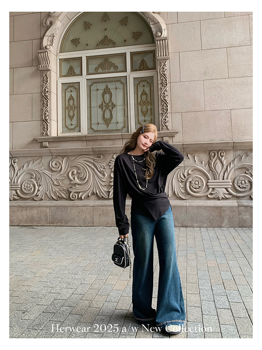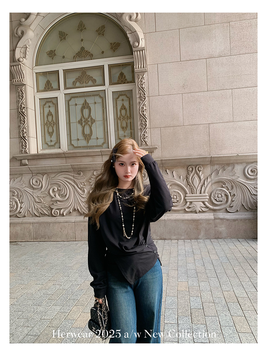 Herwear Slightly Chubby mm Deconstructed Aesthetics Slimming Waist-Cinching Long-Sleeve T-Shirt for Women with Cross Placket Loose Silhouette Top